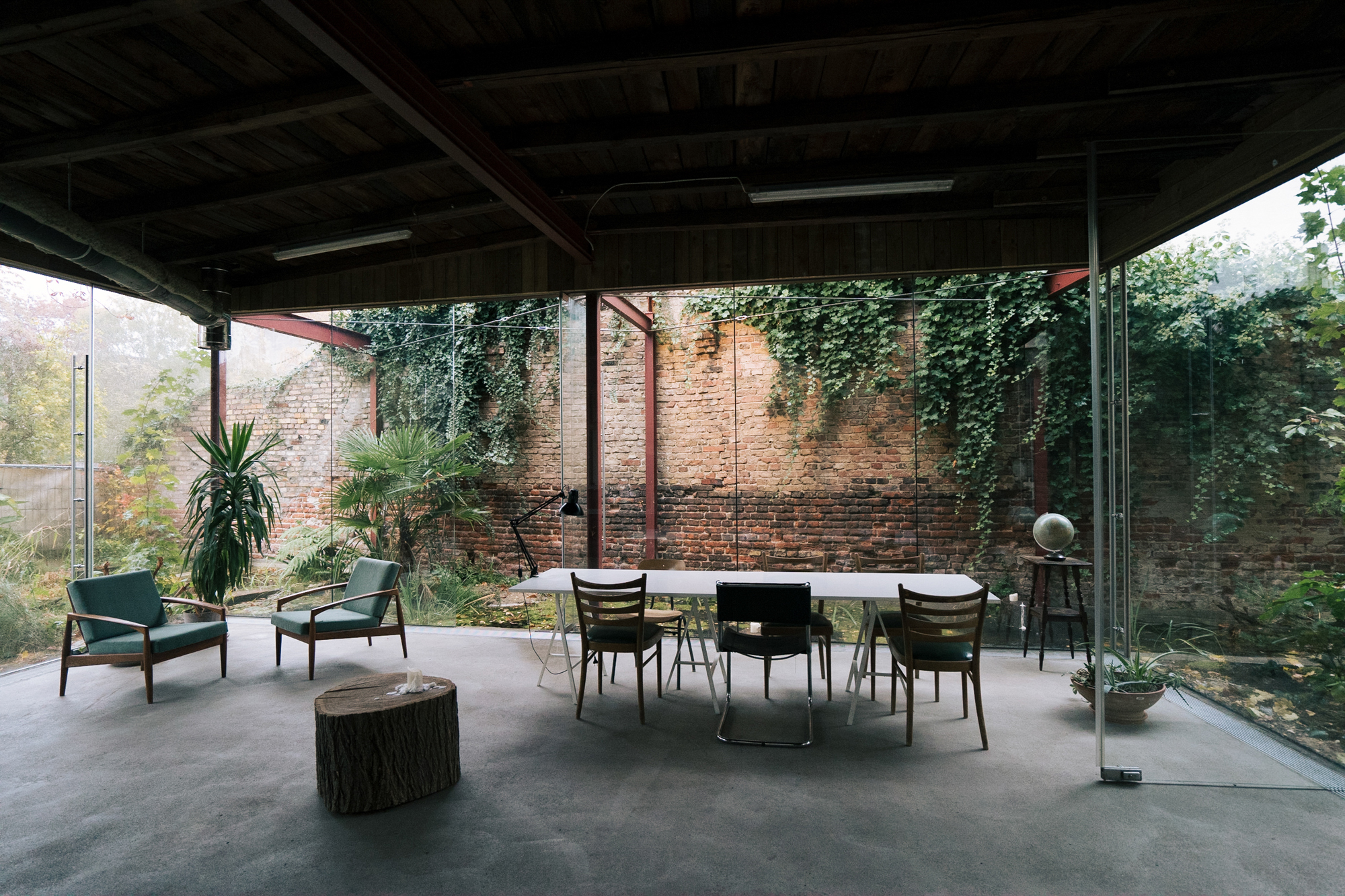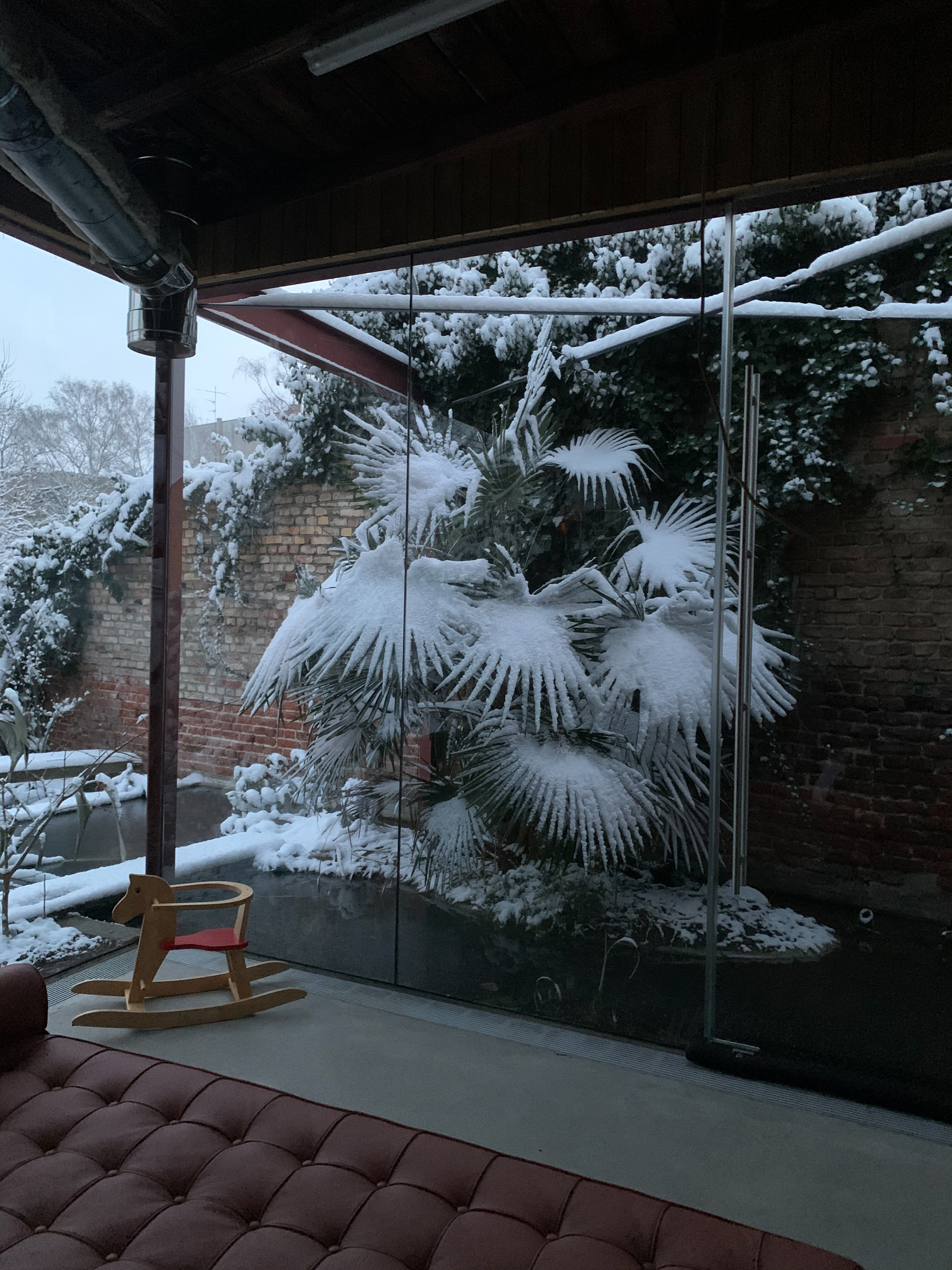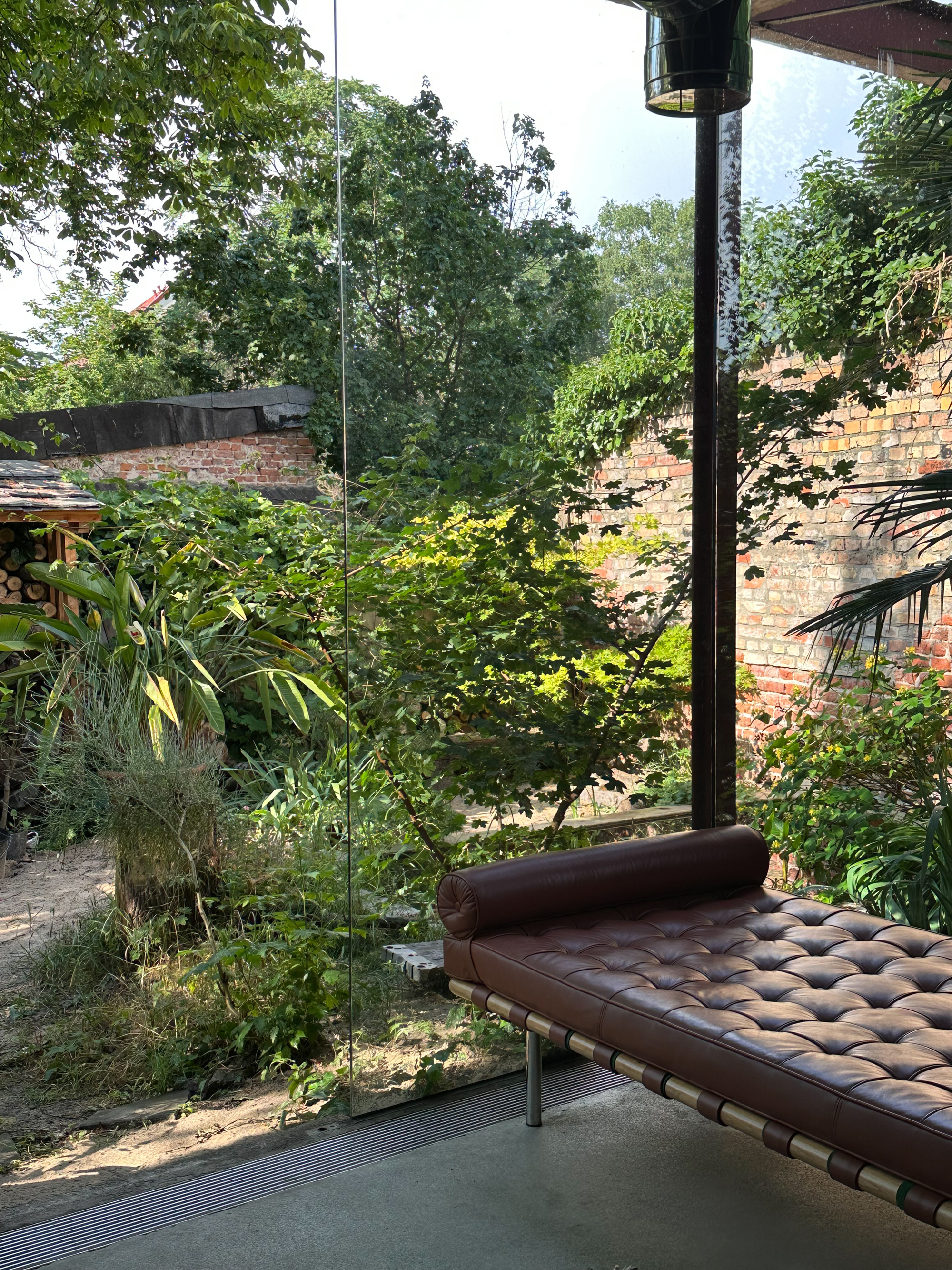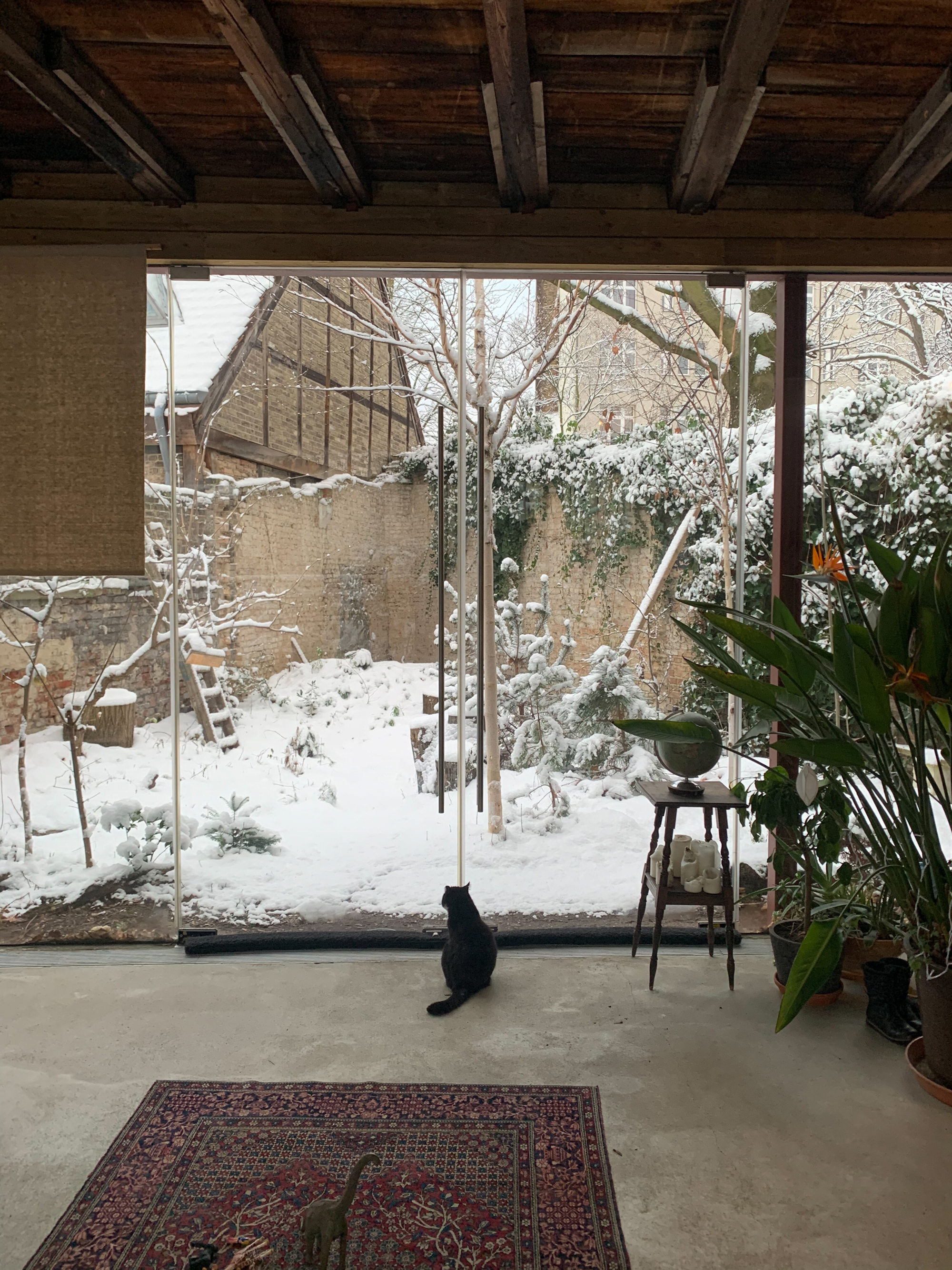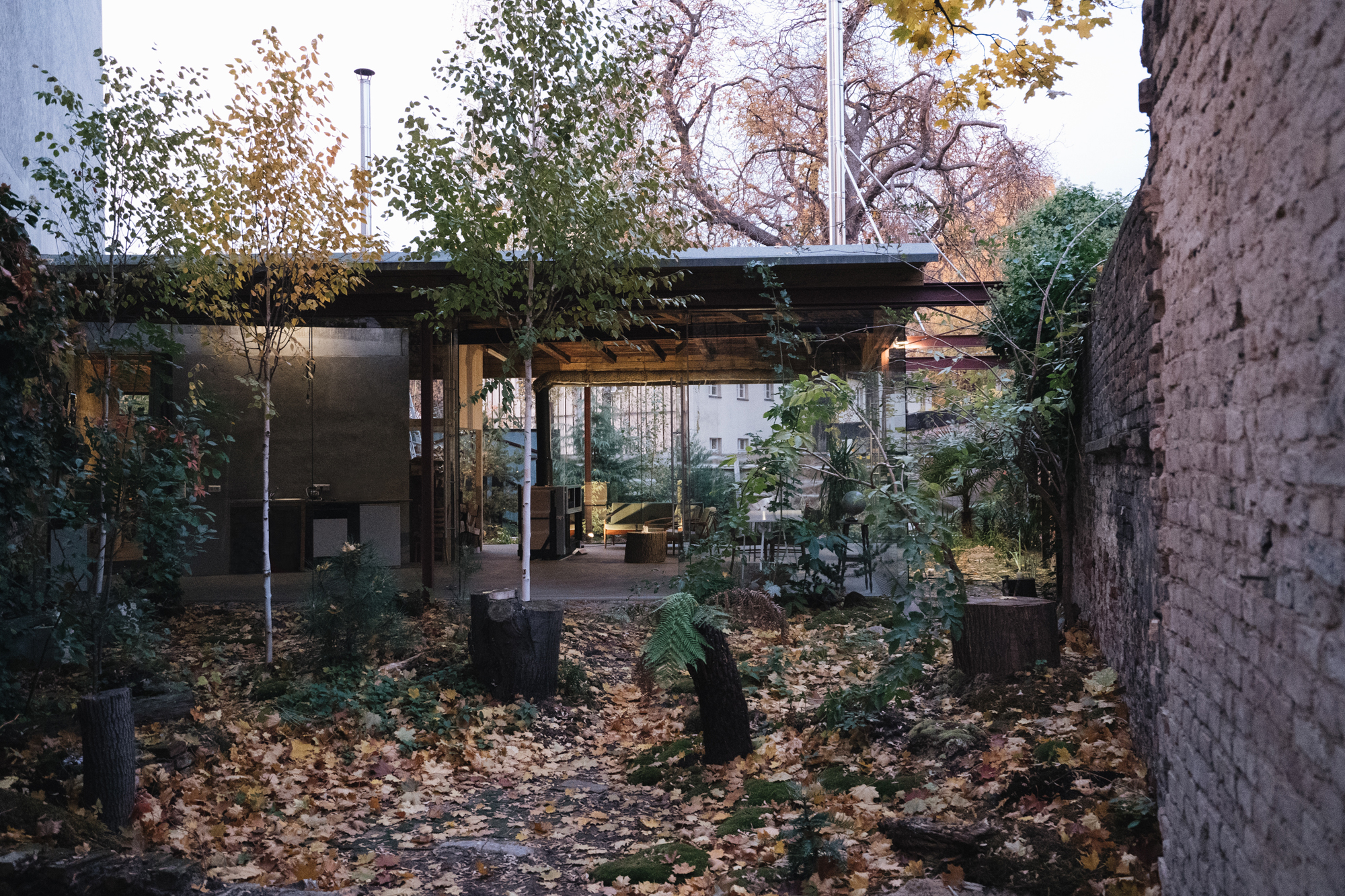 Today, the unsealed plot and green roof of the pavillon host an incredible diversity of plant, animal and funghi species. A unfiltered, 12 metre long pond, that is over 2 meters deep, connects the wild northern and southern parts of the garden. The roof is covered by another garden, which is slightly less wild, and more focused on food production. In winter, the house itself orients around a large fireplace, which‘s chimneys comically long shape responds to the legal exhaust distances in the dense urban environment. In summer, it opens to the pond and gardens.