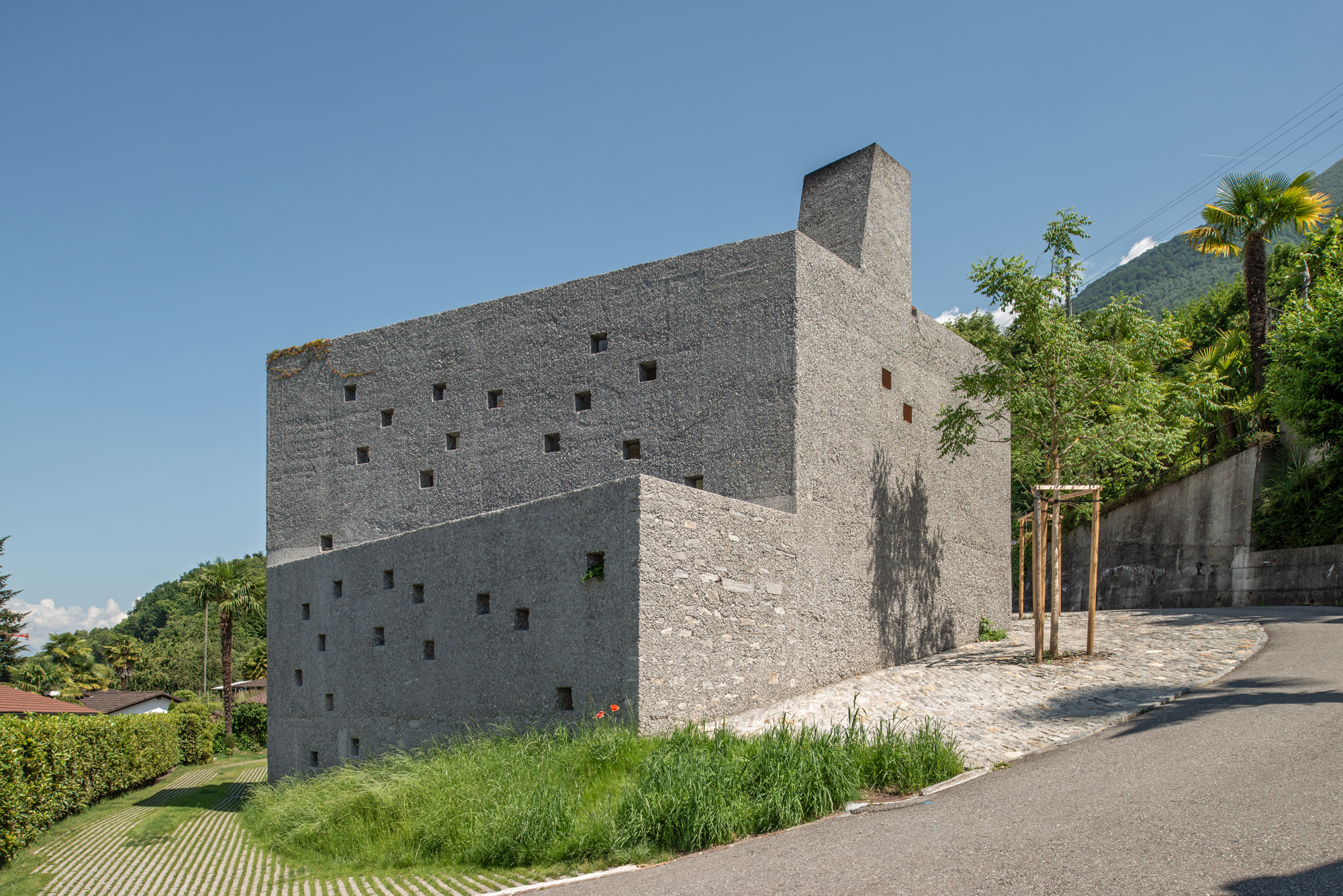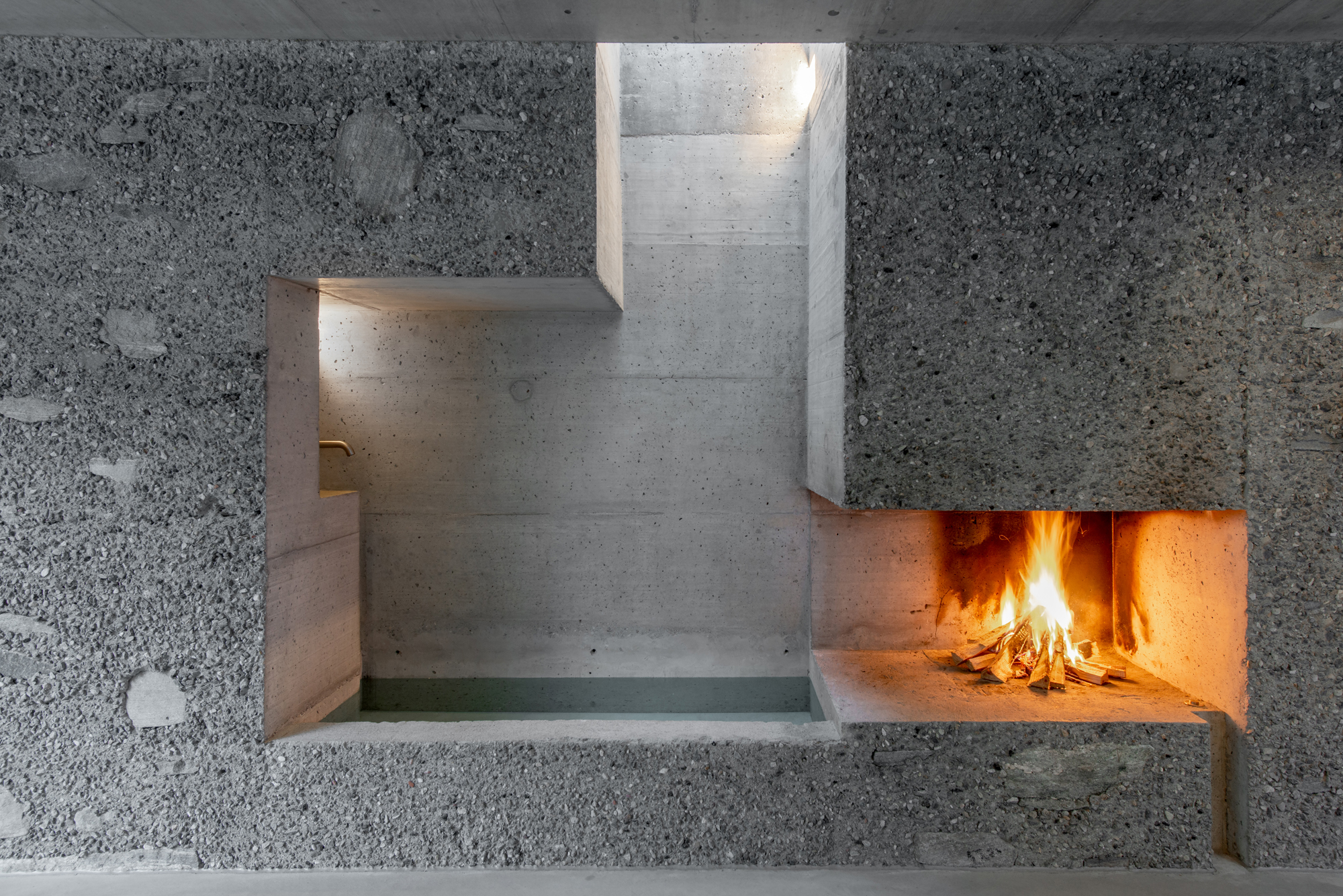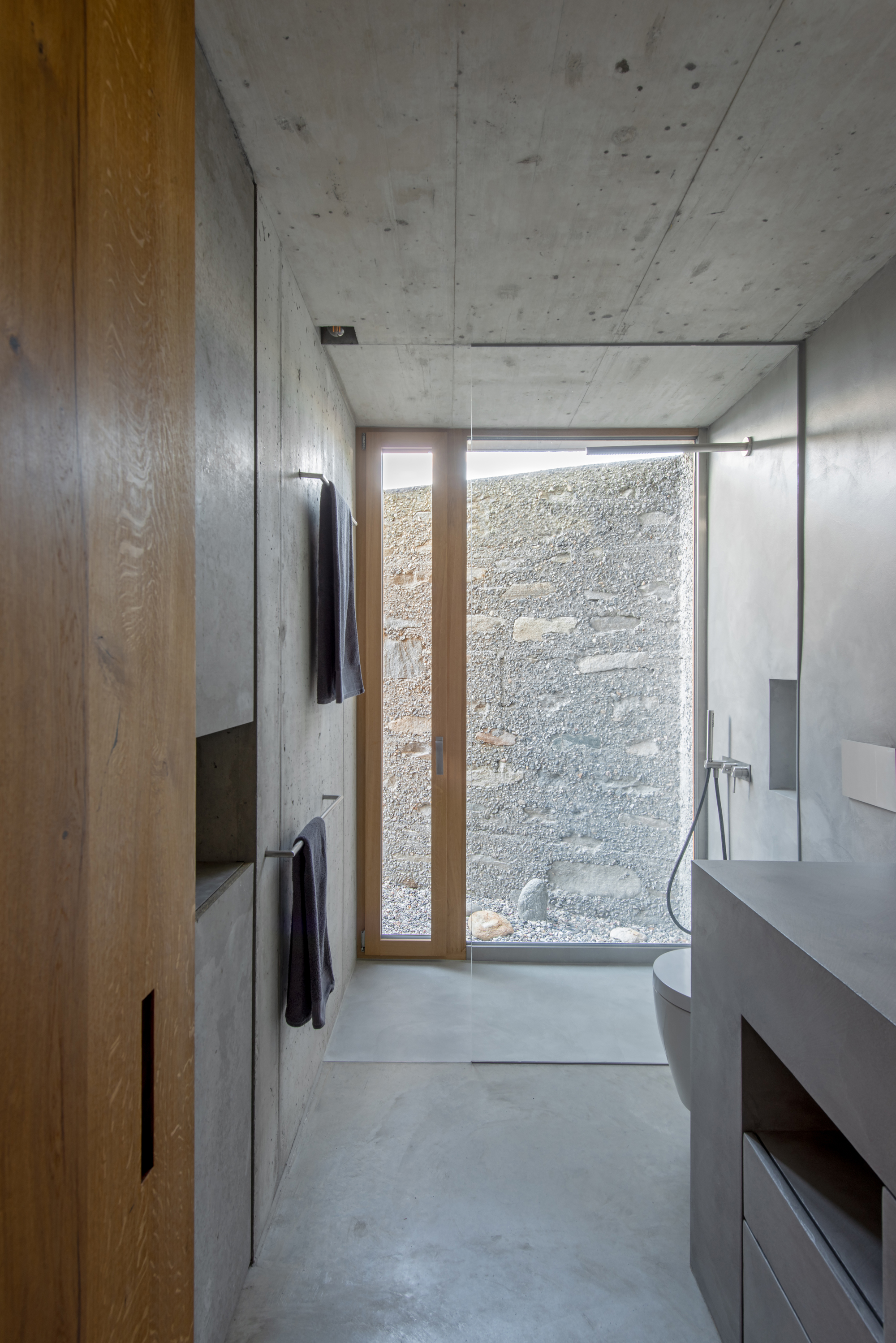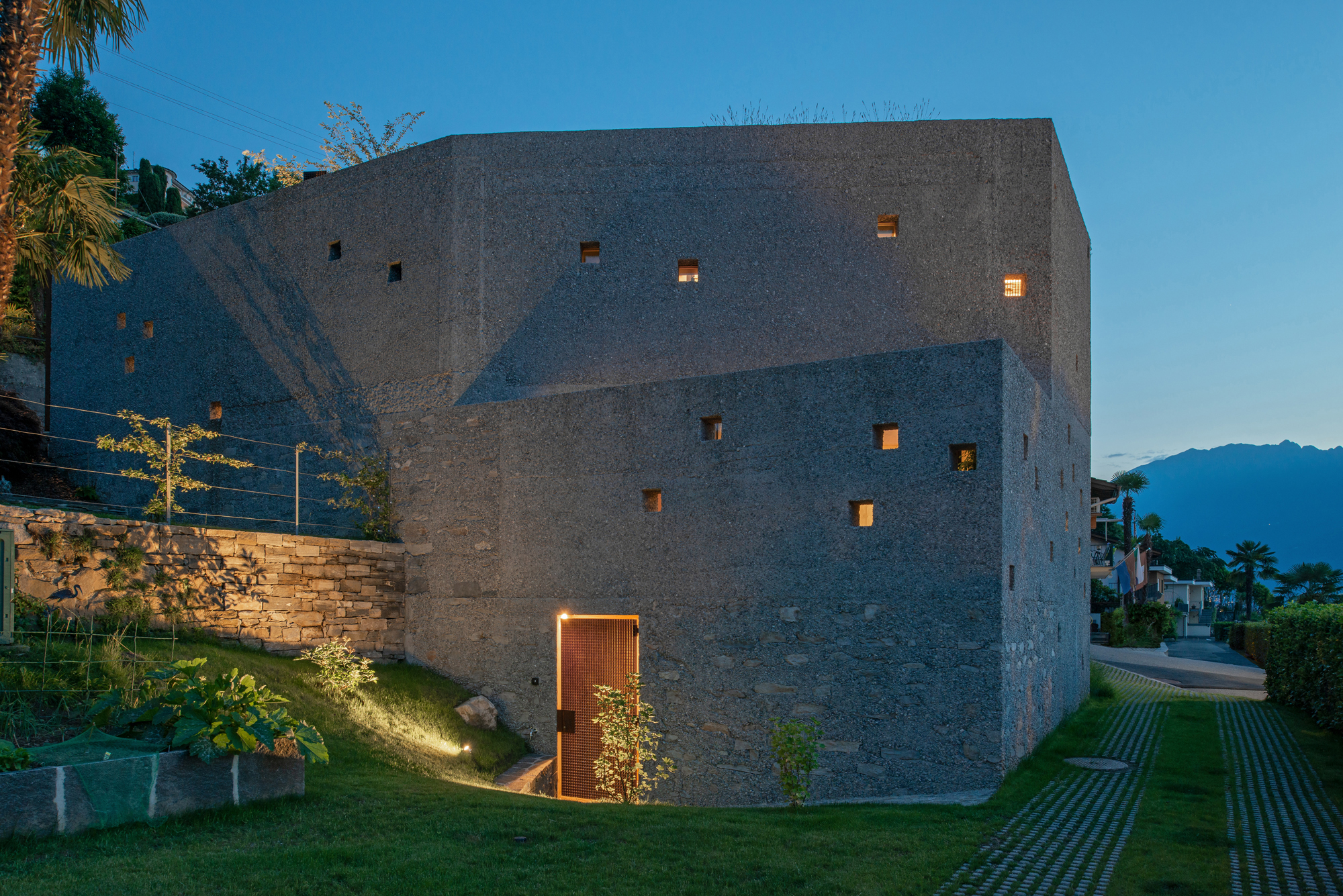 The house is designed for a family of four persons. The irregular outer form of the building is determined by the shape of the plot and the respective border distances. A clear rectangle is inscribed in this irregular form, which corresponds to the heated interior living space; on the valley and mountain sides, inner courtyards are located in front of the living space. The polygonal exterior form and the morphology of the terrain make the building appear as an archaic rock. This impression is reinforced by the rough washed concrete surfaces, which become increasingly darker through weathering, the climbing plants on the façades and the few small square wall openings.