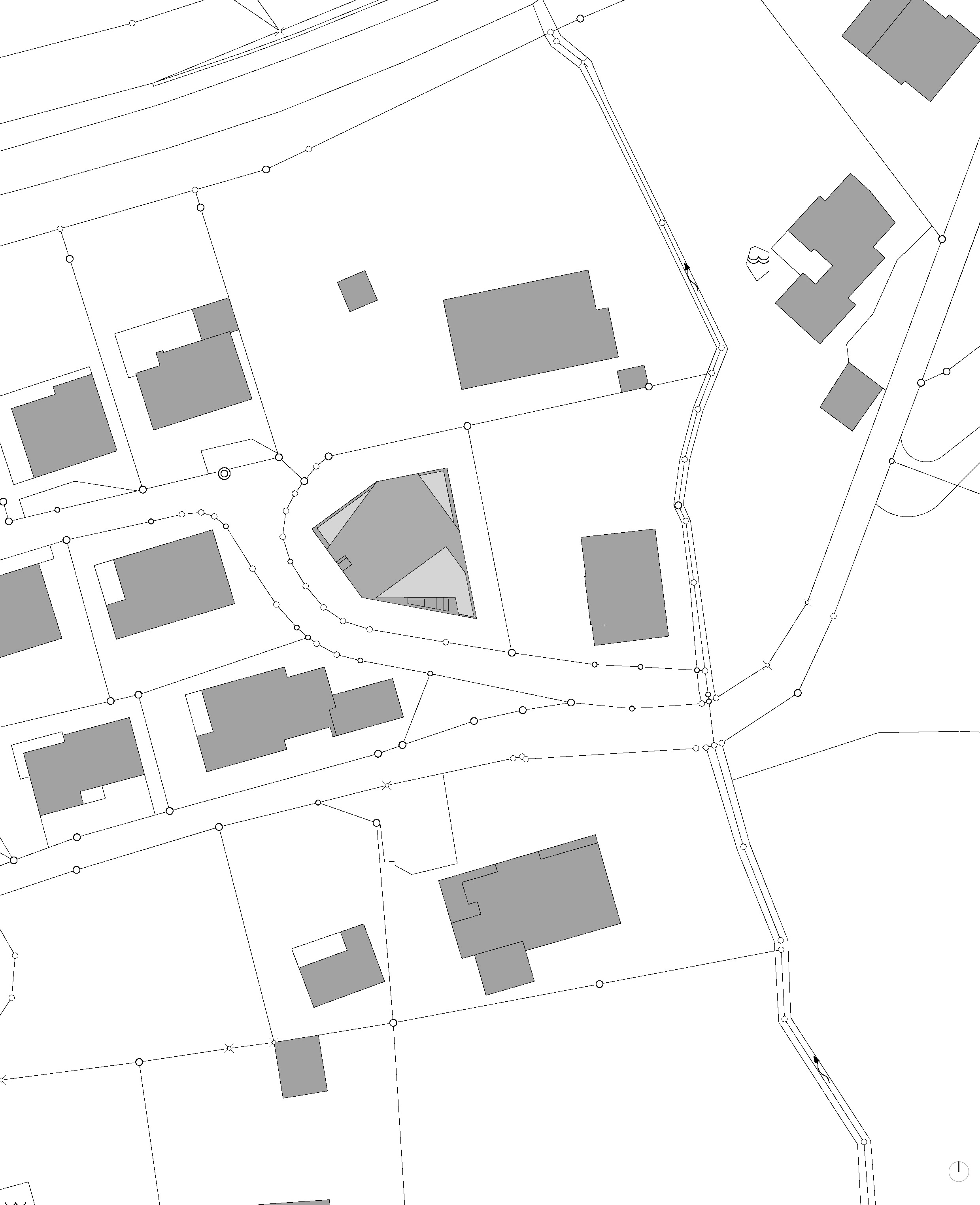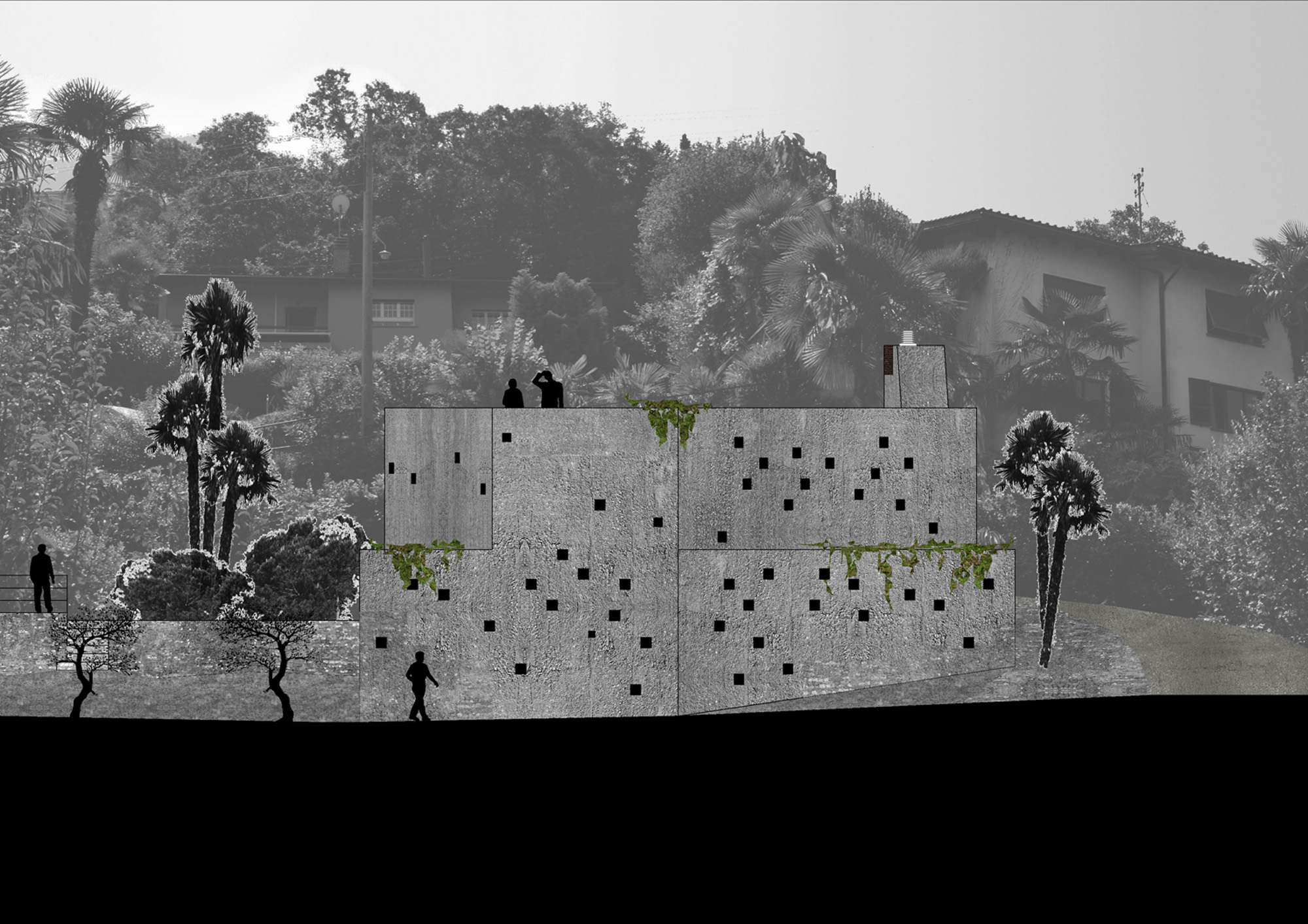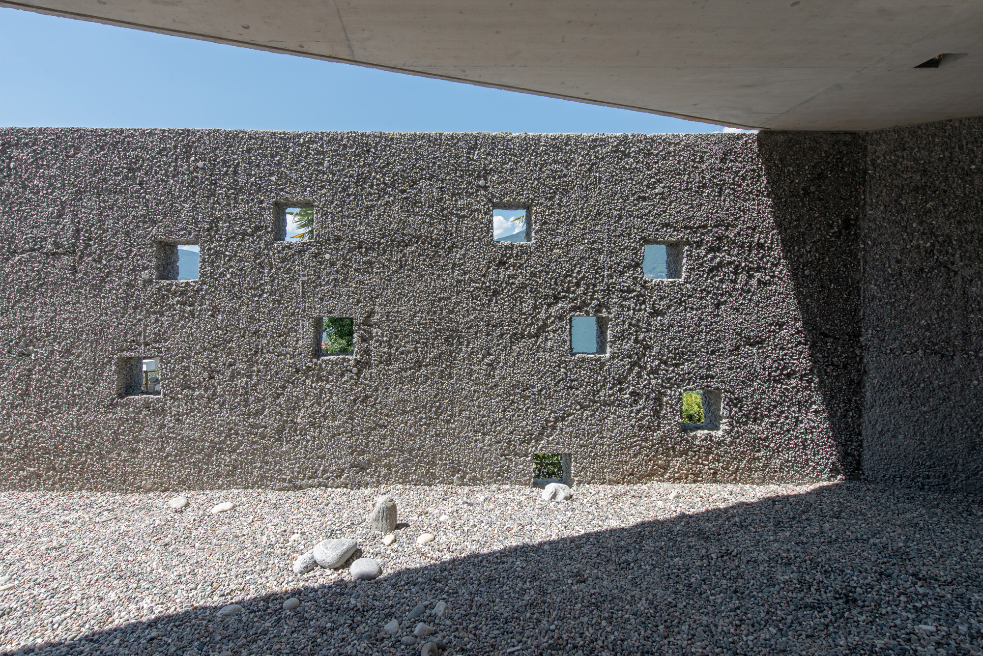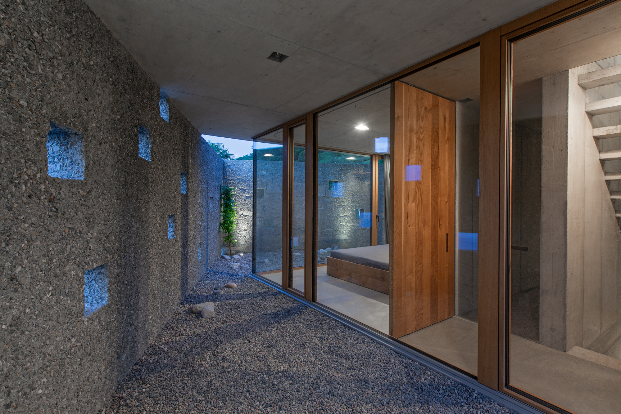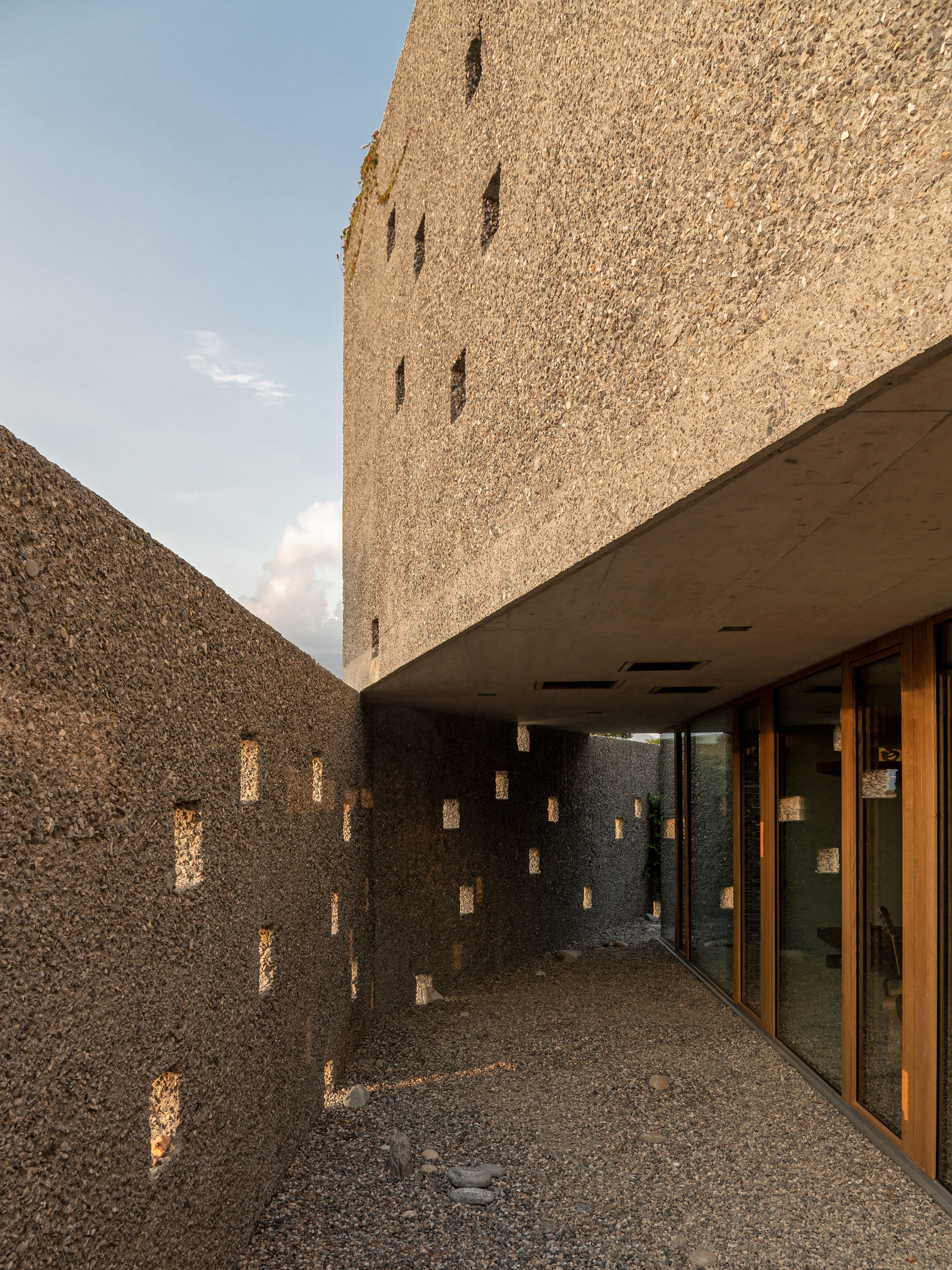 The house is designed for a family of four persons. The irregular outer form of the building is determined by the shape of the plot and the respective border distances. A clear rectangle is inscribed in this irregular form, which corresponds to the heated interior living space; on the valley and mountain sides, inner courtyards are located in front of the living space. The polygonal exterior form and the morphology of the terrain make the building appear as an archaic rock. This impression is reinforced by the rough washed concrete surfaces, which become increasingly darker through weathering, the climbing plants on the façades and the few small square wall openings.