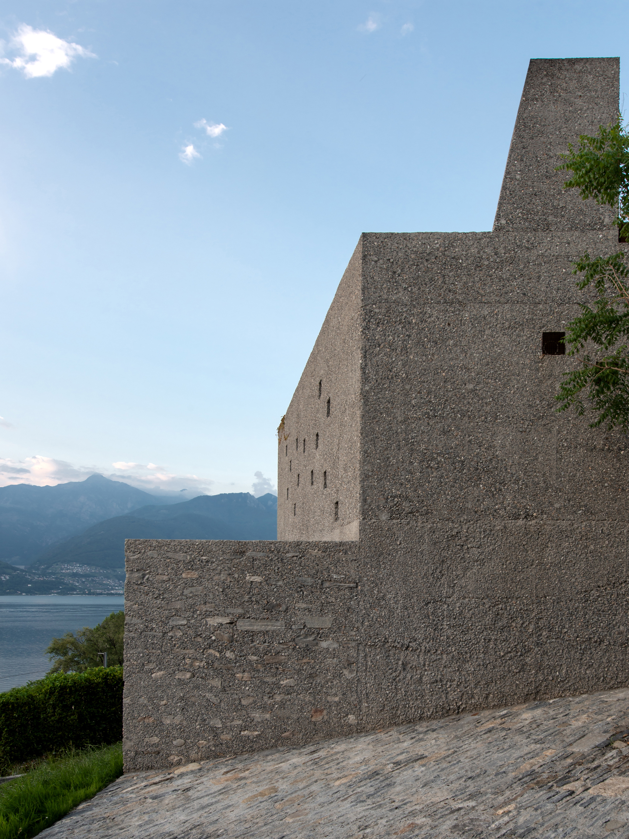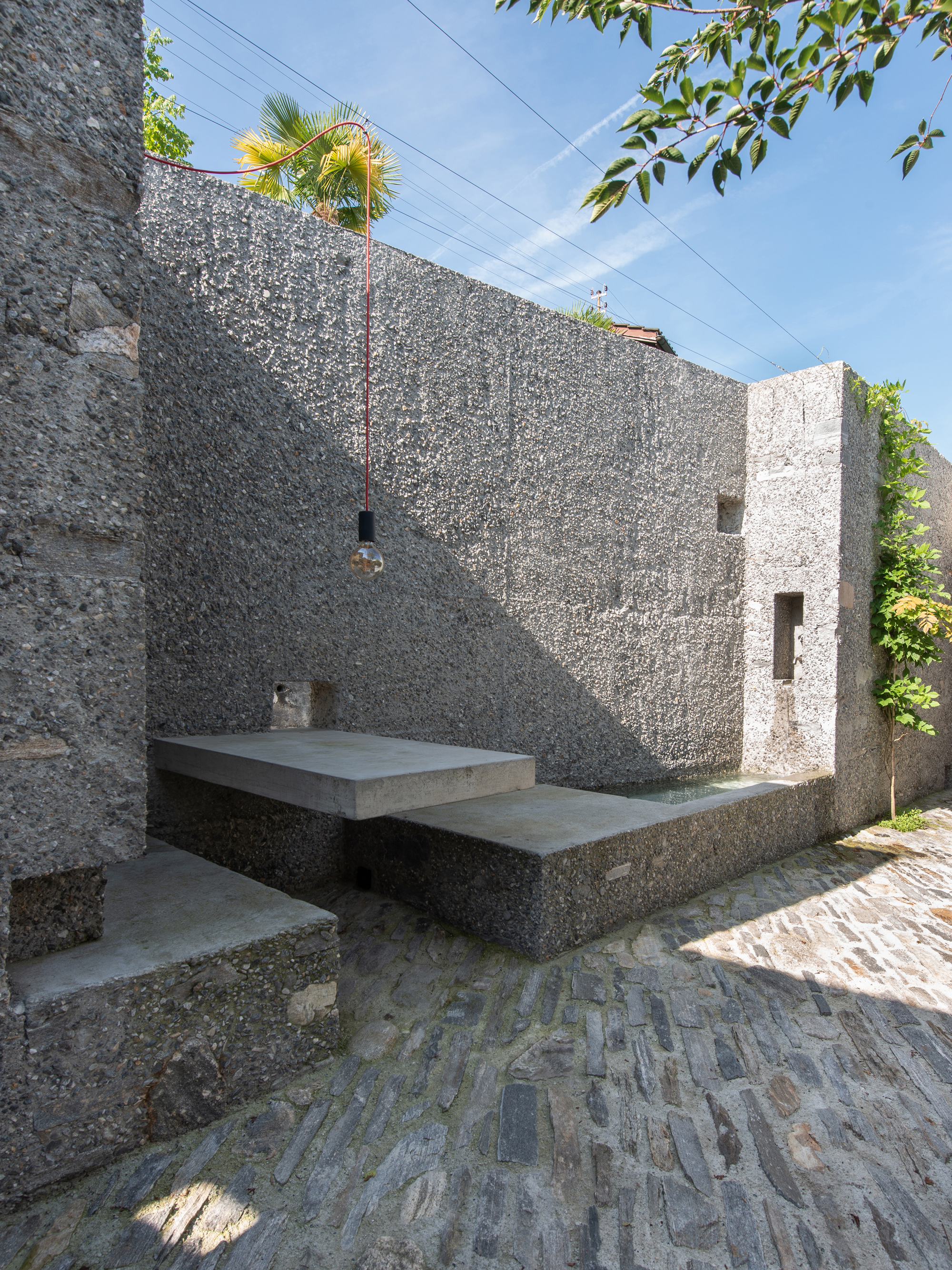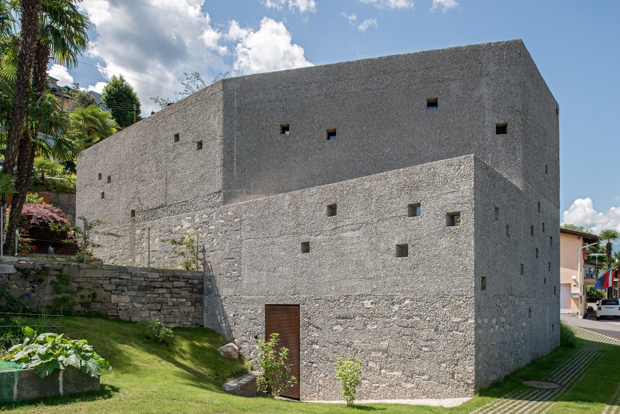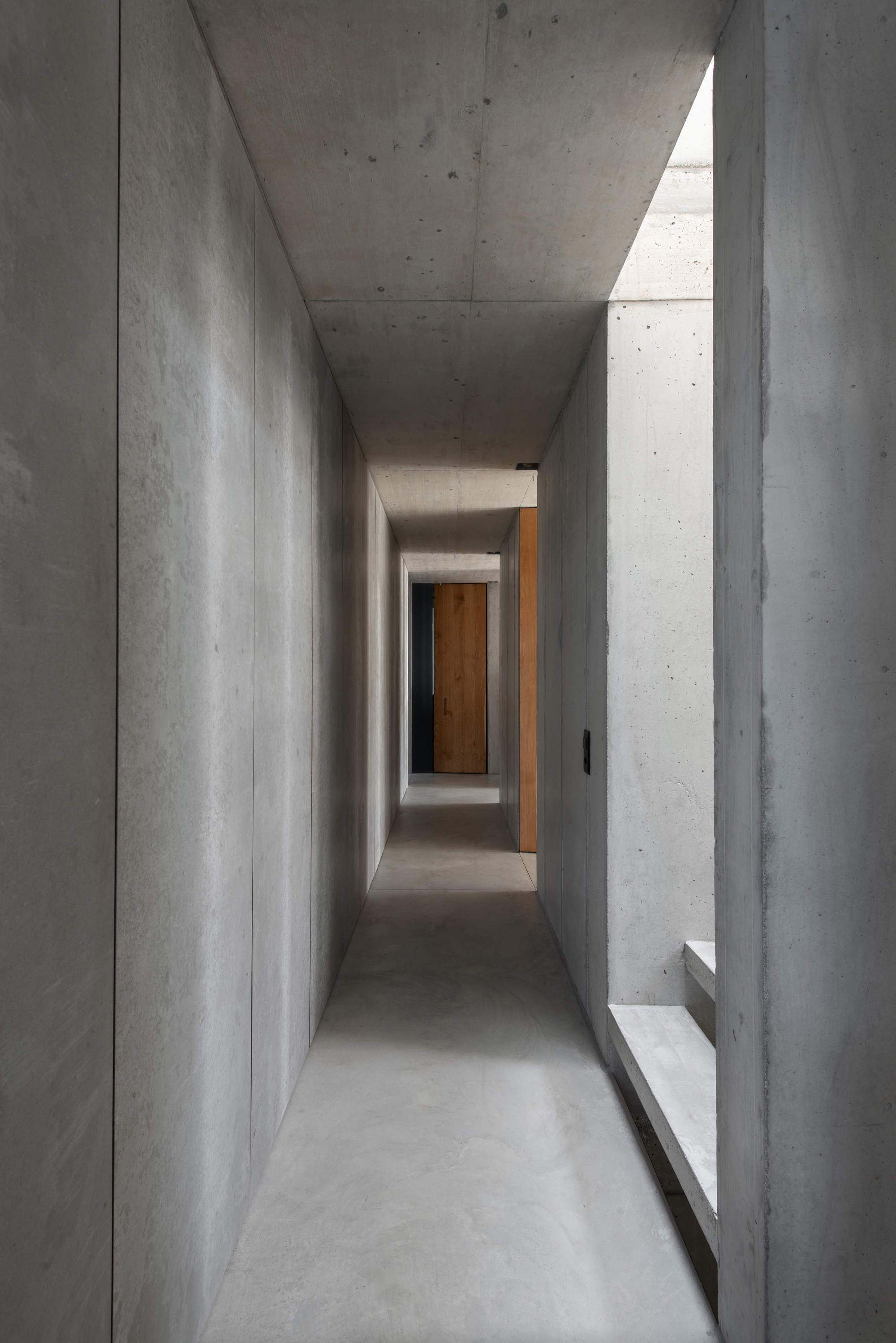 The house is designed for a family of four persons. The irregular outer form of the building is determined by the shape of the plot and the respective border distances. A clear rectangle is inscribed in this irregular form, which corresponds to the heated interior living space; on the valley and mountain sides, inner courtyards are located in front of the living space. The polygonal exterior form and the morphology of the terrain make the building appear as an archaic rock. This impression is reinforced by the rough washed concrete surfaces, which become increasingly darker through weathering, the climbing plants on the façades and the few small square wall openings.
