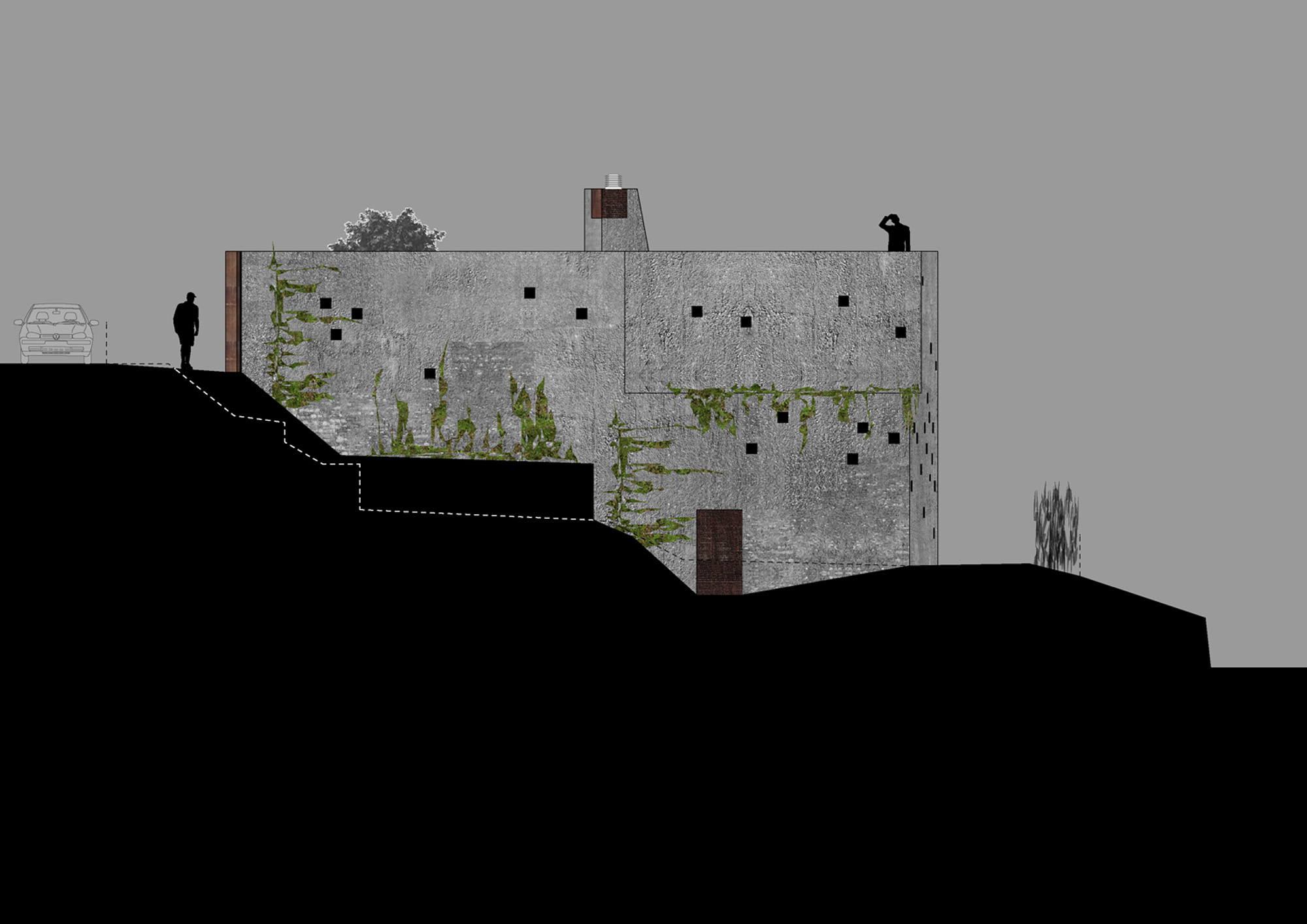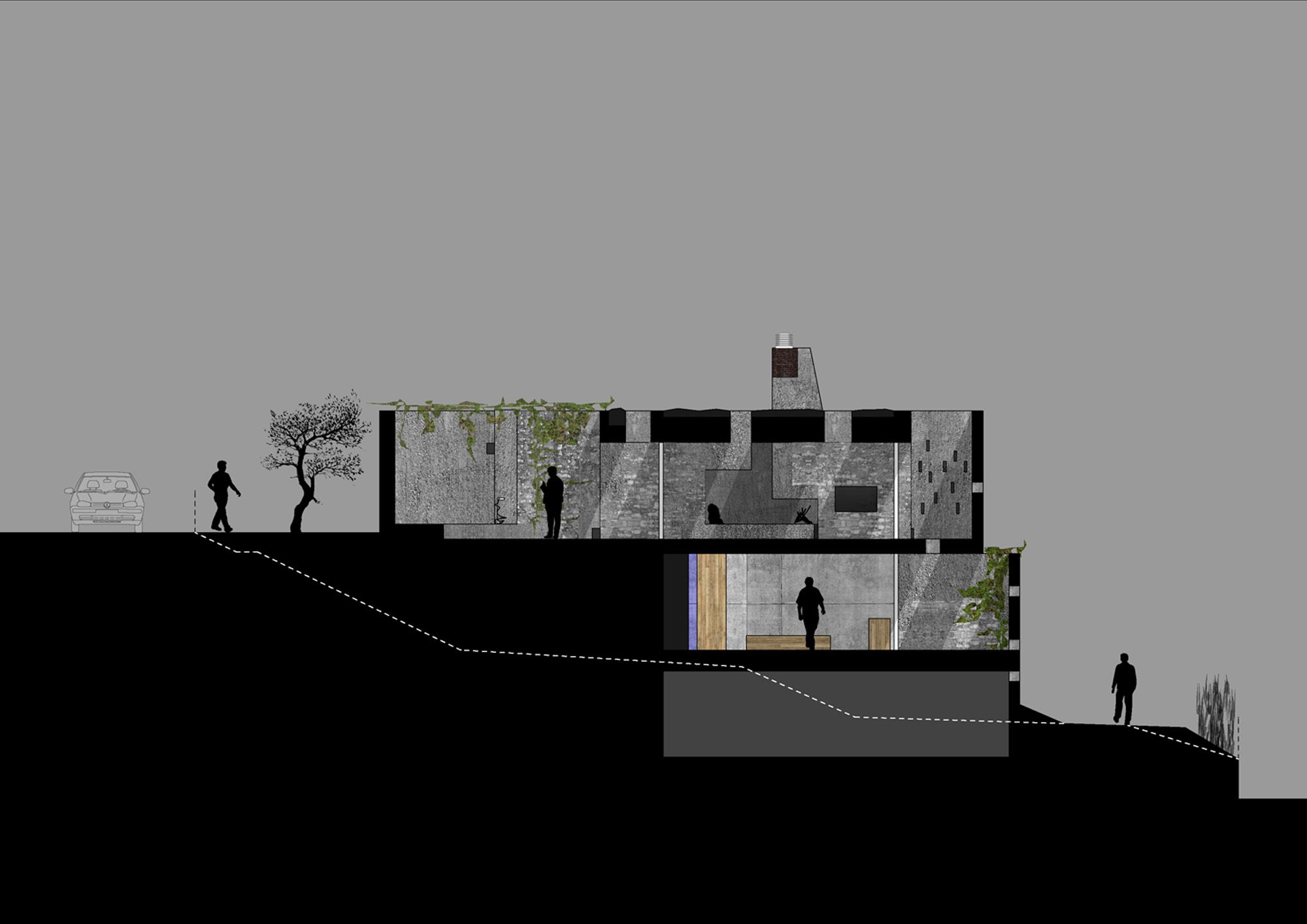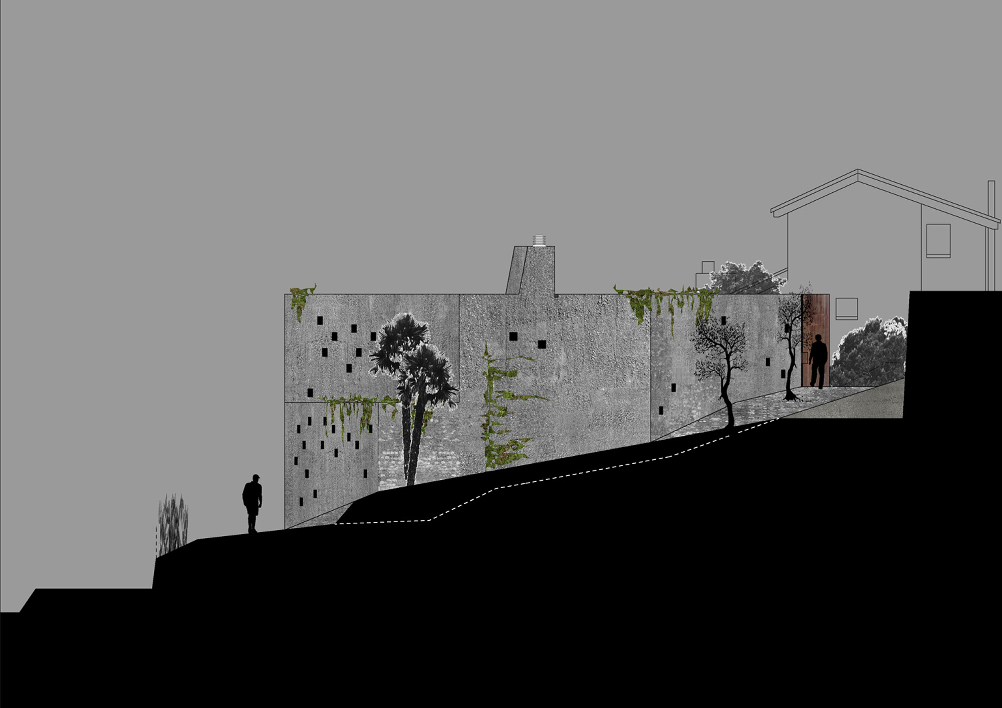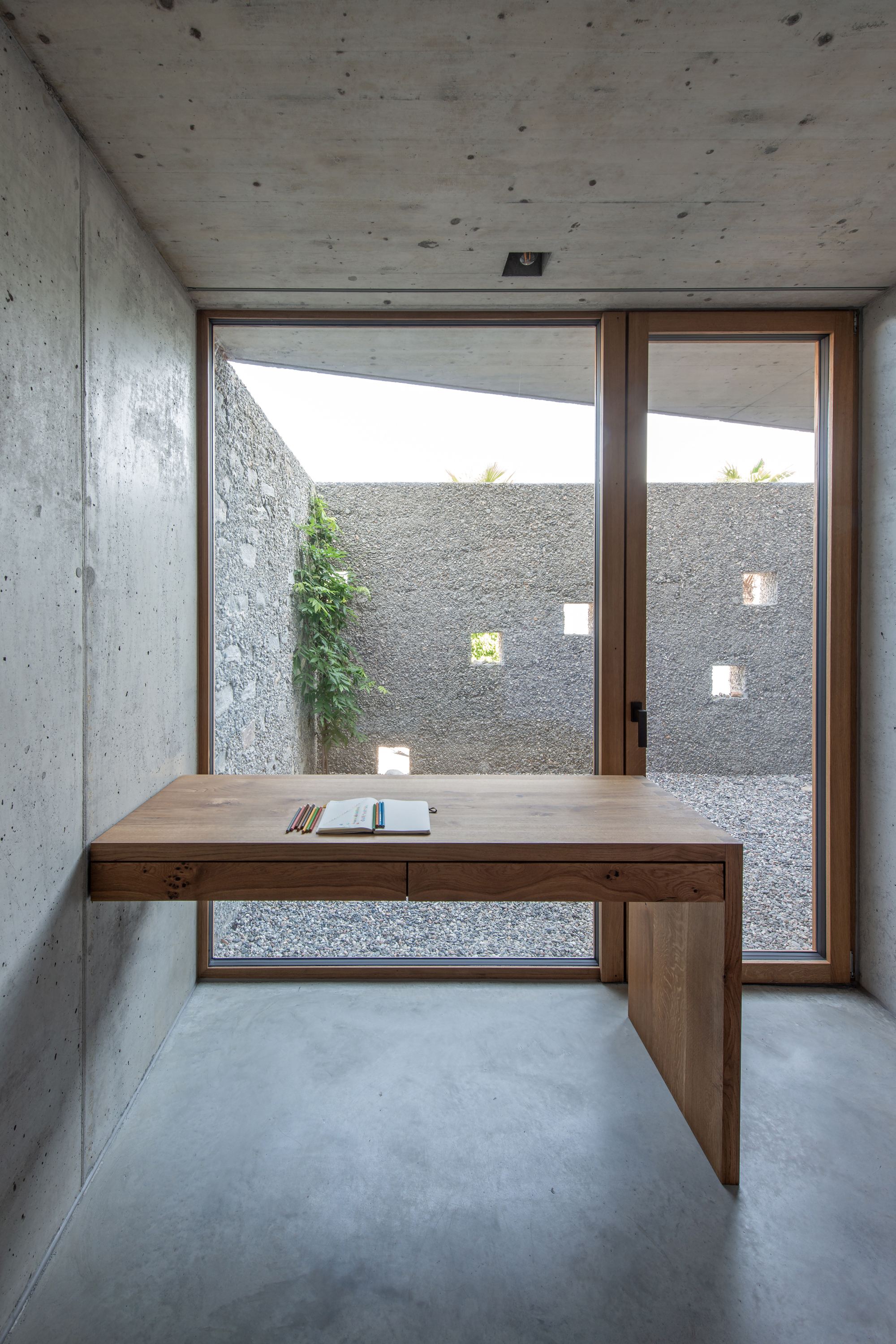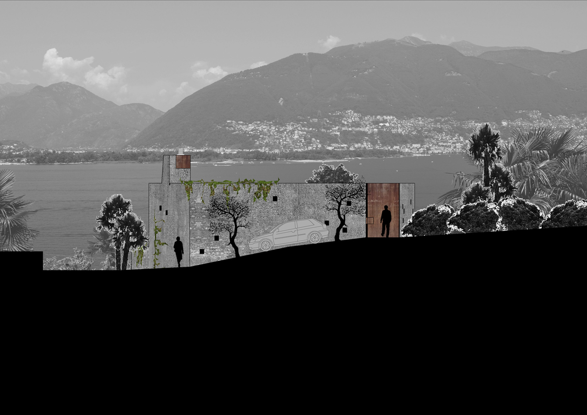 The house is designed for a family of four persons. The irregular outer form of the building is determined by the shape of the plot and the respective border distances. A clear rectangle is inscribed in this irregular form, which corresponds to the heated interior living space; on the valley and mountain sides, inner courtyards are located in front of the living space. The polygonal exterior form and the morphology of the terrain make the building appear as an archaic rock. This impression is reinforced by the rough washed concrete surfaces, which become increasingly darker through weathering, the climbing plants on the façades and the few small square wall openings.