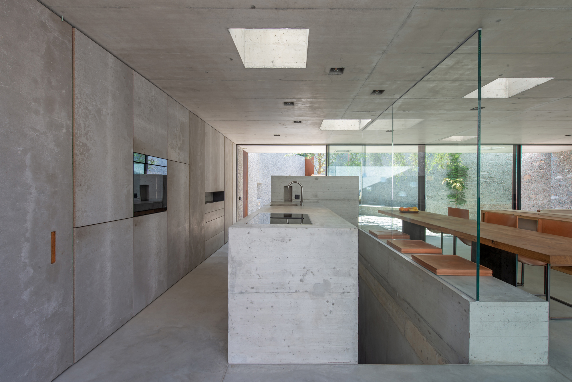 The closed walls of the courtyard on the lake side reflect the sunlight into the interior. In a thick wall there is an external staircase leading up to a small roof terrace, which offers an unlimited view of the lake and the landscape. The living-dining space with the open kitchen acts as an outdoor space in dialogue with the partly green inner courtyards on the mountain and valley sides, further enhanced by various roof lights, and thus conveys the changing atmosphere and light in an unusually intense way.