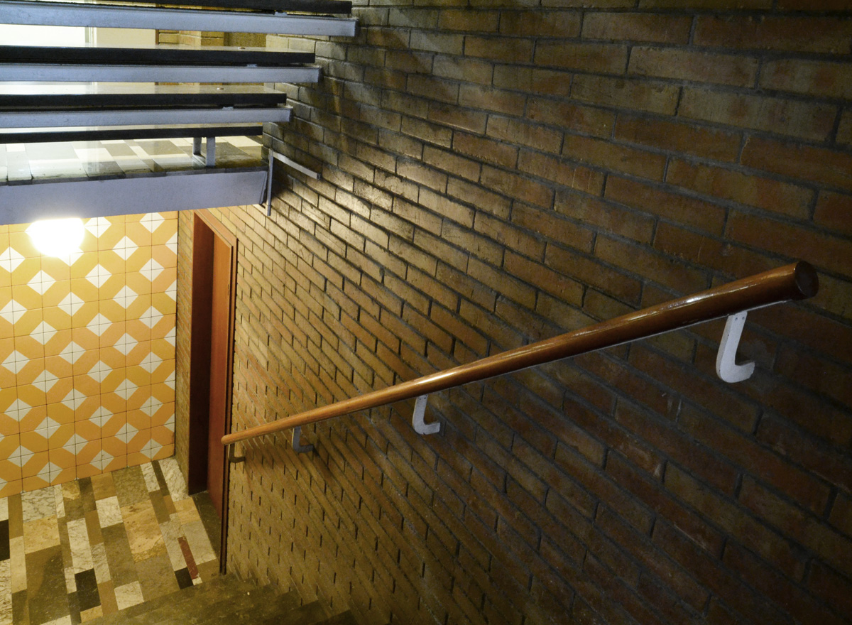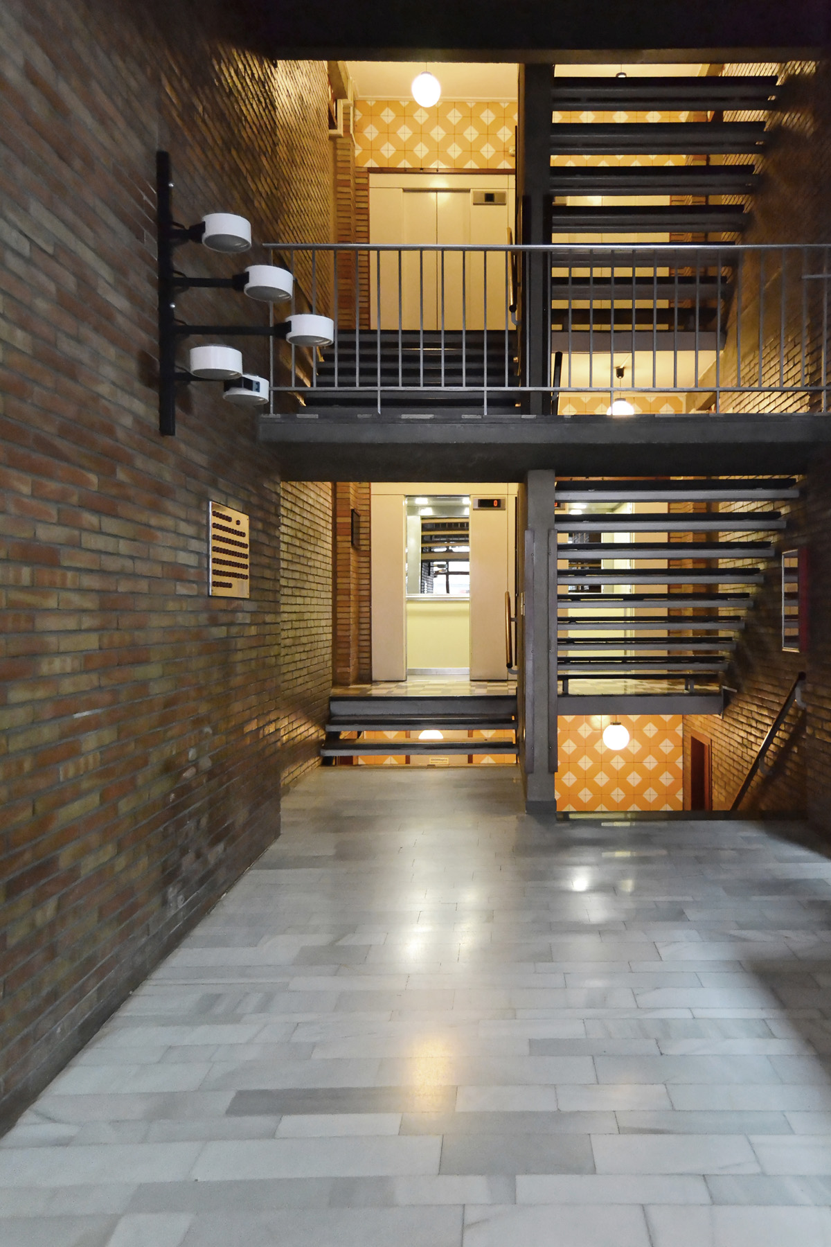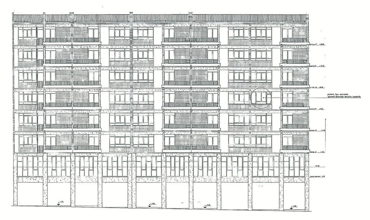 En el interior, la agrupación de los ascensores a las viviendas permite crear espacios semipúblicos, capaces de diferenciarse de las zonas únicamente de circulación, se trata de espacios especialmente detallados que muestran como hilo conector, desde la primera planta hasta la última, el embadosado cerámico.