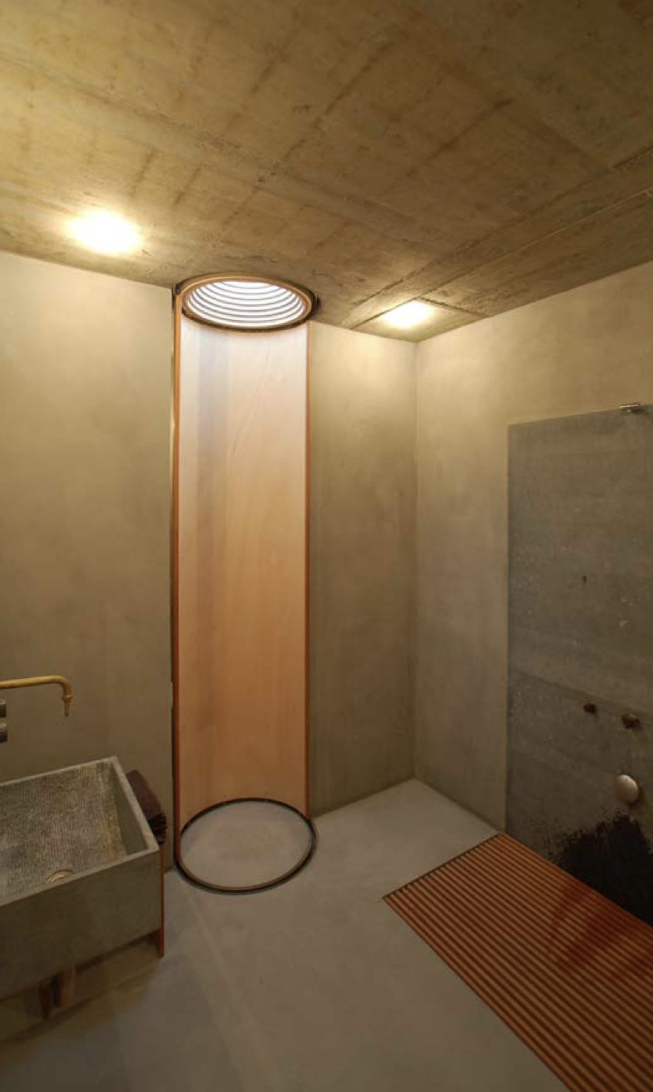 The floor is a fine-grained light-gray Estrich, with narrow marble strips, and the walls are made of stucco with marble additions. The wooden roof is supported by a white steel ridge beam. In the southern end, there is a large round window with blue mouth-blown glass, a reference to the glassblowers who used to work in Kevelaer. Once a month a full moon shines through the window and throws a blue light into the white space – creating a Blue Moon.