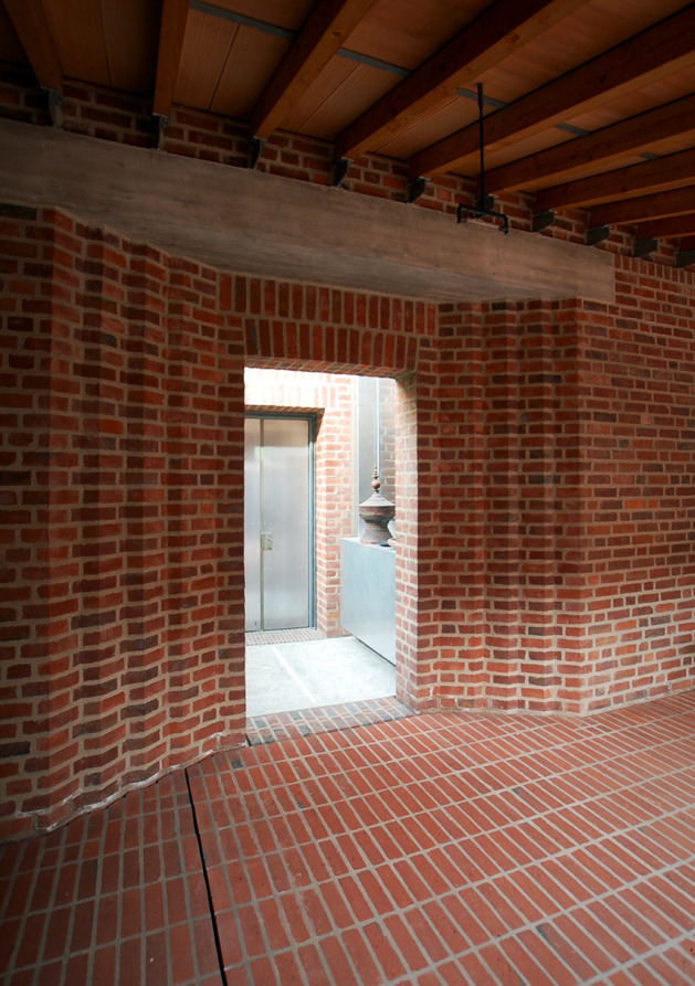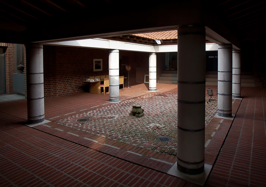 The atrium is completed with a library and a garden room. The library is an introverted room with a view of the garden. The same stones are used in the atrium, the library floors and in the walls (but in a smaller size and with a carpet-like design).