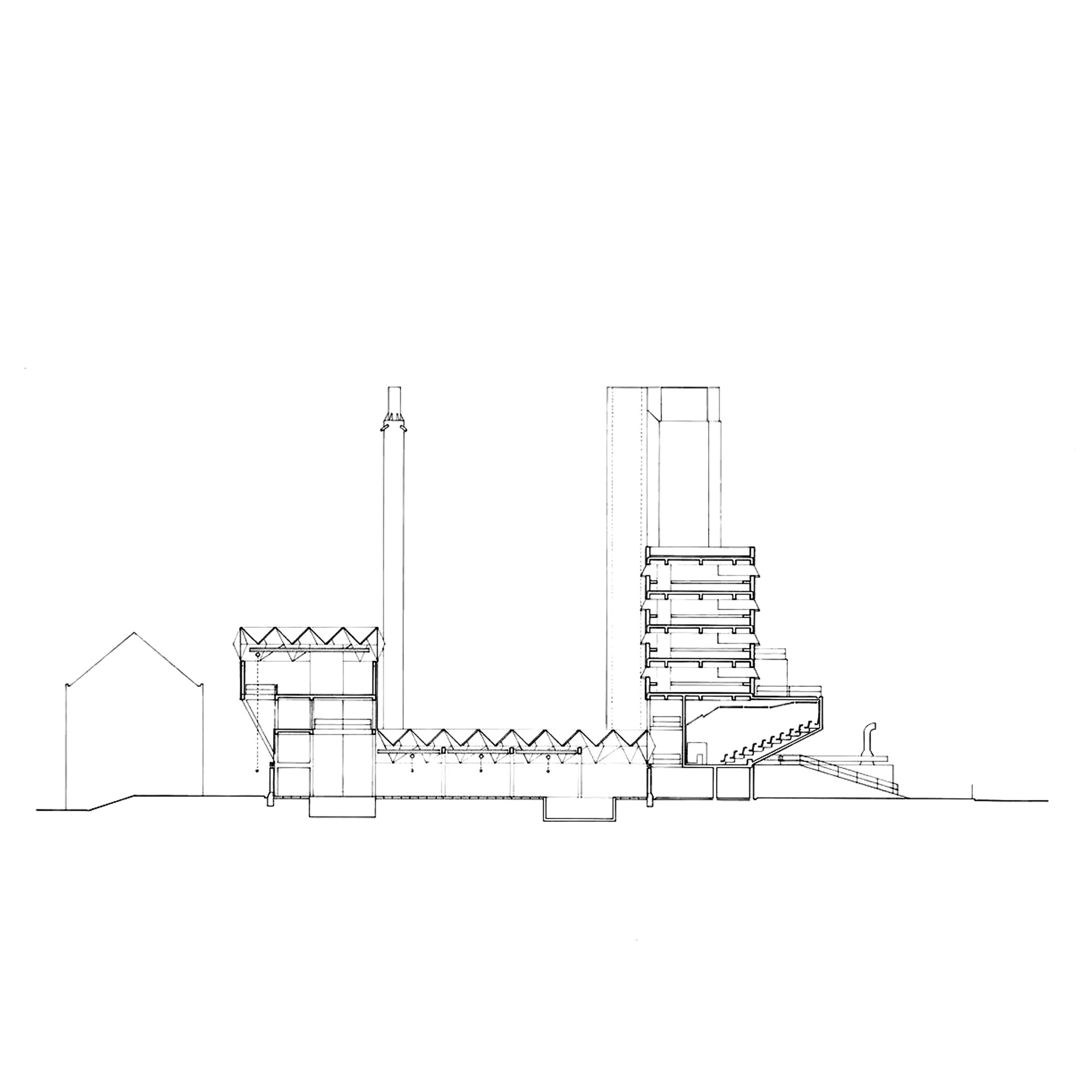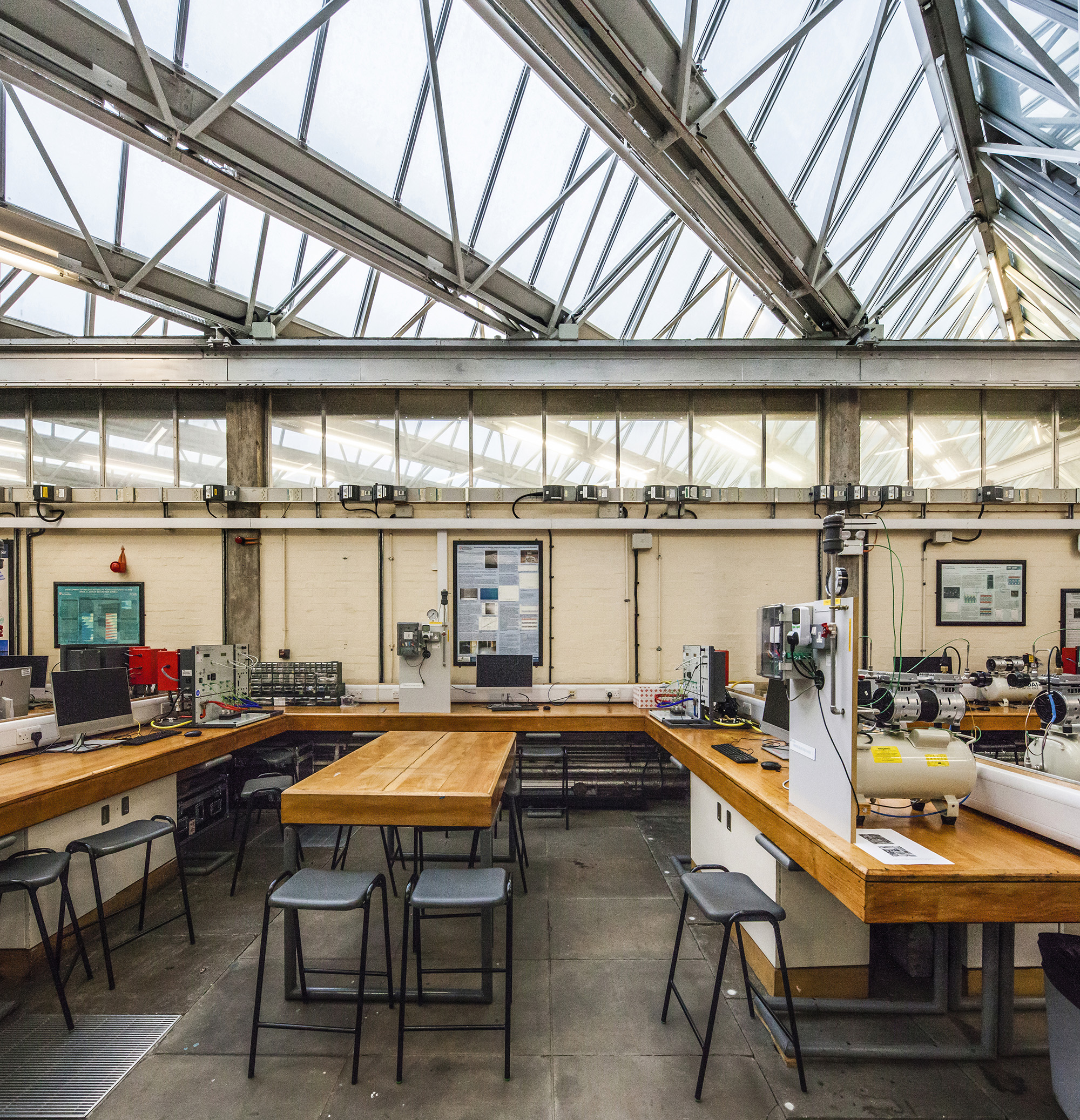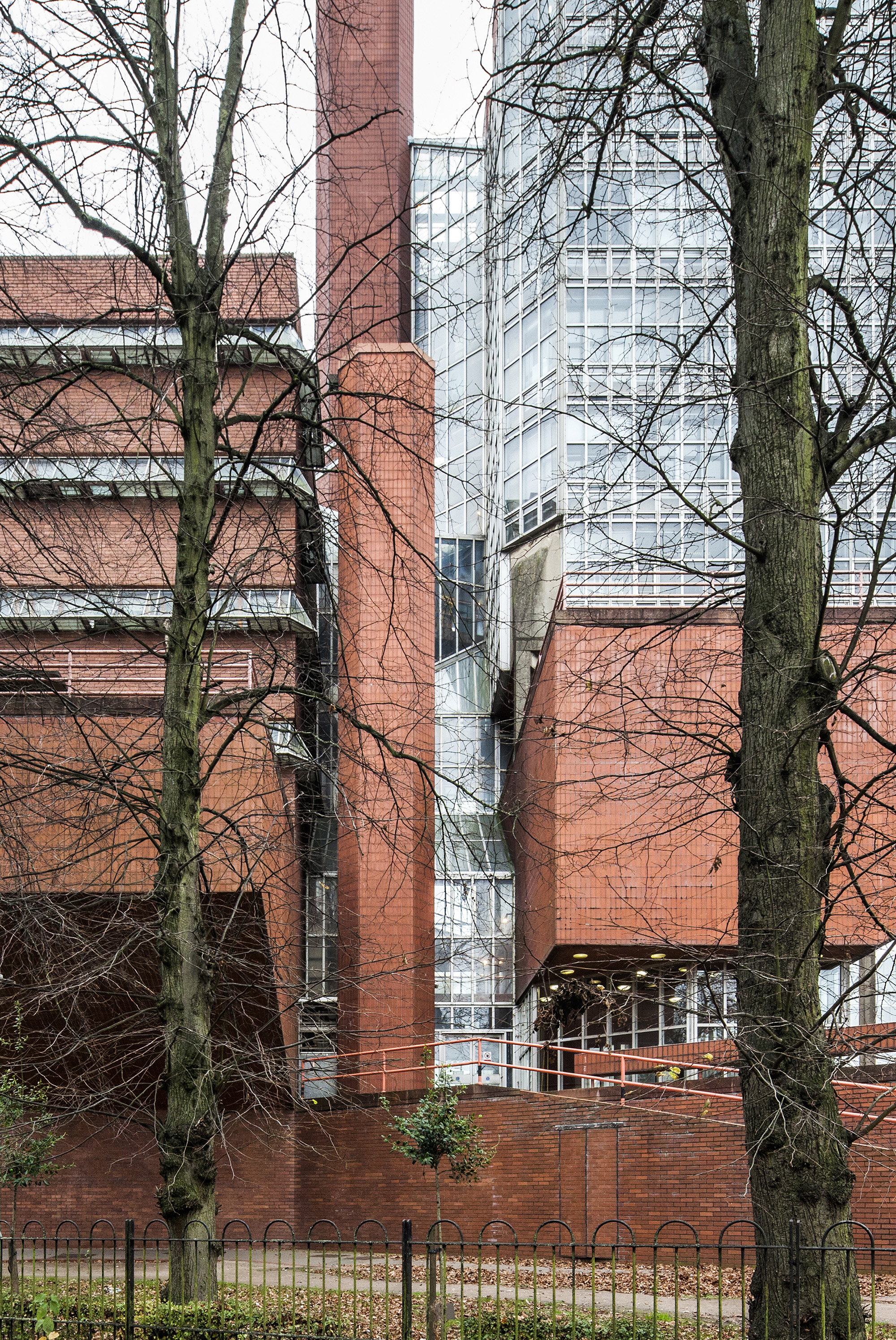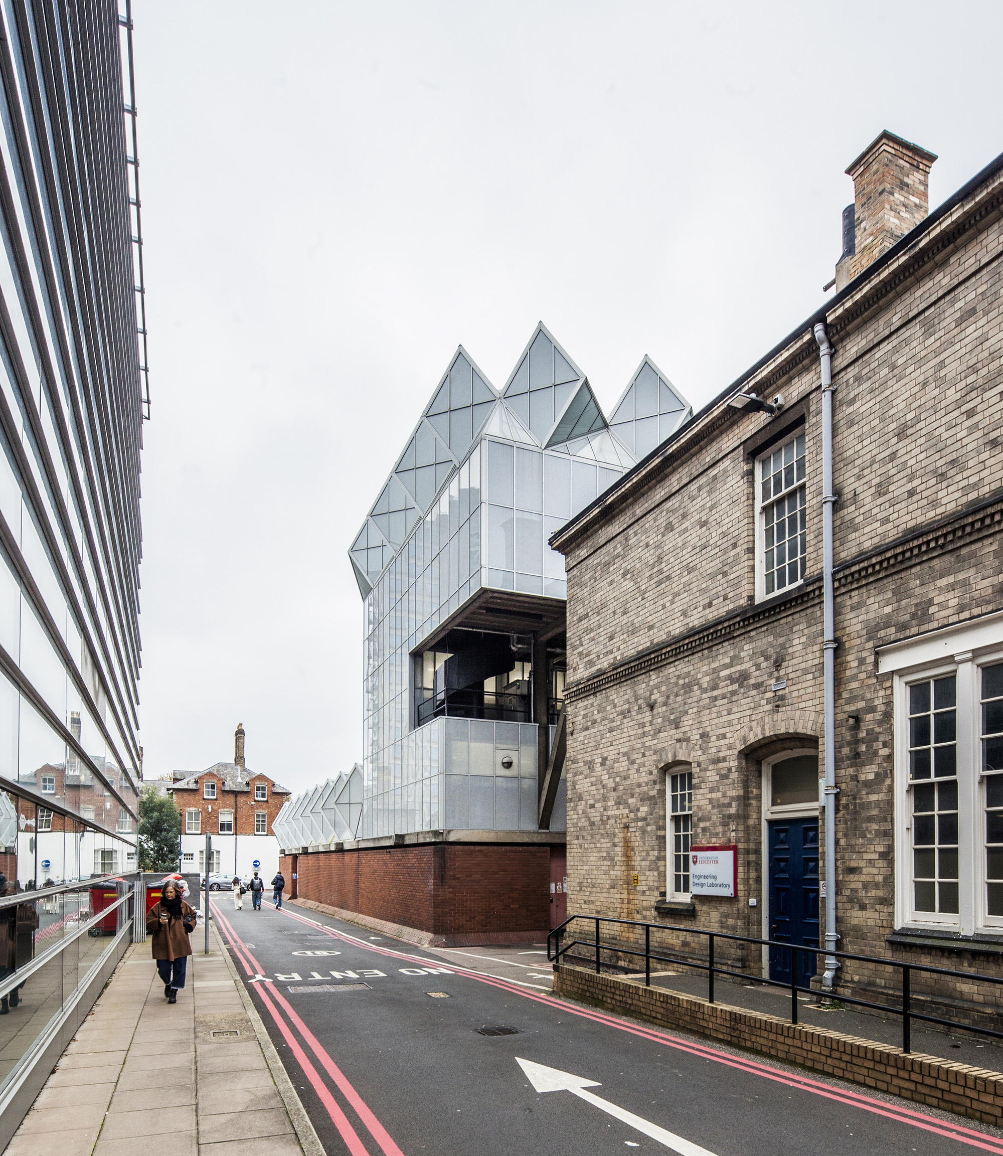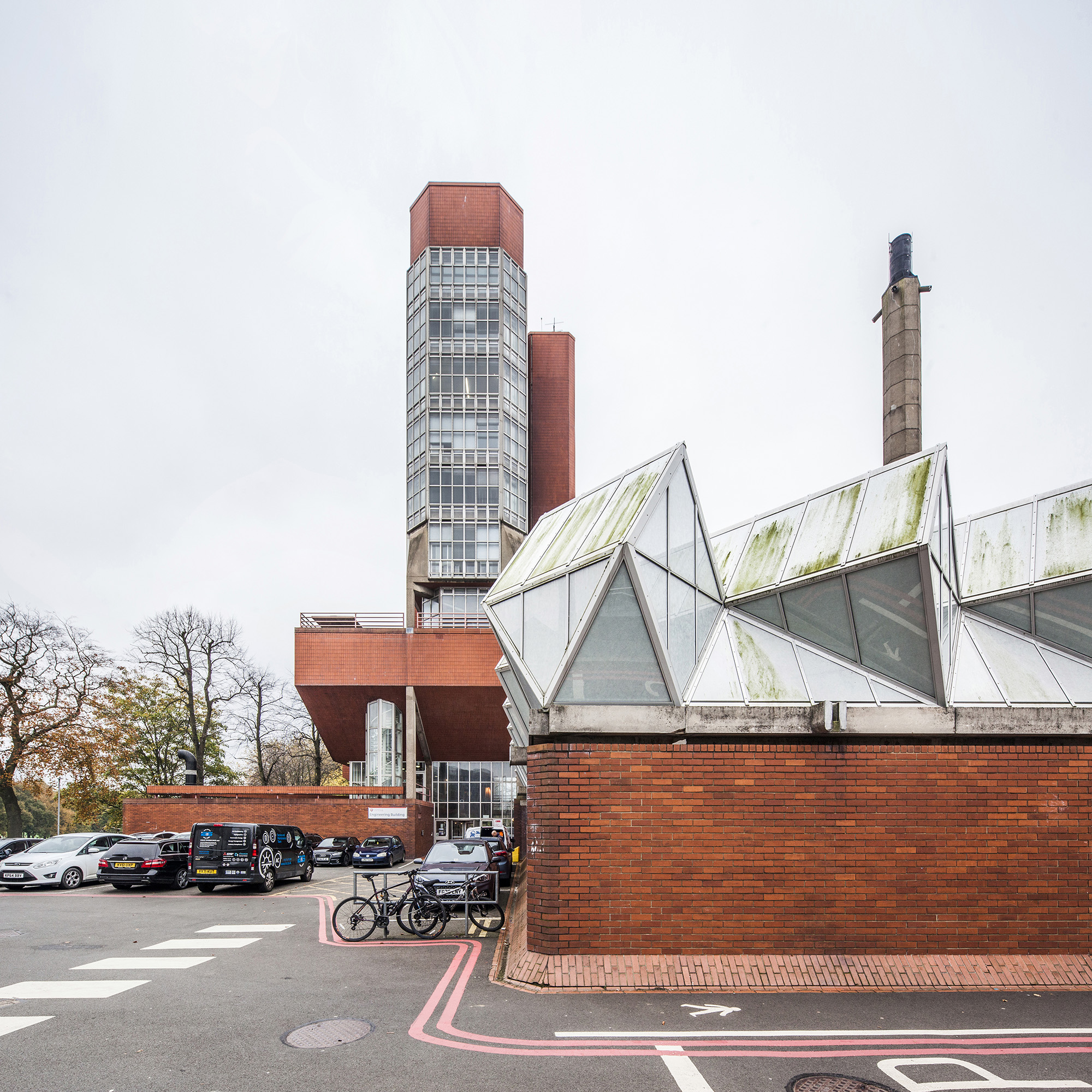 The building’s layout includes a tower connected to adjacent workshops and laboratories, with a glass room resting on triangular struts angled at 45 degrees to the building’s façade. The building’s exterior presents a striking blend of red brick masonry and full-height glazing. The workshops exhibit an industrial toughness, with saw-tooth factory glazing sharply angled across the roof. Two joined towers, inspired by an aircraft carrier’s superstructure, sit atop the cantilevered lecture theaters and house labs and offices. The two large glass roofs, characterized by rippling ‘waves’ and angled at 45 degrees to the towers, face north to provide optimal lighting without direct sunlight, which could affect sensitive instruments.