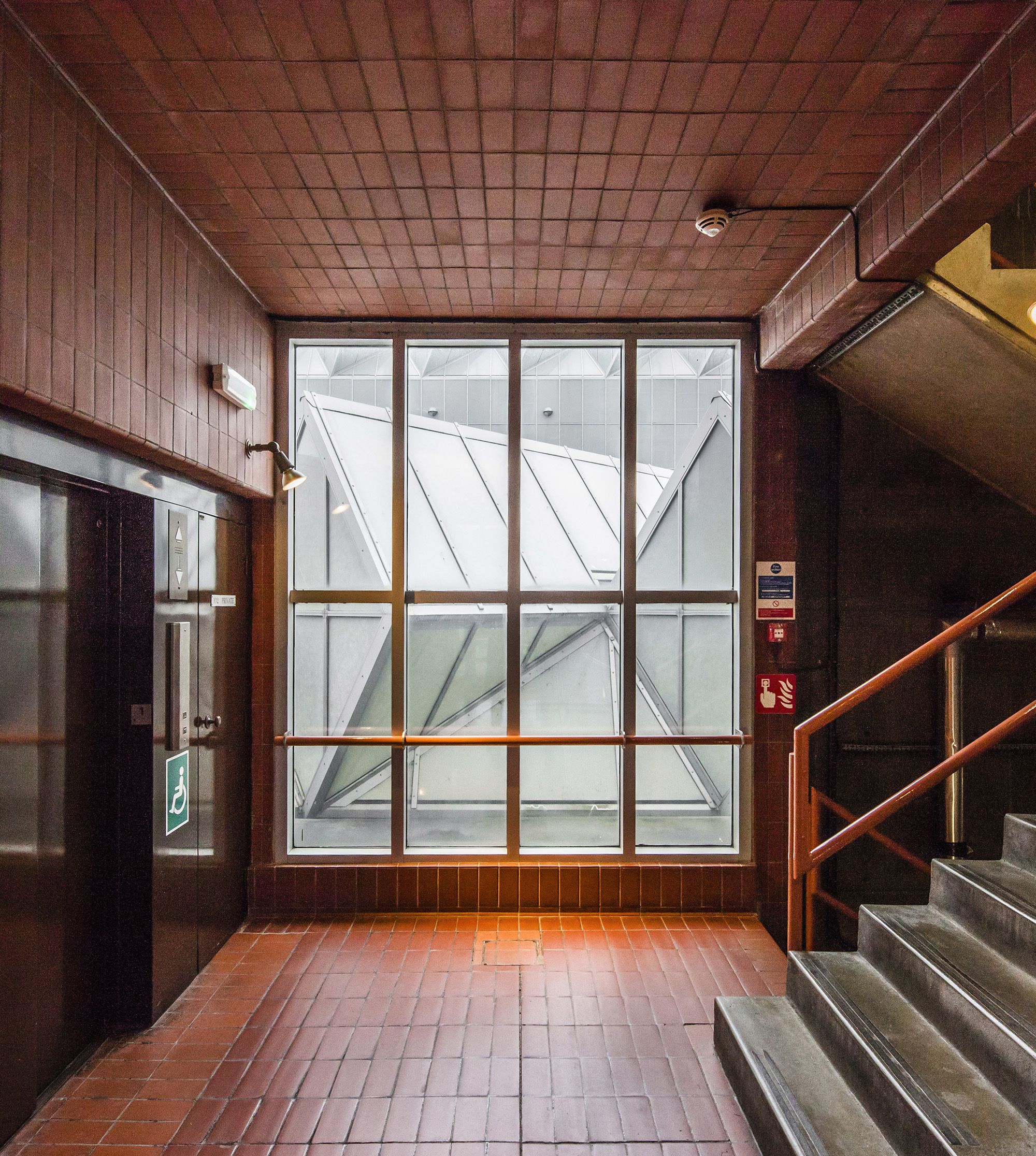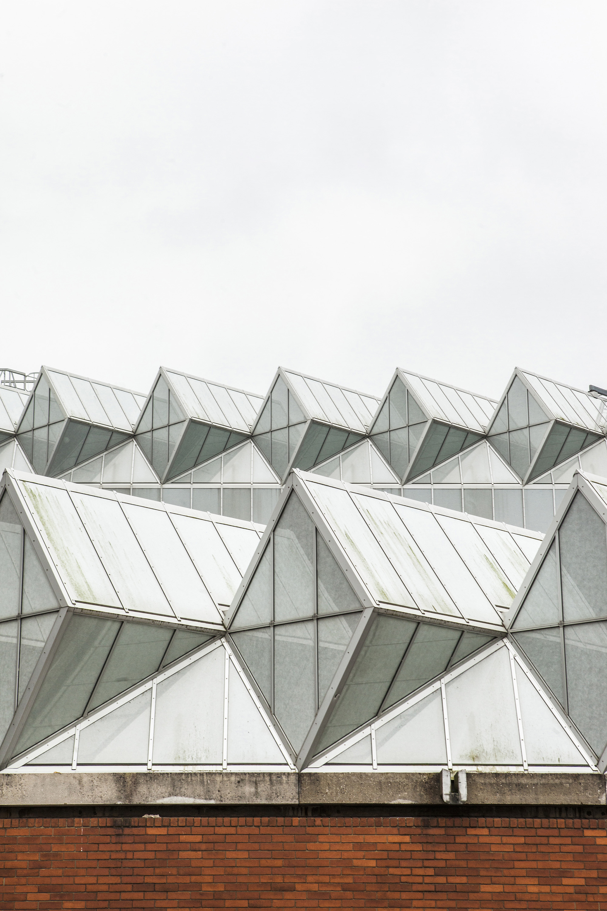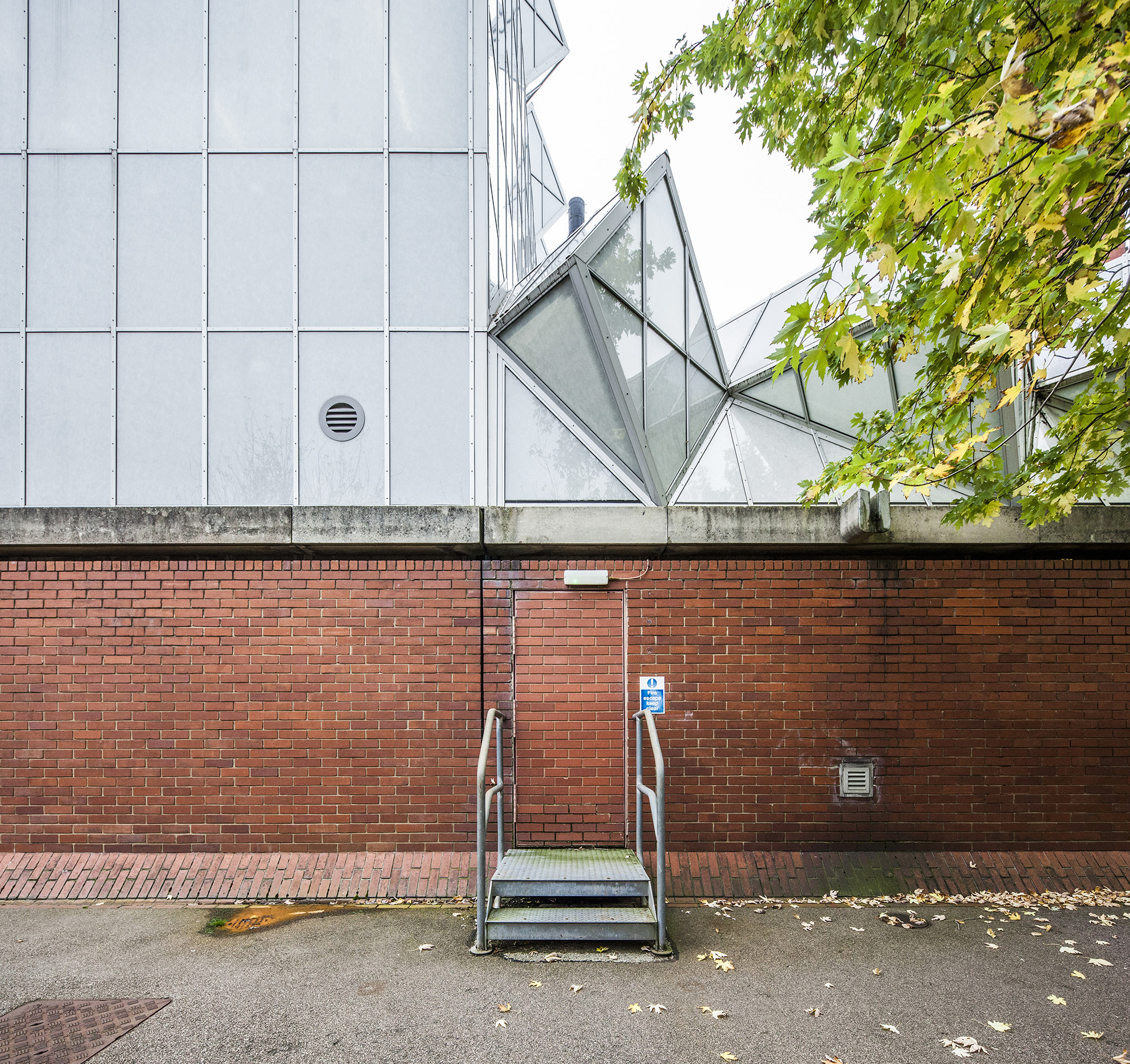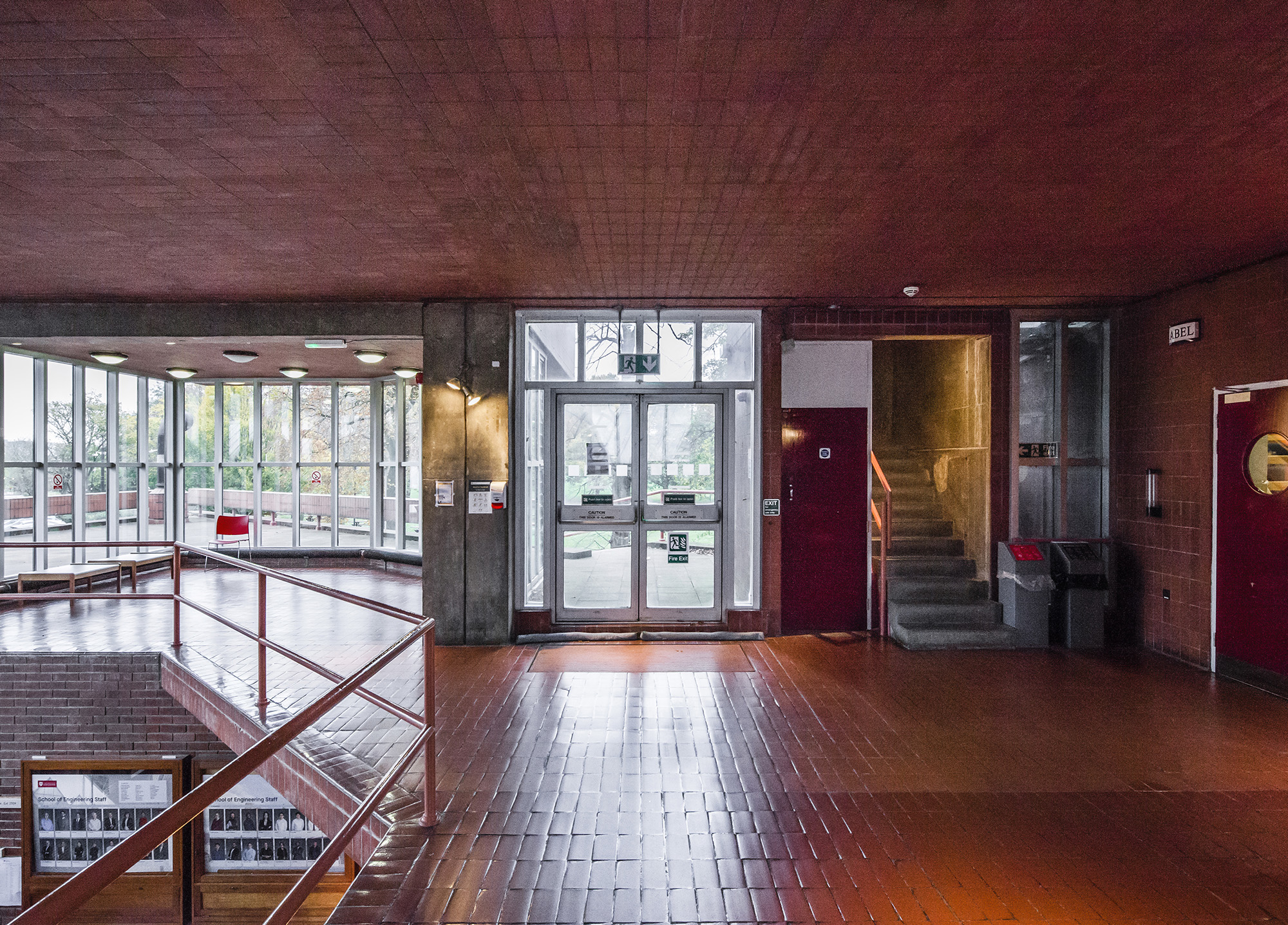 The building’s layout includes a tower connected to adjacent workshops and laboratories, with a glass room resting on triangular struts angled at 45 degrees to the building’s façade. The building’s exterior presents a striking blend of red brick masonry and full-height glazing. The workshops exhibit an industrial toughness, with saw-tooth factory glazing sharply angled across the roof. Two joined towers, inspired by an aircraft carrier’s superstructure, sit atop the cantilevered lecture theaters and house labs and offices. The two large glass roofs, characterized by rippling ‘waves’ and angled at 45 degrees to the towers, face north to provide optimal lighting without direct sunlight, which could affect sensitive instruments.