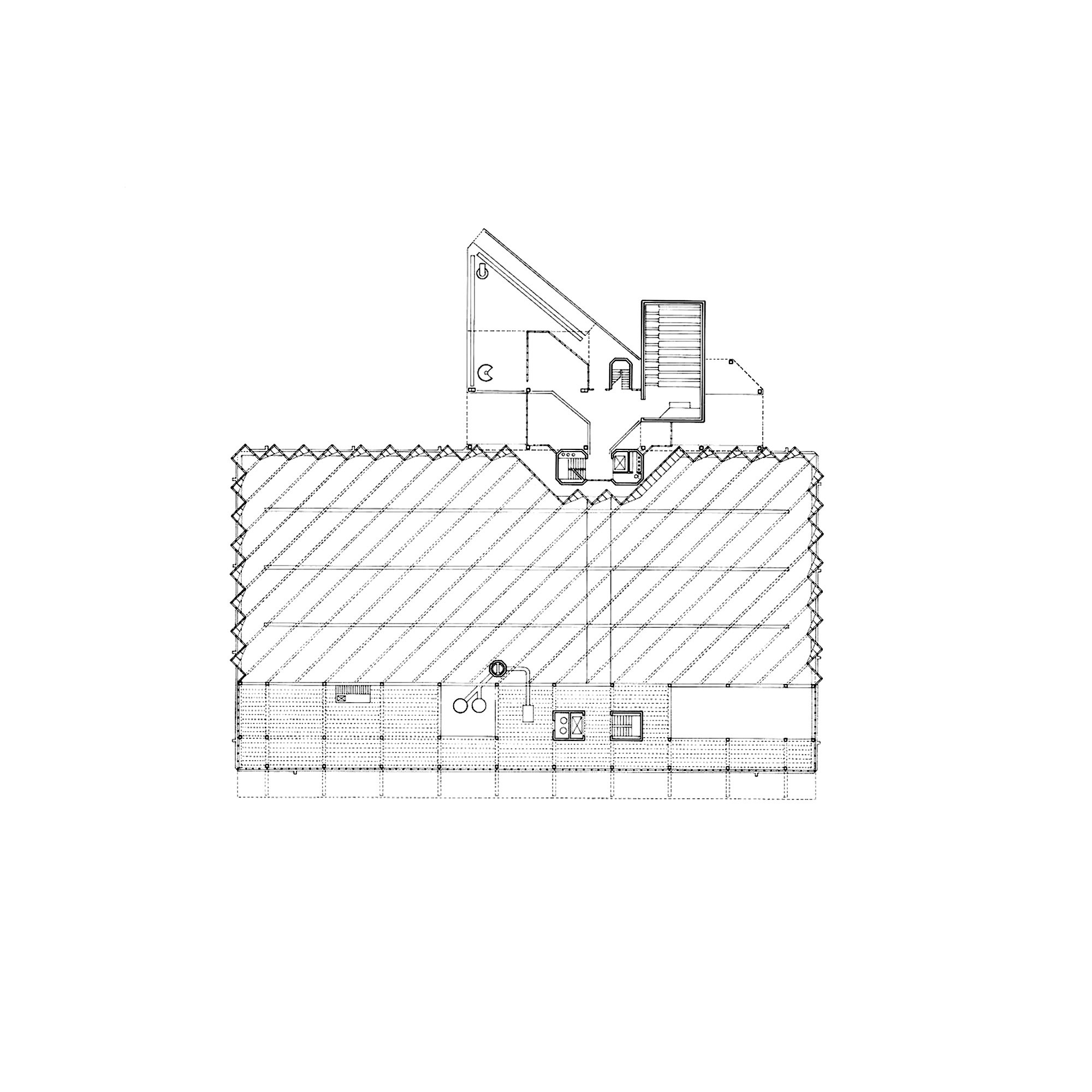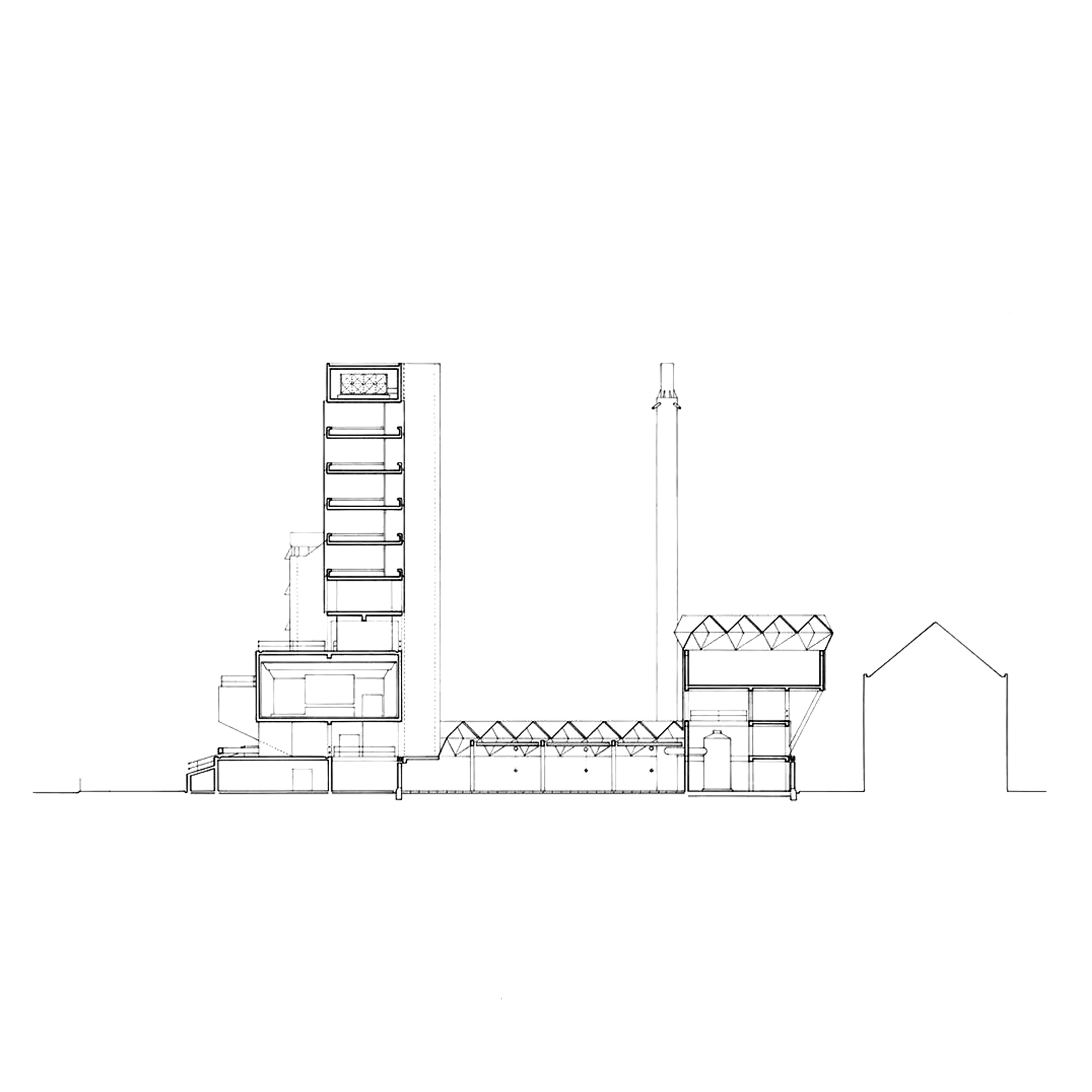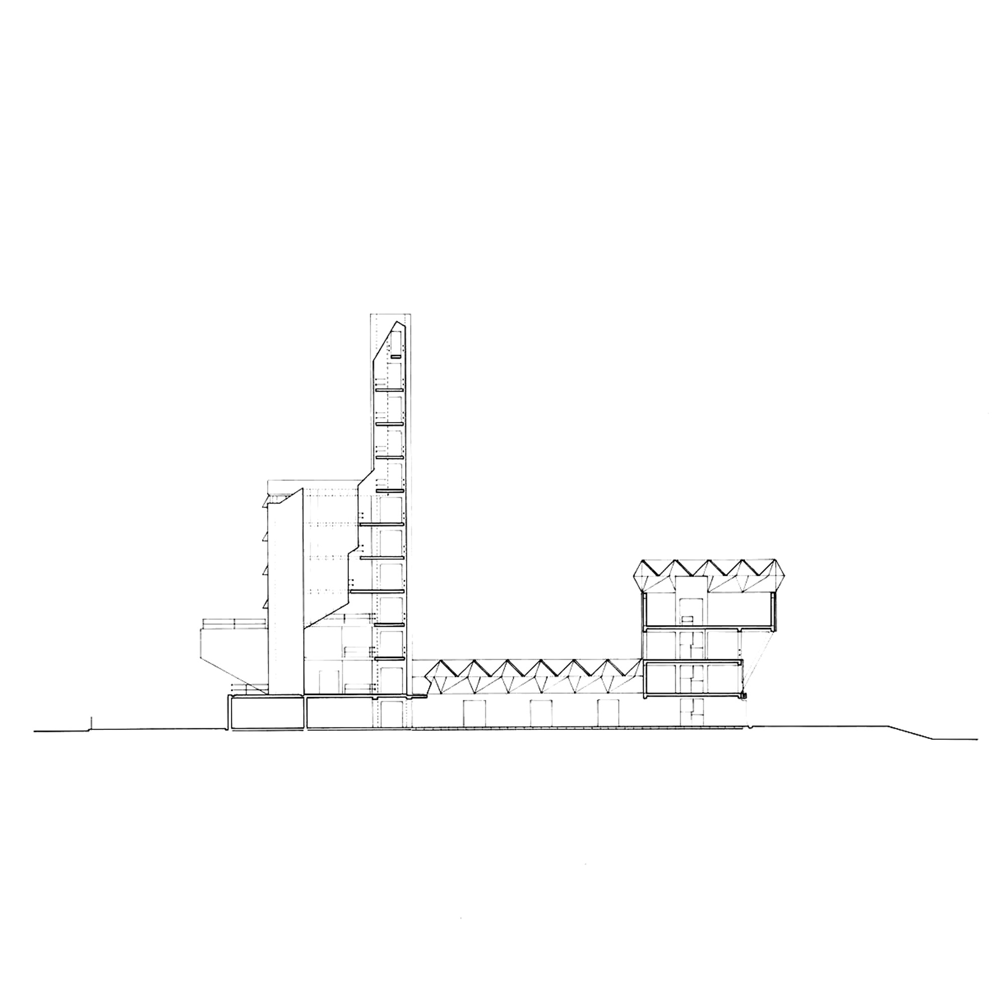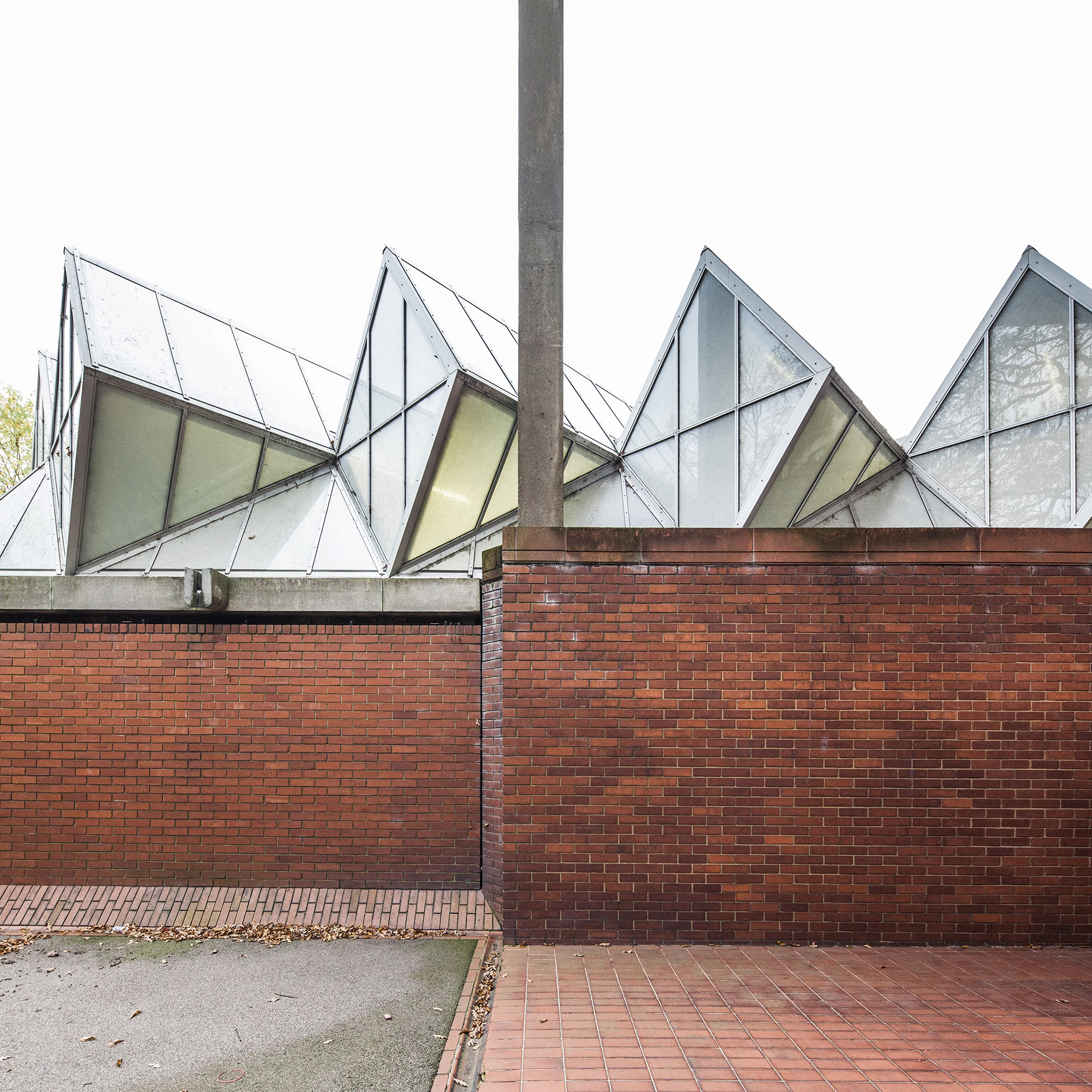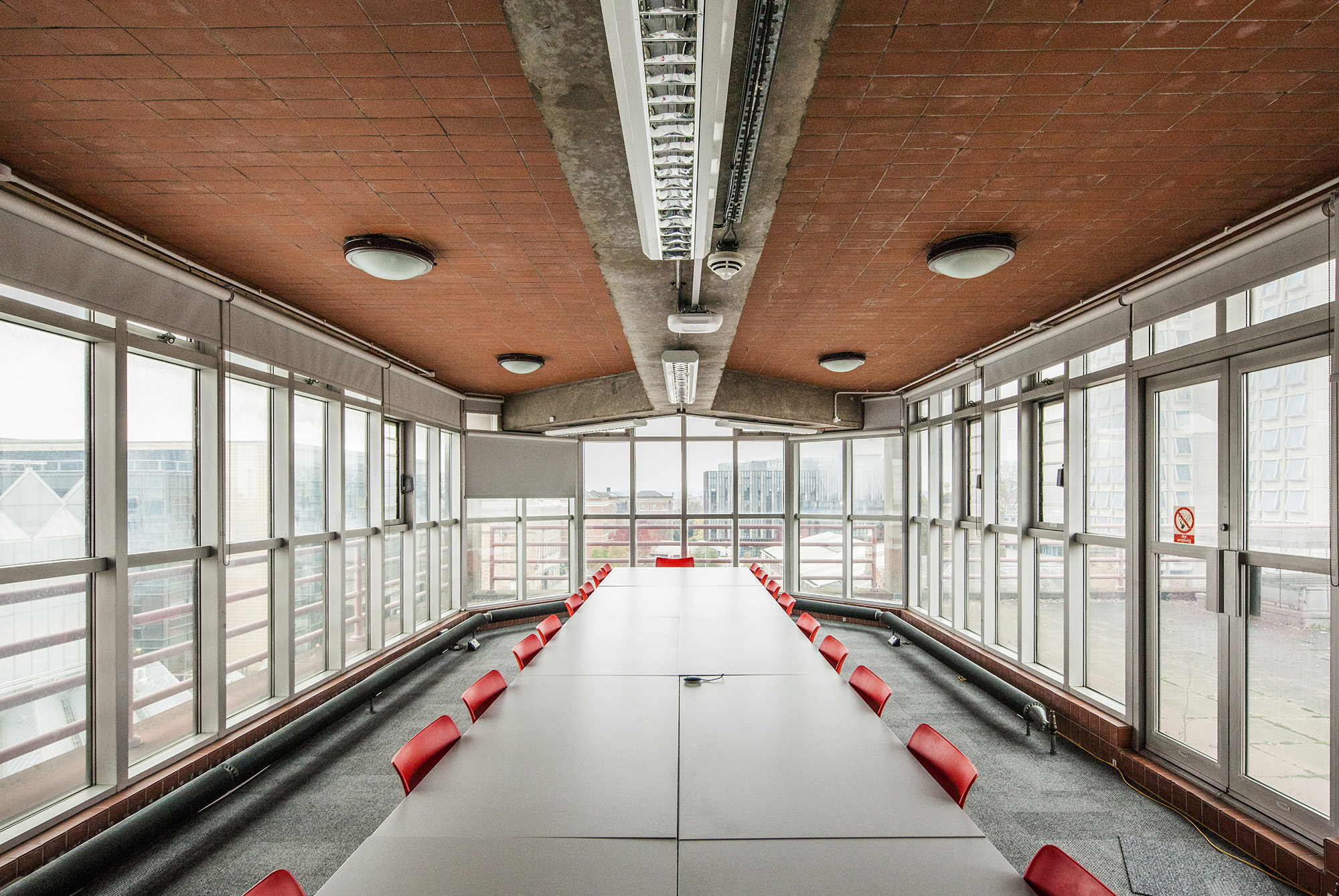The building’s layout includes a tower connected to adjacent workshops and laboratories, with a glass room resting on triangular struts angled at 45 degrees to the building’s façade. The building’s exterior presents a striking blend of red brick masonry and full-height glazing. The workshops exhibit an industrial toughness, with saw-tooth factory glazing sharply angled across the roof. Two joined towers, inspired by an aircraft carrier’s superstructure, sit atop the cantilevered lecture theaters and house labs and offices. The two large glass roofs, characterized by rippling ‘waves’ and angled at 45 degrees to the towers, face north to provide optimal lighting without direct sunlight, which could affect sensitive instruments.