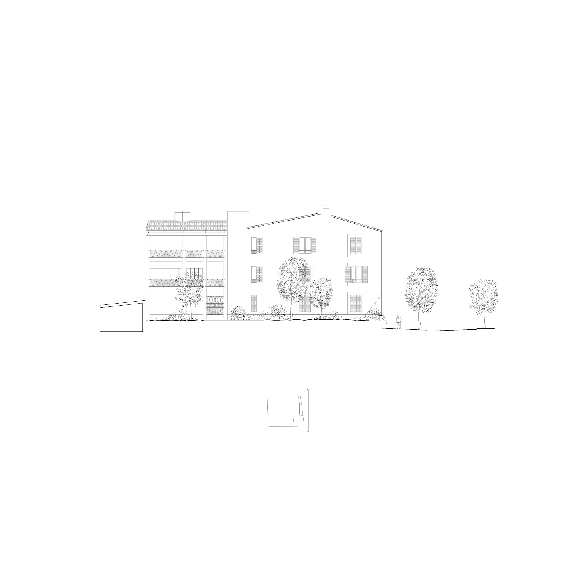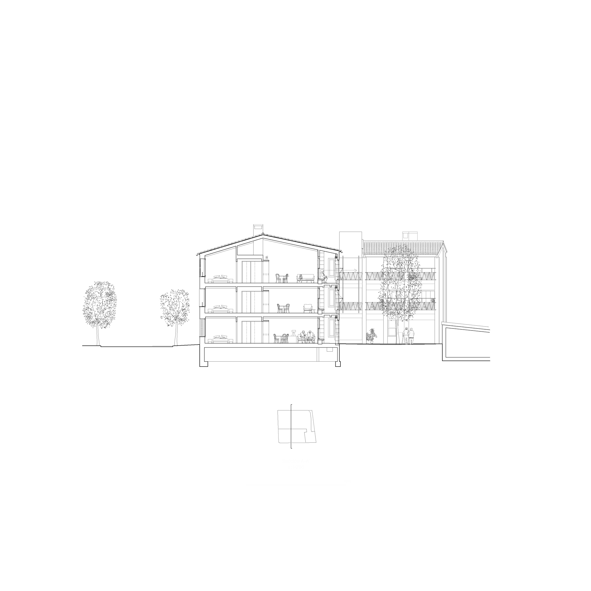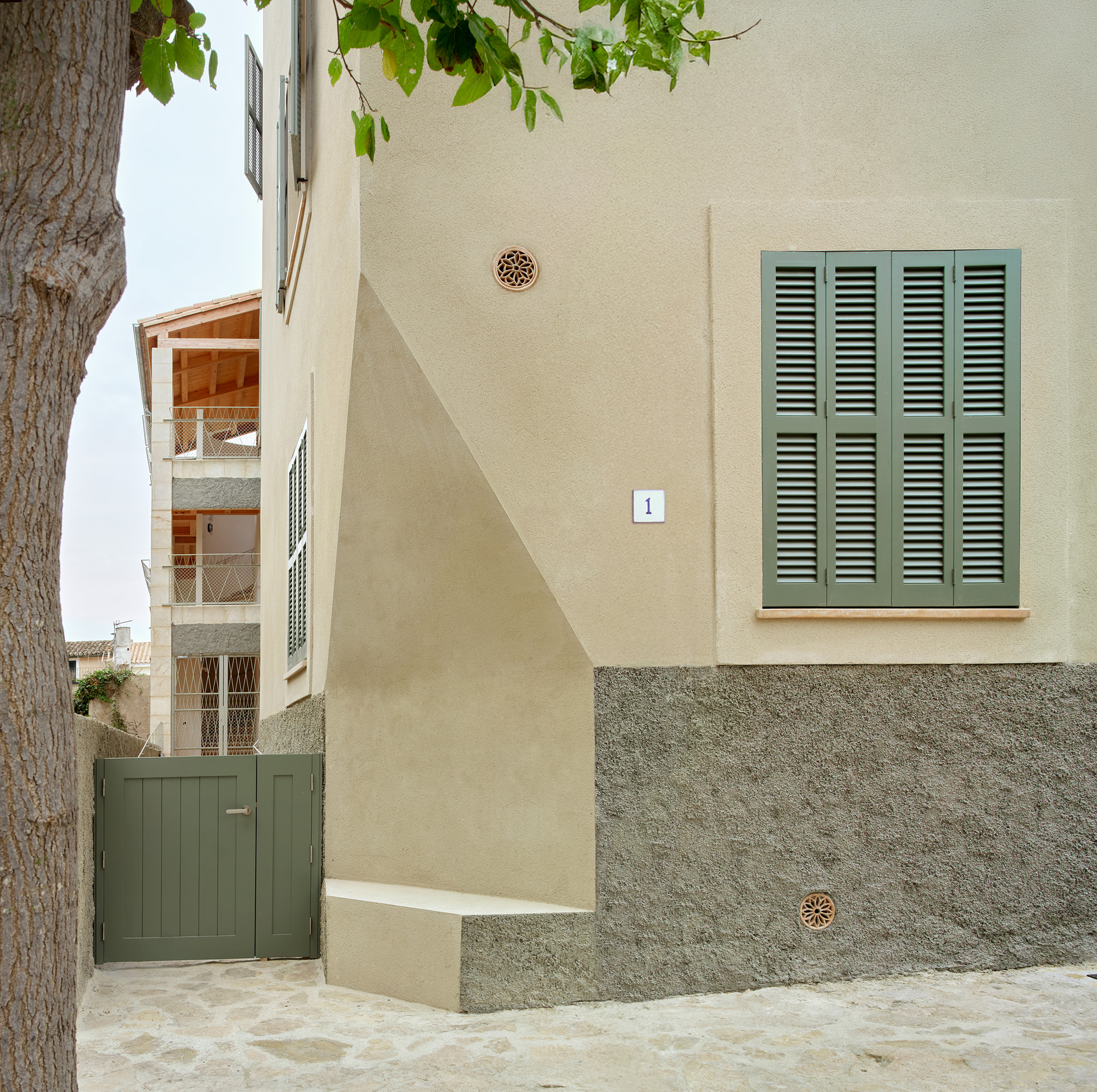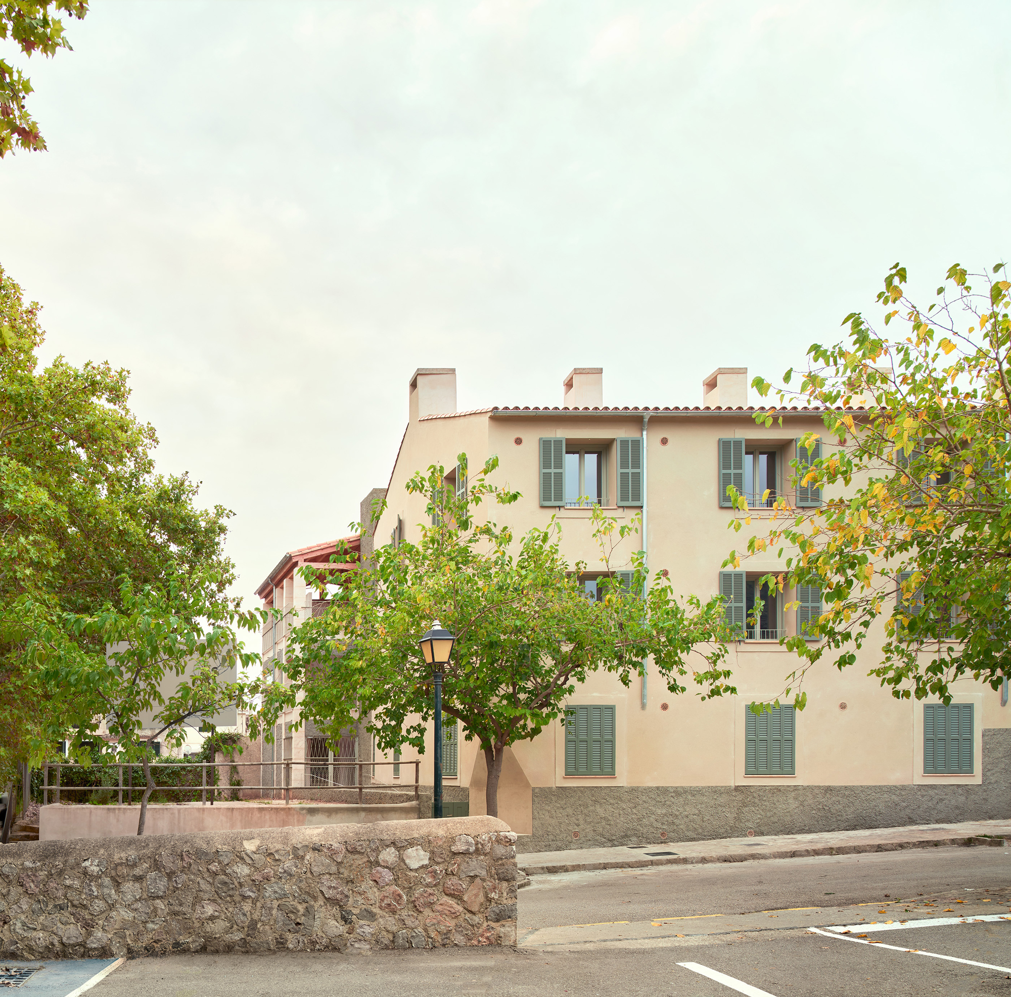 The proposal gives continuity to the series of houses with gabled roofs that are added in descending sequence along the streets perpendicular to the Esporles stream. The building is made up of two clearly differentiated volumes that frame a large tree-lined interior patio and indicate the deep access from the street next to an existing public garden. The main volume parallel to Ca l’Onclo Street houses the 18 homes distributed on the ground floor and two upper floors; all the homes are through and face southeast-northwest. With a marked agricultural character, the second volume houses the complete auxiliary program: access, vertical communications core, technical and concierge rooms, multipurpose community room, dining room and community kitchen.