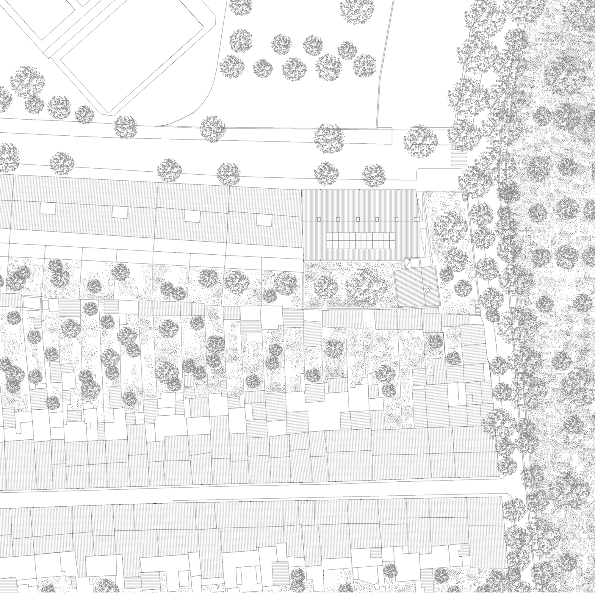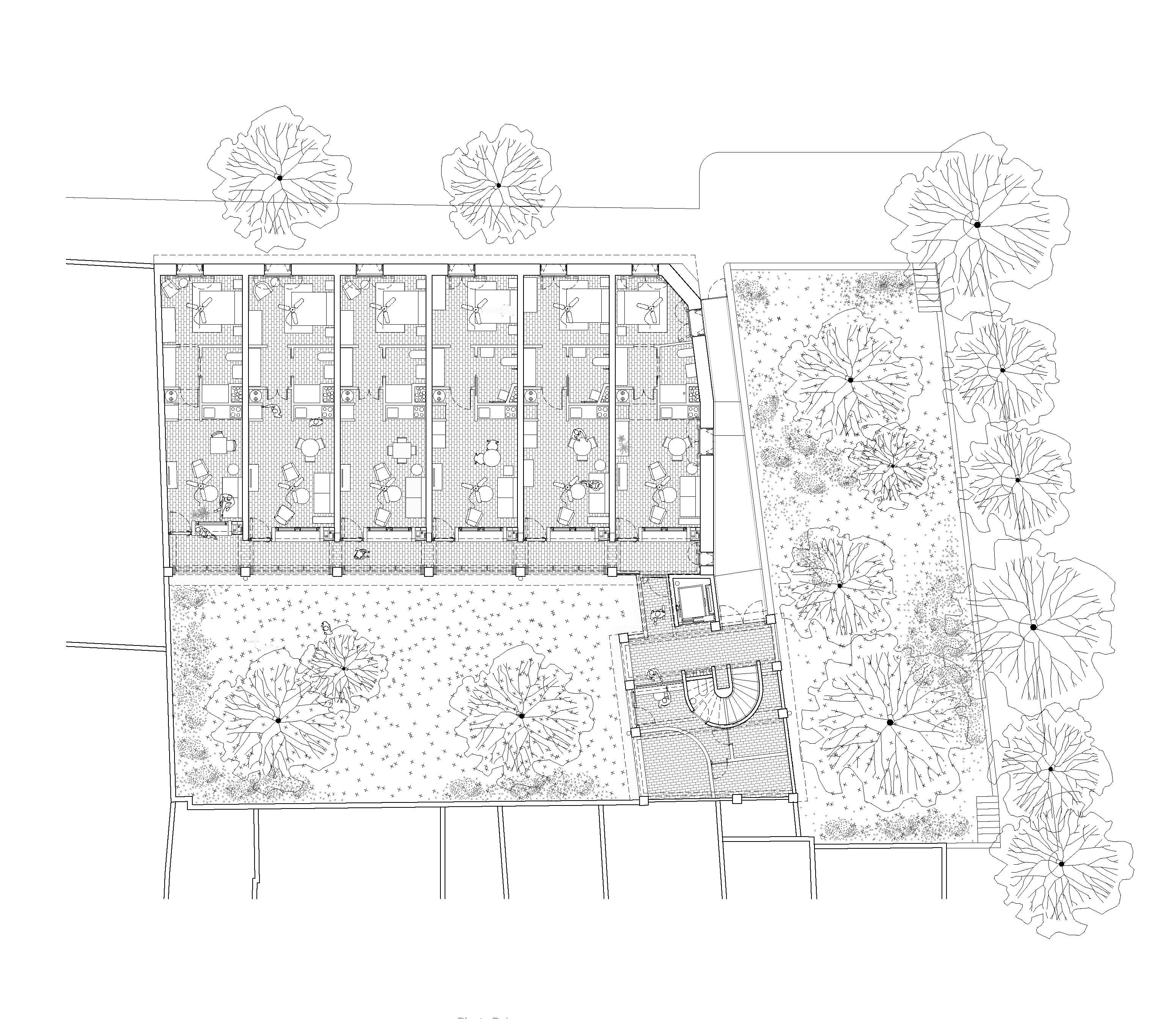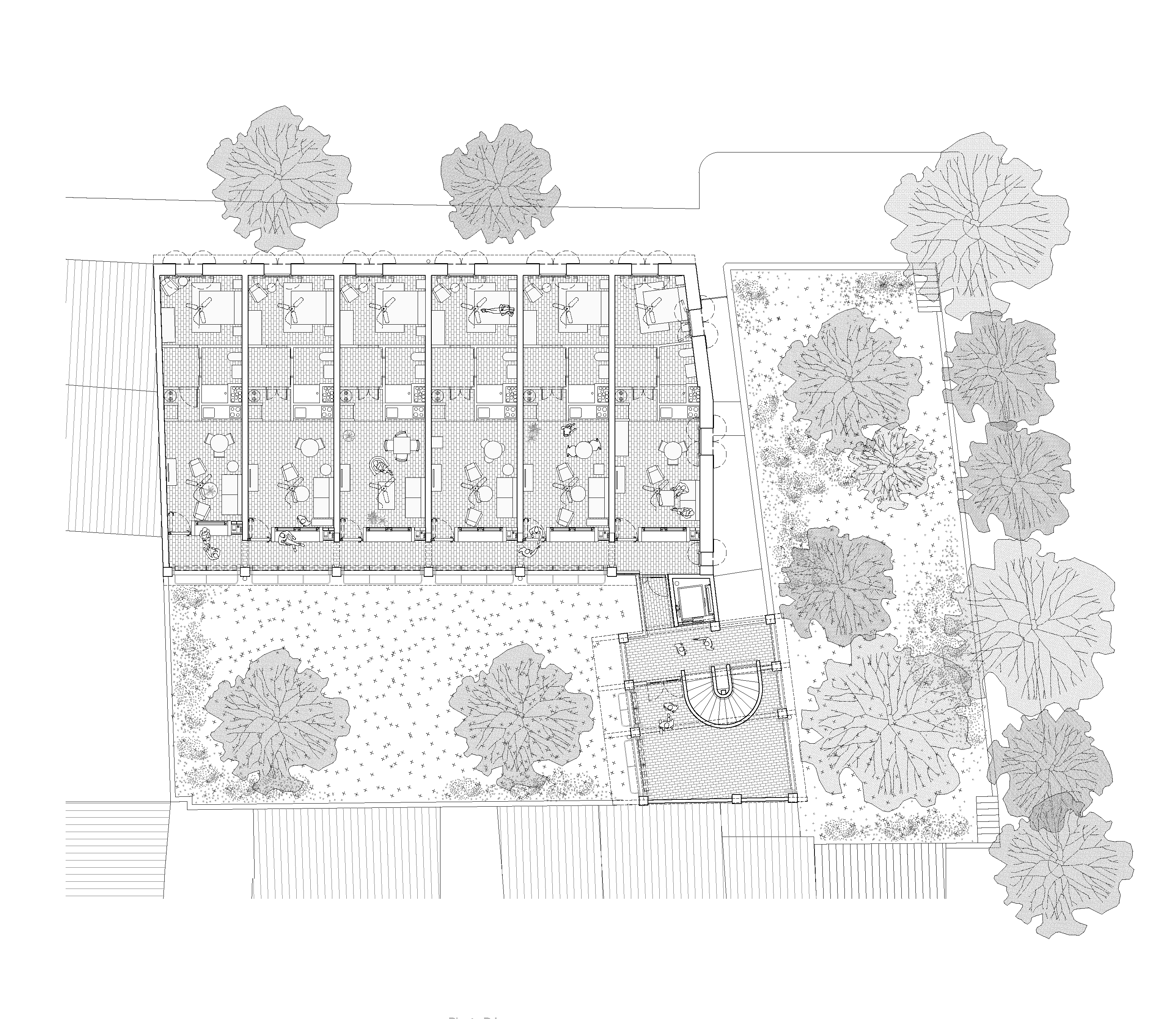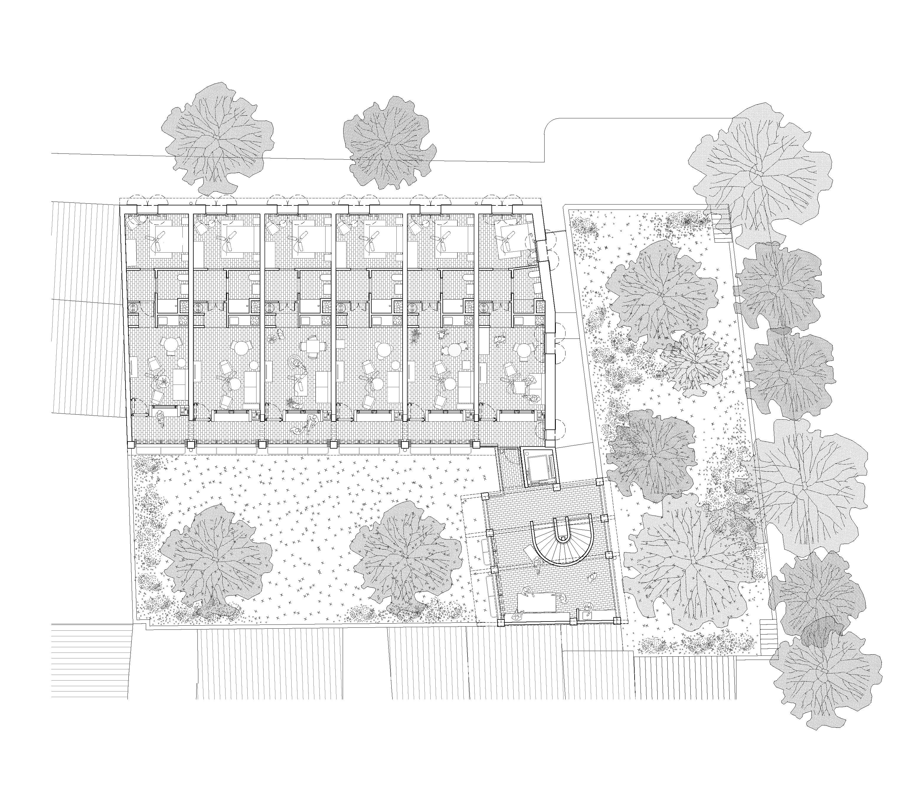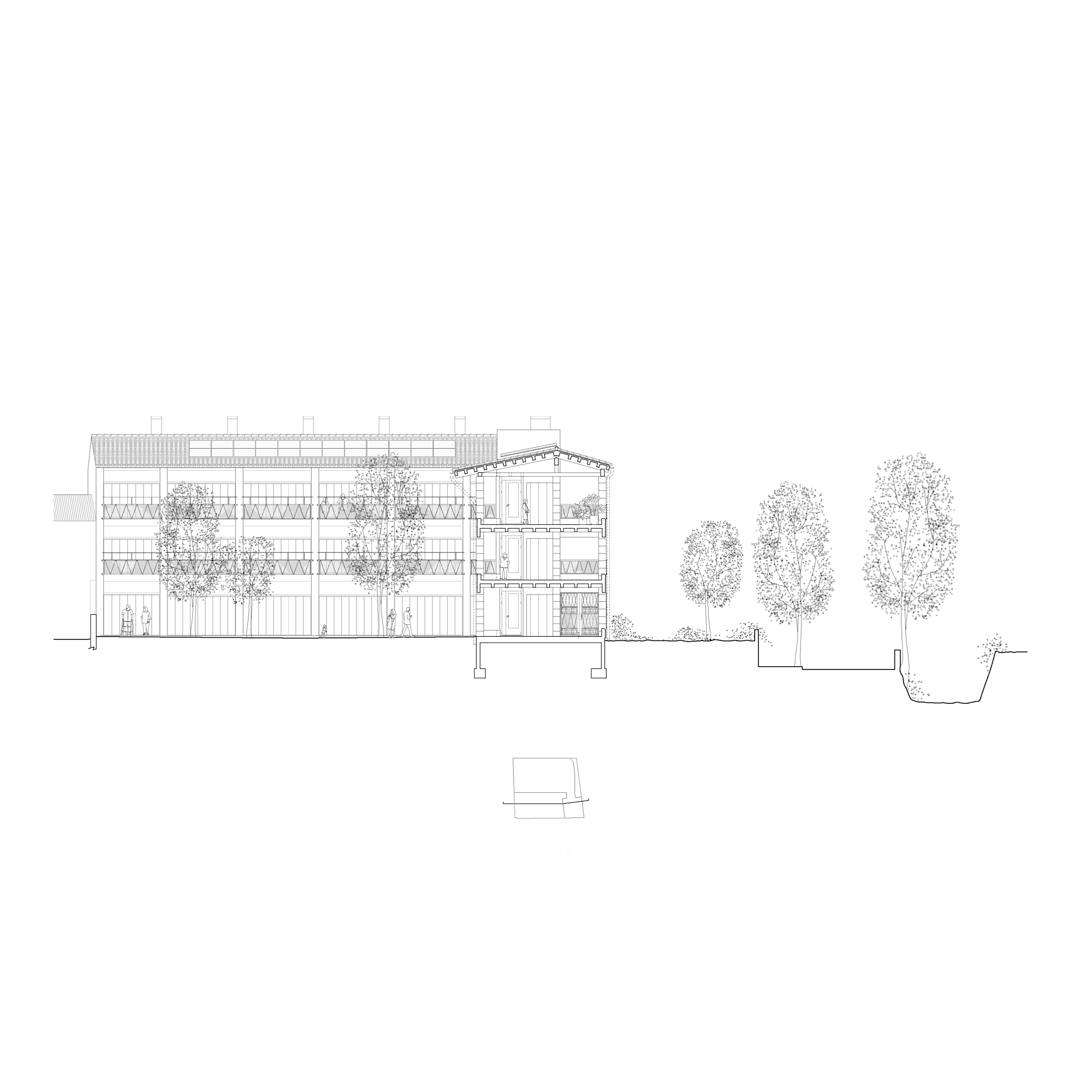 The proposal gives continuity to the series of houses with gabled roofs that are added in descending sequence along the streets perpendicular to the Esporles stream. The building is made up of two clearly differentiated volumes that frame a large tree-lined interior patio and indicate the deep access from the street next to an existing public garden. The main volume parallel to Ca l’Onclo Street houses the 18 homes distributed on the ground floor and two upper floors; all the homes are through and face southeast-northwest. With a marked agricultural character, the second volume houses the complete auxiliary program: access, vertical communications core, technical and concierge rooms, multipurpose community room, dining room and community kitchen.