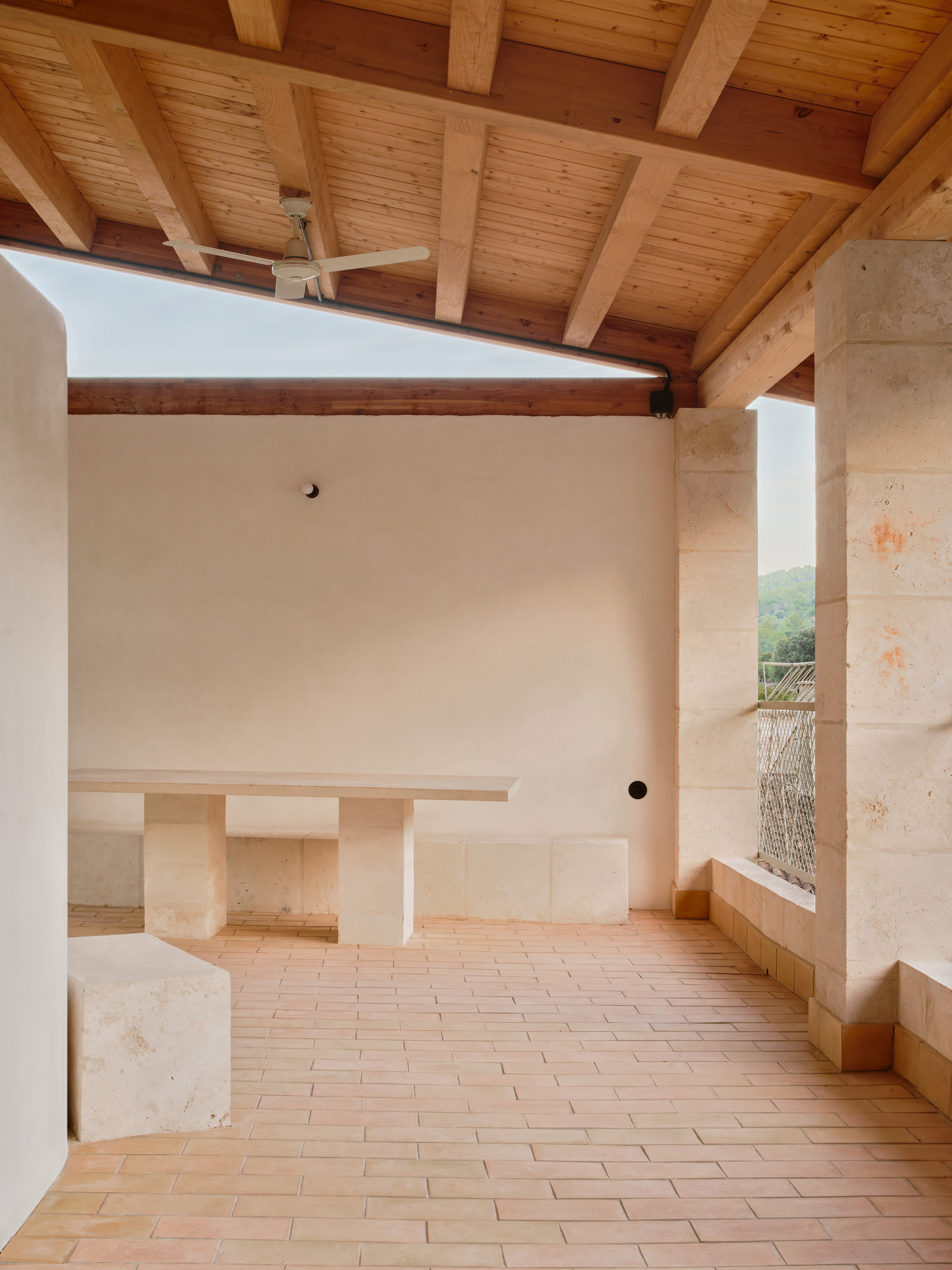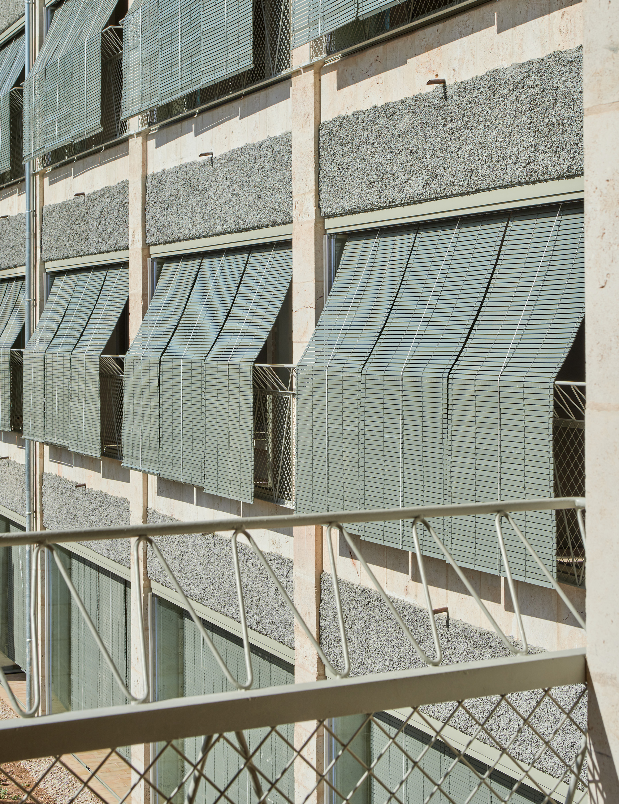 All the houses are oriented North-South following the direction of the Esporles stream that marks the direction of the predominant winds that cross the Tramontana mountain range. The north and south facades are proportionally small in relation to the surface area of the houses. The north facade is highly dissipative and conserves energy through a double wall of thermo-clay. The south facade is highly energy-absorbing and works with inertia and the glazed gallery. The solar protections and folding windows that turn the gallery into a bioclimatic element are manually operated and allow ventilation and avoid solar incidence in the summer. In winter, closing the windows and generating a greenhouse effect allows the heat of solar radiation to be captured and conserved. These actions are collective in nature and the building’s climate concierge is responsible for adjusting the devices every morning and every night following the user manual that has been incorporated into glazed ceramics in the building’s lobby.