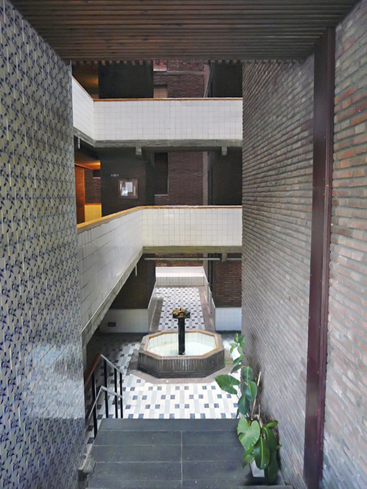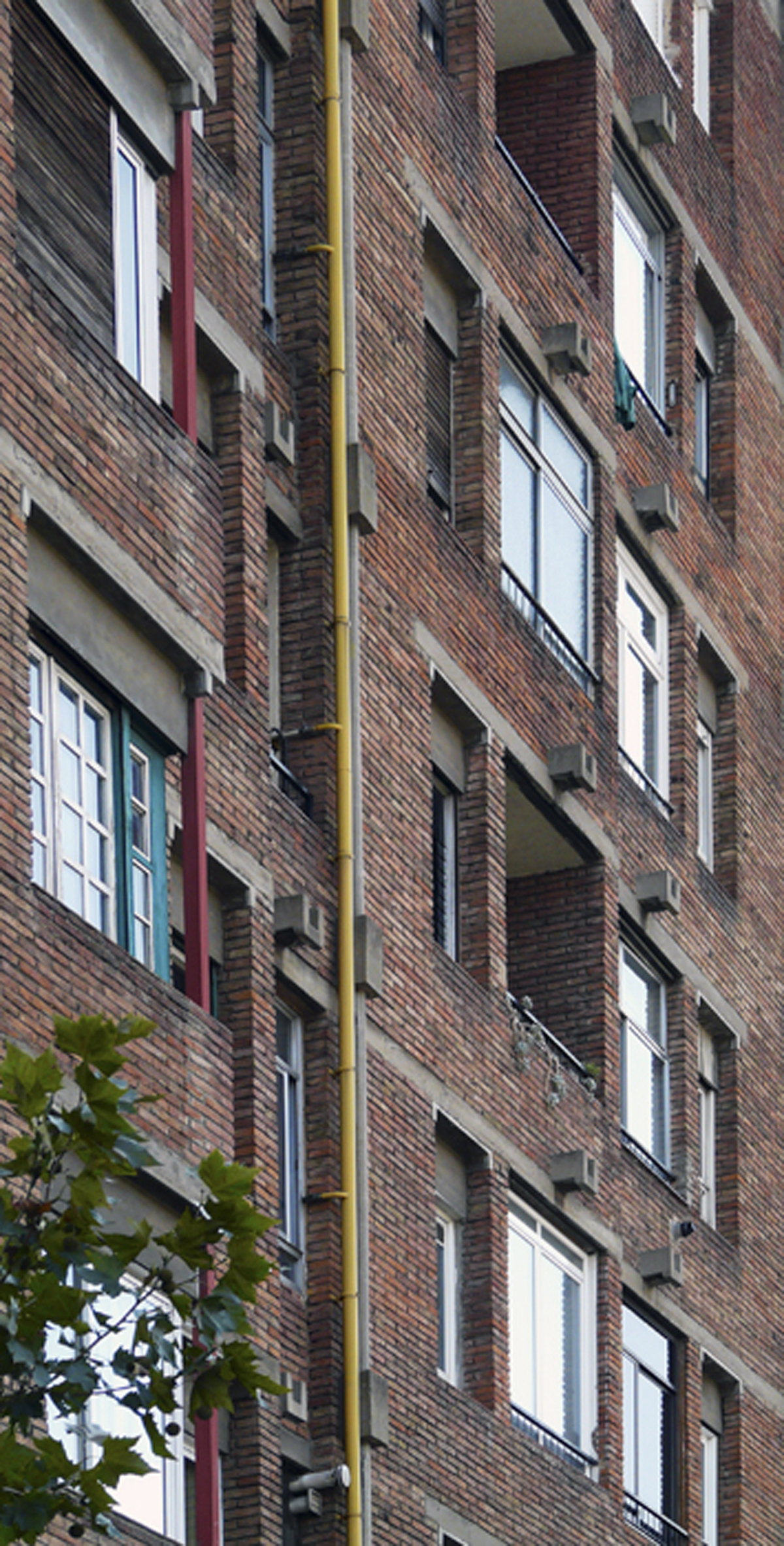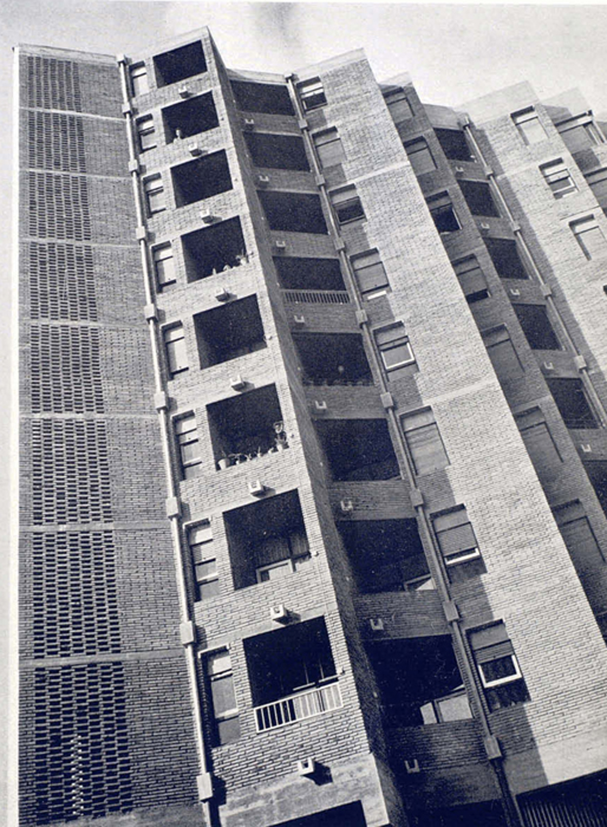El resto del proyecto esta casi enteramente supeditado a esta idea fundamental. Otras dos consideraciones a tener en cuenta son: la necesidad de utilizar un tipo de vivienda que estaba ya experimentada con éxito en esta misma organización cooperativa y el deseo de utilizar hasta sus últimas consecuencias un sistema constructivo muy simple y económico (pared de ladrillo visto y estructura inferior de hormigón armado). Aplicando estos tres criterios, el resto del proyecto se resolvió casi automáticamente. La fachada, sobre todo, es un resultado casi no meditado. Seguramente, incluso, excesivamente no meditado, porque tiene quizás demasiada aridez y un punto de insultante desprecio a las posibles calidades formales de la calle.