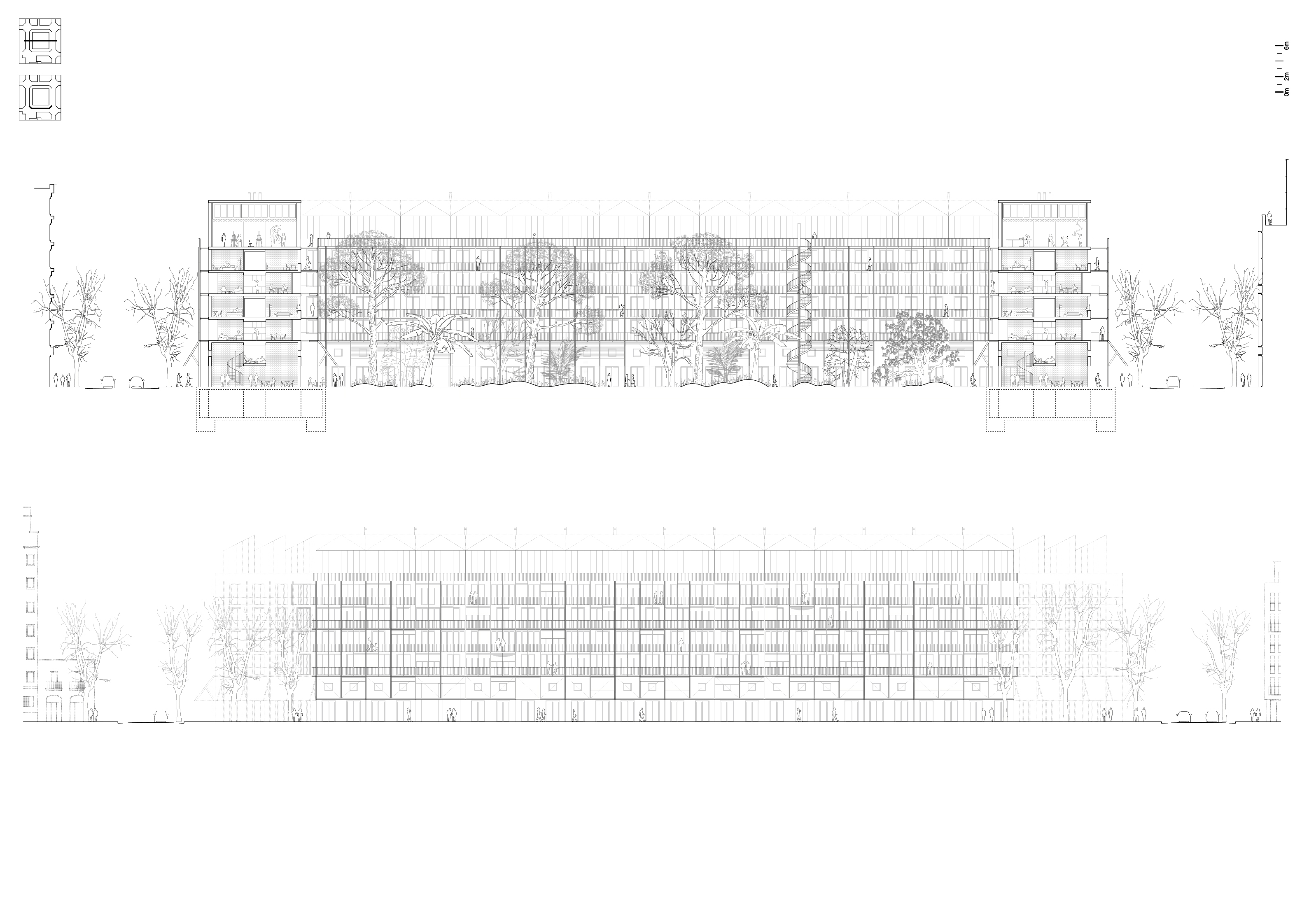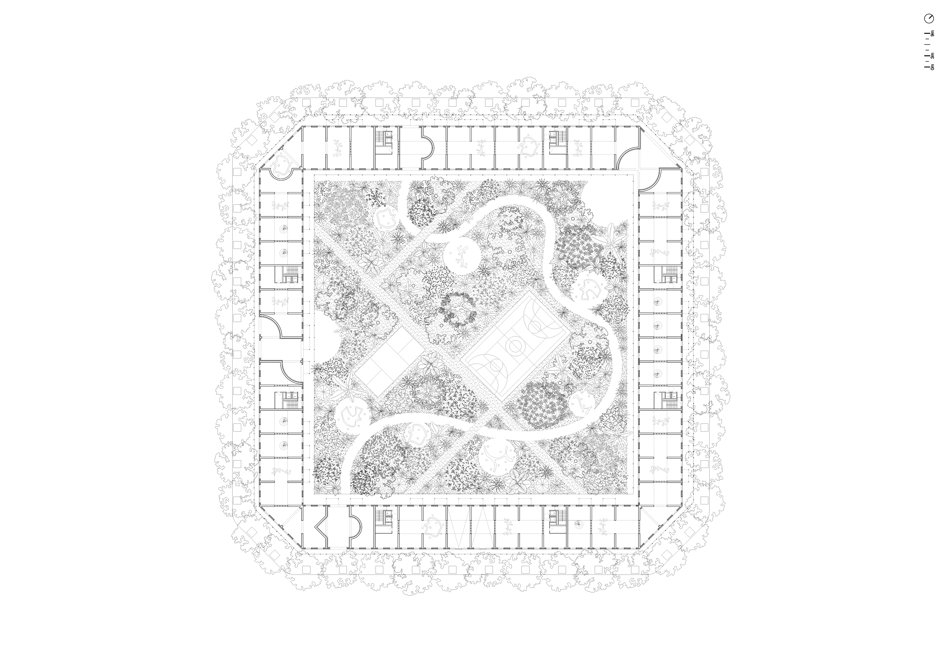 The central space reclaims Cerdà’s original vision, reversing the impact of speculative development by creating a naturalized green area. Featuring native species, sports facilities, and terraces linked to commercial spaces, the project restores essential urban greenery.