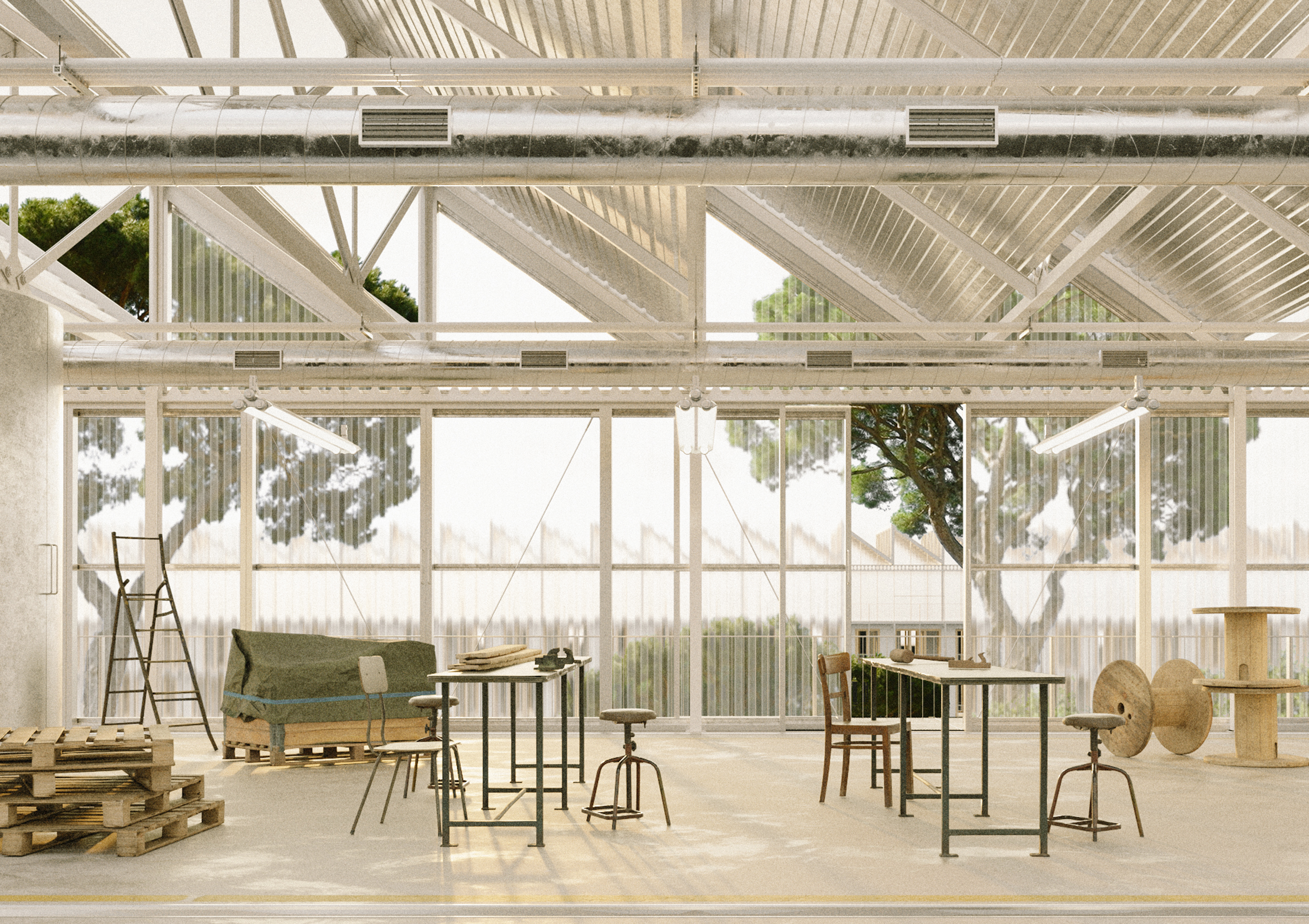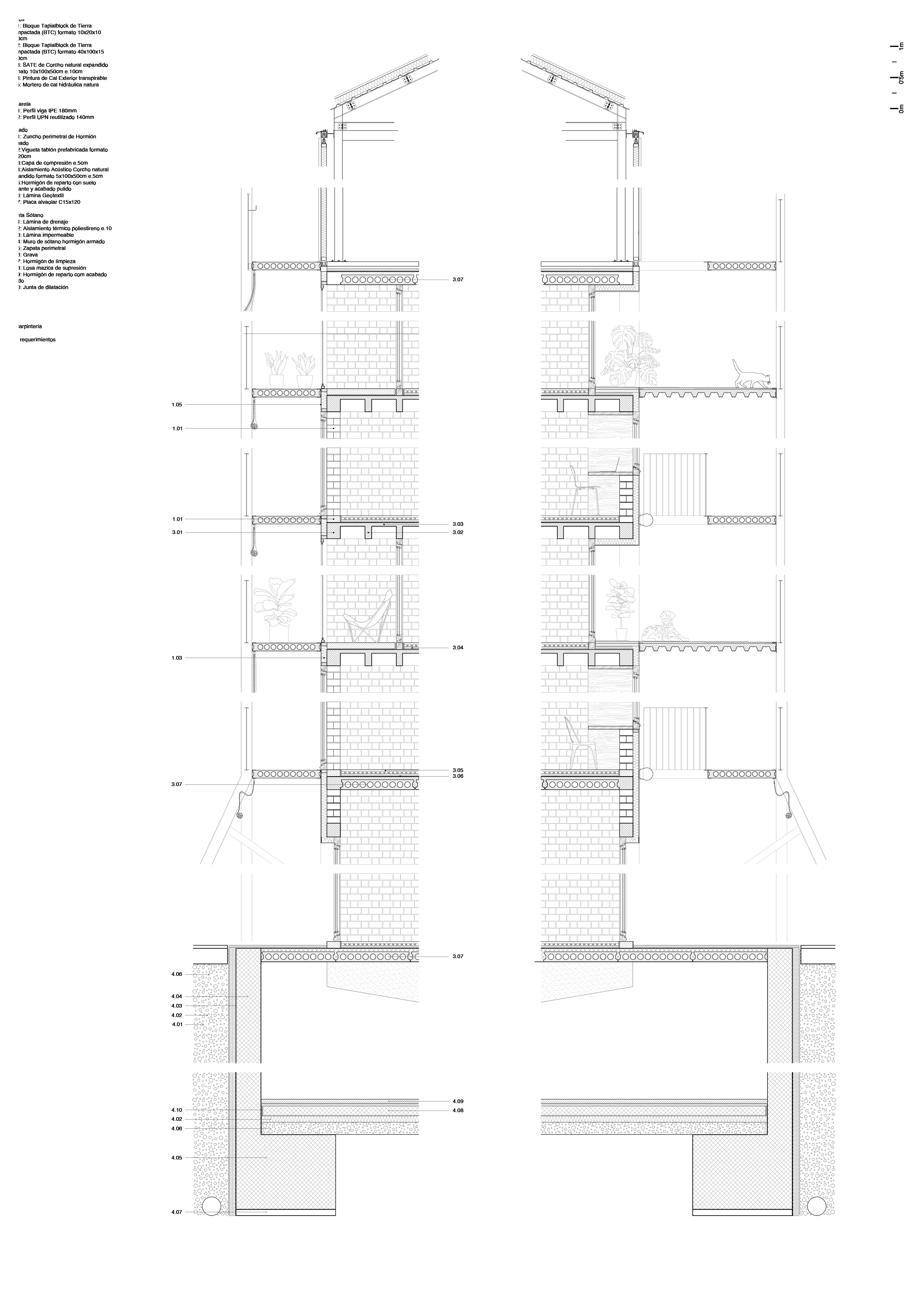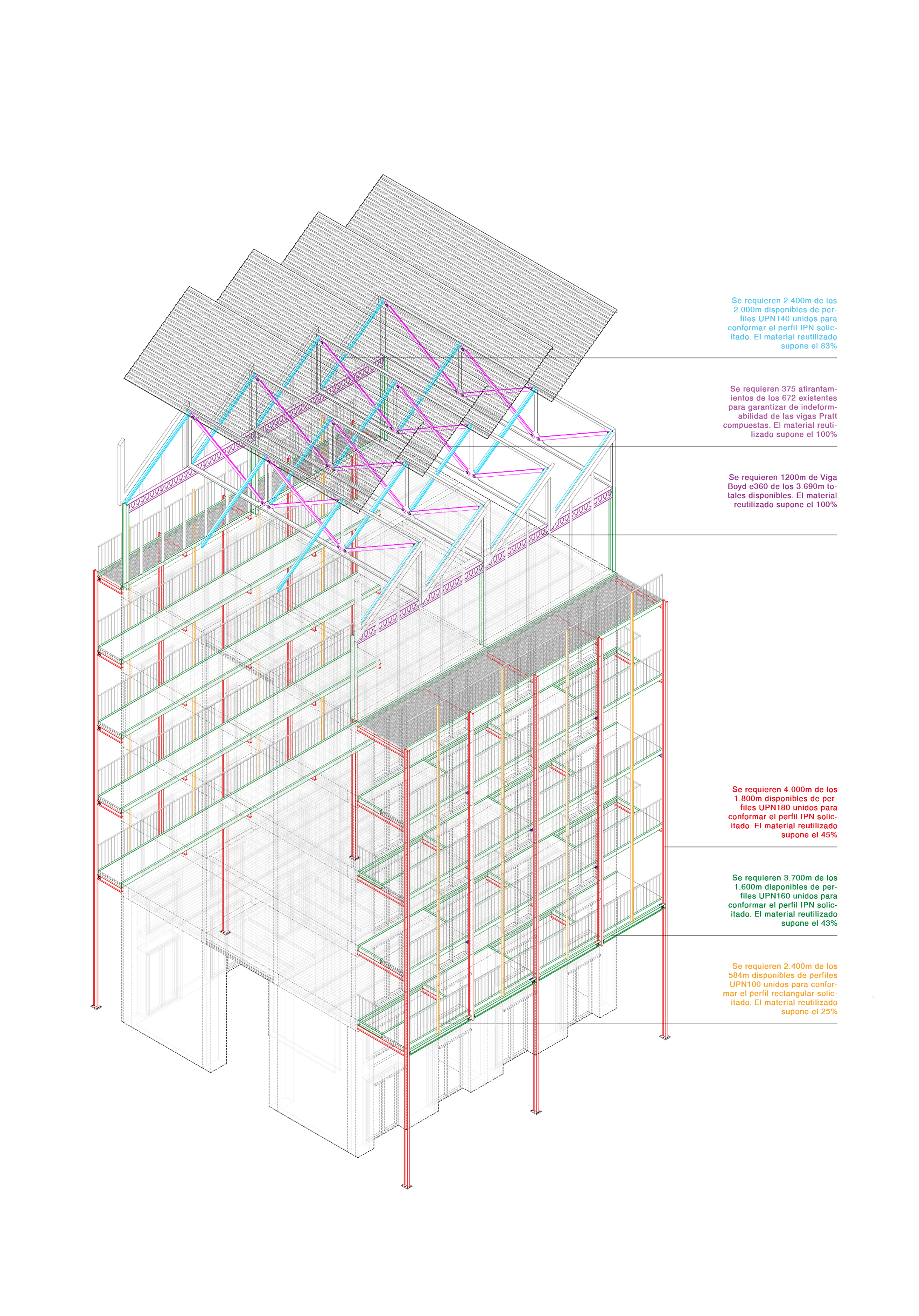 Aligned with the city’s architectural tradition, the project uses 3.4-meter load-bearing walls and brick to echo the industrial heritage of the Ensanche. This material choice humanizes the scale and contrasts with modern standardized buildings. Paying homage to its predecessor, the design reuses the metal structure of a former warehouse with a sawtooth roof, evoking the district’s industrial past.