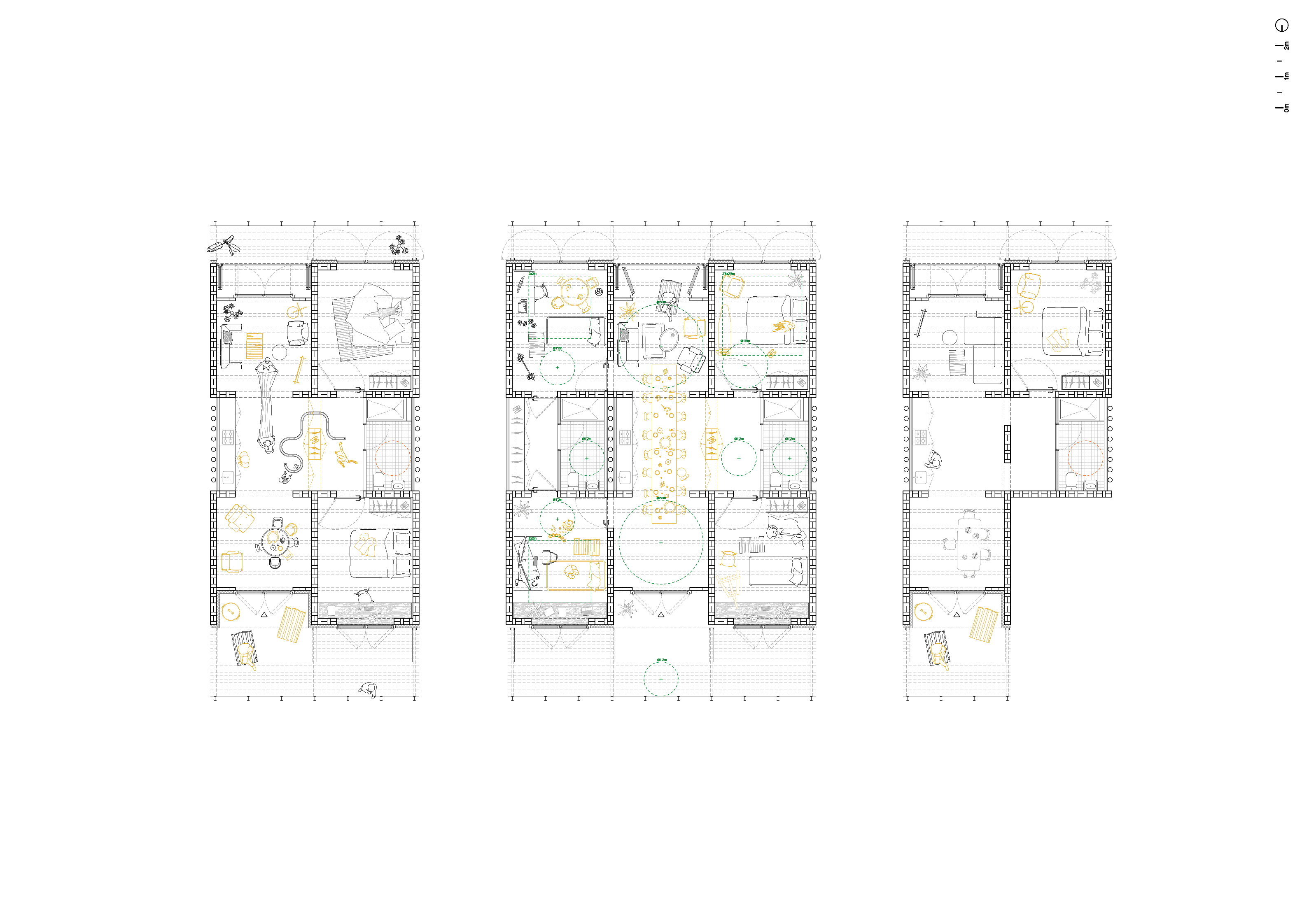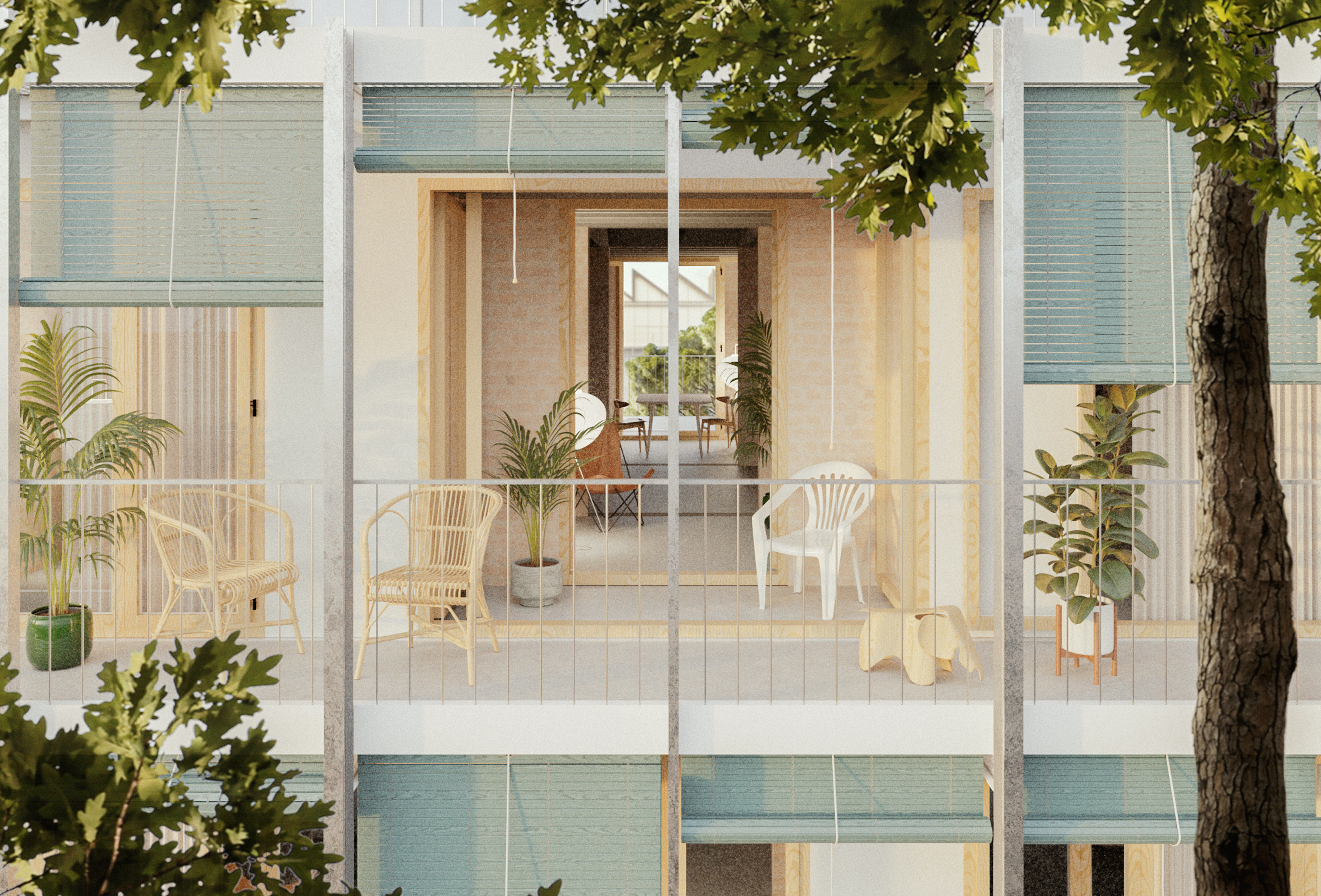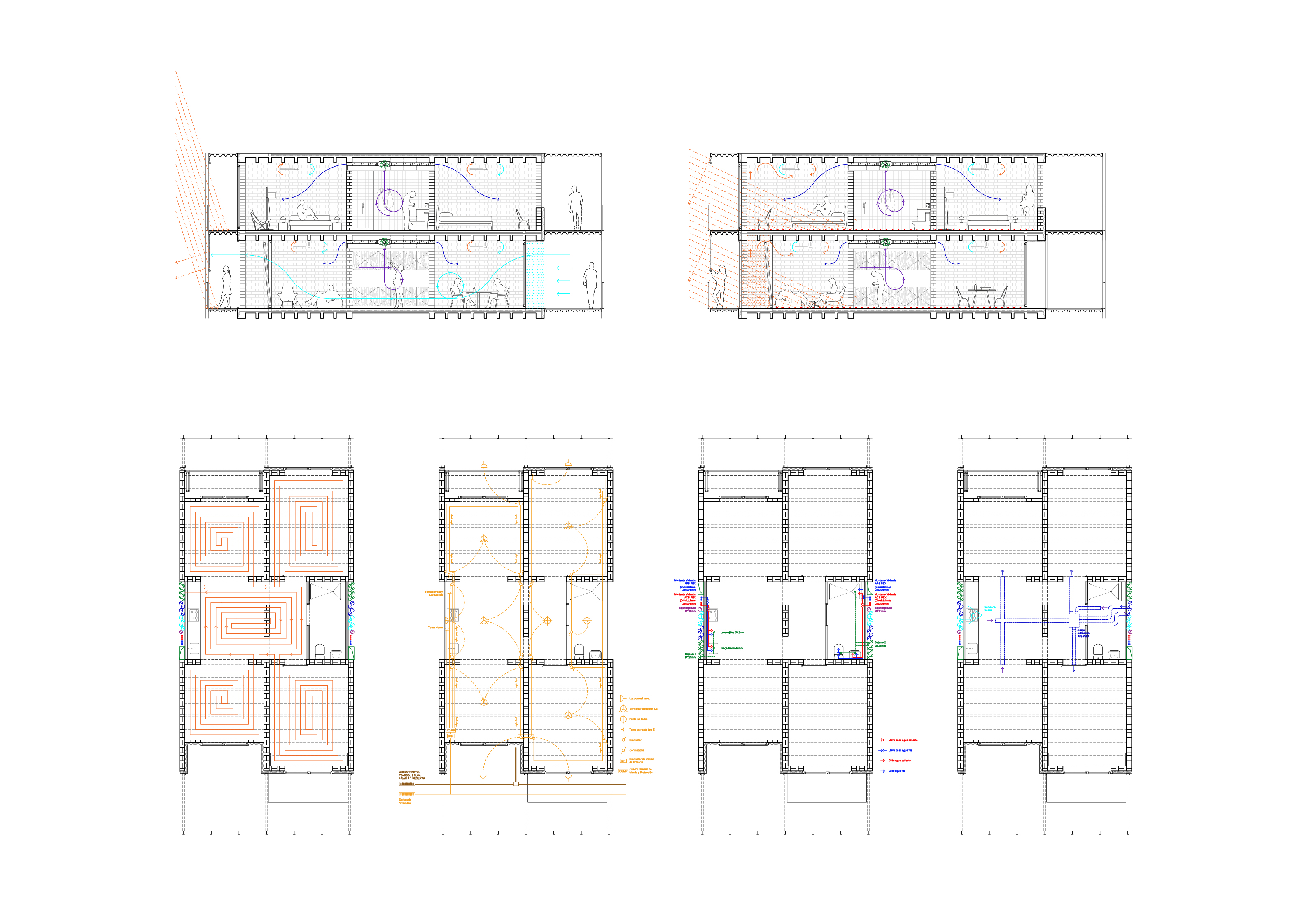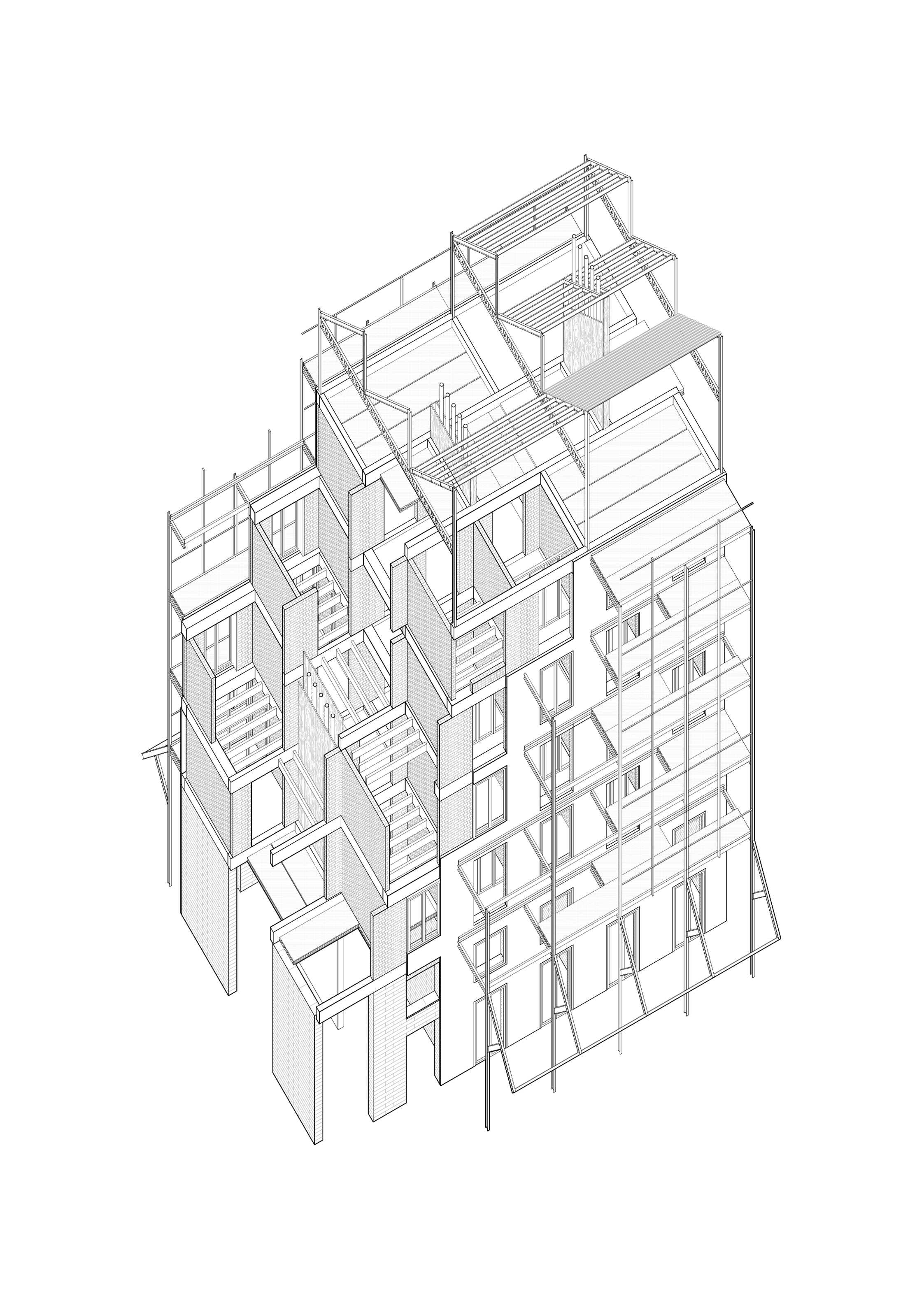 A recycled metal walkway, forming a double ring, organizes access. Wider northern paths enhance privacy, while narrower southern paths serve as private balconies. Vertical cores shift within walls to optimize function and break symmetry, enriching the project complexity.