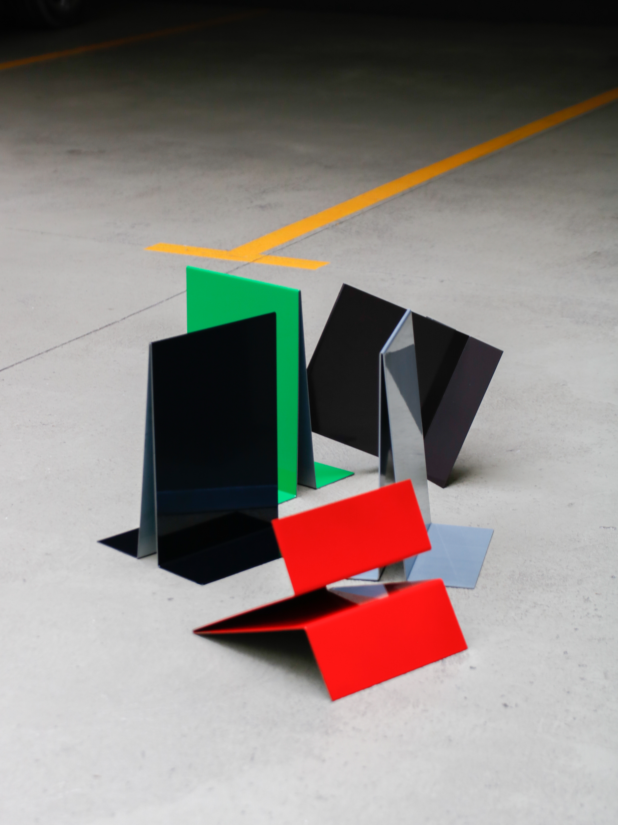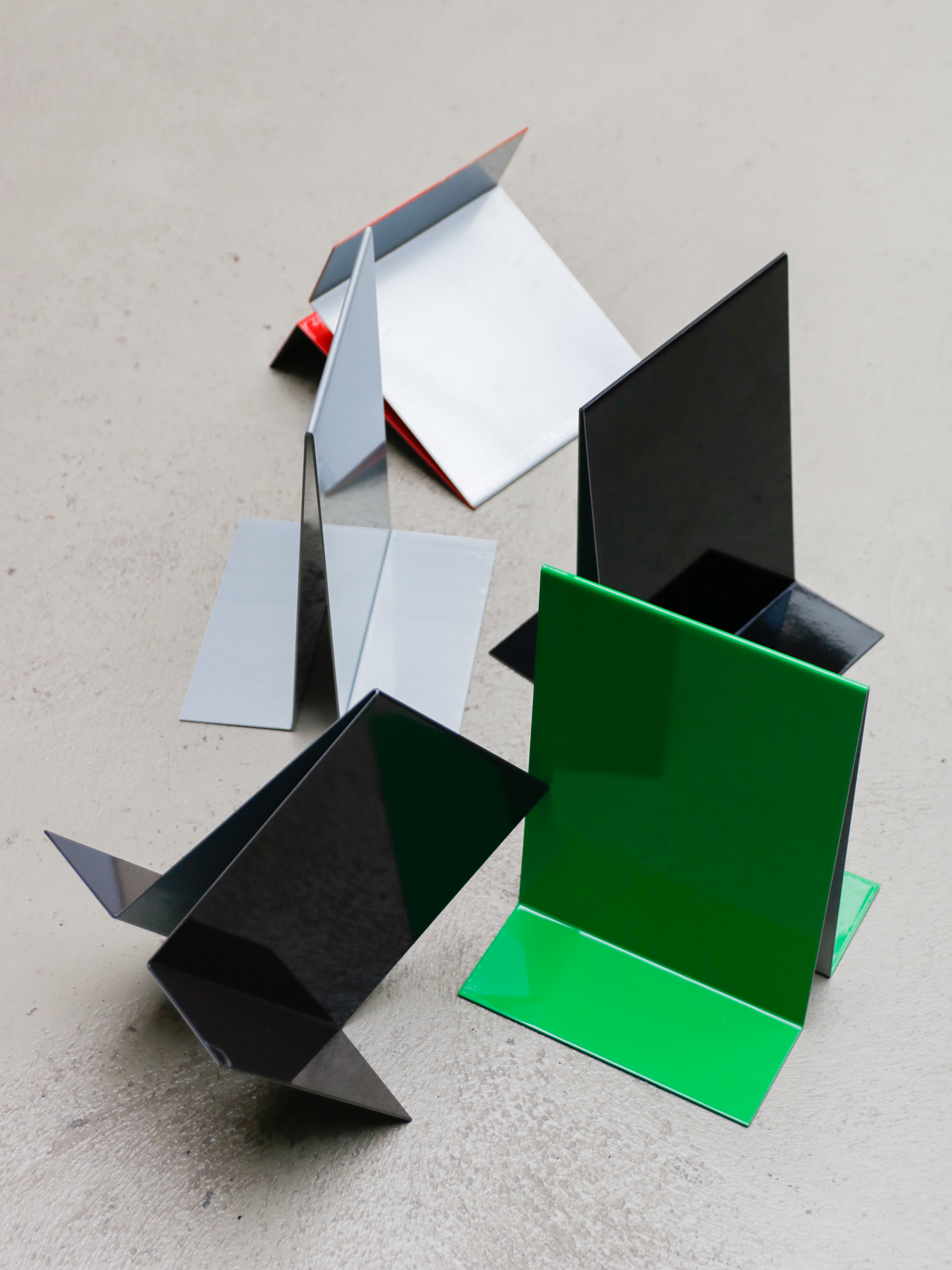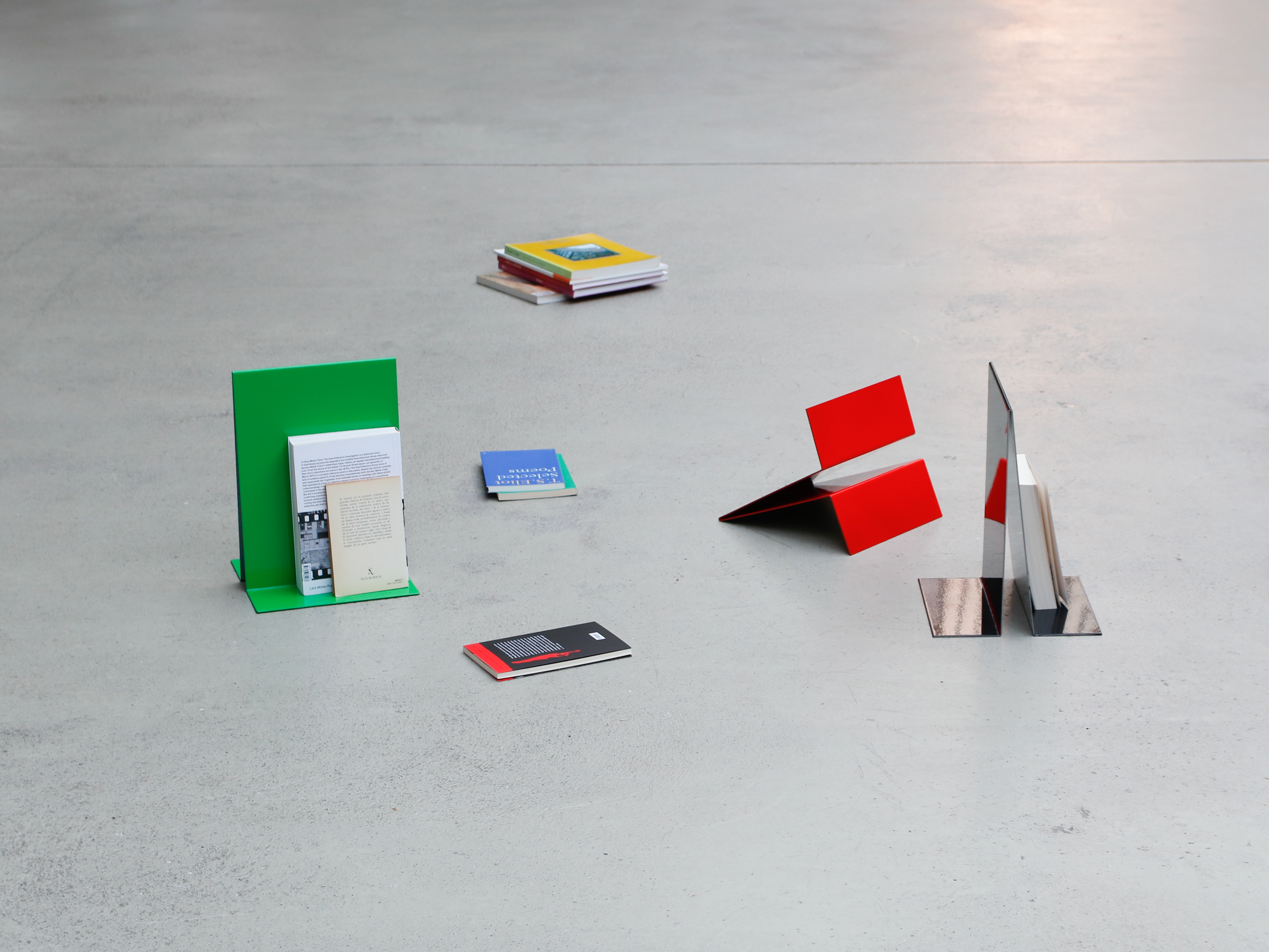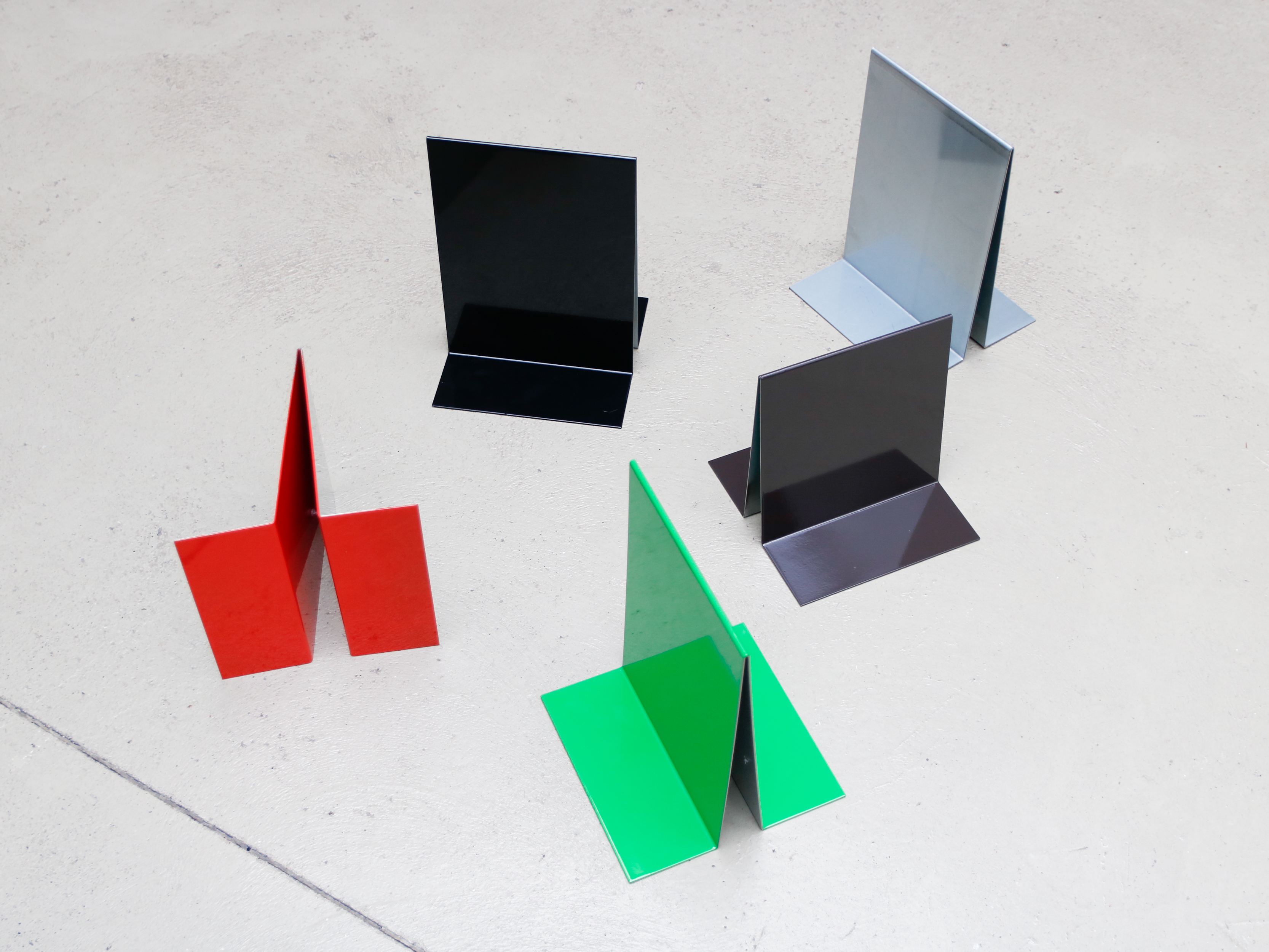 The bookend i meade from a folded 2mm sheet, one of the sides of wich is perpendicular and the other is slightly tilted. This design allows the bookend to be used either at the beginning of the shelf or at the end, suporting all the books. It cal also work as a book stand.