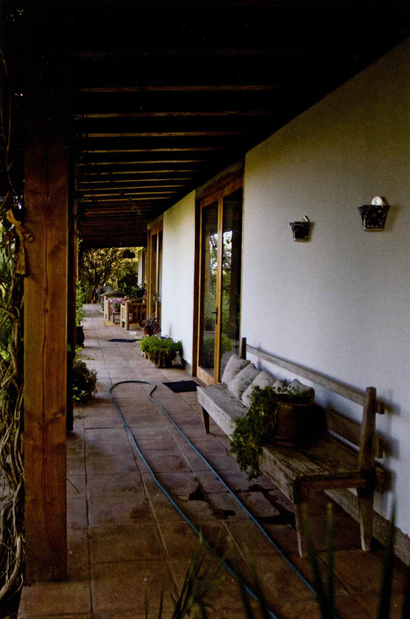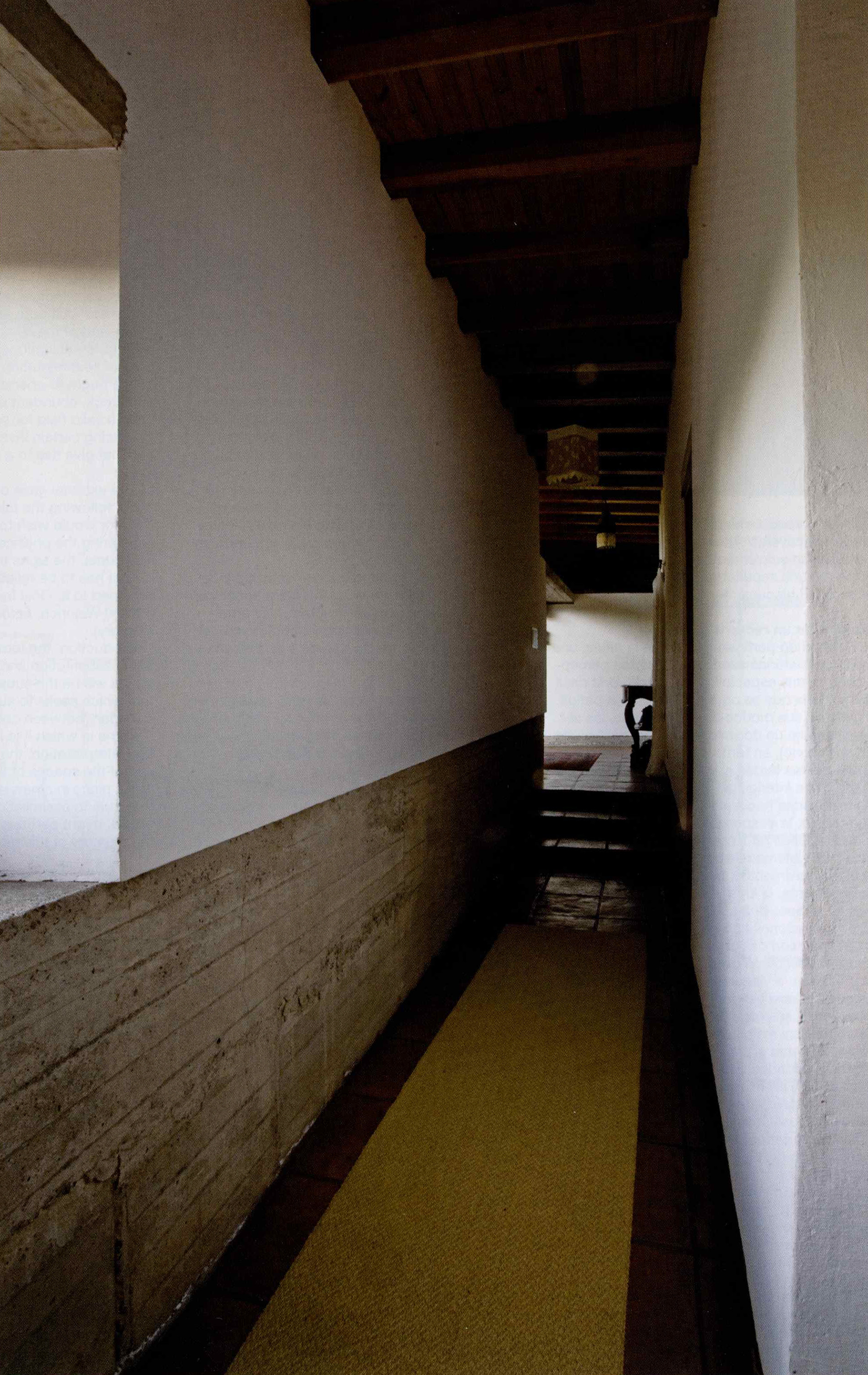 These include a stone podium that protects the adobe from damp; small wooden rugs in the corners every five courses; mortar made of mud with straw, sand and a liquid that comes from the prickly pear; top fastening with a small slab of bare concrete (the weight of which replaced the traditional ceramic roof tile —the actual roof is of painted steel); windows positioned in the centre of each wall and whose span cannot be more than a third of the length of the wall; eaves; linked corners; mud stucco work; and white-washing. The end result has 80 cm-thick walls, light that filters through controlled gaps, fresh spaces, muffled sounds and an ambiguous temporal kinship.