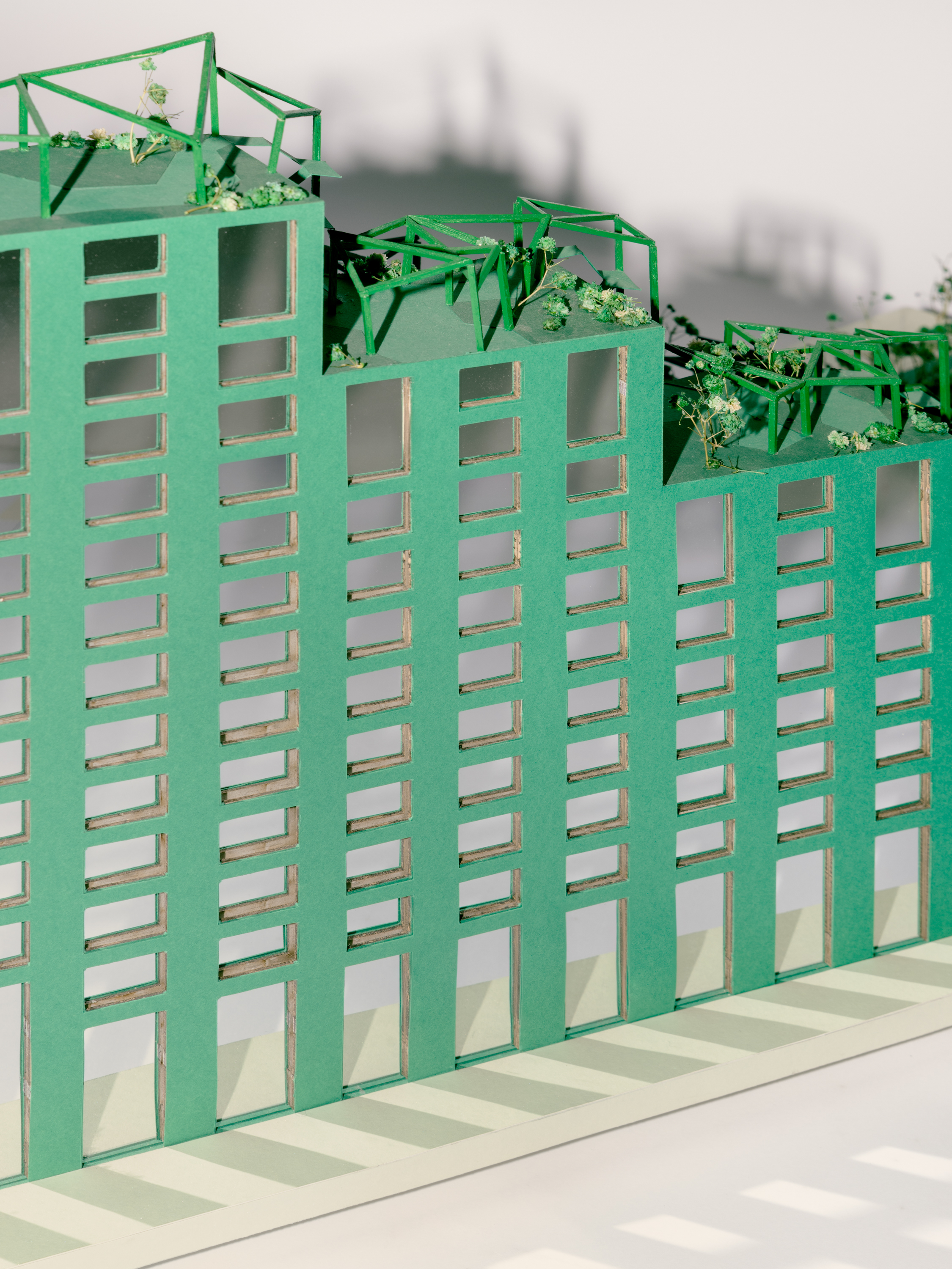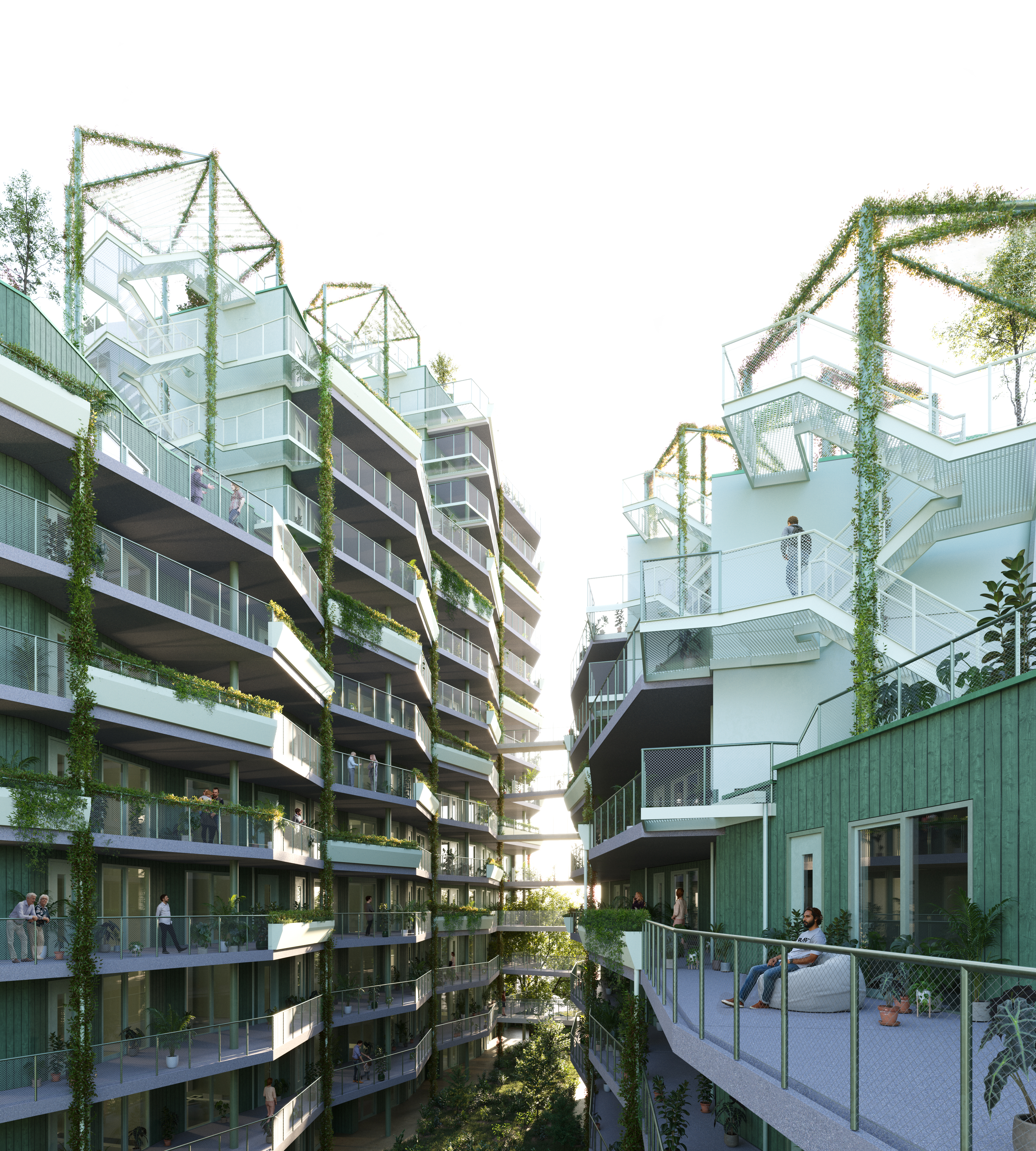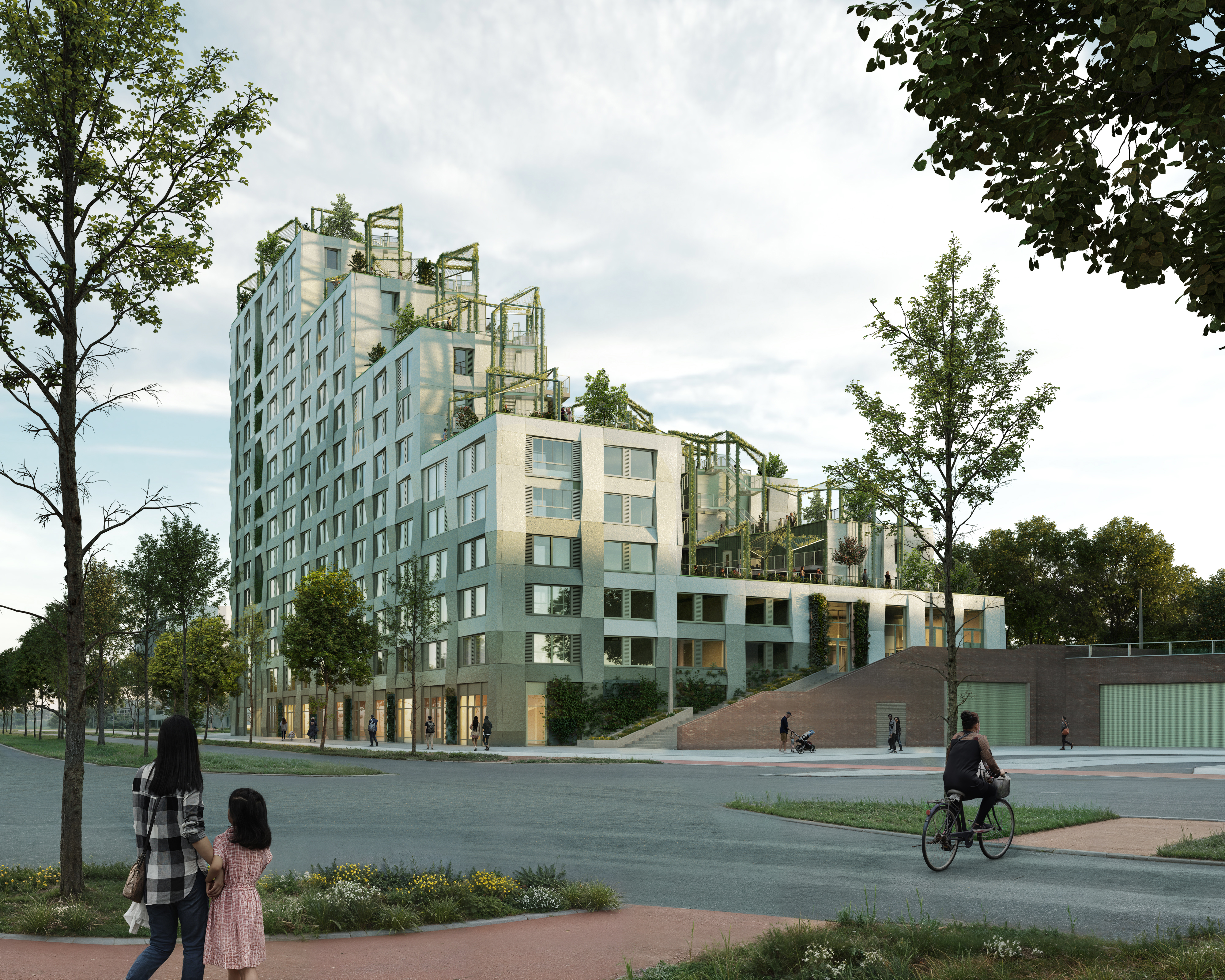 The architectural concept behind Kop Dakpark extends beyond traditional housing. The building is envisioned as an ecosystem that responds to its surroundings. With a smaller scale towards the Bospolder/Tussendijken neighborhood and a metropolitan façade facing M4H, the complex reacts to its urban setting while welcoming nature into the building. Gardens, green façades, and pergolas not only provide shelter and food for insects, birds, and other wildlife but also create a quiet, communal space for the residents.