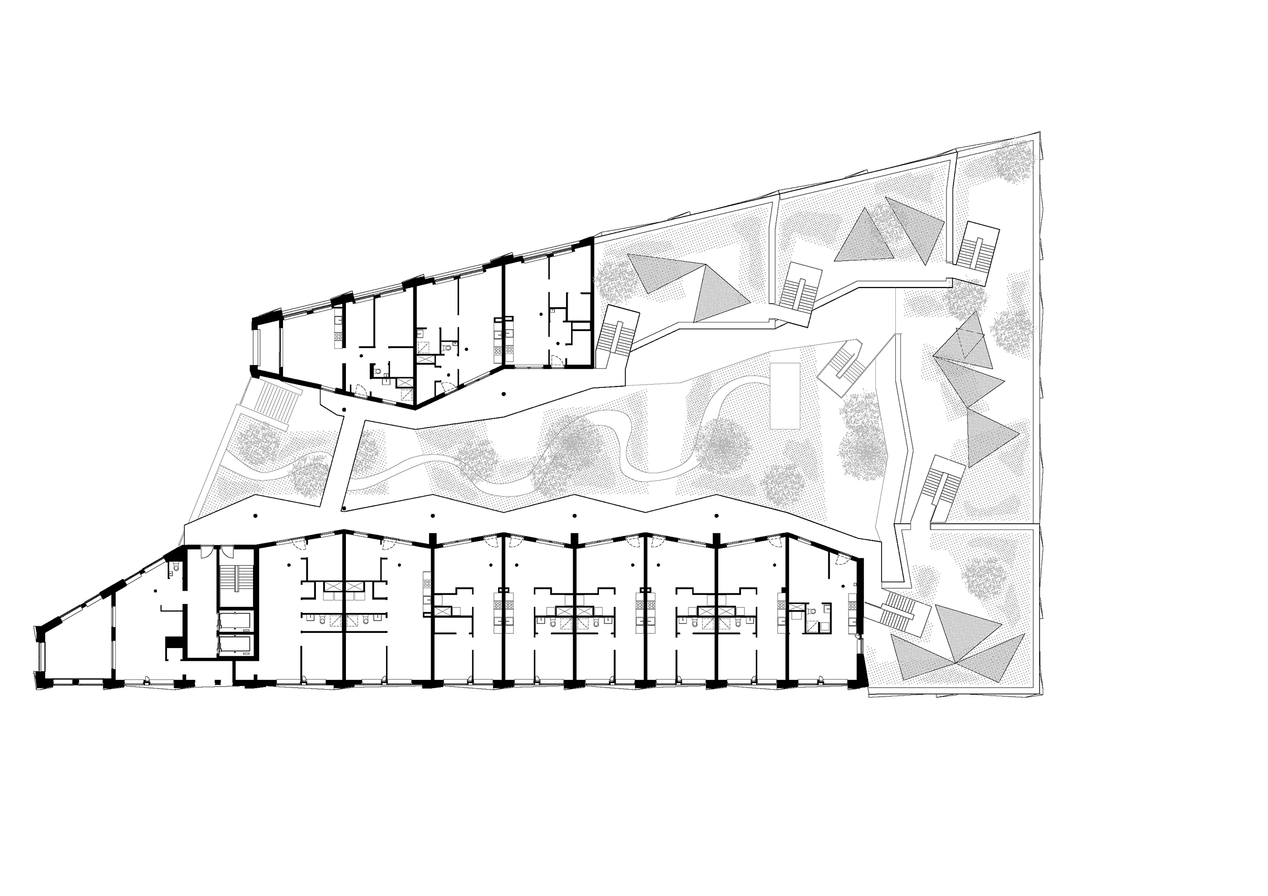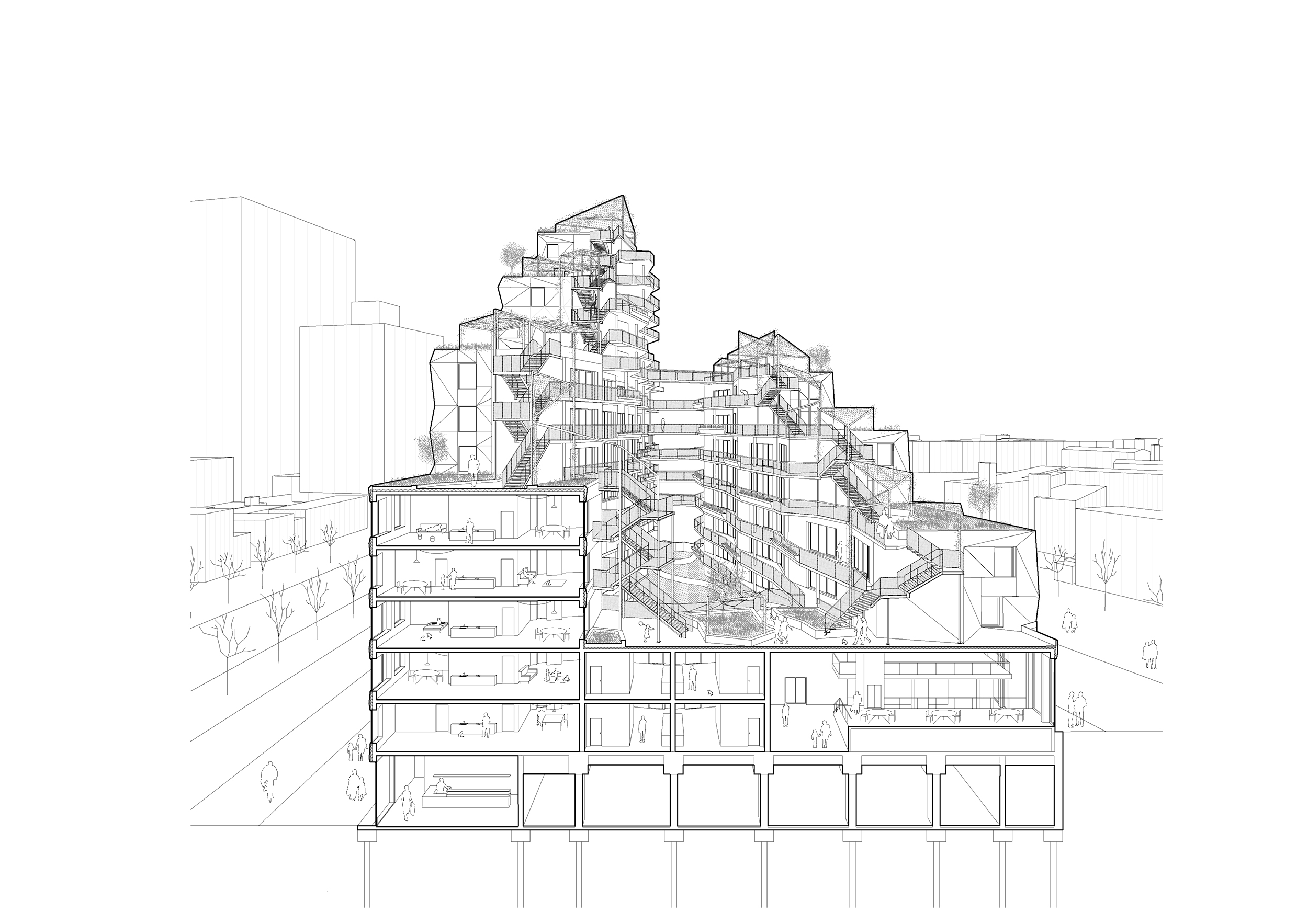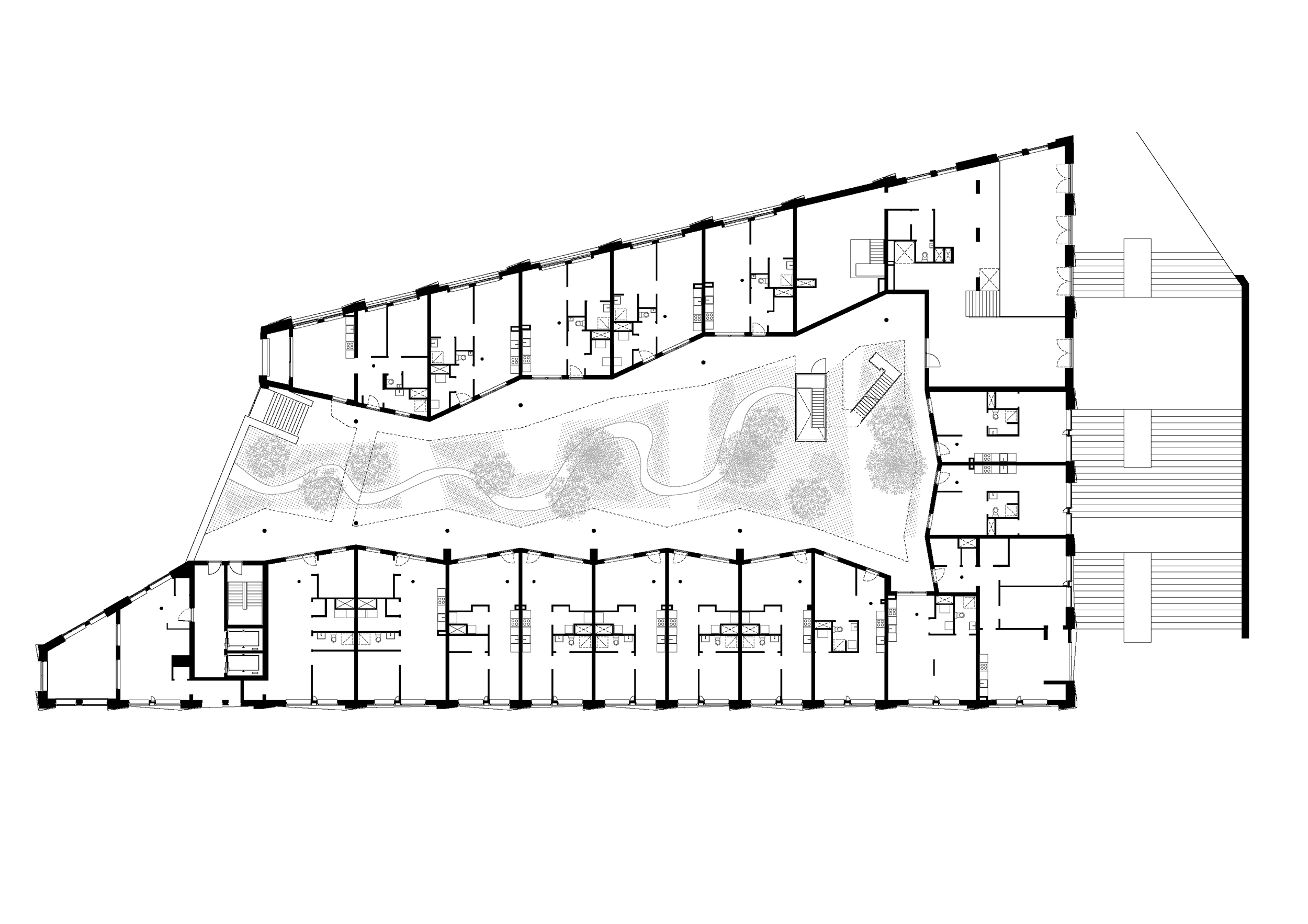 This integration of nature into the building’s fabric reflects a broader ambition: to foster social and ecological diversity. The internal courtyards, wide galleries, and interconnected walkways encourage social interaction, inviting residents to connect with their neighbors and the park around them.