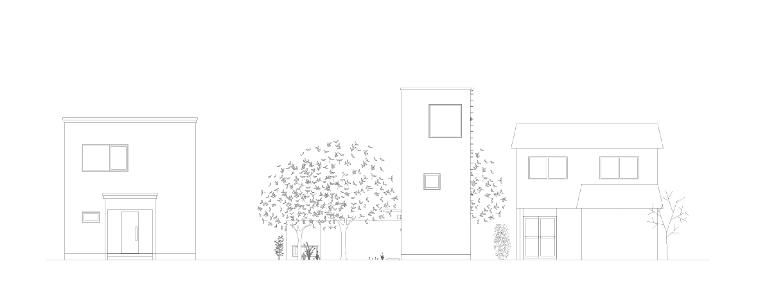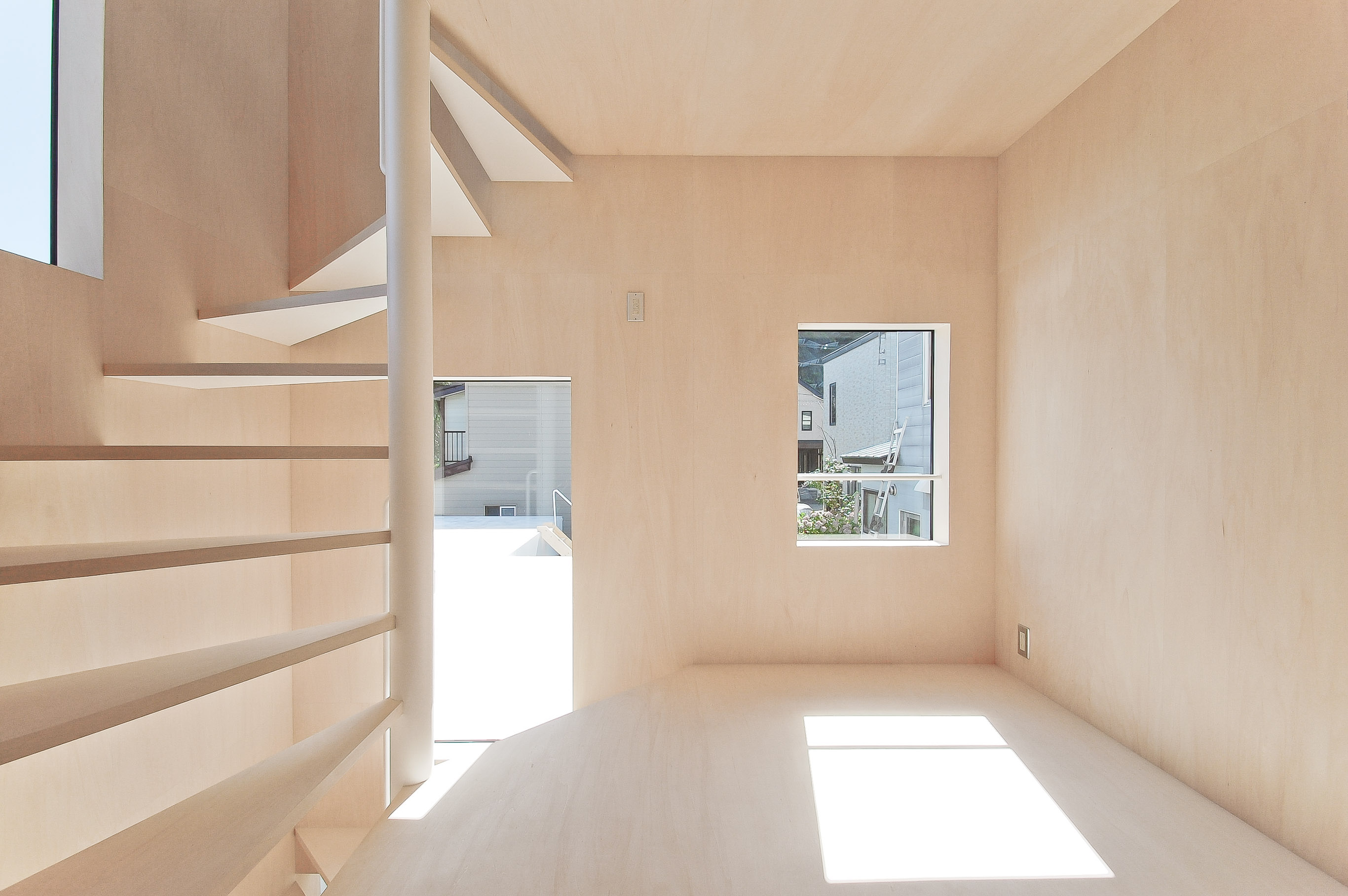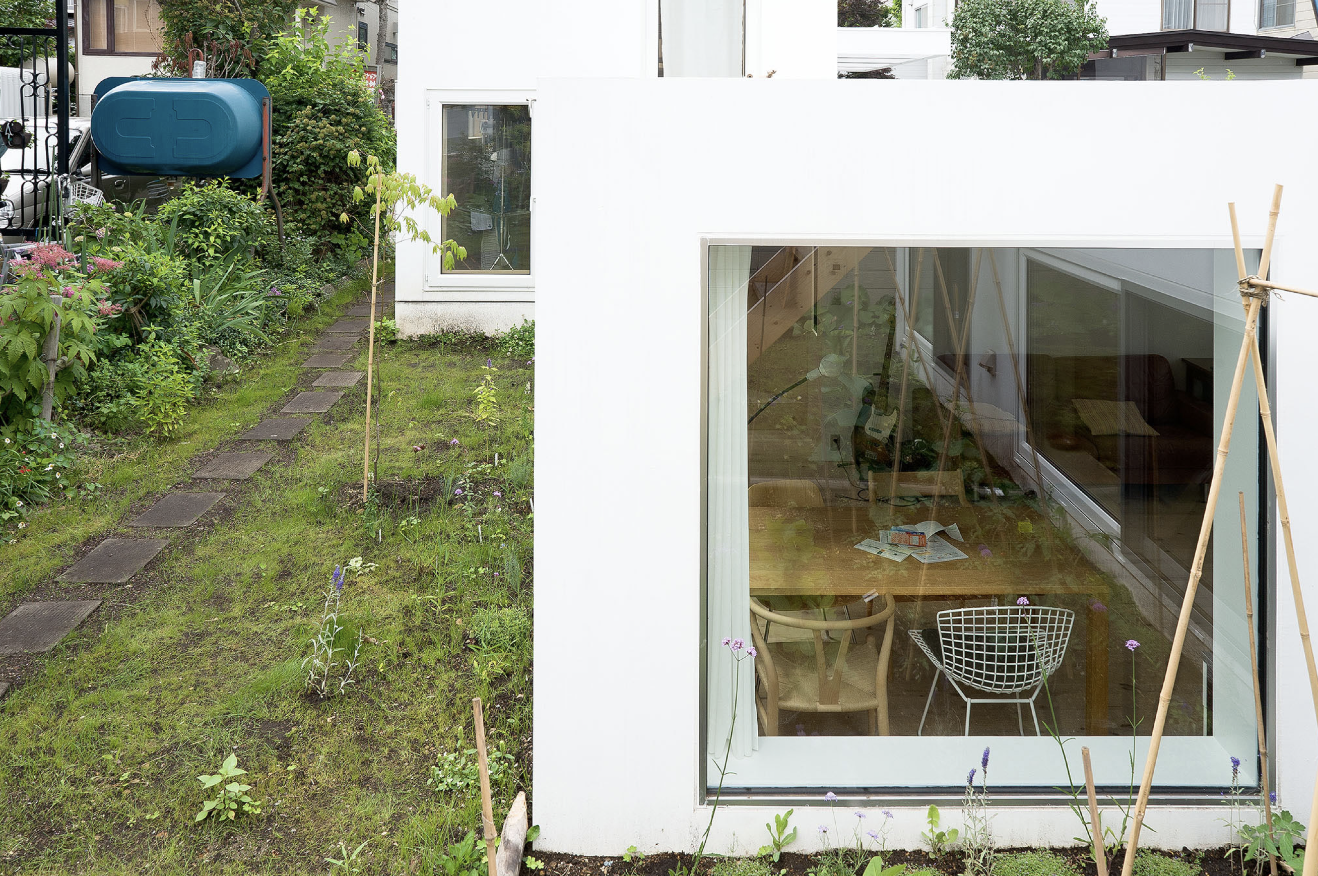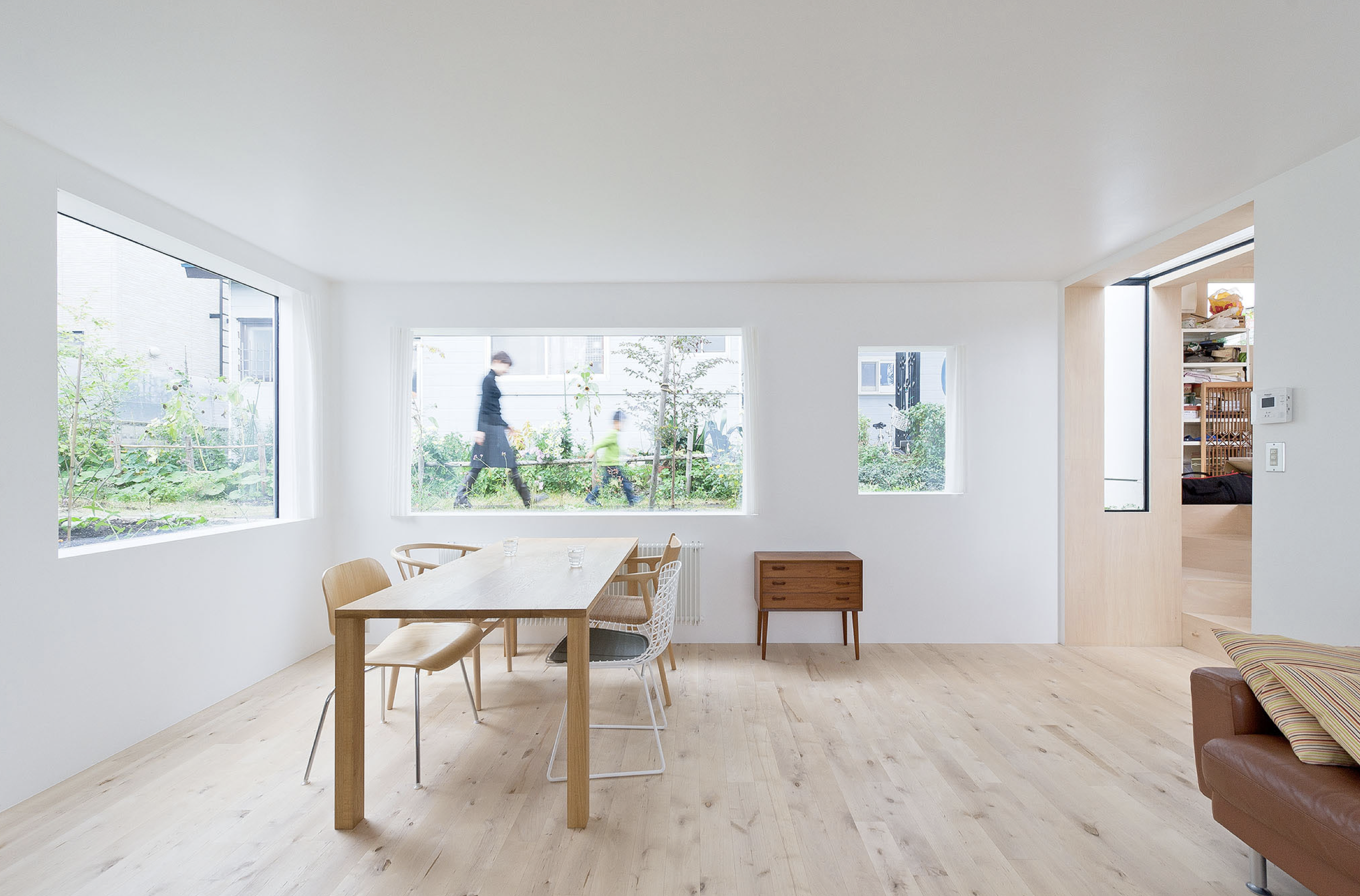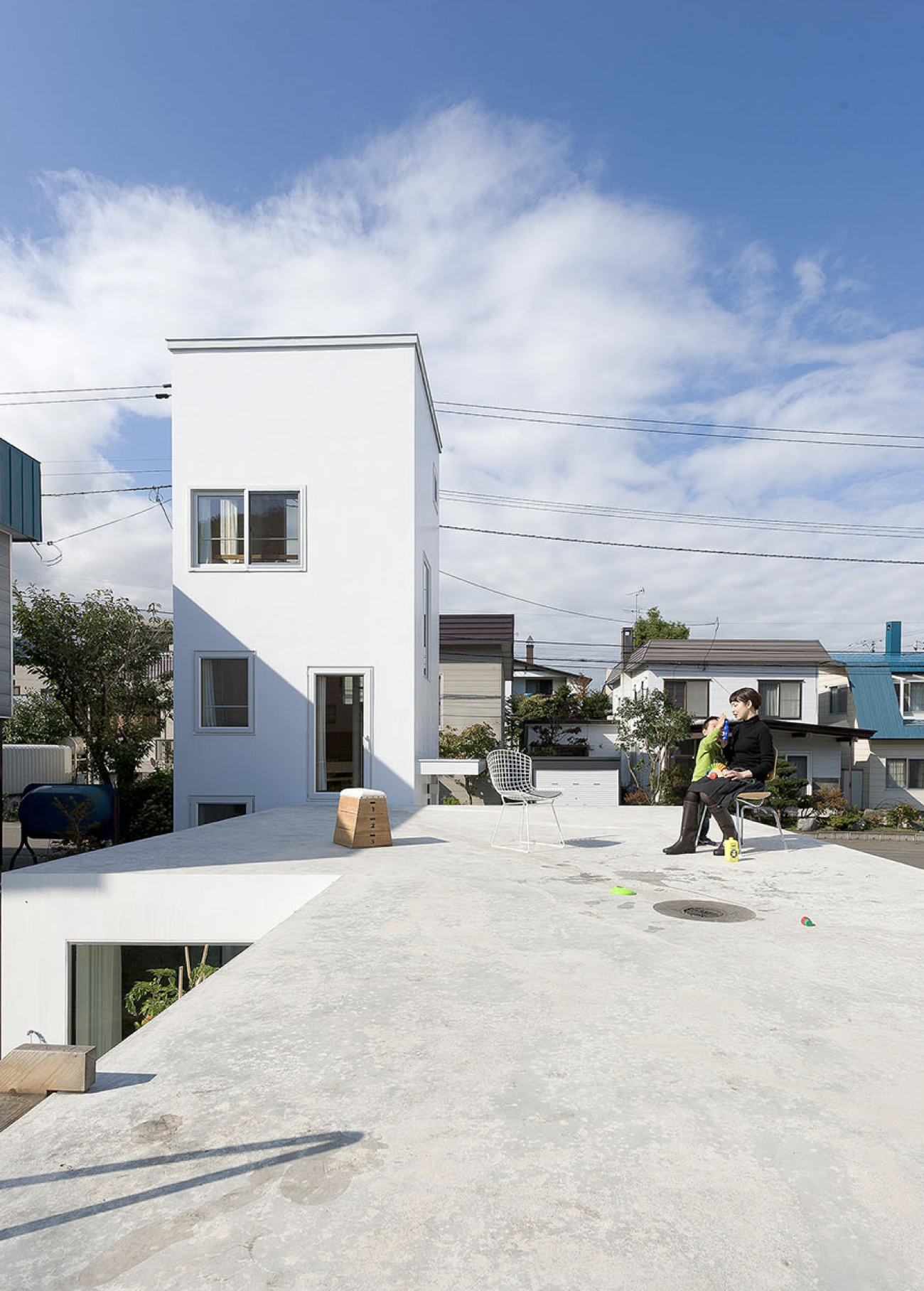The house is composed of a one-story volume and a three-story tower. The low one-story volume sits 720mm below ground, with result that the yard is at the same height as the dining table. Just outside the window, flowers bloom and children play on an eye level with adults standing indoors. With a roof height of 1,870mm, the low volume casts very little shadow, so the site overall is bright and airy, and the house is filled with reflected light. Going onto the roof, one enters a plaza encompassed by trees. The roof plaza has a comfortable height unlike that of a balcony or the roof of a two-story building. It subtly changes one’s relationship with the neighboring houses and people walking on the street. The other volume is a small wood-frame tower with a square plan, 3.1m to a side, standing 8.2m high. From the third-story windows, one can enjoy the distant mountains and expanse of the sky.