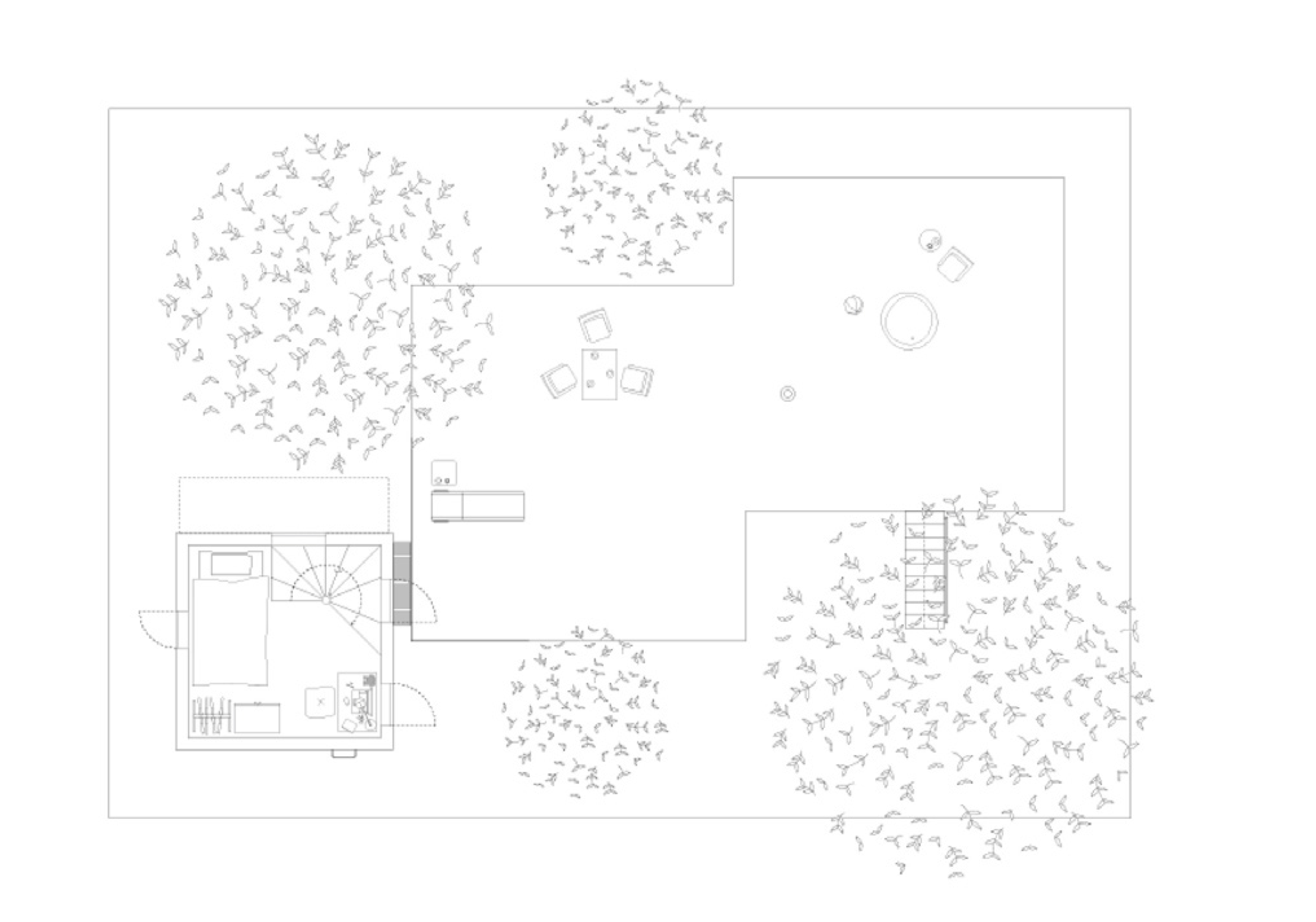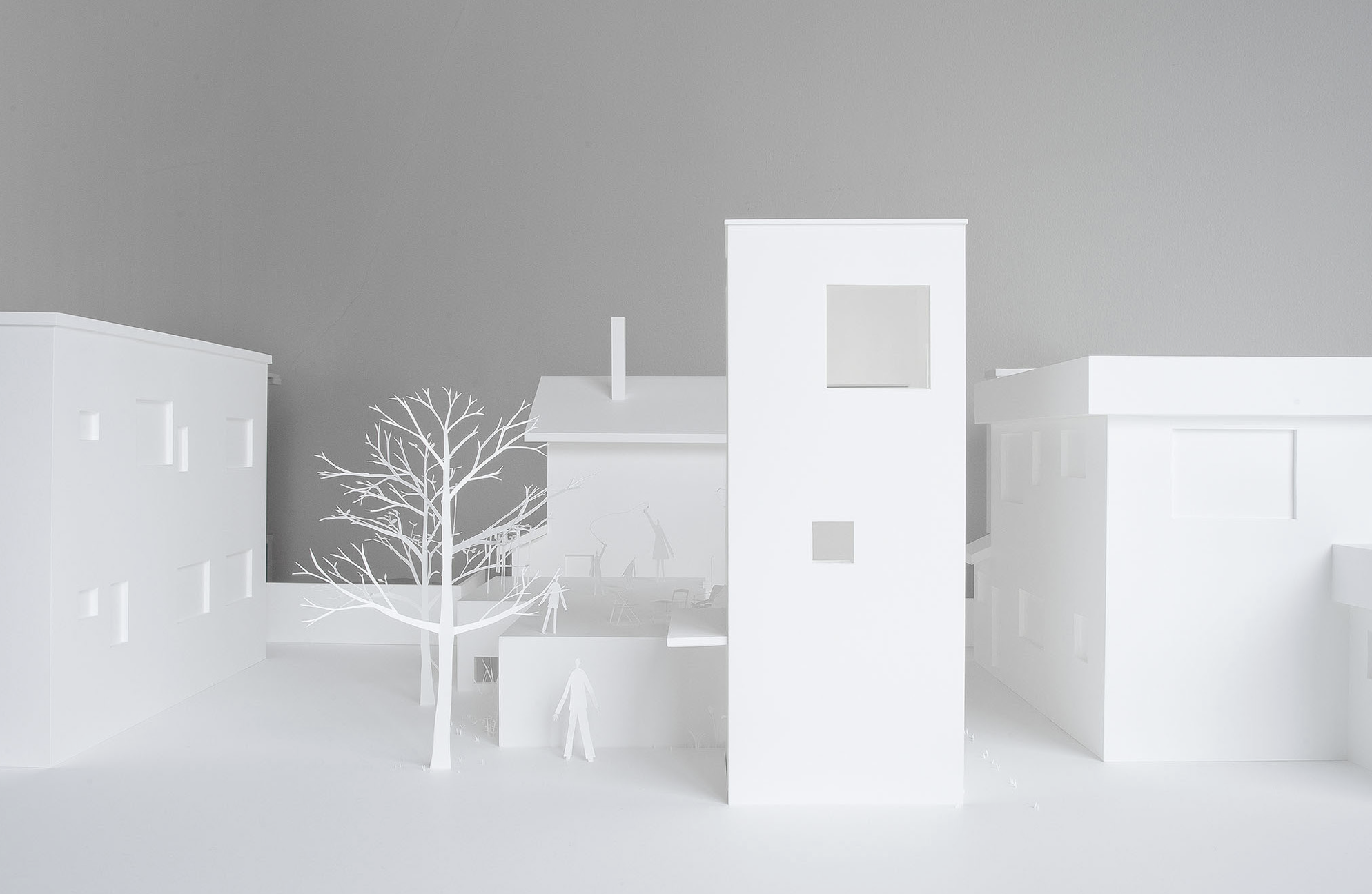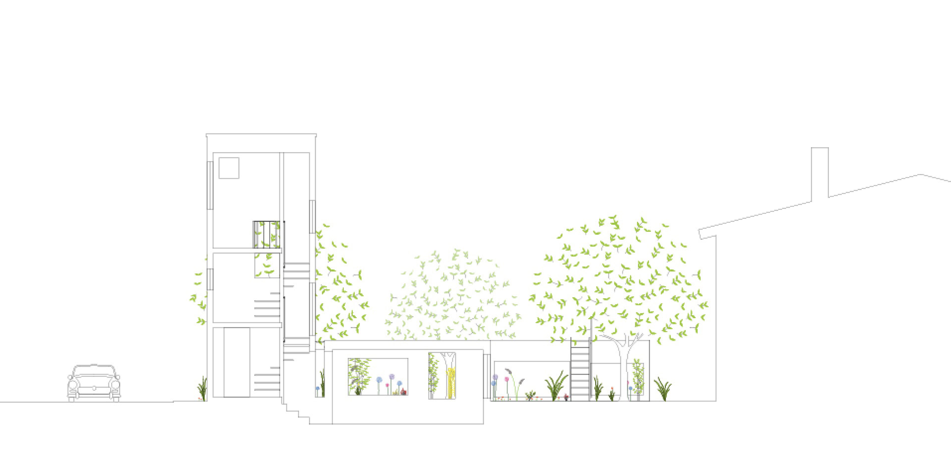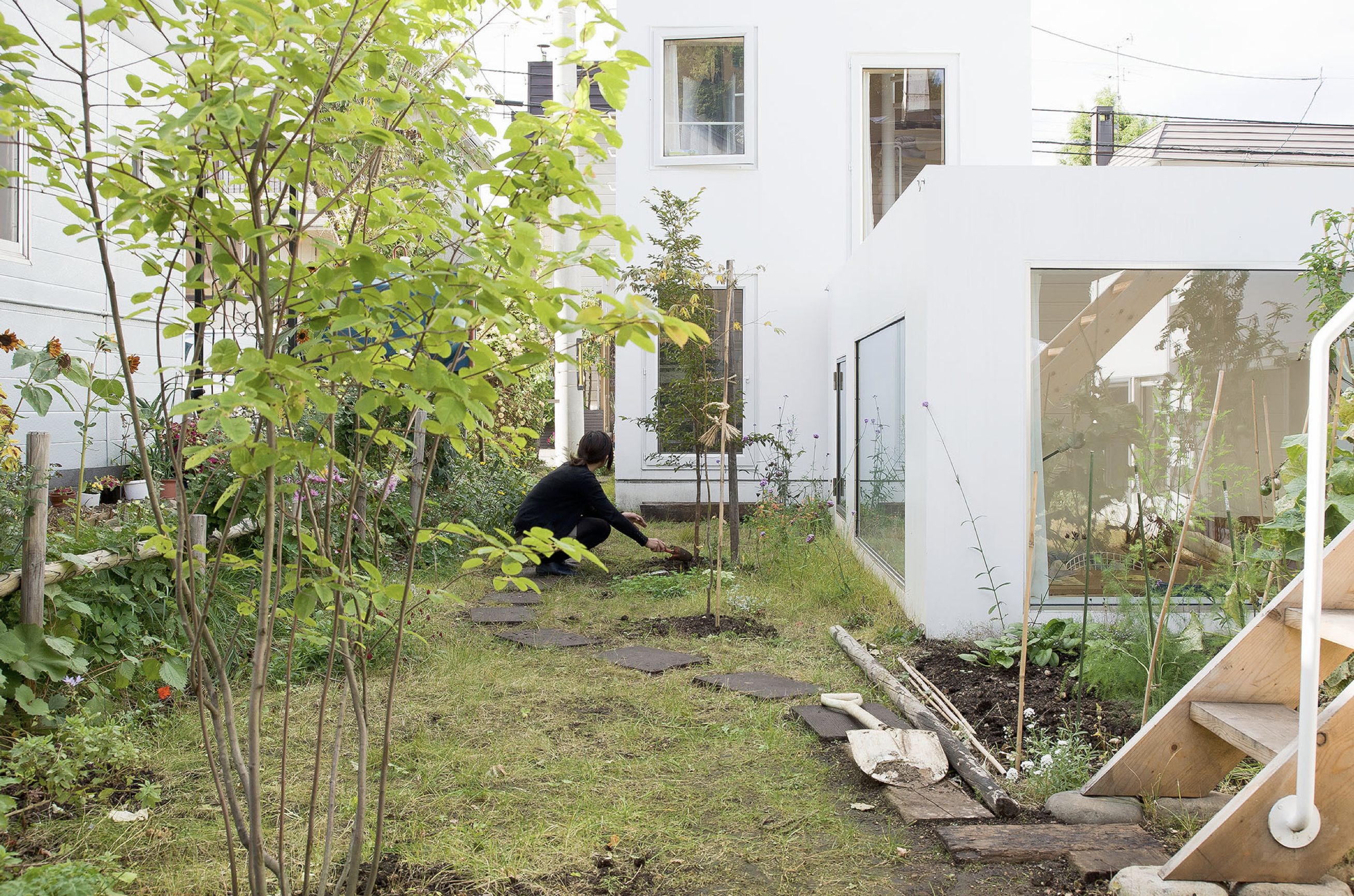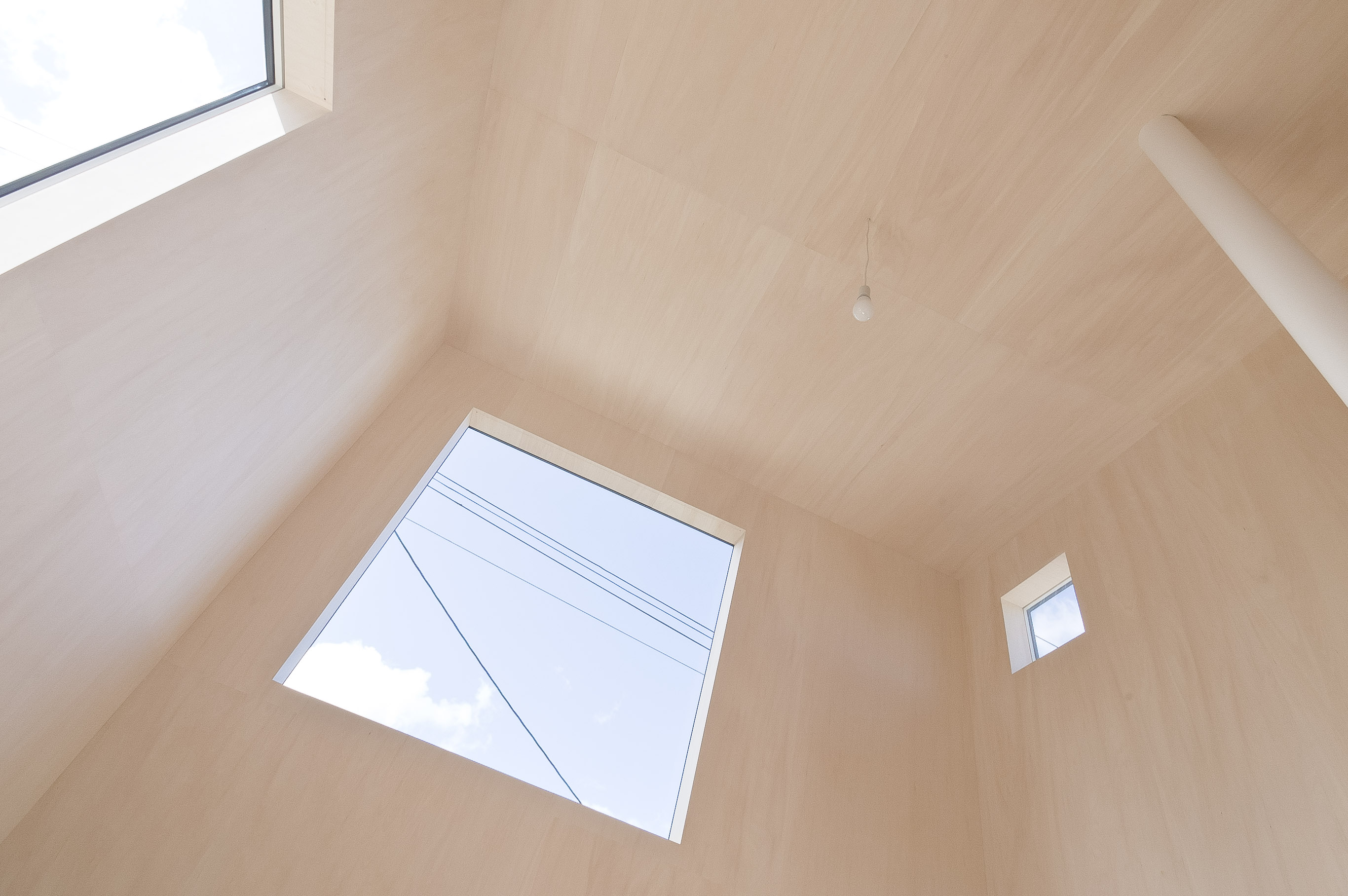The house is composed of a one-story volume and a three-story tower. The low one-story volume sits 720mm below ground, with result that the yard is at the same height as the dining table. Just outside the window, flowers bloom and children play on an eye level with adults standing indoors. With a roof height of 1,870mm, the low volume casts very little shadow, so the site overall is bright and airy, and the house is filled with reflected light. Going onto the roof, one enters a plaza encompassed by trees. The roof plaza has a comfortable height unlike that of a balcony or the roof of a two-story building. It subtly changes one’s relationship with the neighboring houses and people walking on the street. The other volume is a small wood-frame tower with a square plan, 3.1m to a side, standing 8.2m high. From the third-story windows, one can enjoy the distant mountains and expanse of the sky.