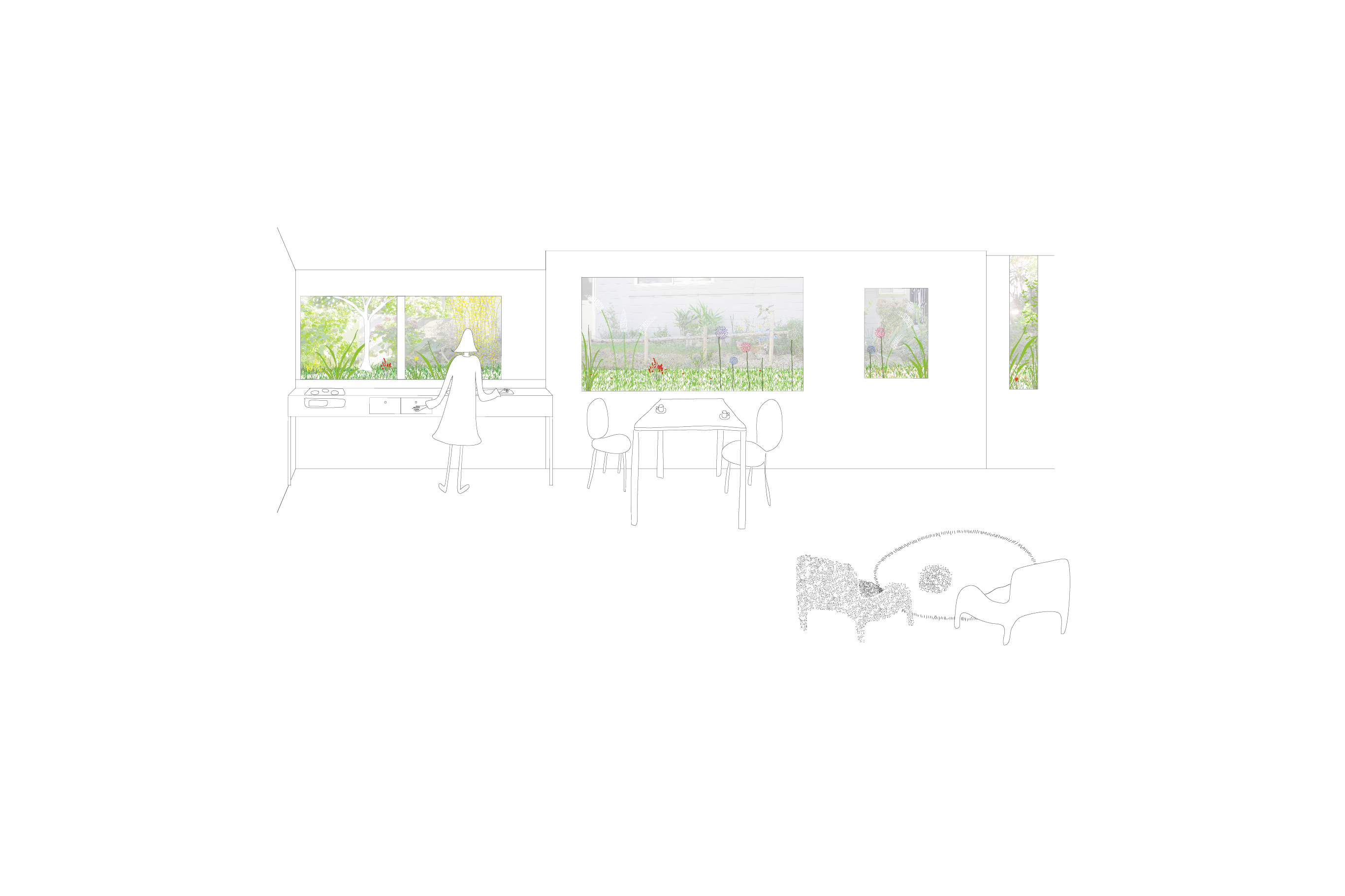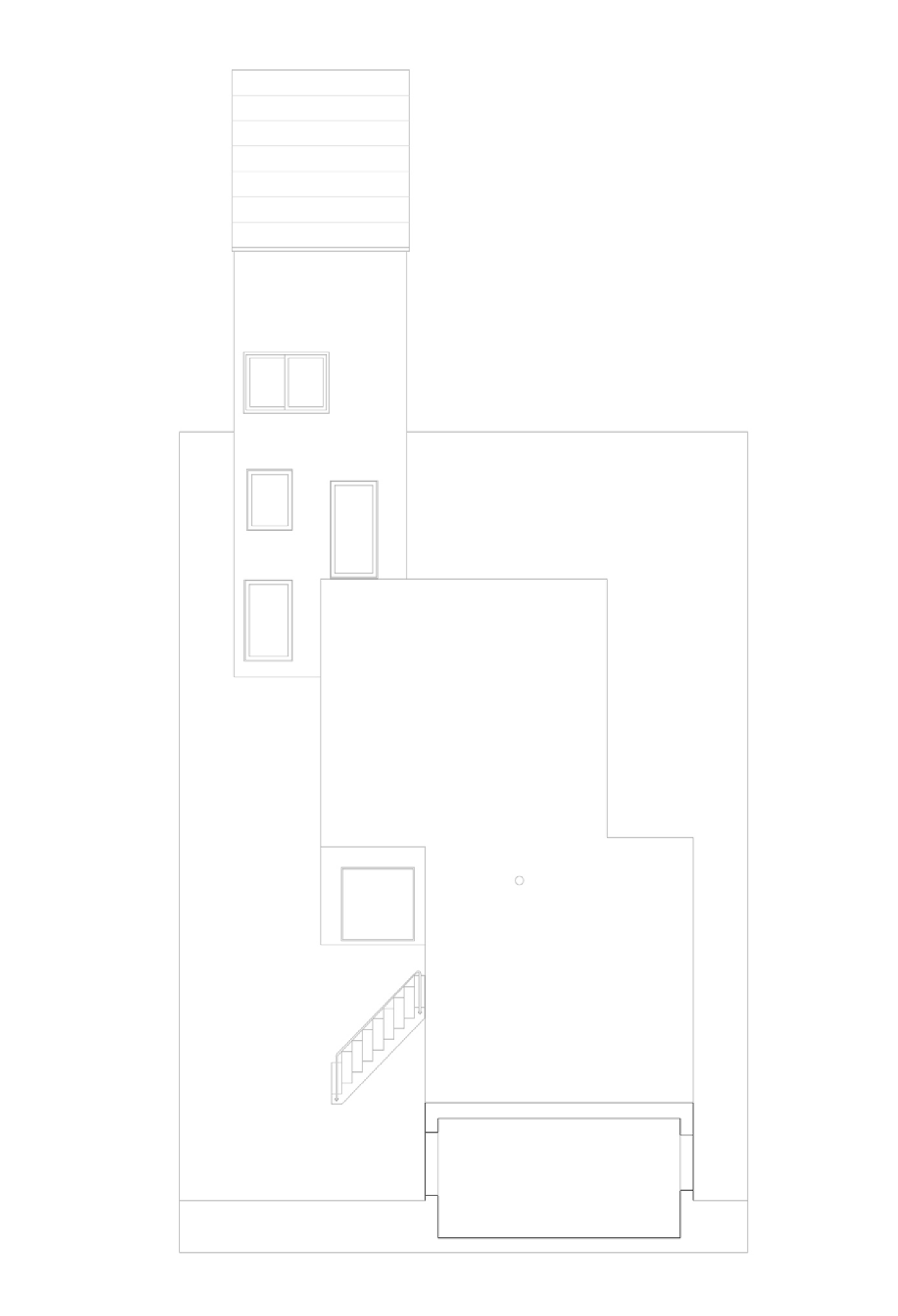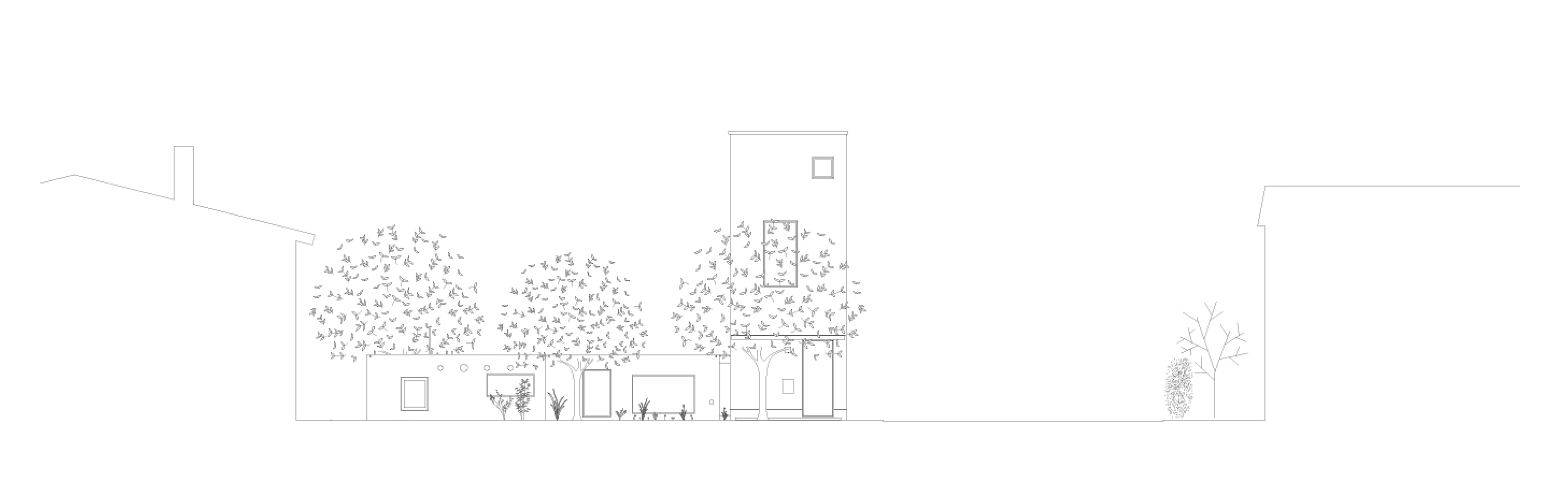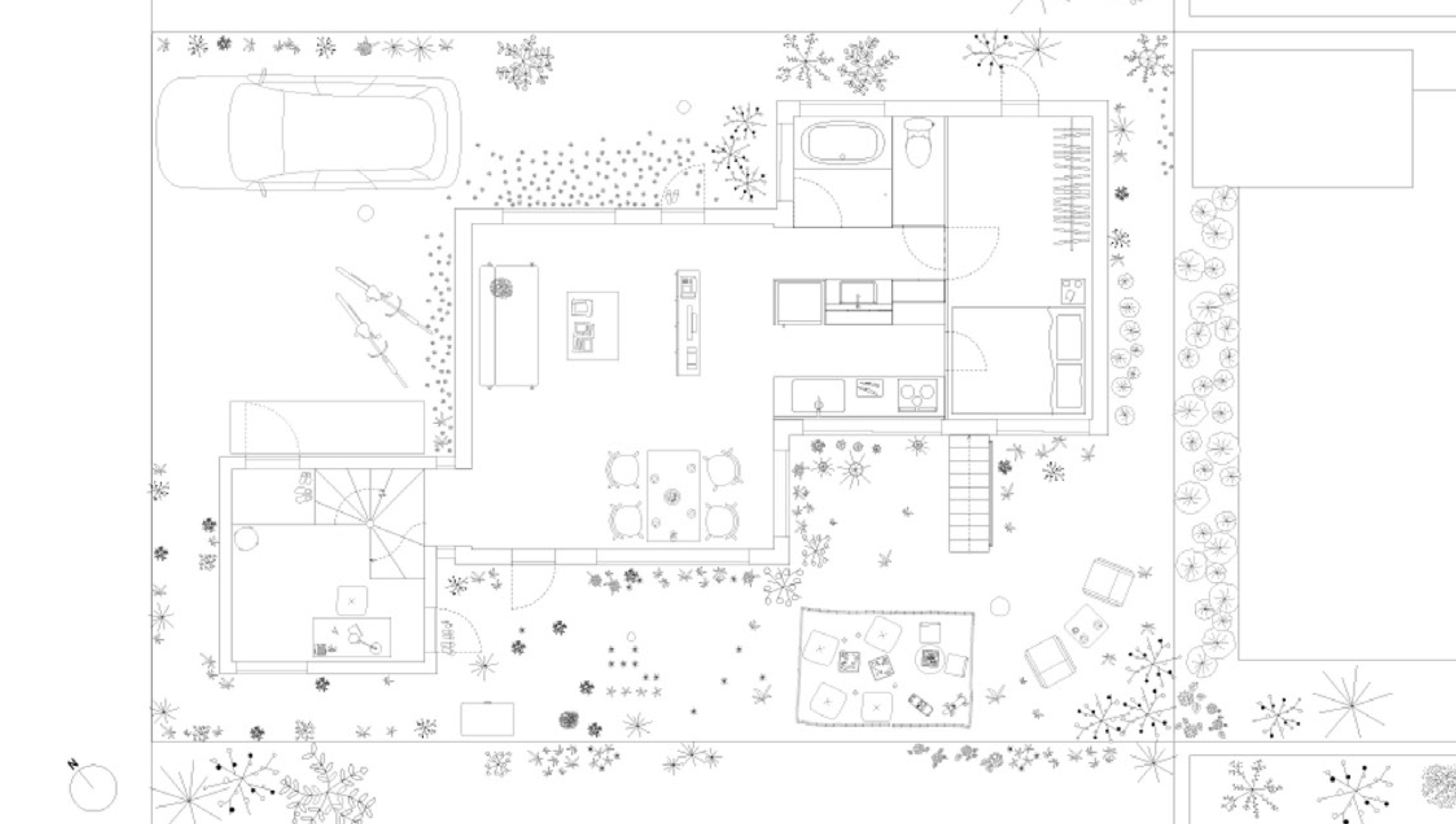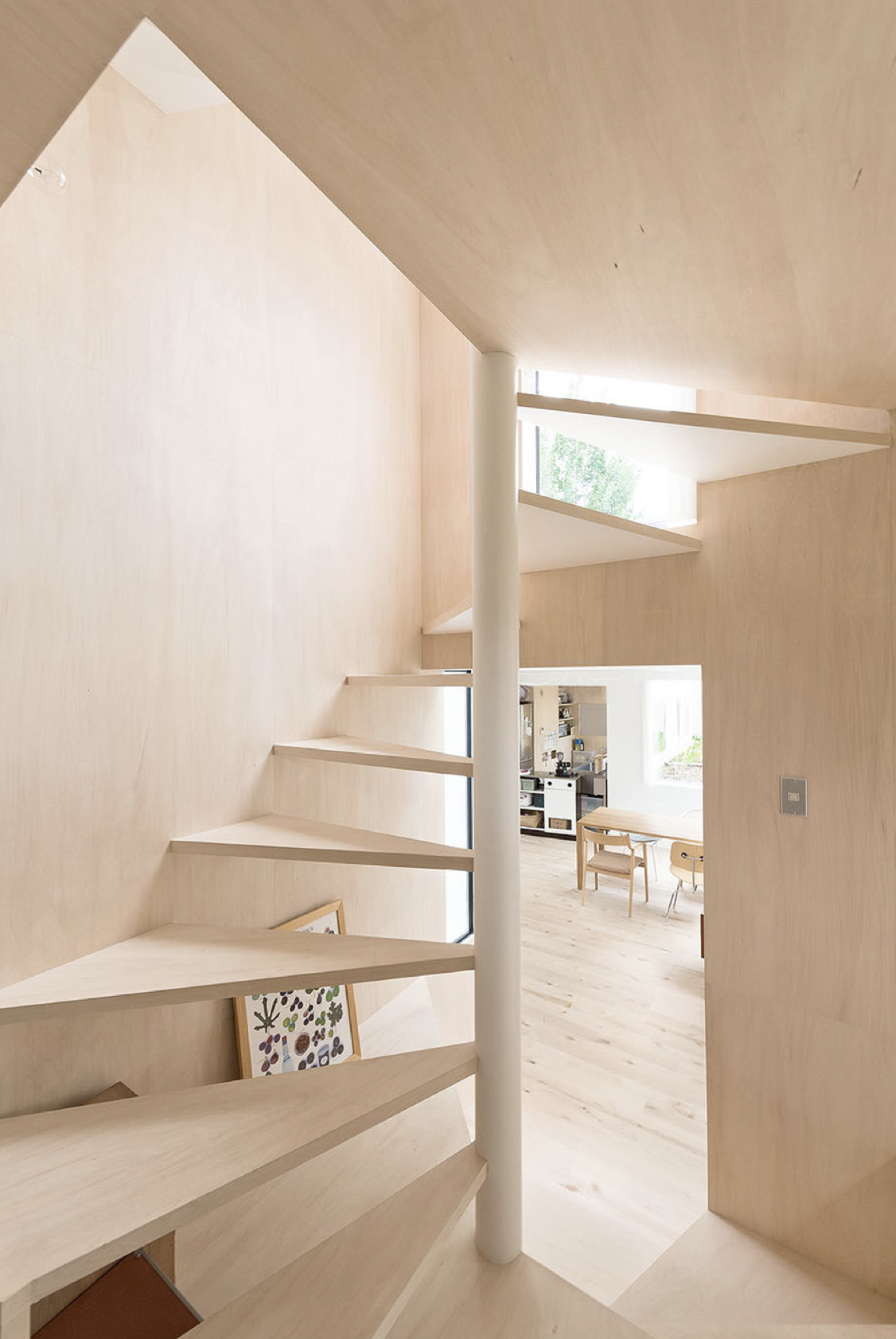 The house is composed of a one-story volume and a three-story tower. The low one-story volume sits 720mm below ground, with result that the yard is at the same height as the dining table. Just outside the window, flowers bloom and children play on an eye level with adults standing indoors. With a roof height of 1,870mm, the low volume casts very little shadow, so the site overall is bright and airy, and the house is filled with reflected light. Going onto the roof, one enters a plaza encompassed by trees. The roof plaza has a comfortable height unlike that of a balcony or the roof of a two-story building. It subtly changes one’s relationship with the neighboring houses and people walking on the street. The other volume is a small wood-frame tower with a square plan, 3.1m to a side, standing 8.2m high. From the third-story windows, one can enjoy the distant mountains and expanse of the sky.