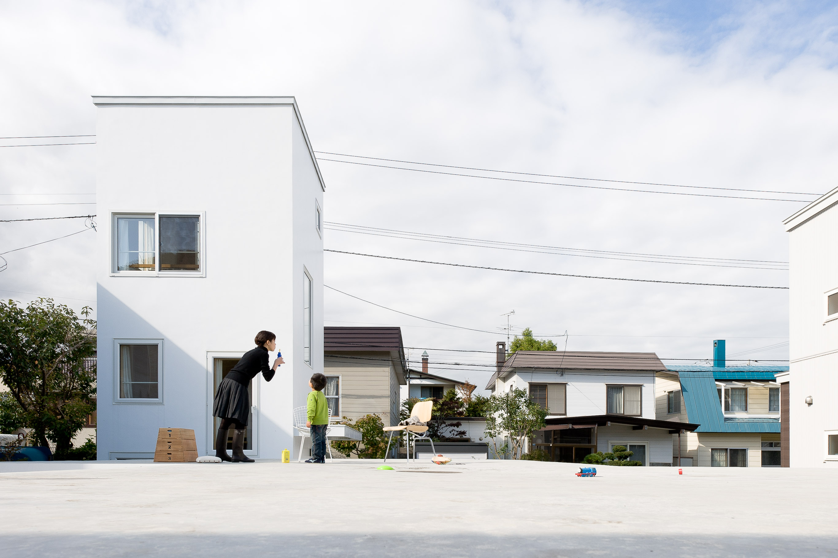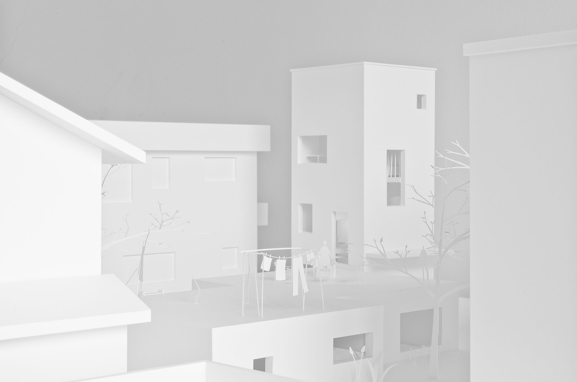 The site is a lot in a thoroughly ordinary residential area consisting of straight rows of roughly 165-square-meter lots. A two-story house stands in the middle of each lot, and the gloom born from the narrow spaces between the houses gives the neighborhood as a whole an oppressive atmosphere. I wondered if I might find some method of imparting change to this residential area where the concept of ownership was blatantly obvious. By giving continuity to the relationship between interior and exterior, I sought to make the overall site a house and created numerous studies to this end. As a result, the residents’ lifestyle spills out of the house and occasions the creation of the townscape. Designing the house was a project of seeking the best approach to clustered living—the form in which people dwell everywhere.