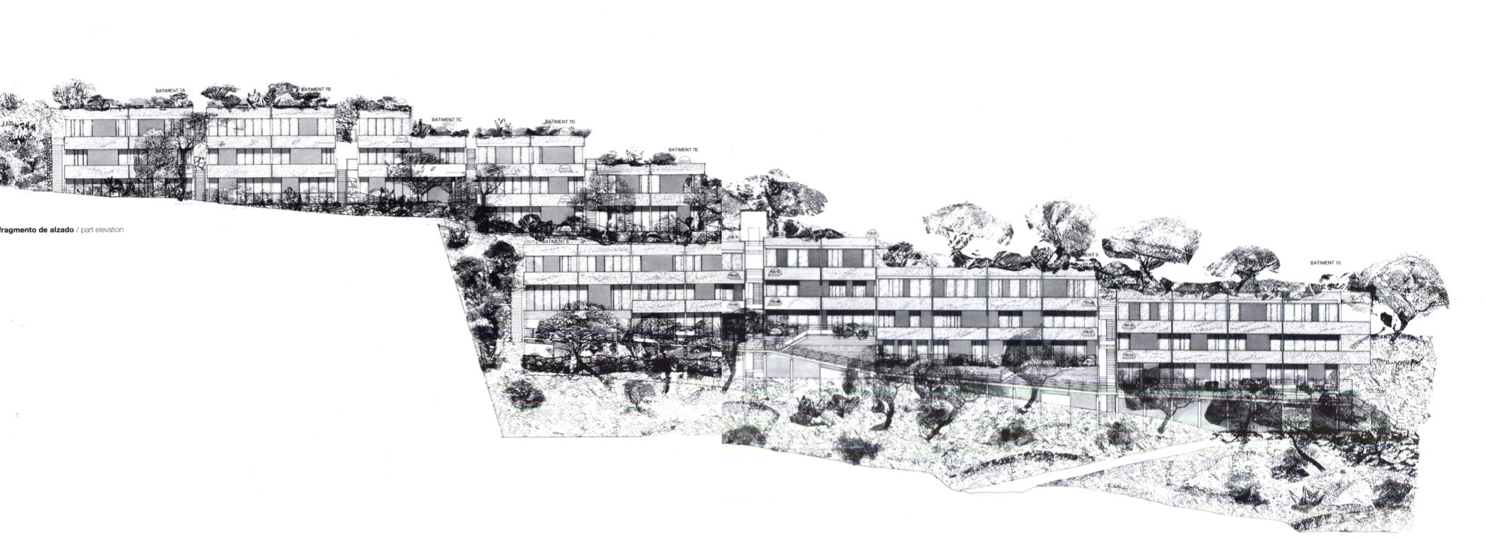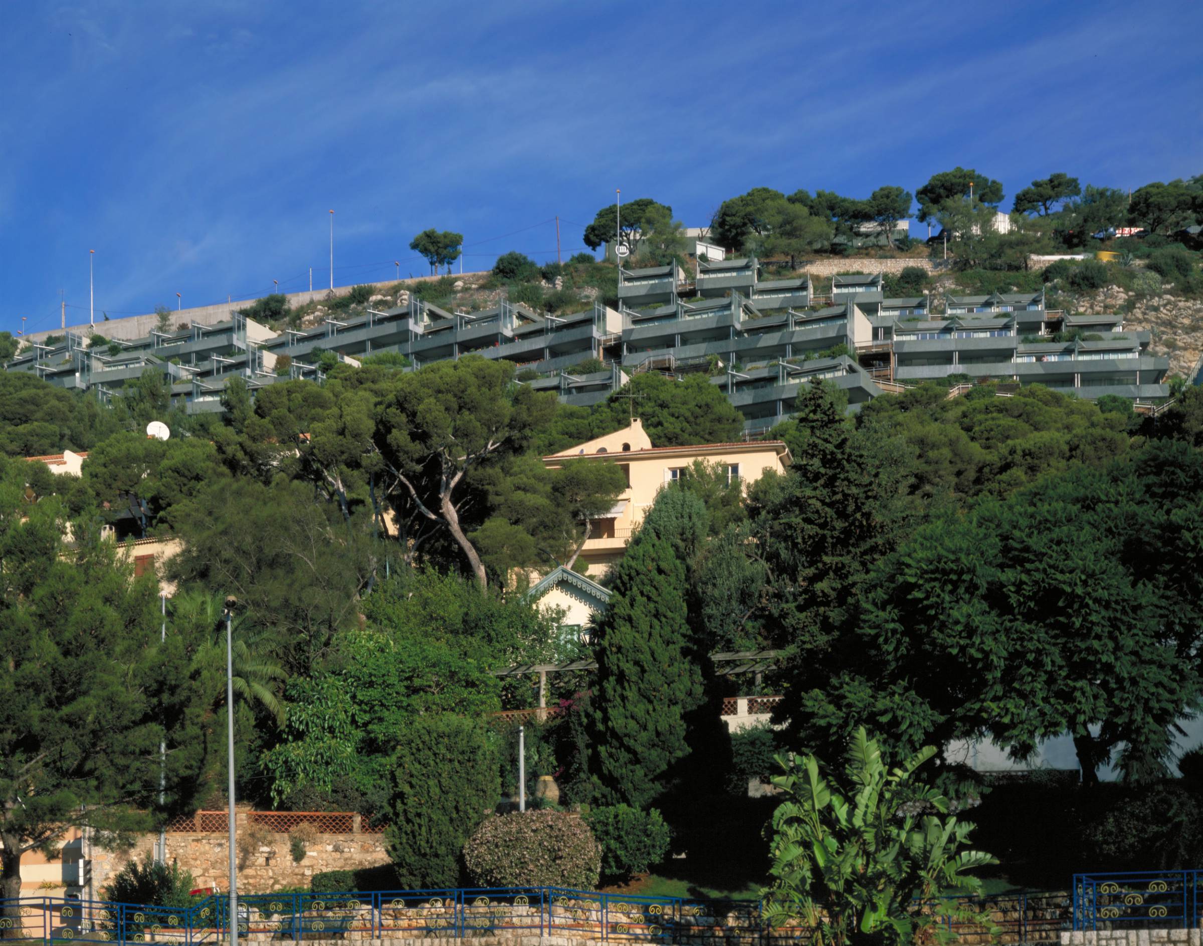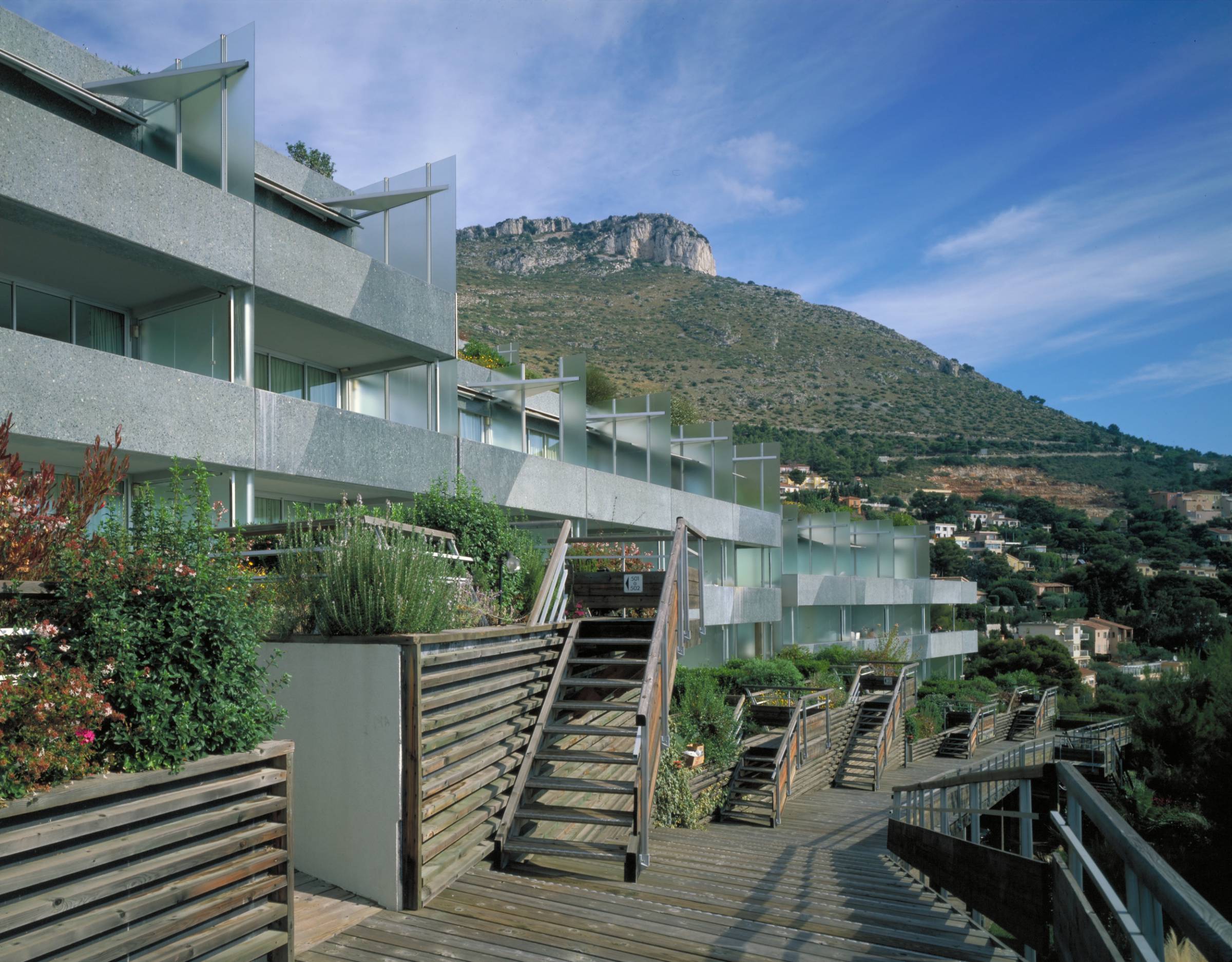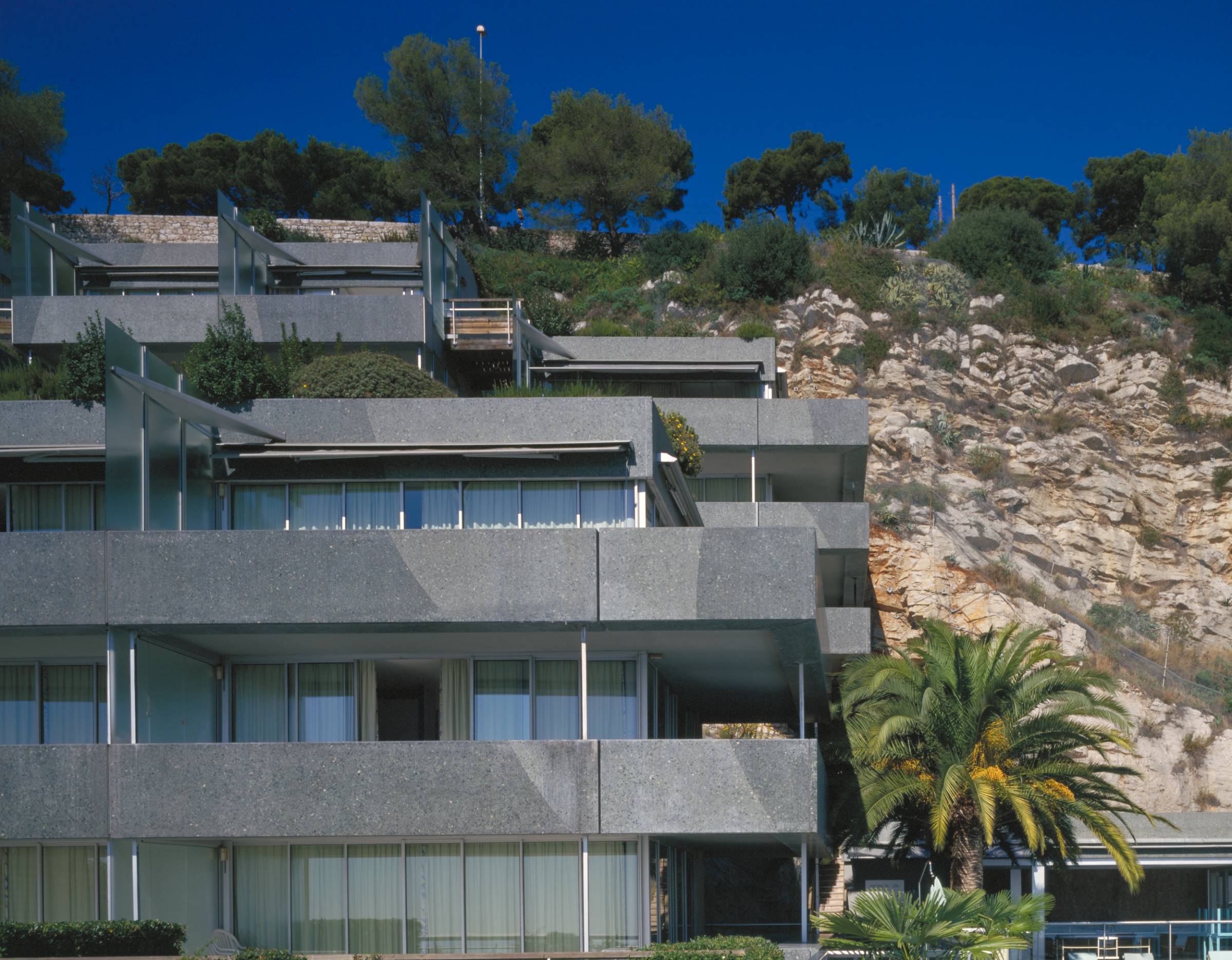 Seen from the inside, the architecture of the garages hollowed out of the rock, lit by long horizontal slits, is crypt-like. Yet with the CinemaScope view of the landscape from each apartment, it is panoramic. It seeks to be restful, serene, and immutable in the simplicity of its contours and the harmony of its materials – polished marble stone, which, whether in shadow or sunlight, calls out to be touched. The thickness of the medium, the freshness related to its mass and to the depth of space create an impression of architecture engraved in the rock, a recollection, an awareness of what architecture has always been: a shelter, a strategic place from which to face time and the elements.