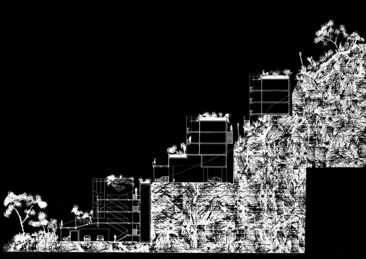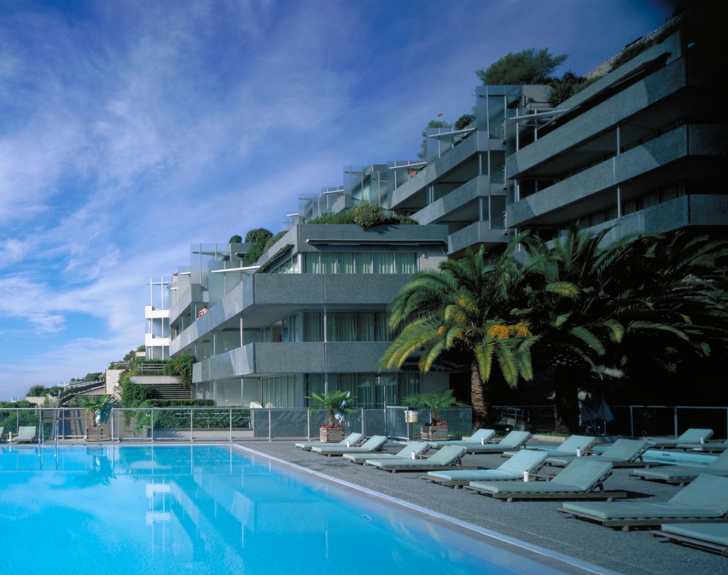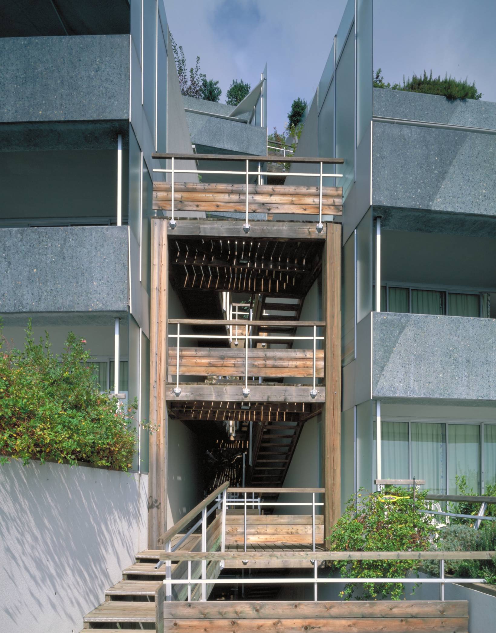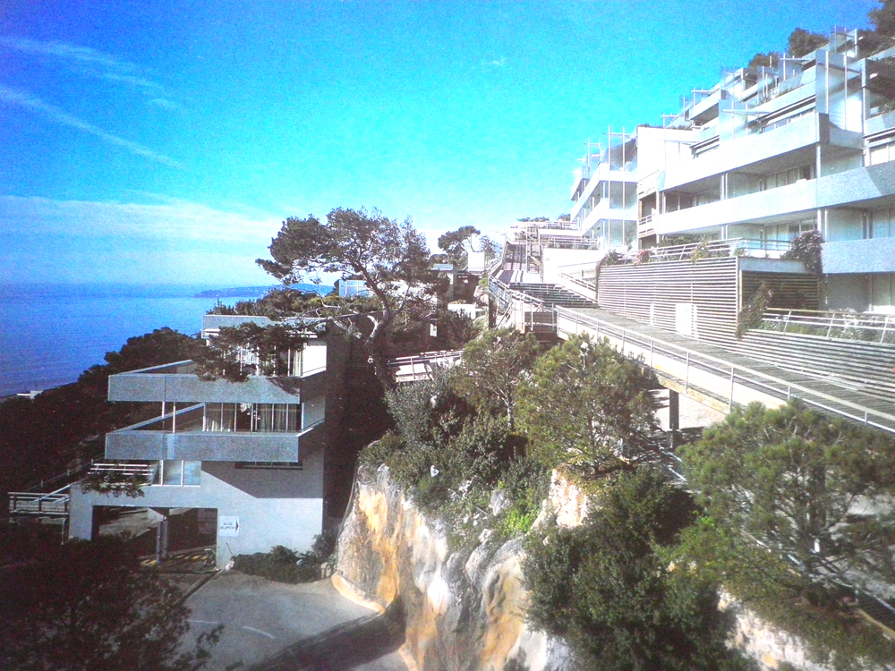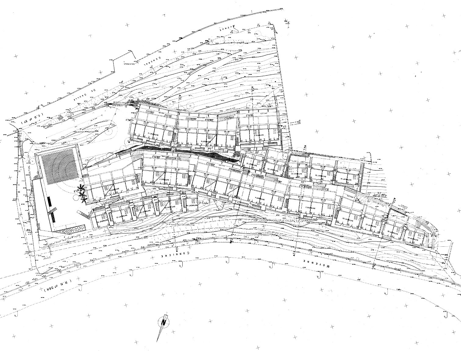 Seen from the inside, the architecture of the garages hollowed out of the rock, lit by long horizontal slits, is crypt-like. Yet with the CinemaScope view of the landscape from each apartment, it is panoramic. It seeks to be restful, serene, and immutable in the simplicity of its contours and the harmony of its materials – polished marble stone, which, whether in shadow or sunlight, calls out to be touched. The thickness of the medium, the freshness related to its mass and to the depth of space create an impression of architecture engraved in the rock, a recollection, an awareness of what architecture has always been: a shelter, a strategic place from which to face time and the elements.