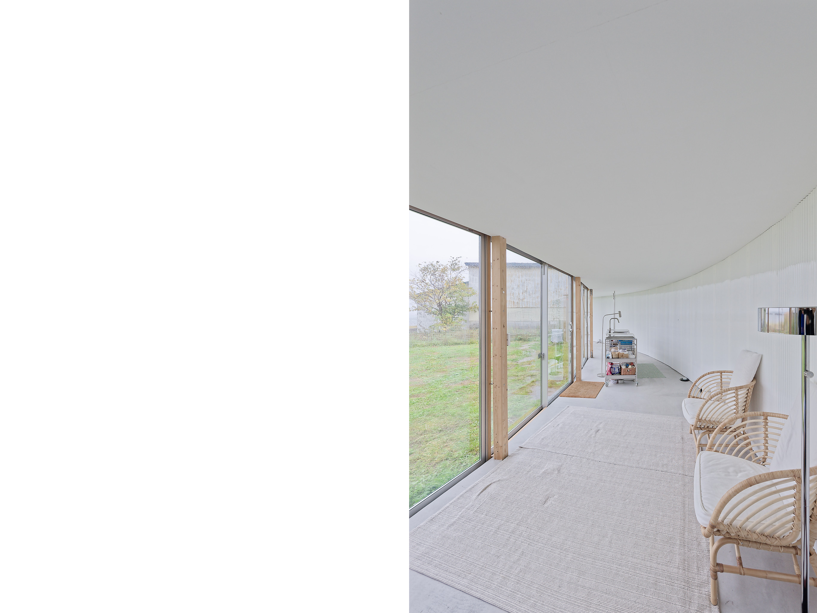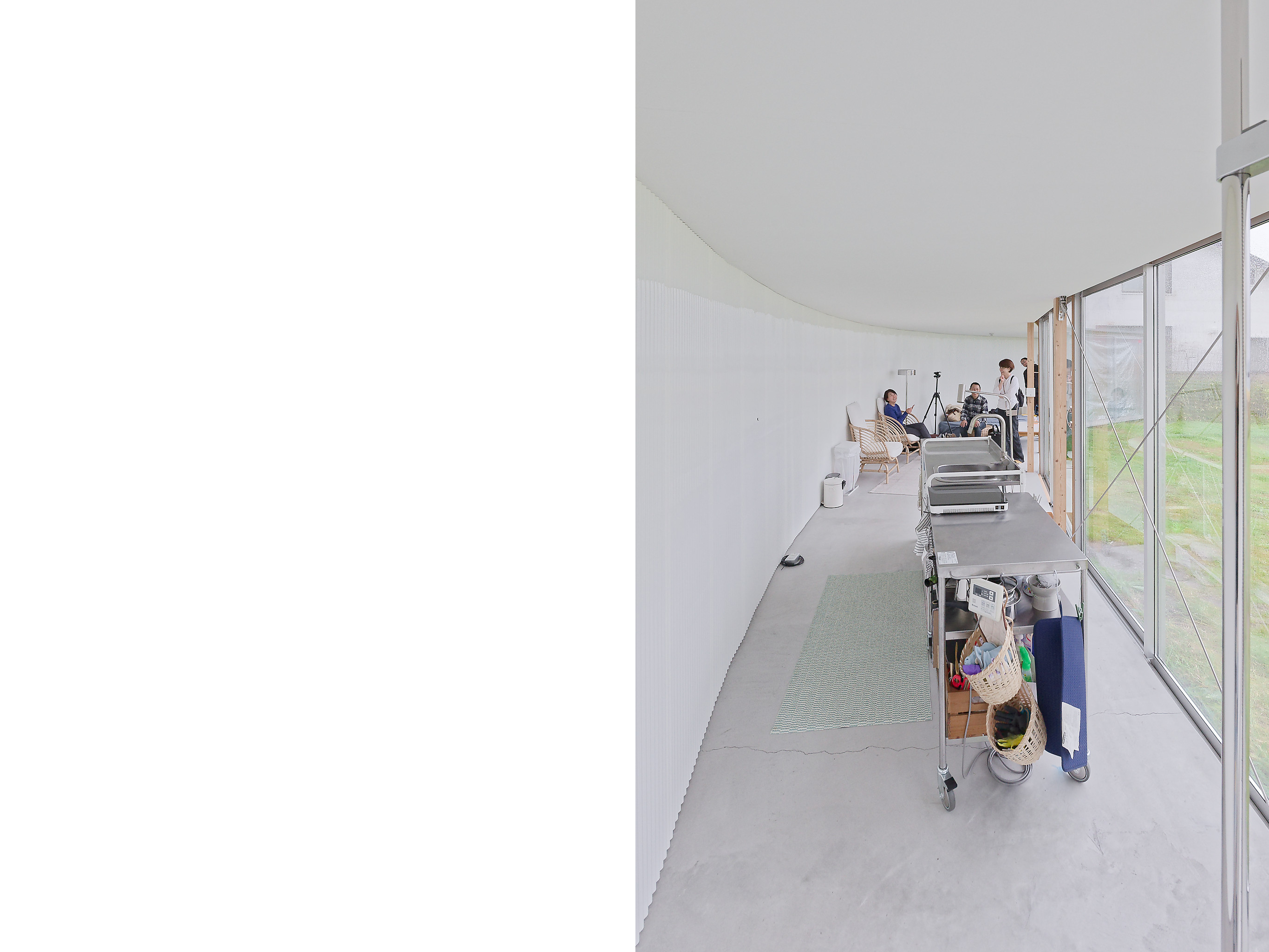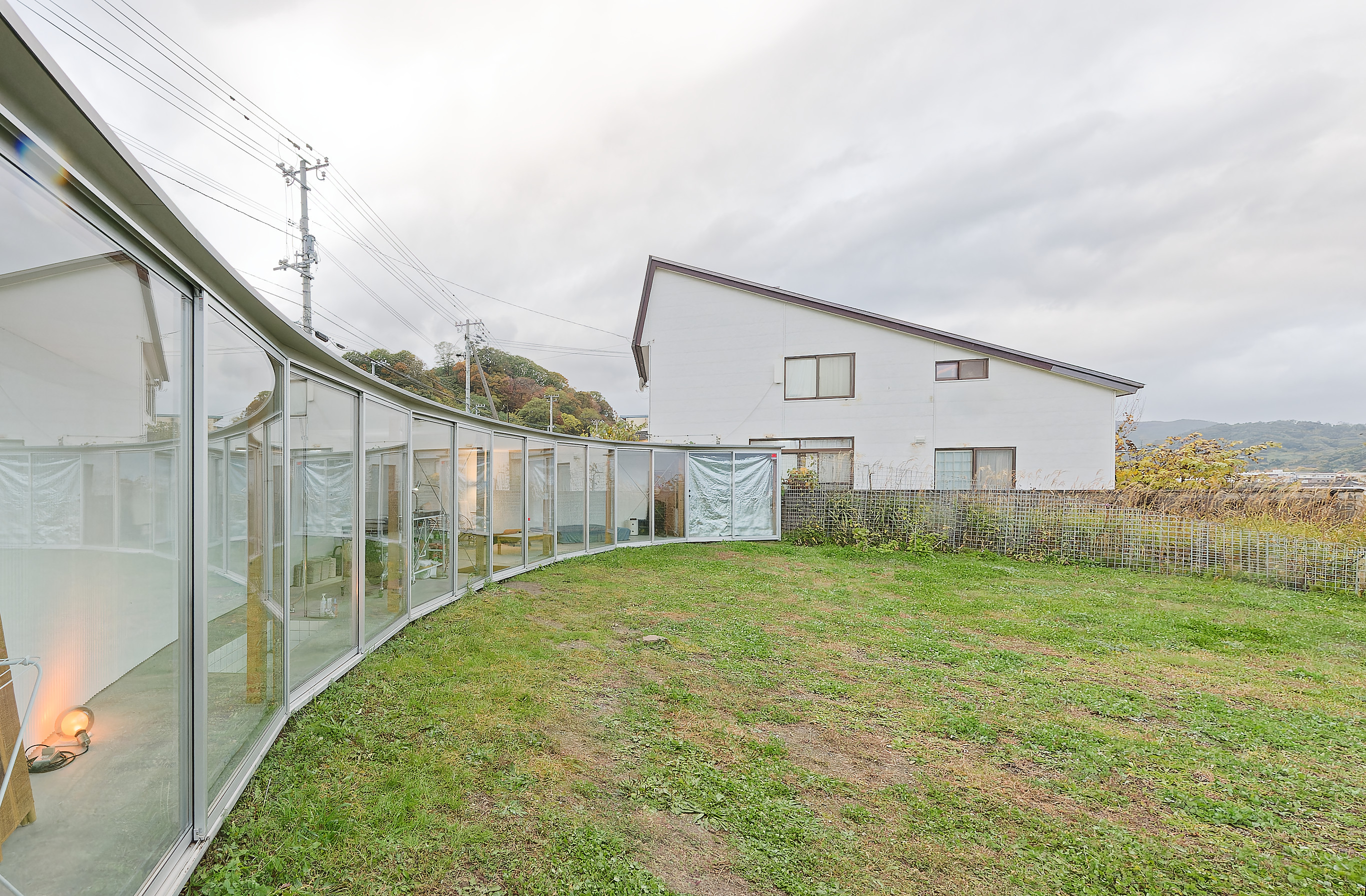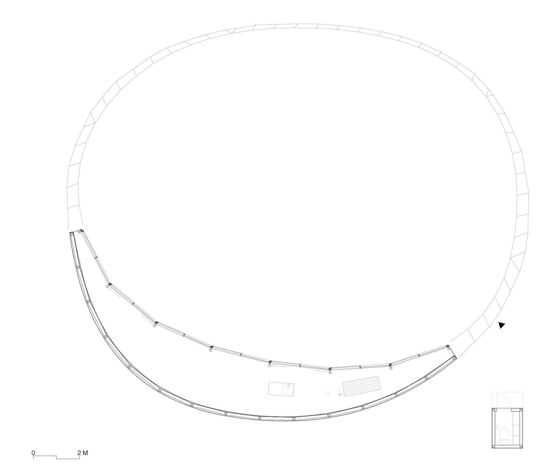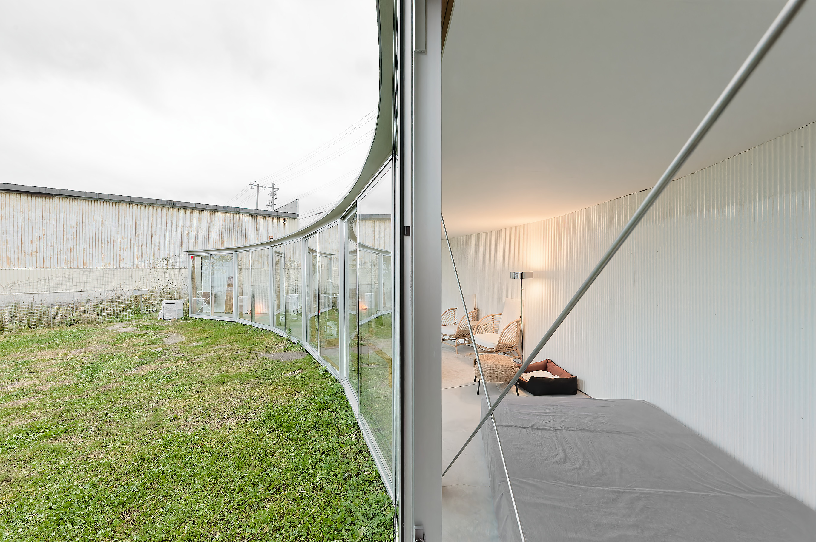 The plan is composed of two ellipses. First, a large ellipse forms the living space. Then, a slightly smaller ellipse, which serves as the dog run, overlaps the first. The crescent-shaped space between the two ellipses becomes the interior area. There are no openings on the exterior wall facing the highway, while the inner side, facing the ocean, consists entirely of sliding windows. The crescent’s tapered end transitions from solid walls to welded wire mesh fences, forming the dog run.