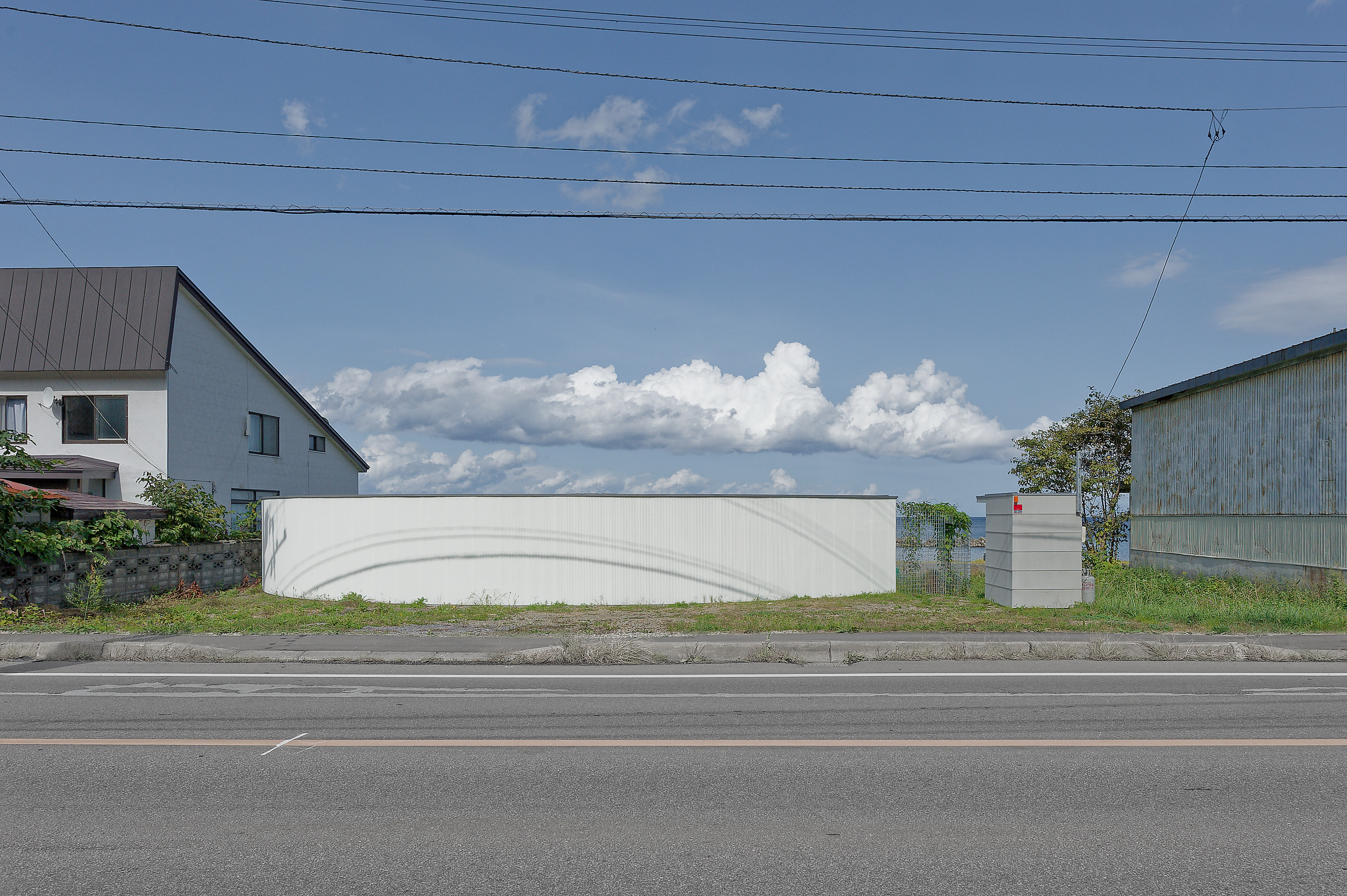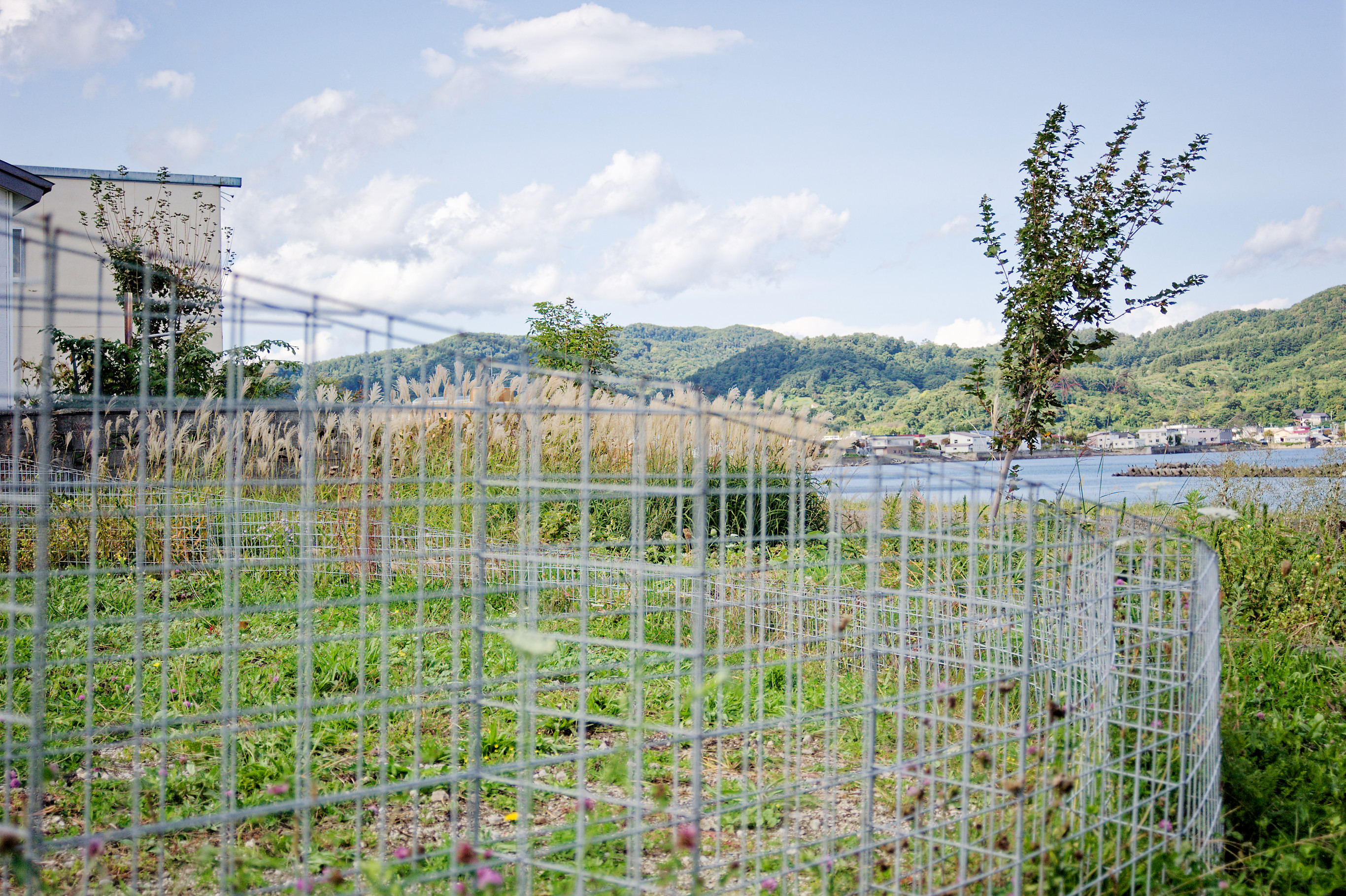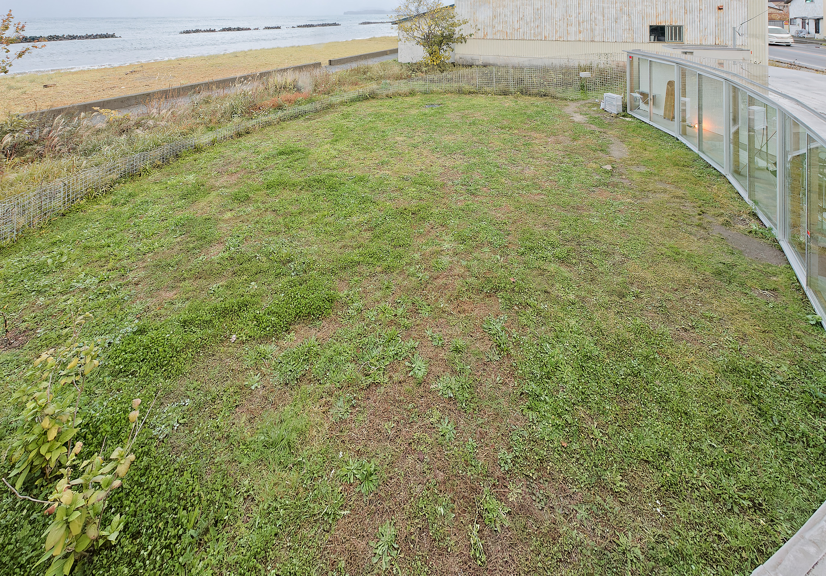 The fence starts at 2.3 meters in height, matching the eave of the main house, and gradually lowers towards the ocean, reaching a height of 350 millimeters at its center. This is sufficient to contain a timid small dog, while humans can easily step over it to access the ocean. The wire mesh is buried 400 millimeters into the ground, allowing it to stand independently. The 4mm-diameter, lightweight, and loosely welded wire mesh deflects strong coastal winds and is minimally susceptible to seismic forces and snow loads.