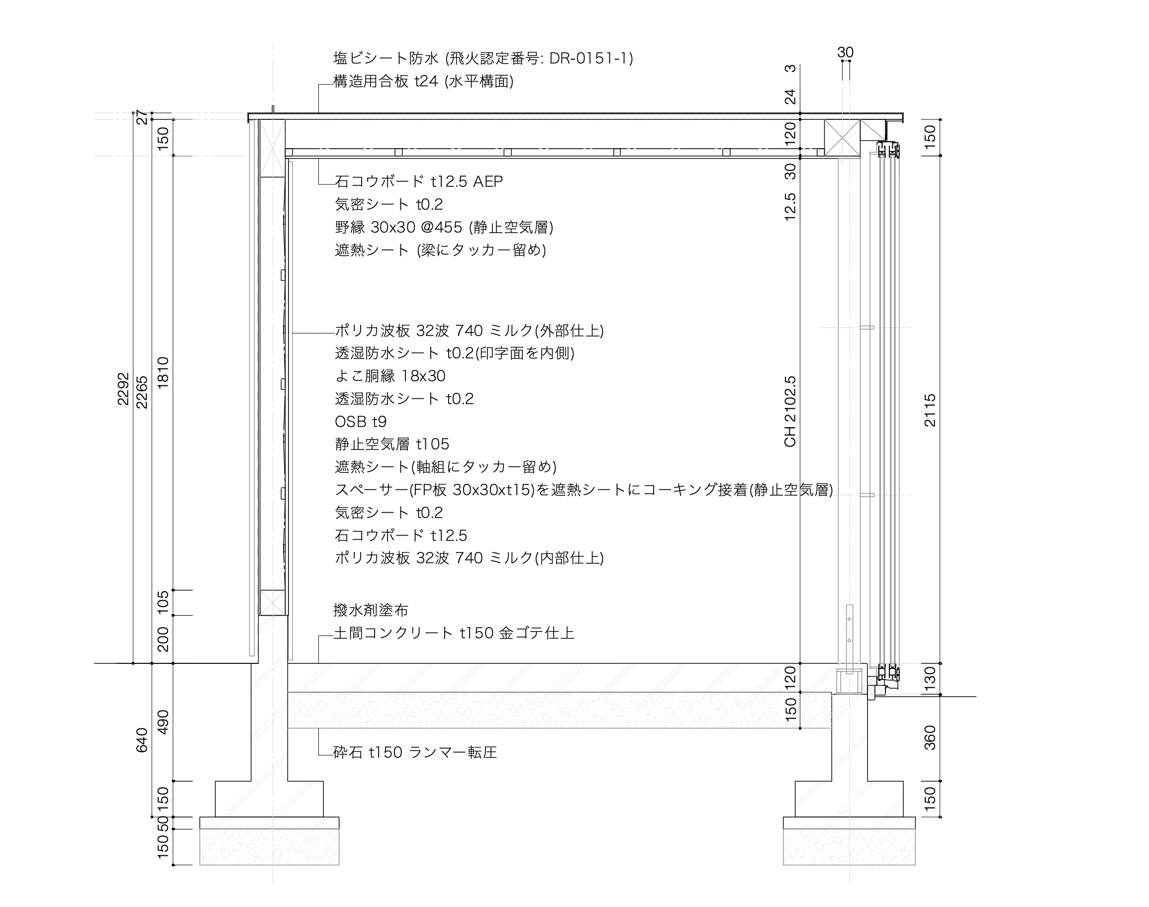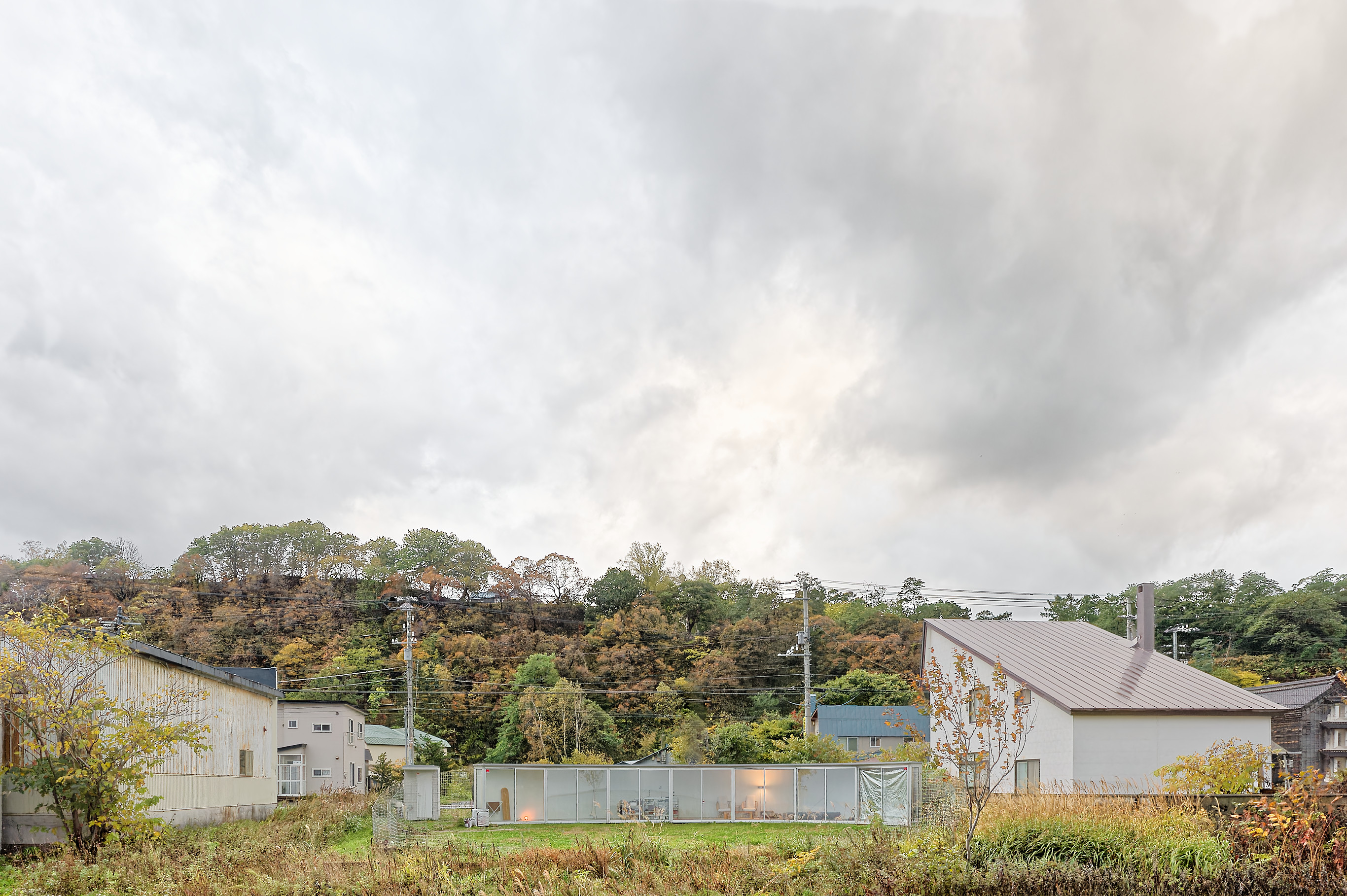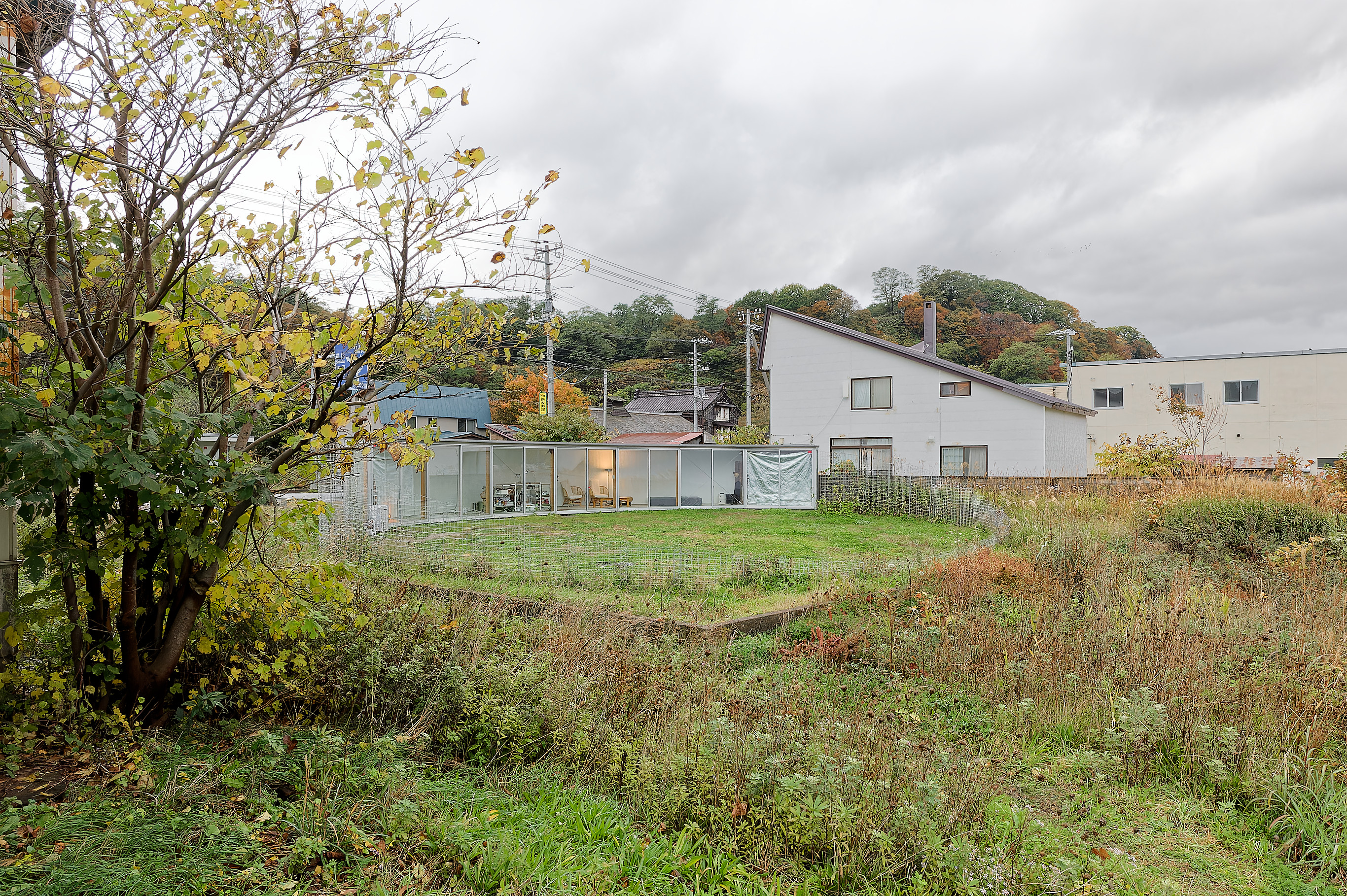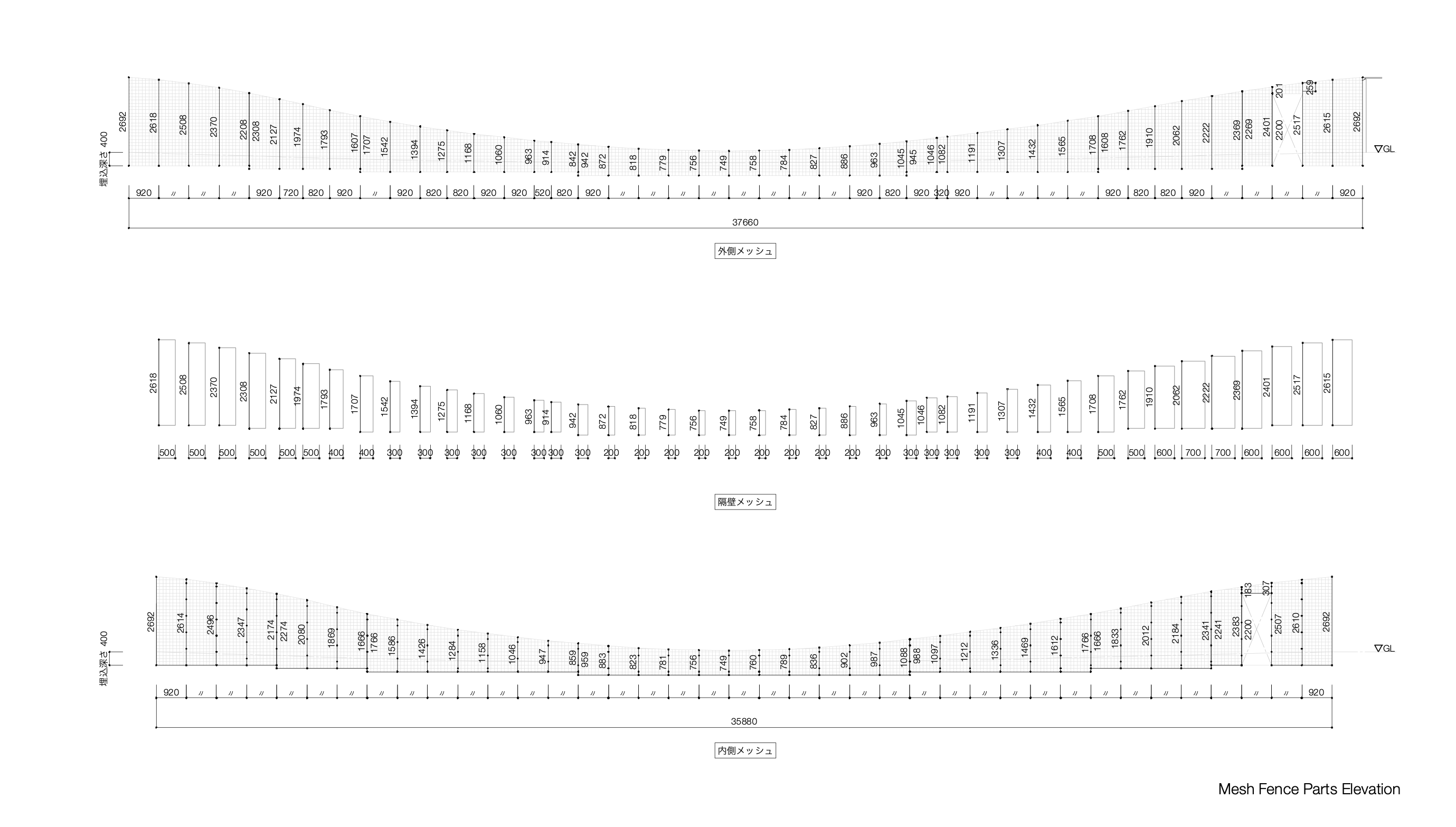 The fence starts at 2.3 meters in height, matching the eave of the main house, and gradually lowers towards the ocean, reaching a height of 350 millimeters at its center. This is sufficient to contain a timid small dog, while humans can easily step over it to access the ocean. The wire mesh is buried 400 millimeters into the ground, allowing it to stand independently. The 4mm-diameter, lightweight, and loosely welded wire mesh deflects strong coastal winds and is minimally susceptible to seismic forces and snow loads.