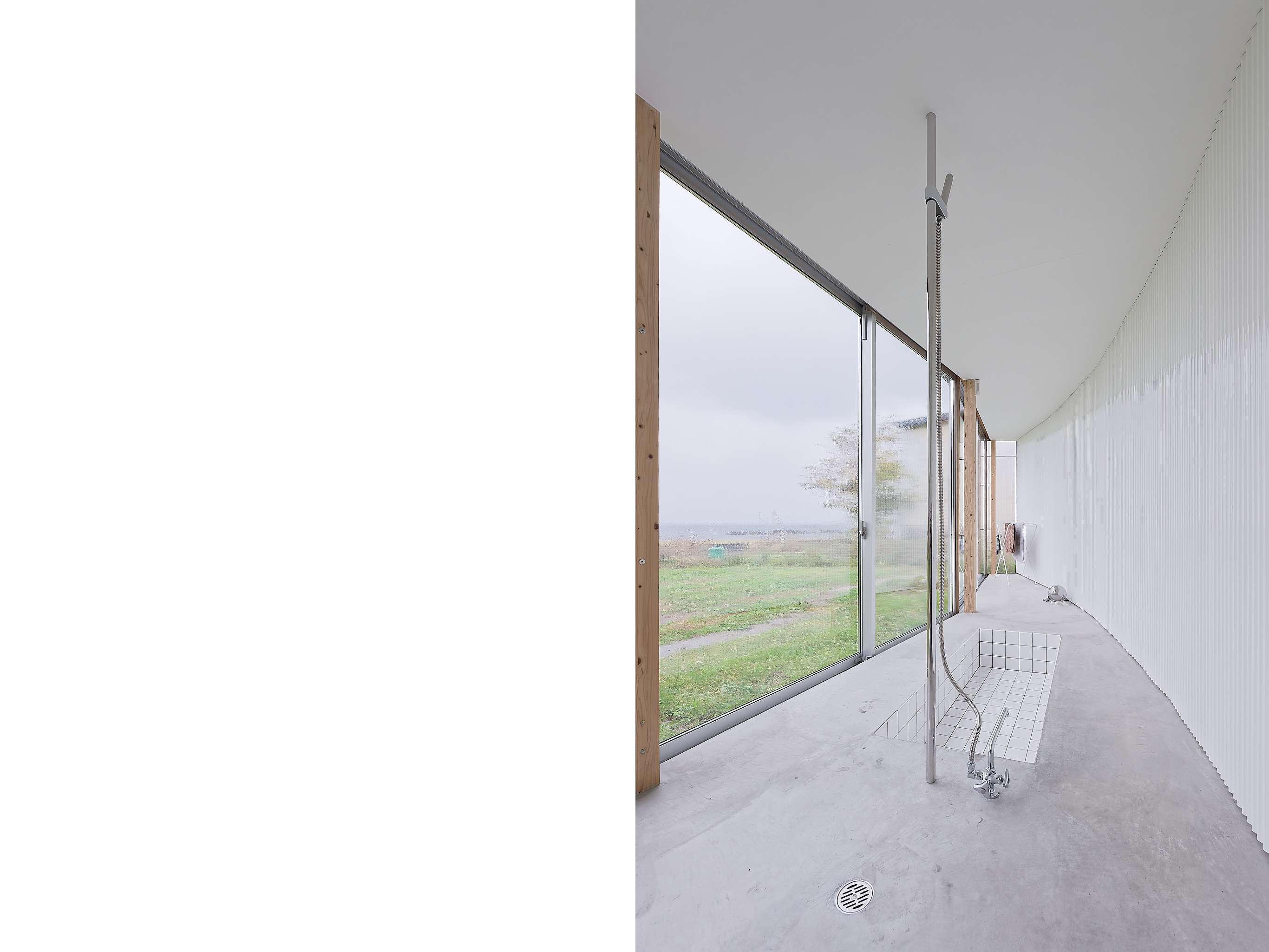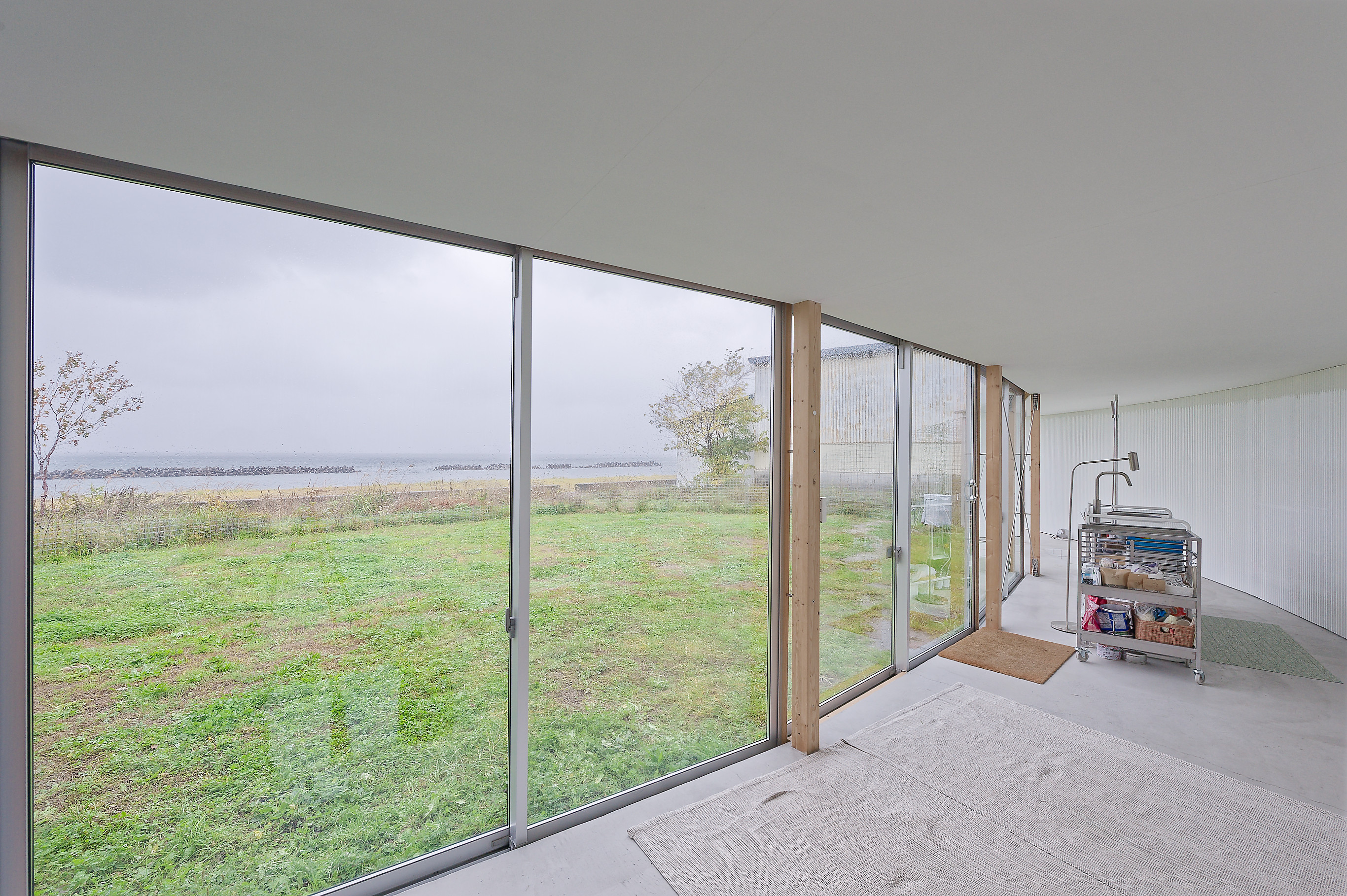 The structure of the main house is a traditional wooden framework. The lateral forces are resisted by the entire outer wall and two steel braces installed on the interior walls. The highly curved form eliminates the need for seismic elements in the short-span direction, allowing for a continuous interior space. The columns on the ocean-facing side are reduced to a minimum size of 90 millimeters square, with the end sections at 80 millimeters square.