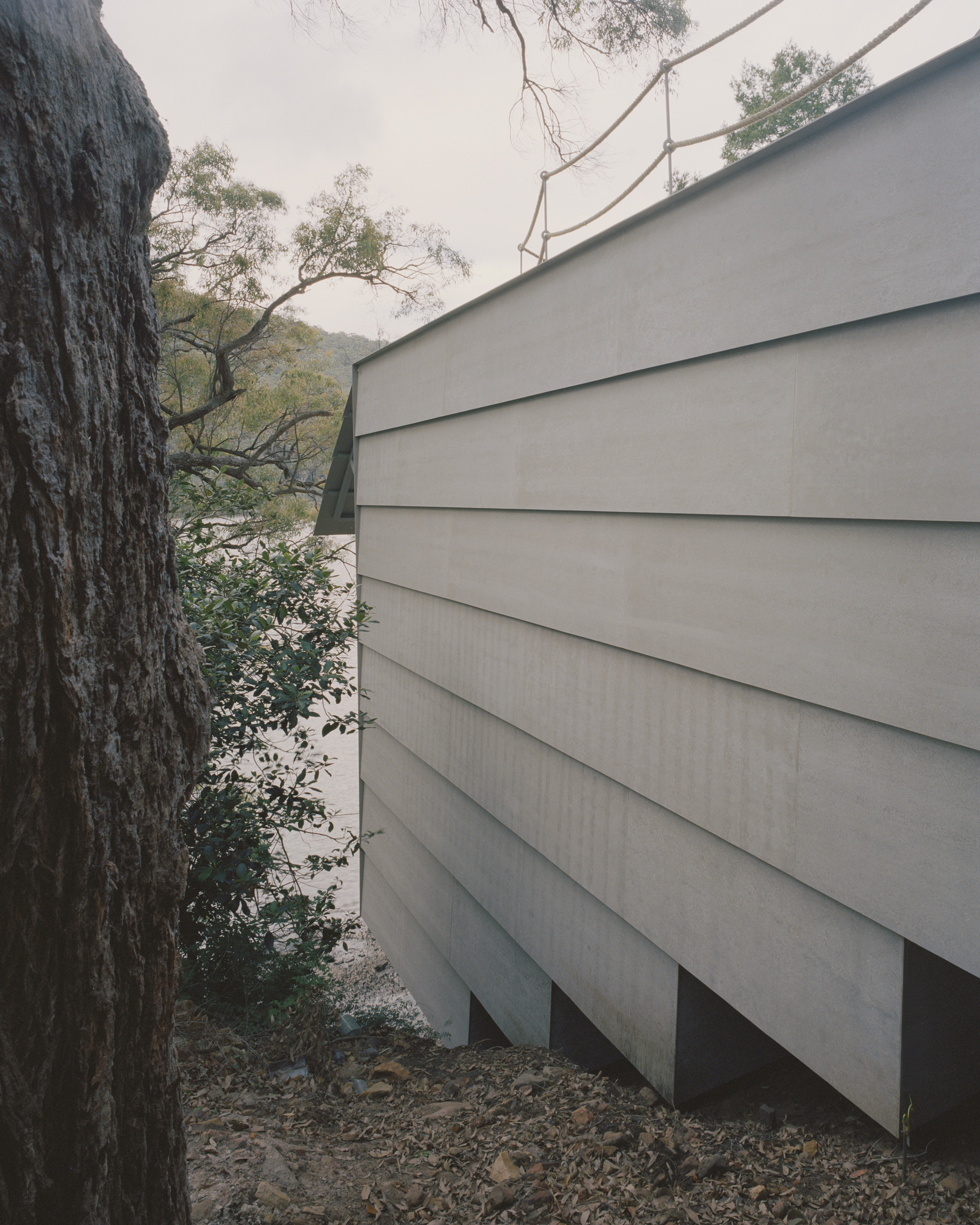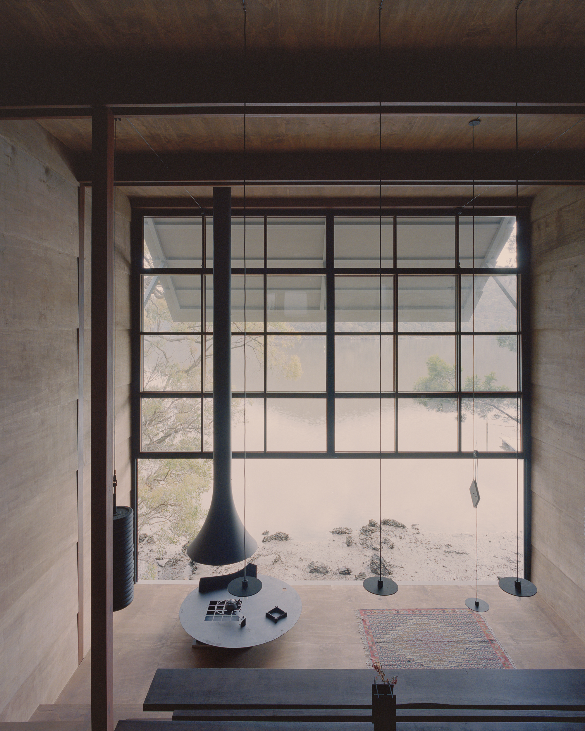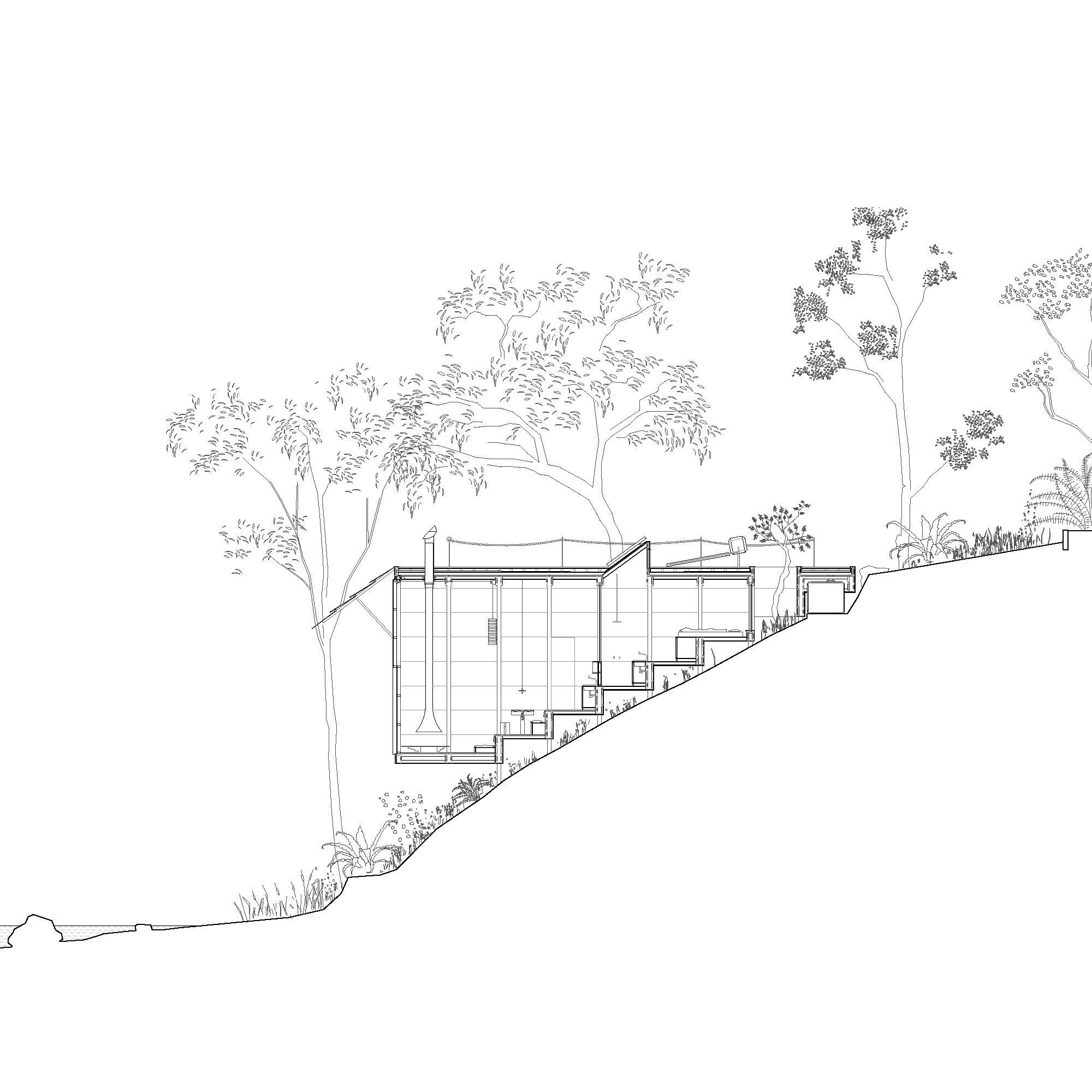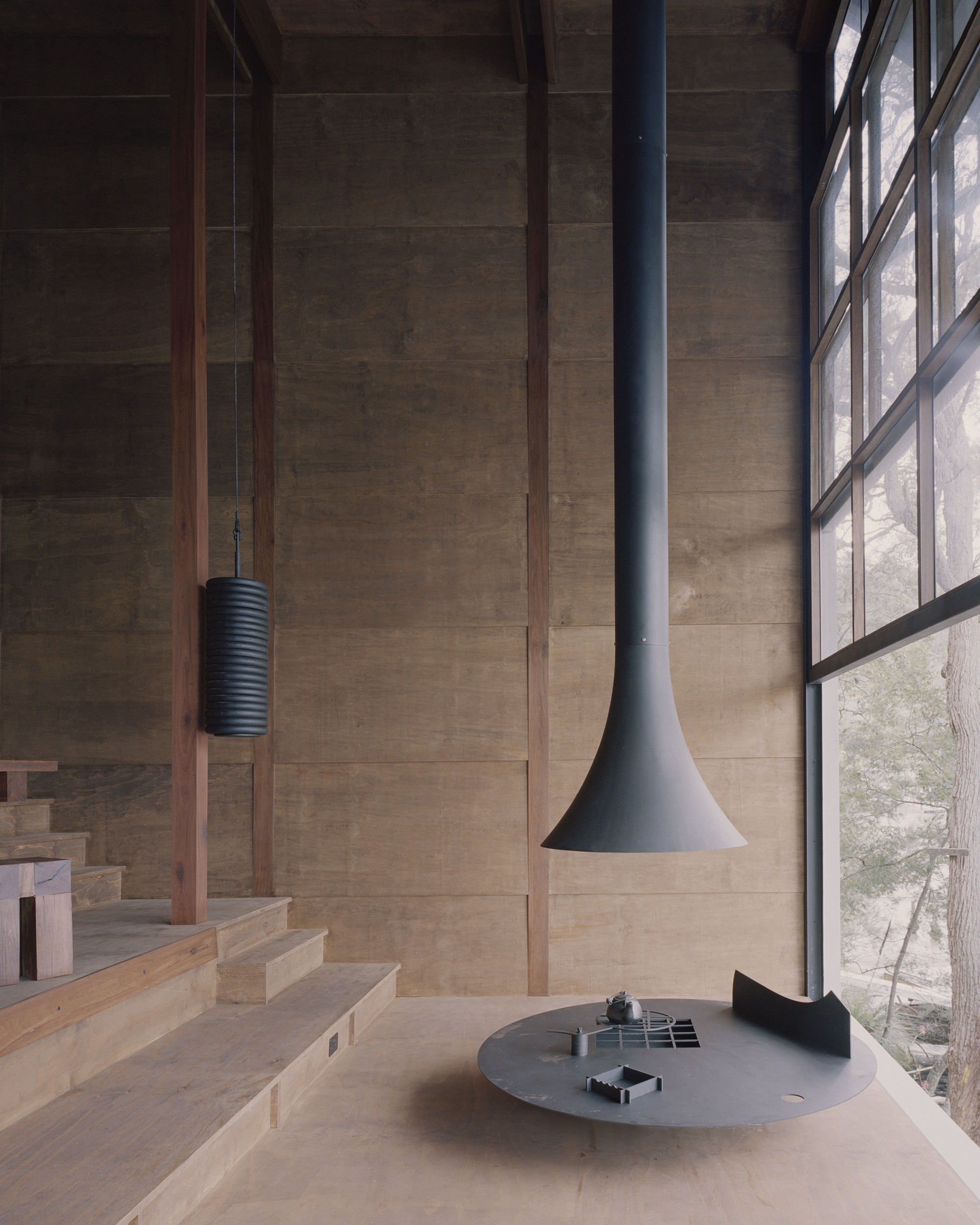 The stepped longitudinal section in conjunction with a tightly arranged structural grid acknowledge the steeply sloping site upon which the house is located. The interior of the dwelling is entirely focused on one single large north-facing window orientated towards the creek edge. The window is split in half and can be hoisted upwards using counter weights, allowing the landscape into the tranquil timber lined interior space. Two small rooms open to a patio protected from the wild nature surrounding the building. Above the house, the flat roof offers a large terrace in the tree canopy.