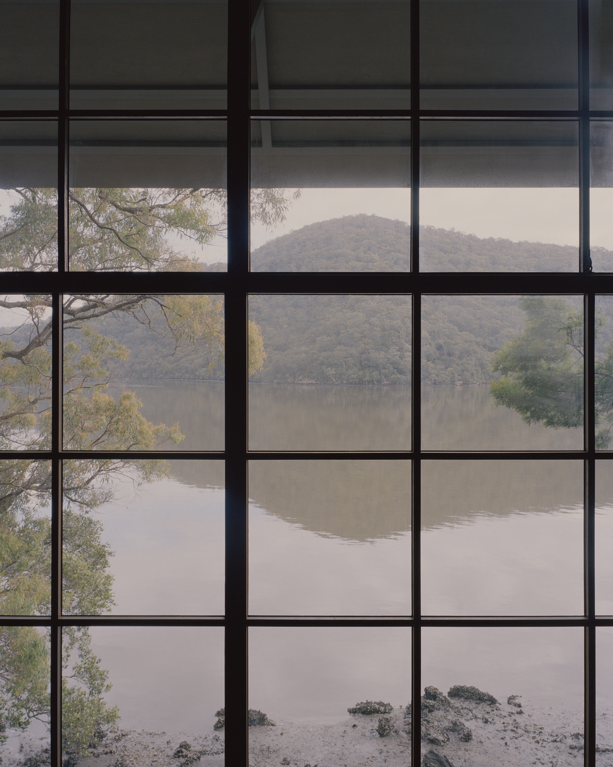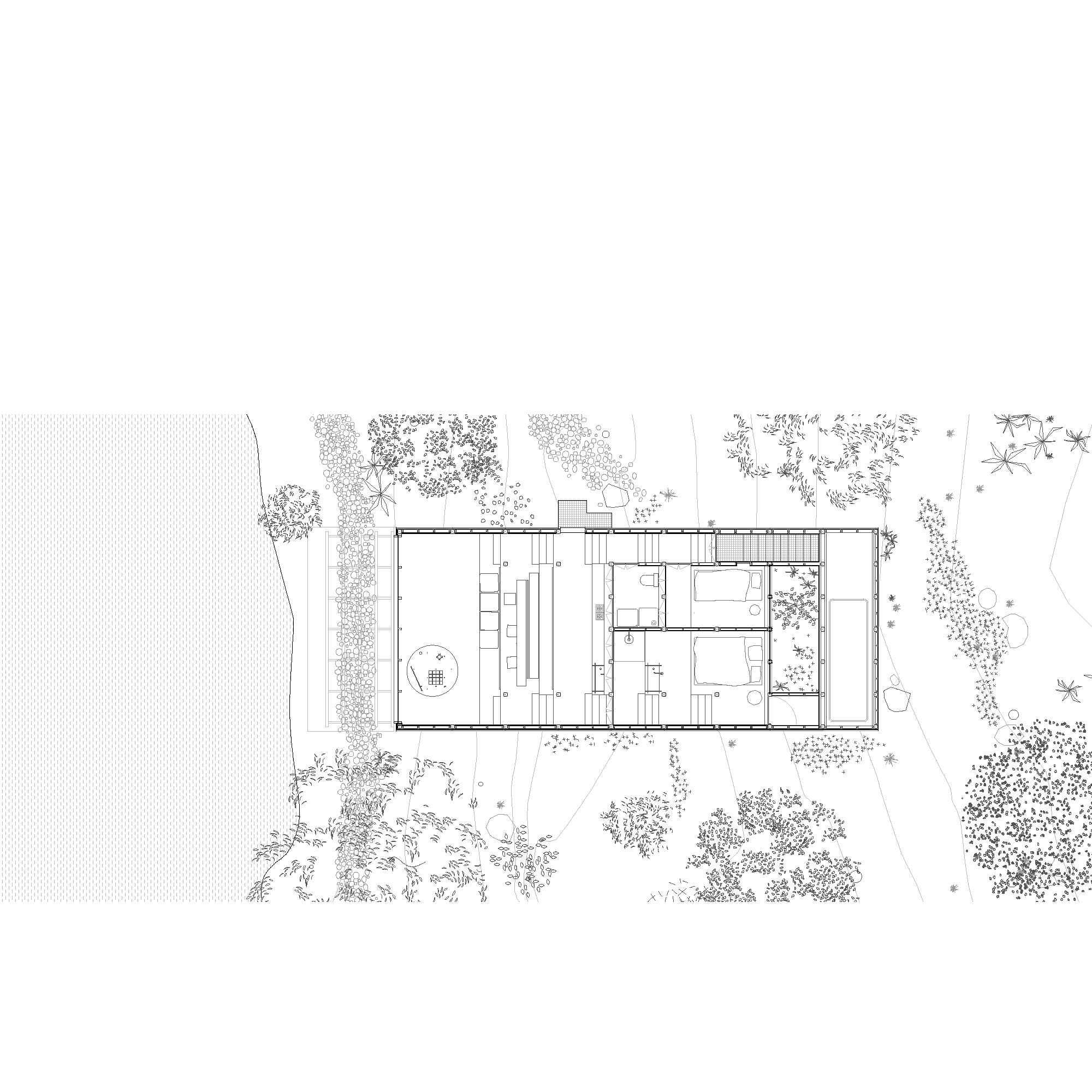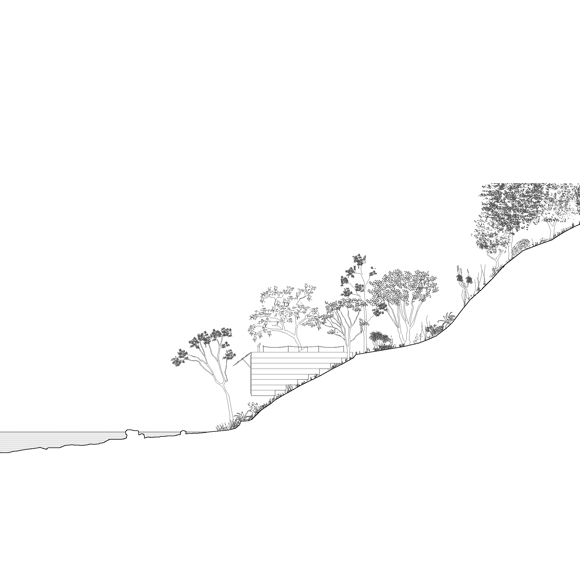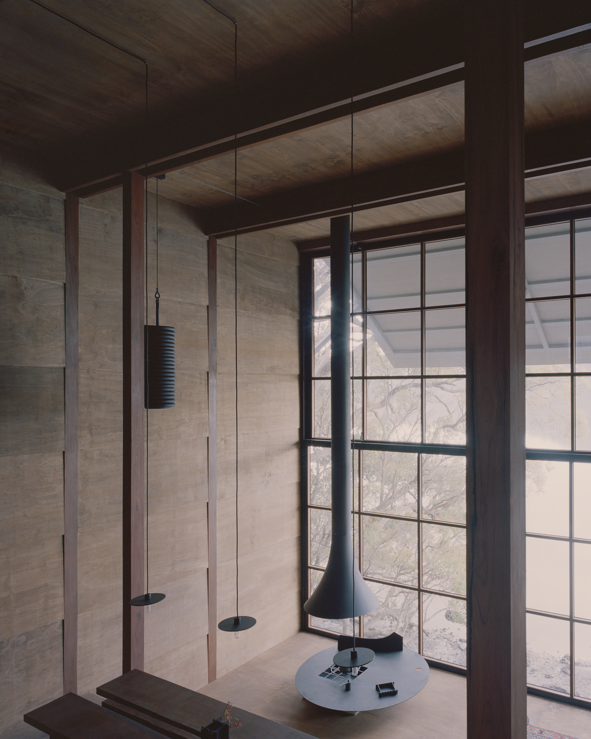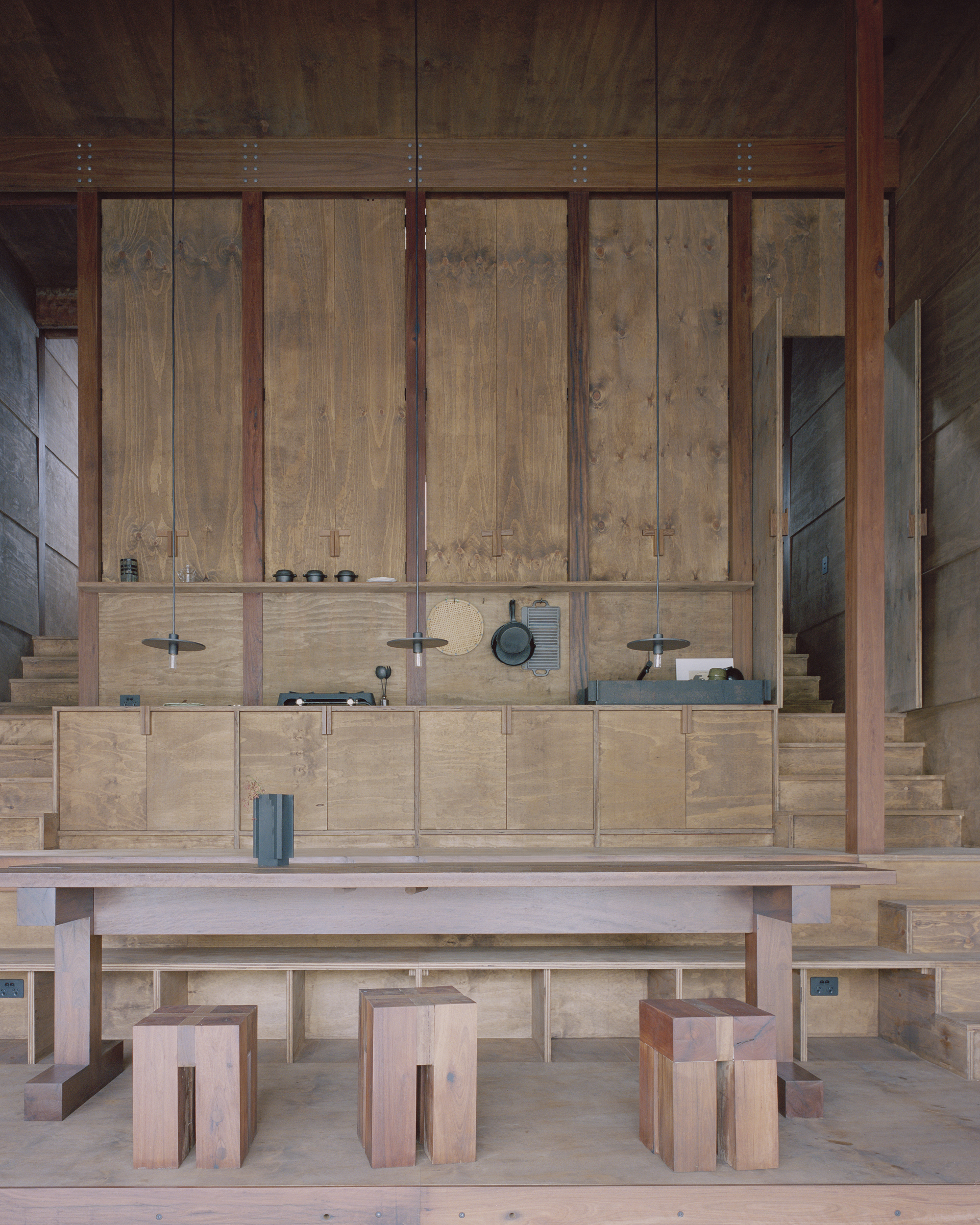 The stepped longitudinal section in conjunction with a tightly arranged structural grid acknowledge the steeply sloping site upon which the house is located. The interior of the dwelling is entirely focused on one single large north-facing window orientated towards the creek edge. The window is split in half and can be hoisted upwards using counter weights, allowing the landscape into the tranquil timber lined interior space. Two small rooms open to a patio protected from the wild nature surrounding the building. Above the house, the flat roof offers a large terrace in the tree canopy.