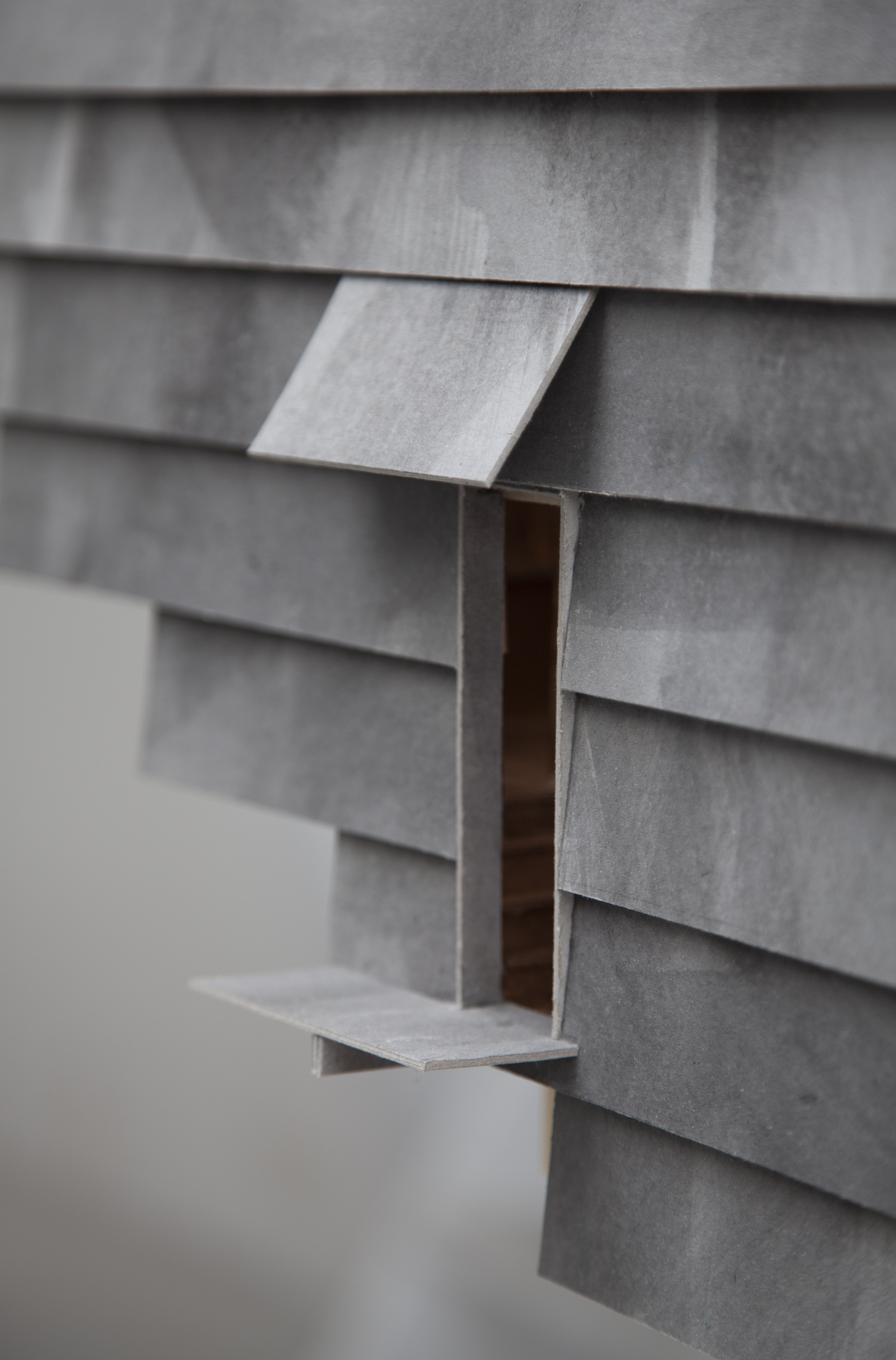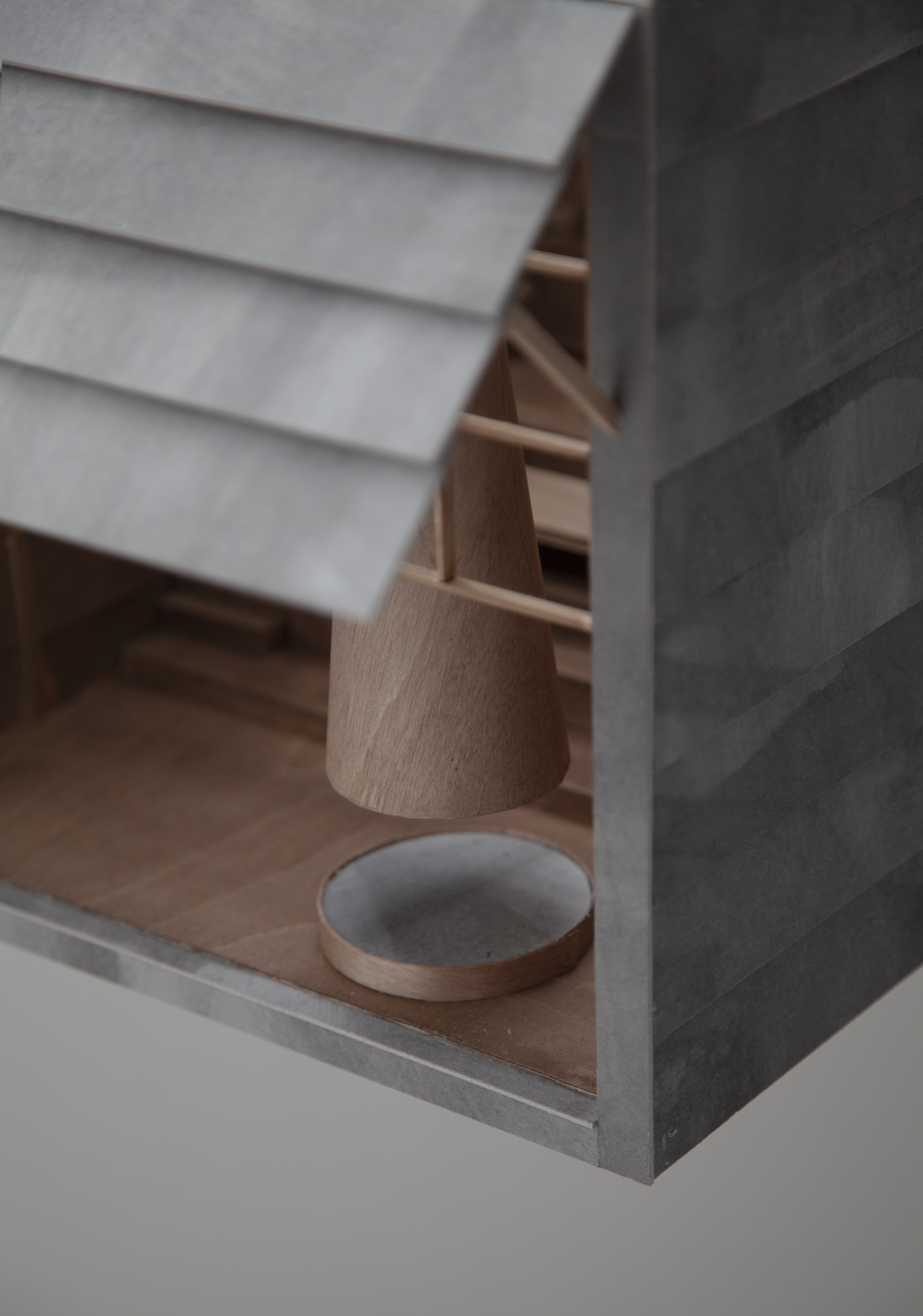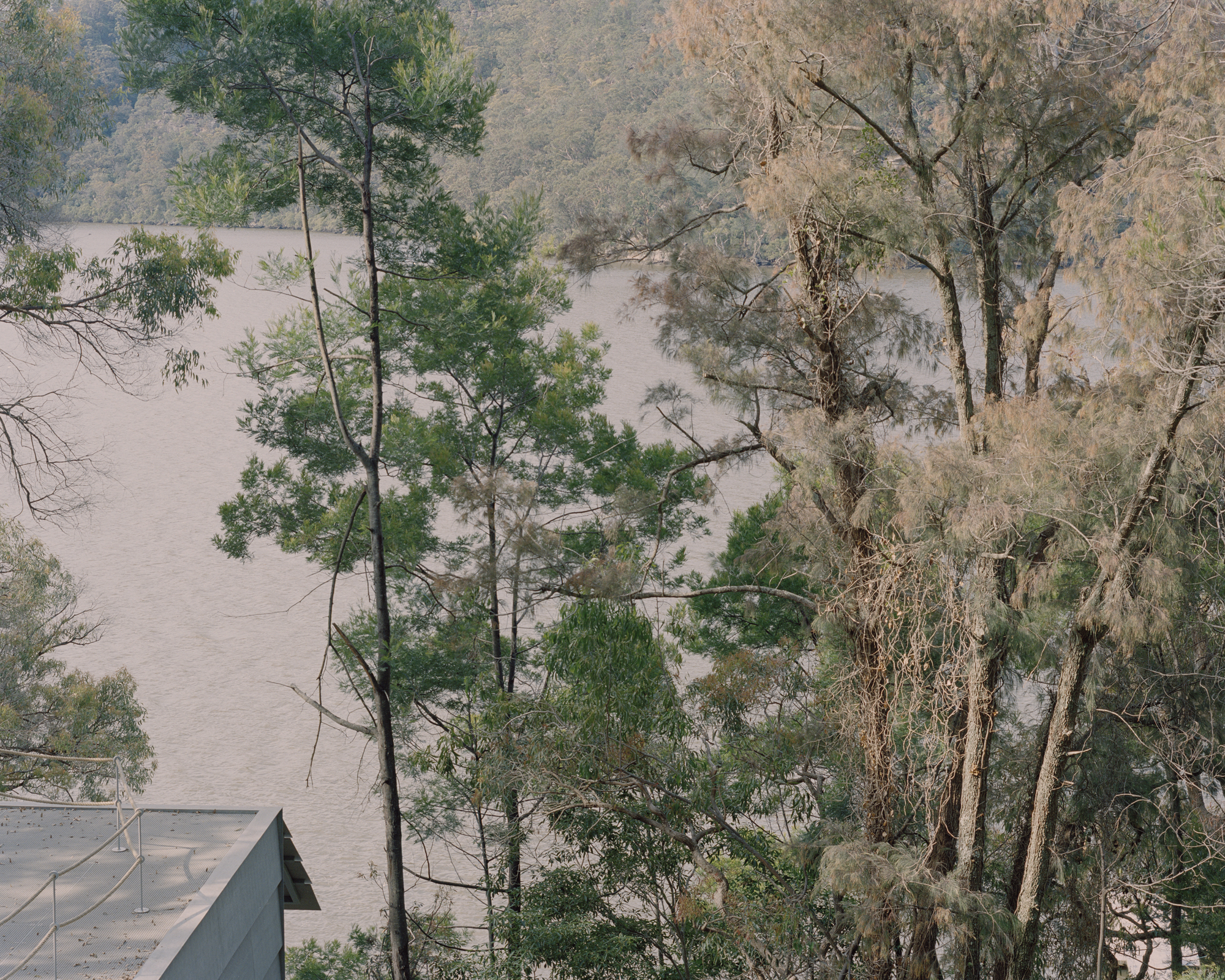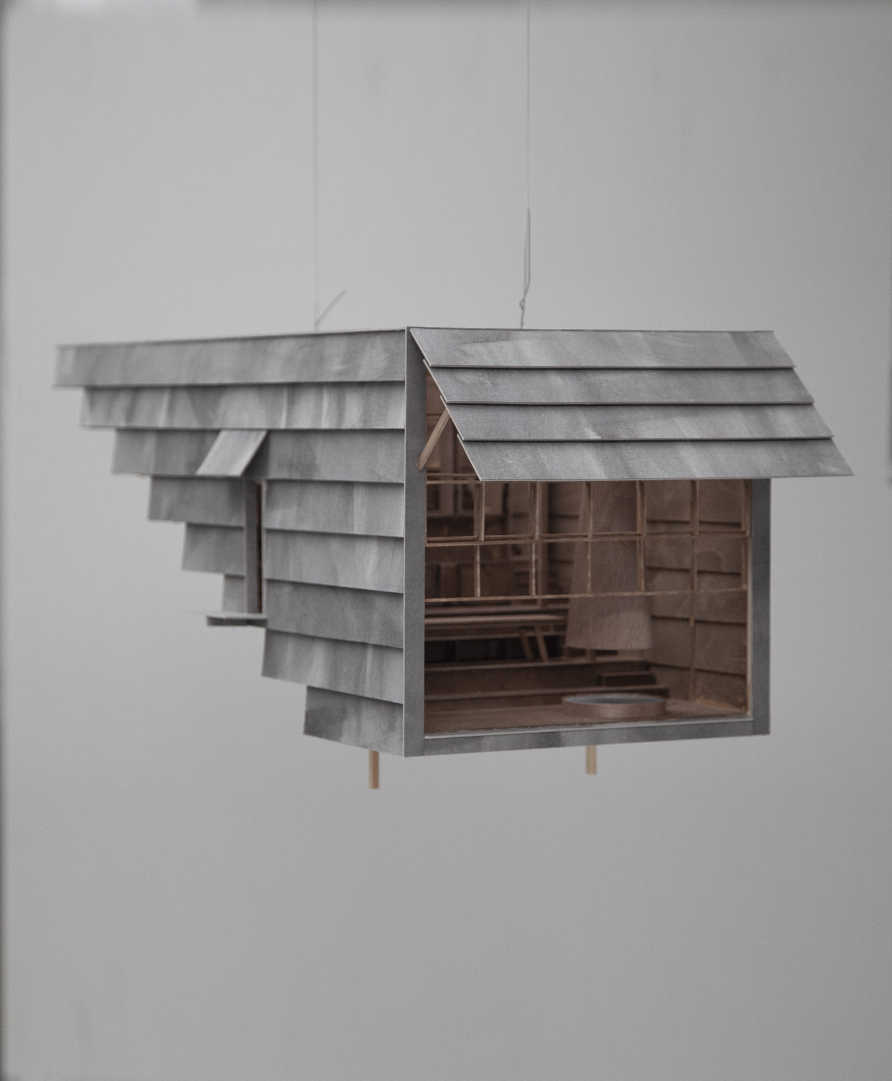 The stepped longitudinal section in conjunction with a tightly arranged structural grid acknowledge the steeply sloping site upon which the house is located. The interior of the dwelling is entirely focused on one single large north-facing window orientated towards the creek edge. The window is split in half and can be hoisted upwards using counter weights, allowing the landscape into the tranquil timber lined interior space. Two small rooms open to a patio protected from the wild nature surrounding the building. Above the house, the flat roof offers a large terrace in the tree canopy.