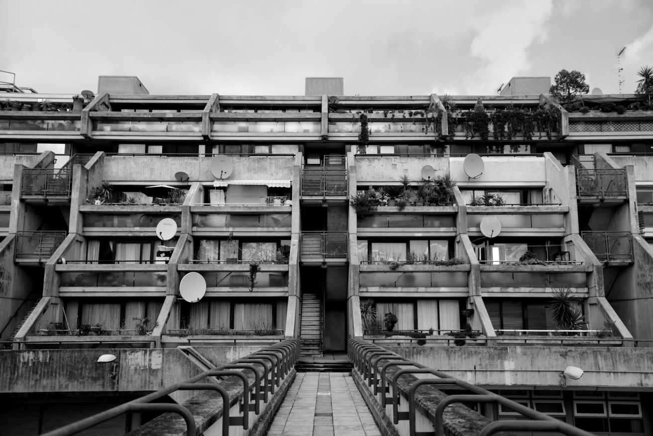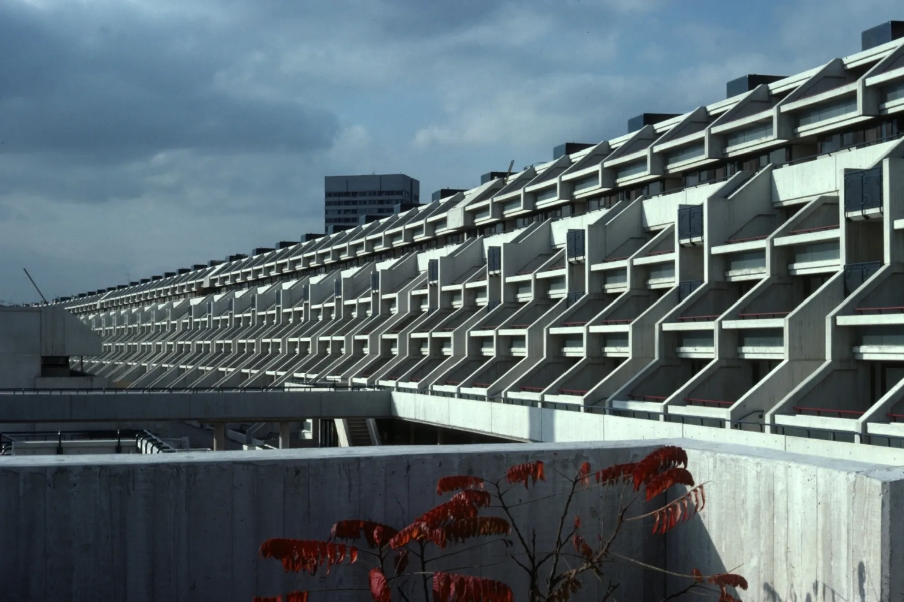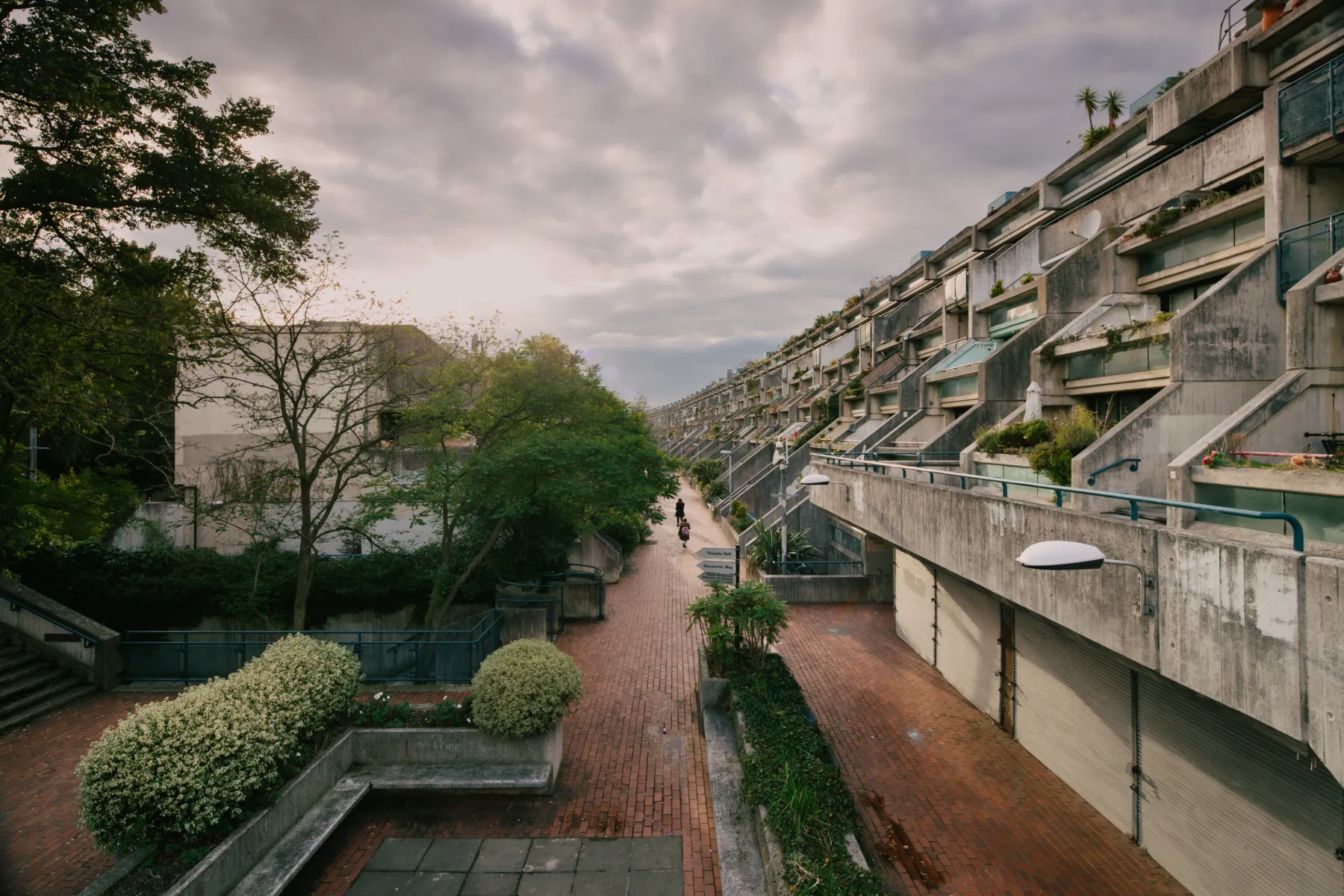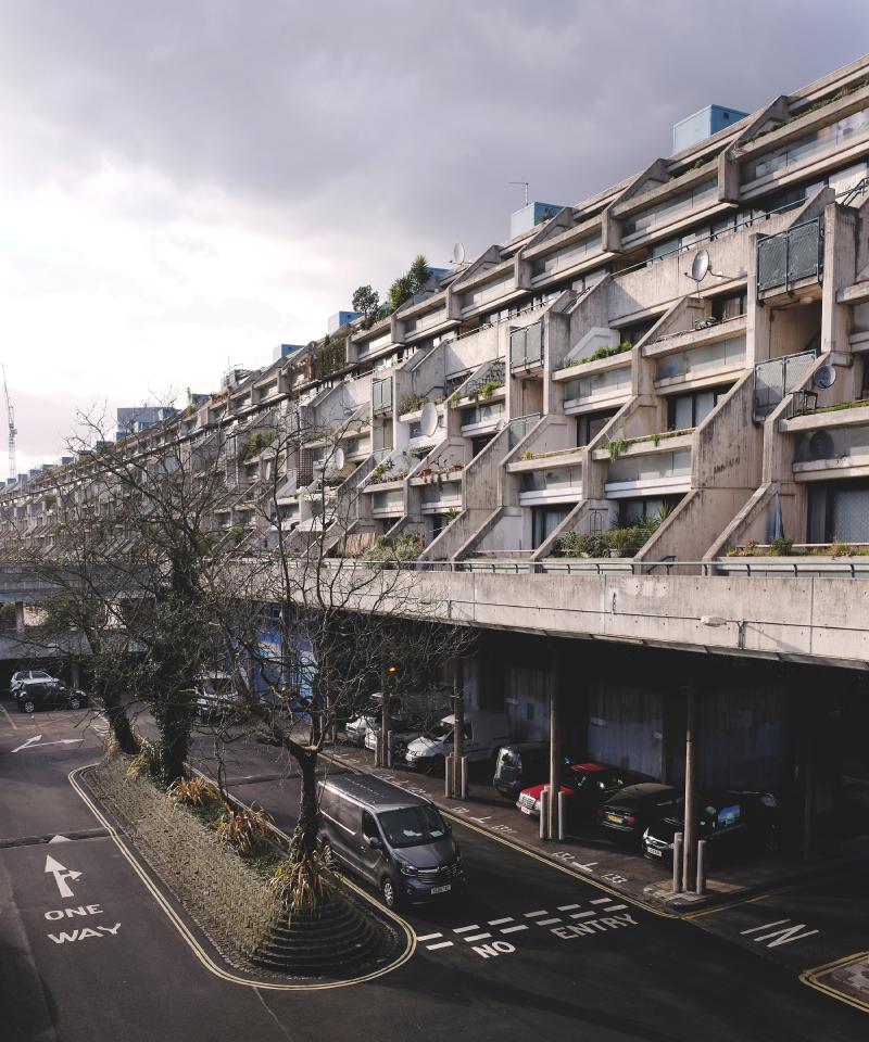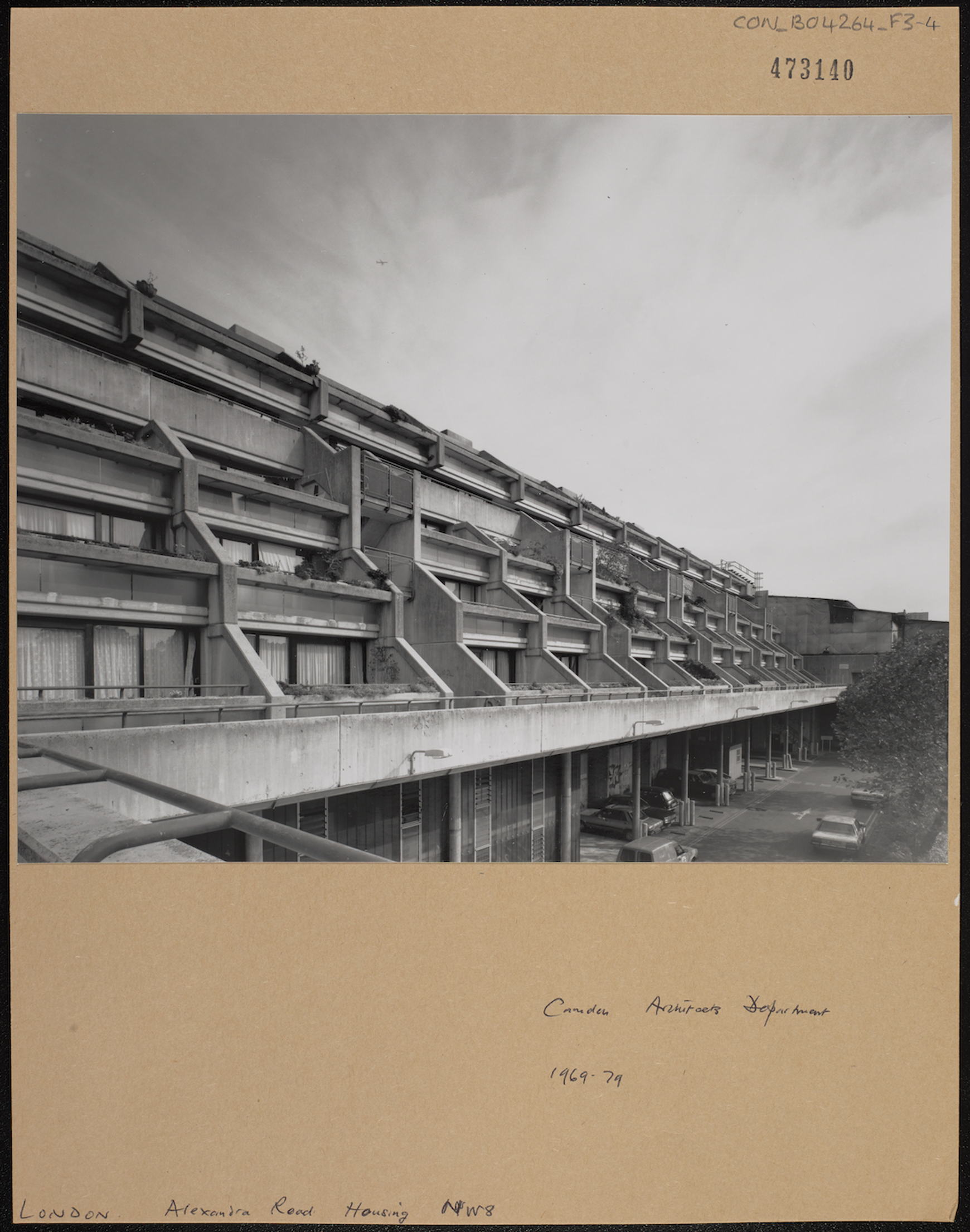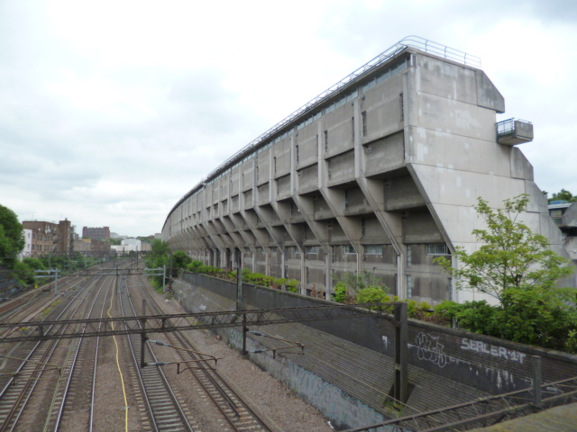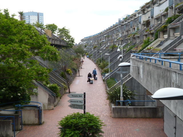 A community center that includes a school, reception center, maintenance facilities and the heating plant mark the entrance to the site from London Road to the west and open to the park areas. The lower buildings contain maisonettes with shared access, terraces, and gardens. Maisonettes also occupy the top two levels of the large slab with entrance from a continuous gallery at the 7th floor. The dwellings in the lower floors in this block are flats that are entered from open stairs serving two dwellings per floor. Parking is located beneath the building along the tracks. Alexandra road received much criticism during and after construction because of enormous cost overruns caused by the complicated construction, unforeseen foundation problems and inflation.