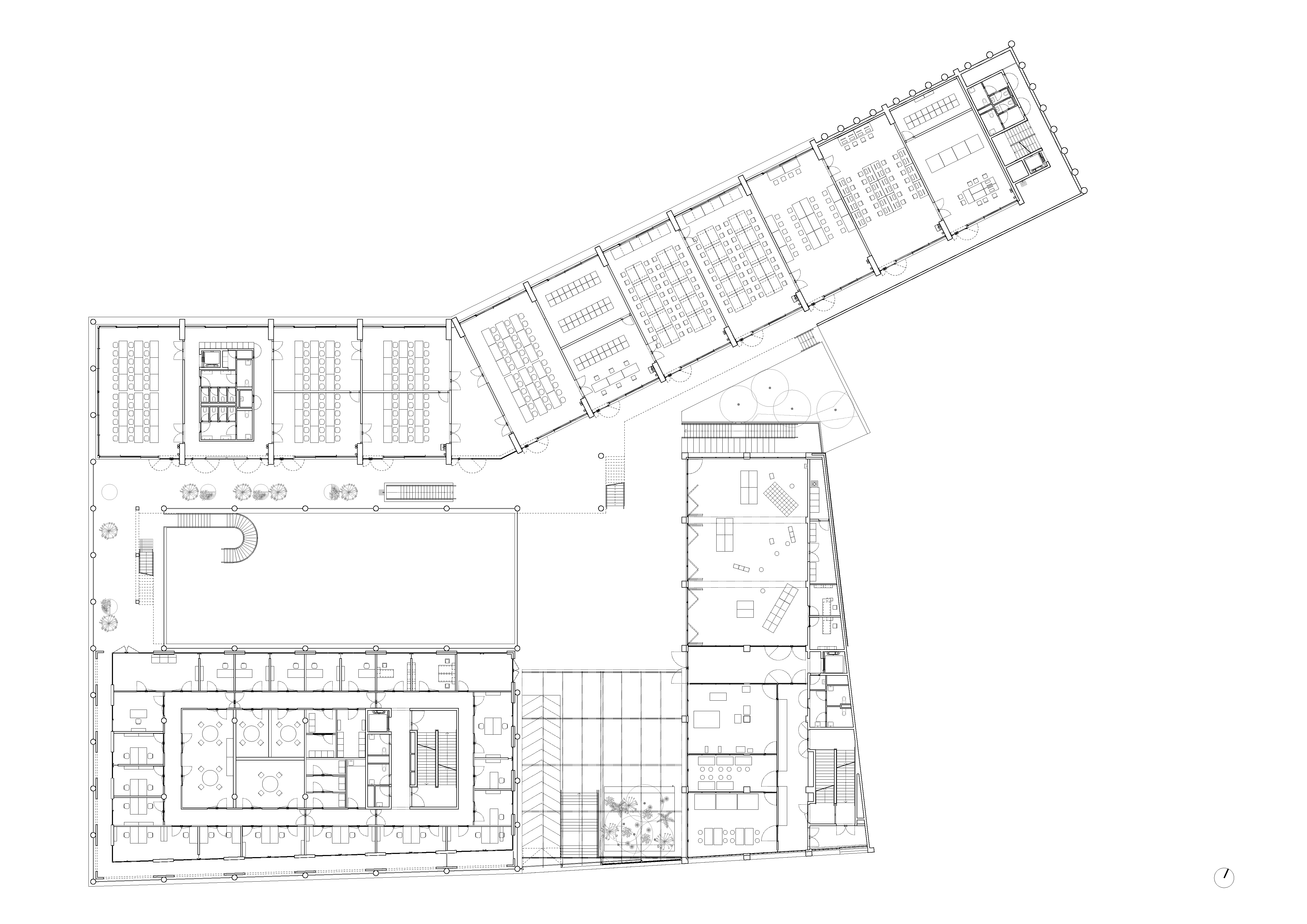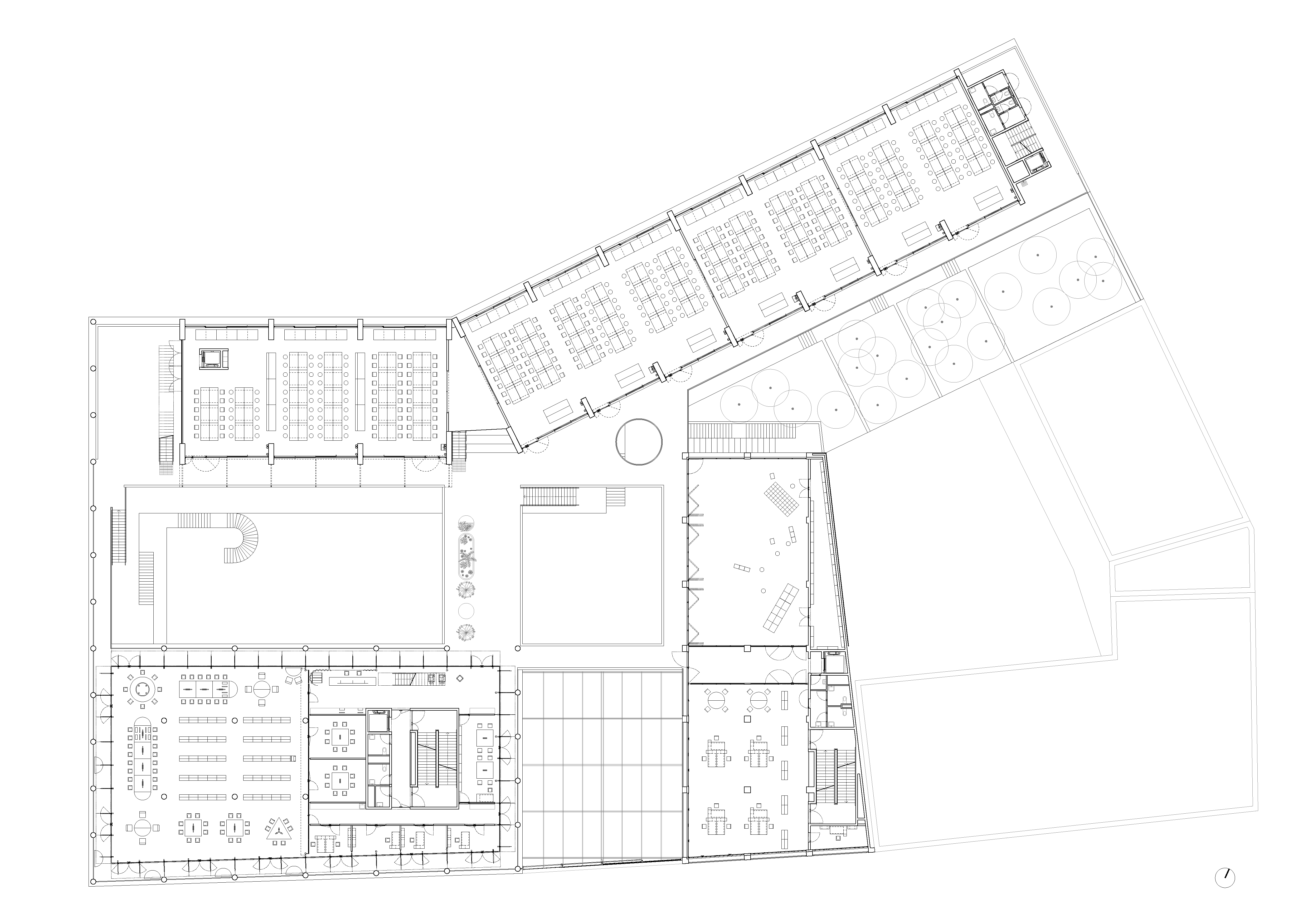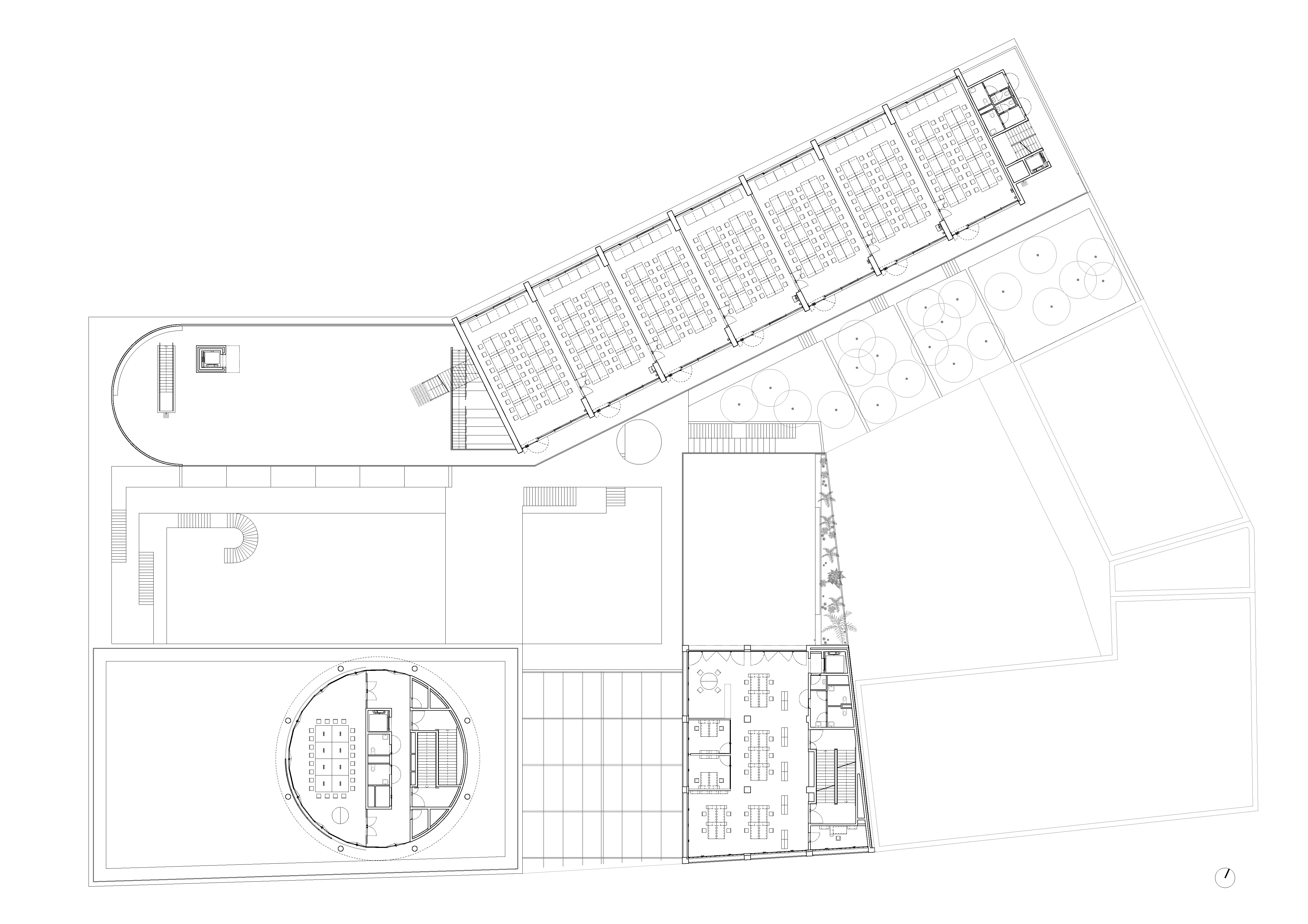 -The common center (forum, administrations, library, thesis room): It is the thickest building. It incorporates large spans in order to free up the supporting point platforms as much as possible to create generous (re)presentation spaces.