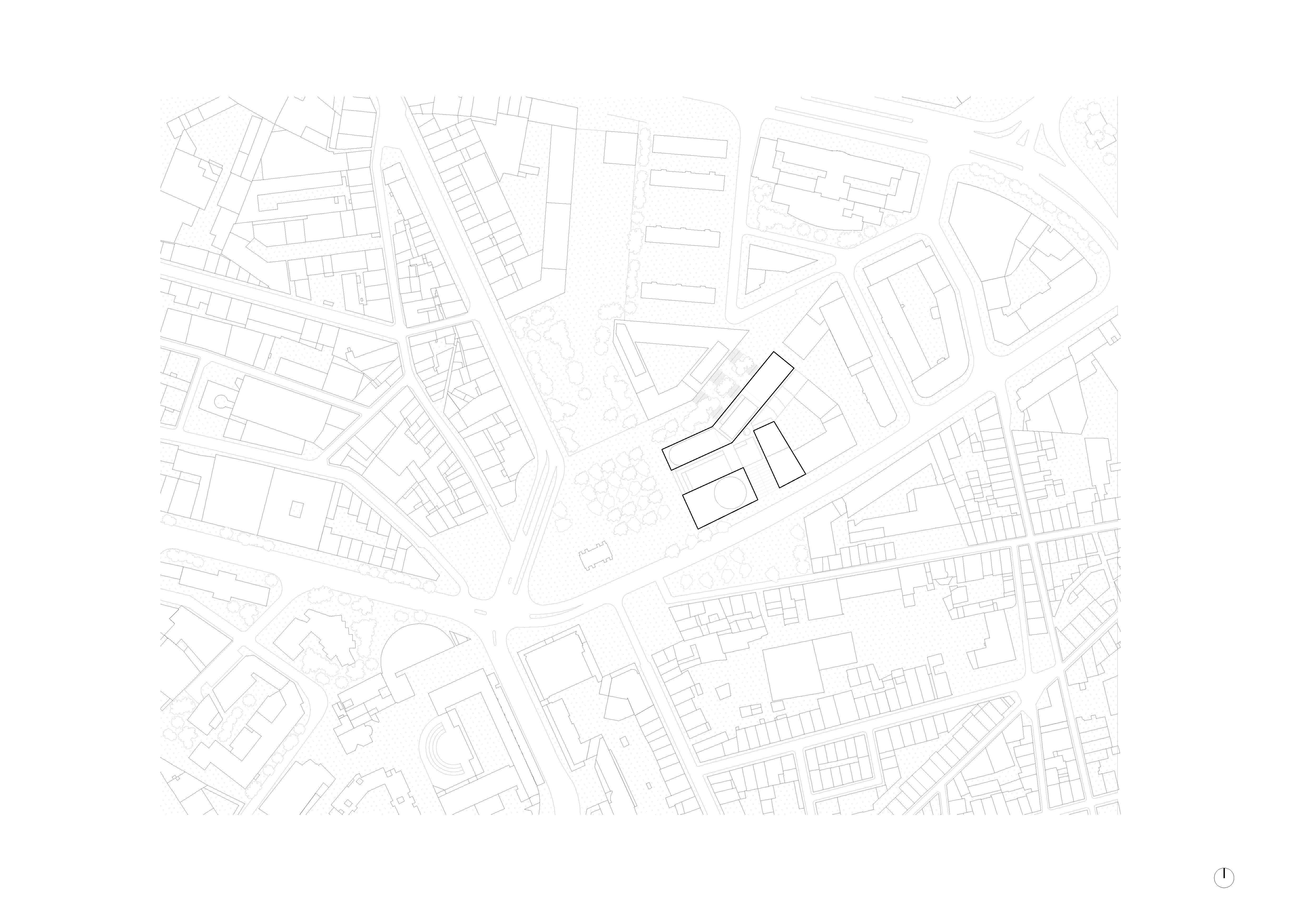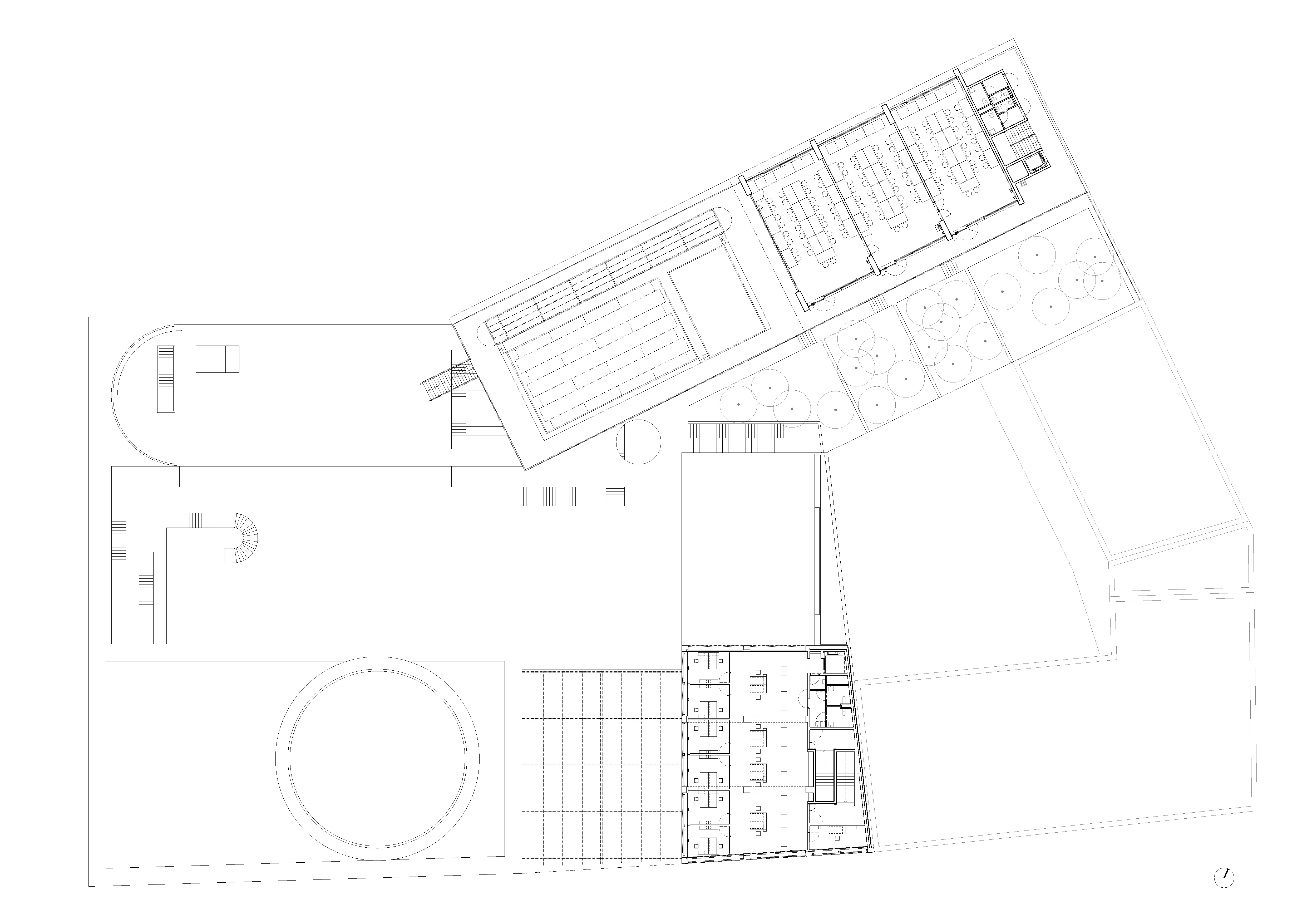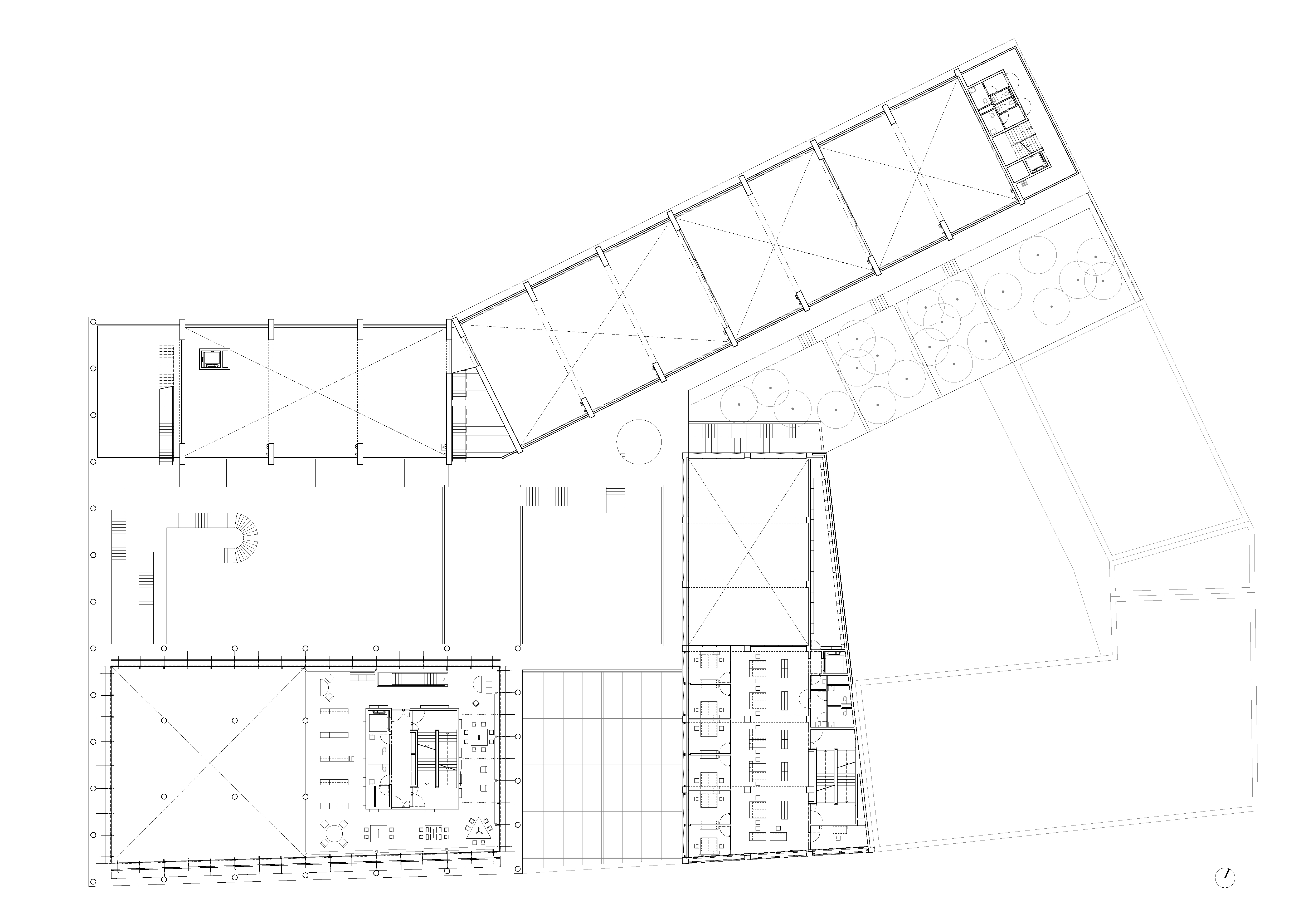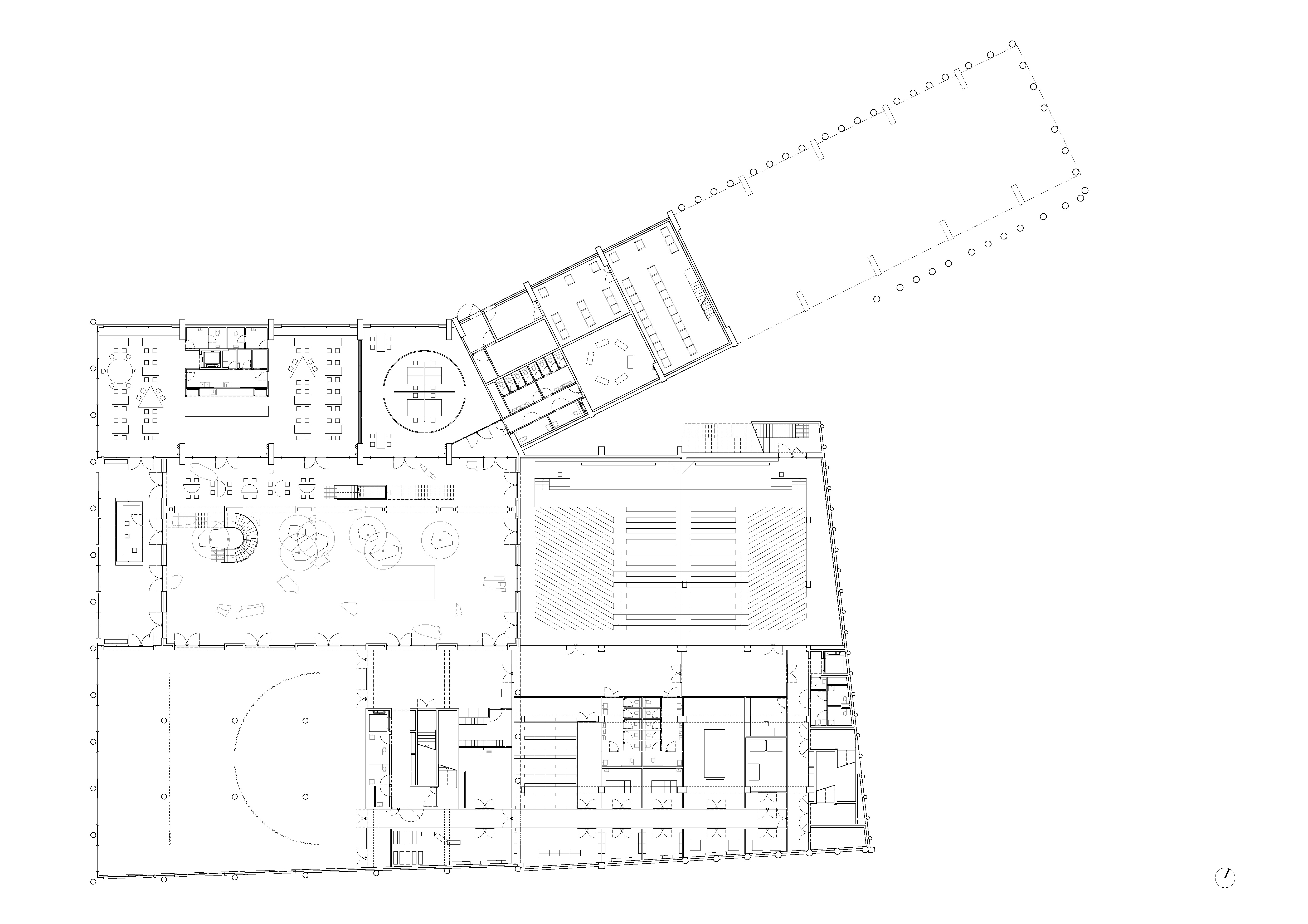 -The common center (forum, administrations, library, thesis room): It is the thickest building. It incorporates large spans in order to free up the supporting point platforms as much as possible to create generous (re)presentation spaces.