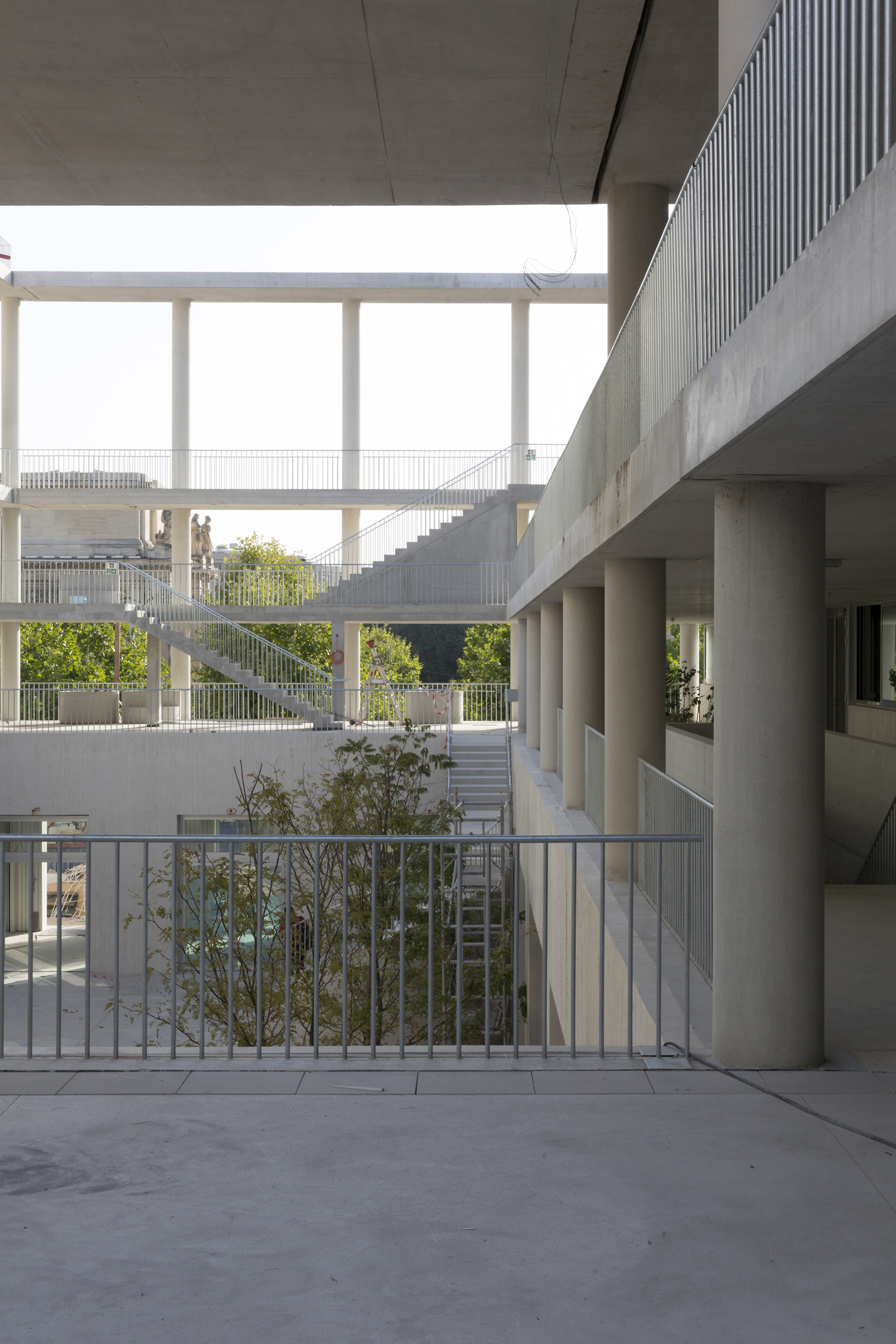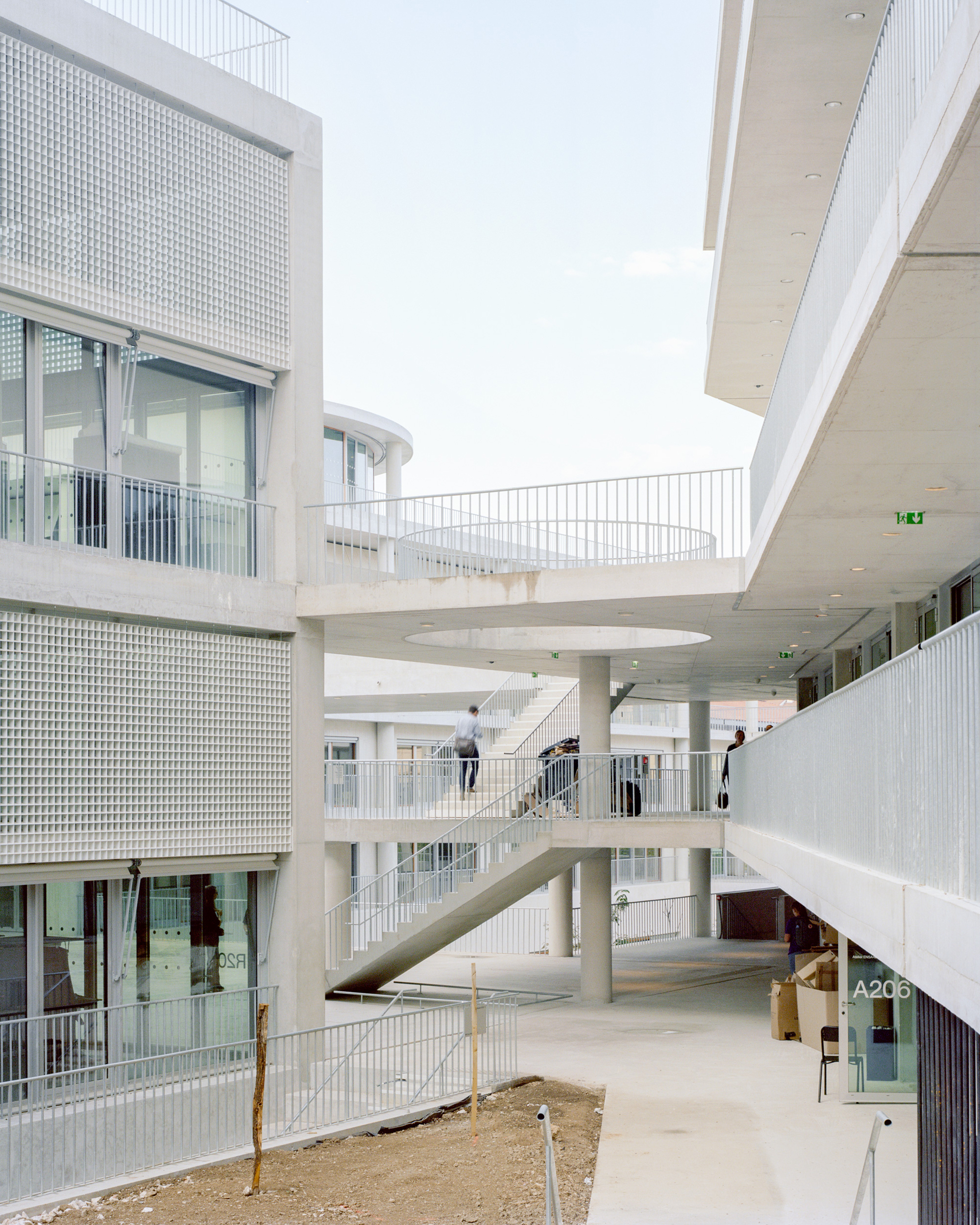 Finally outside, the passageways, footbridges, squares, courtyards, platforms, terraces provide direct connections between the different centers at each level; they “innervate” the entire Institute.