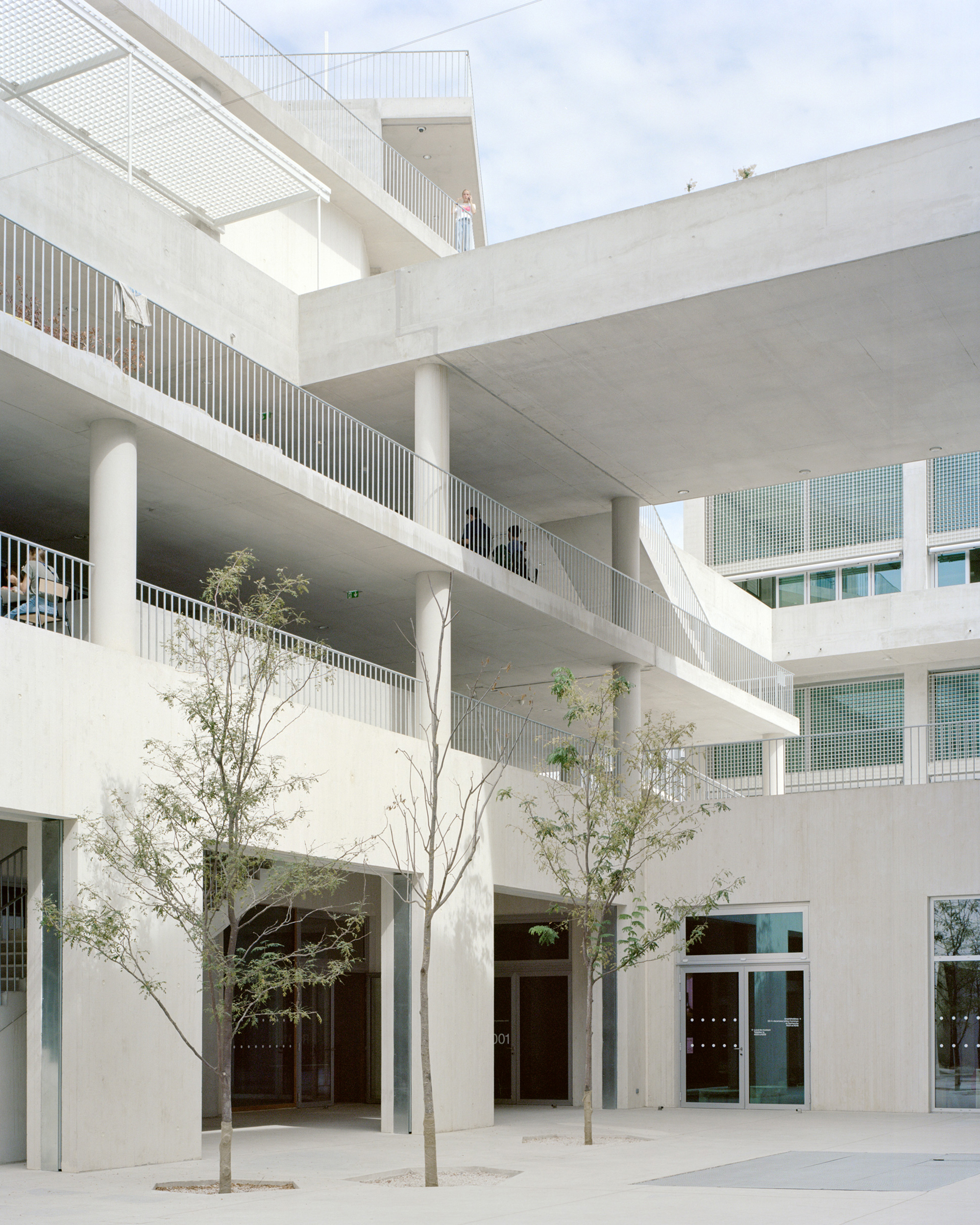 The closer we get, the more we read the specificity of the elements and buildings that make up the campus. The various solar protection devices, set back 70 cm such as the lintels, spandrels and trumeaux, are made of white concrete 12 cm thick – the contingent -.