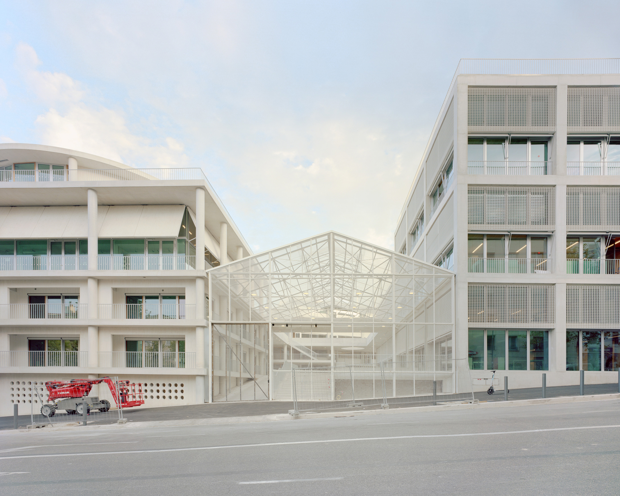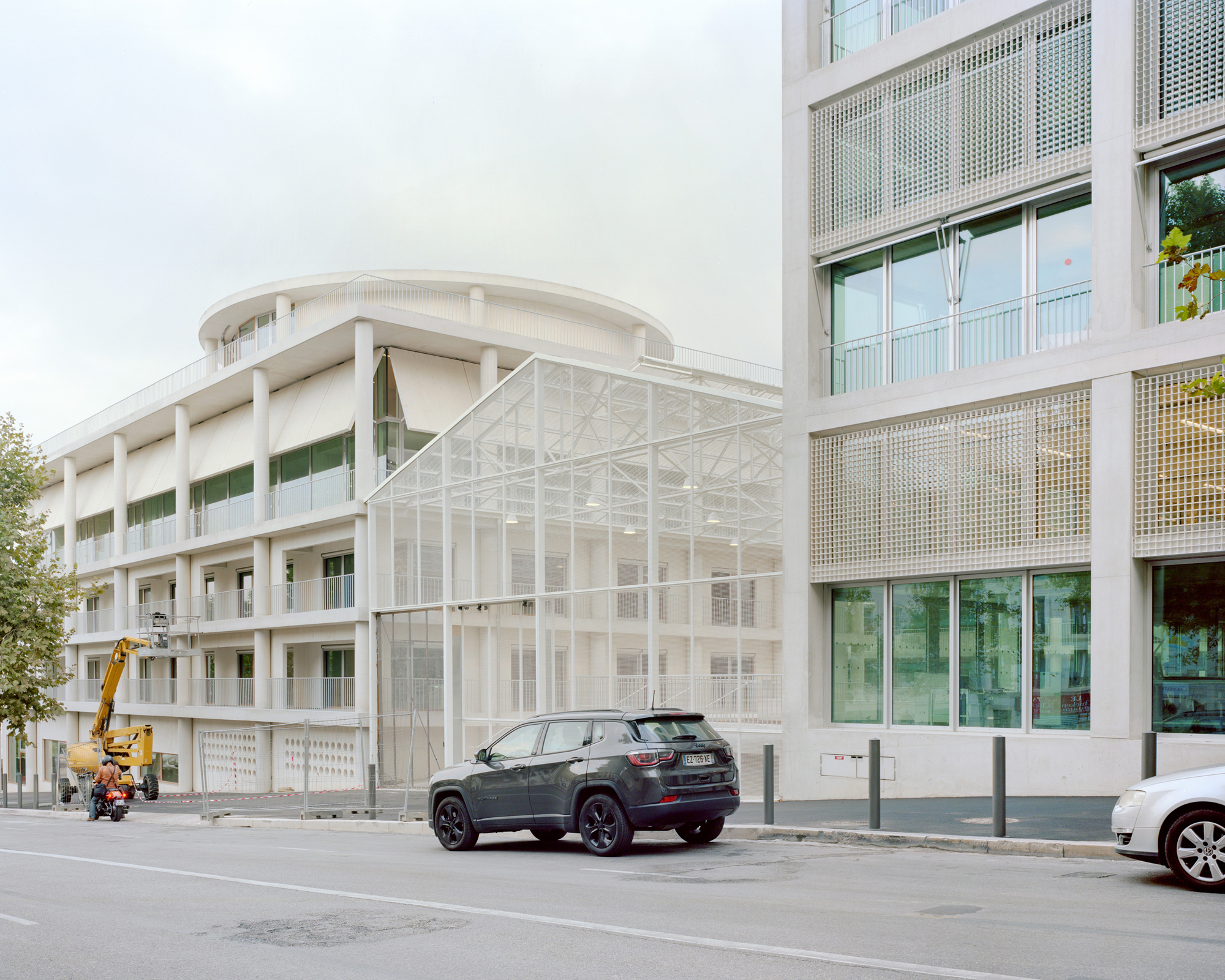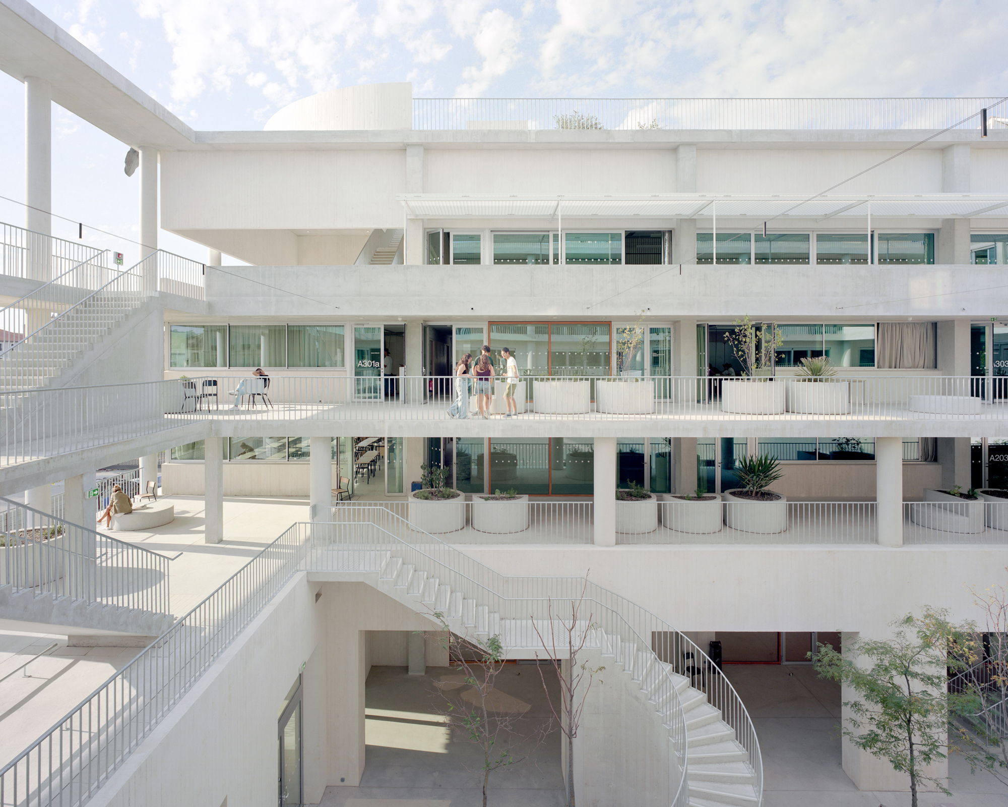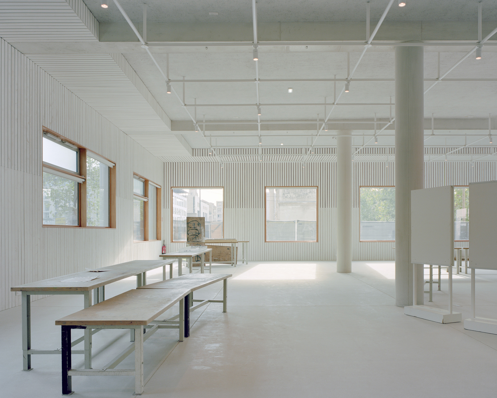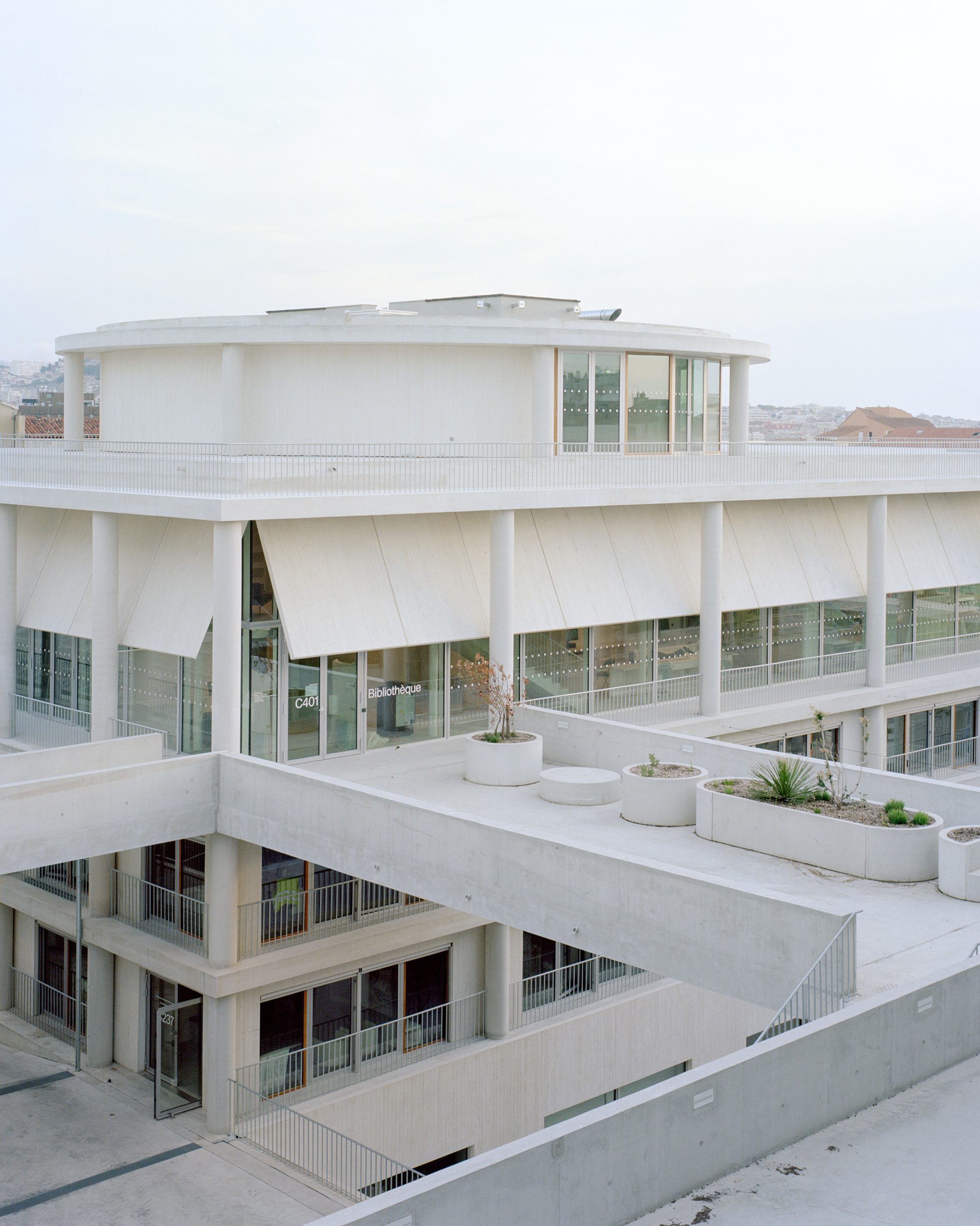 -The workshop center: This is a long building whose structural porticos allow a multitude of configurations depending on needs. This building, located to the north of the project, protects the rest of the Institute from the Marseille mistral.