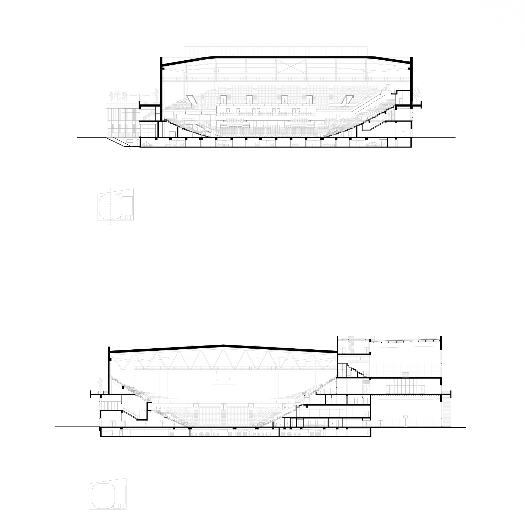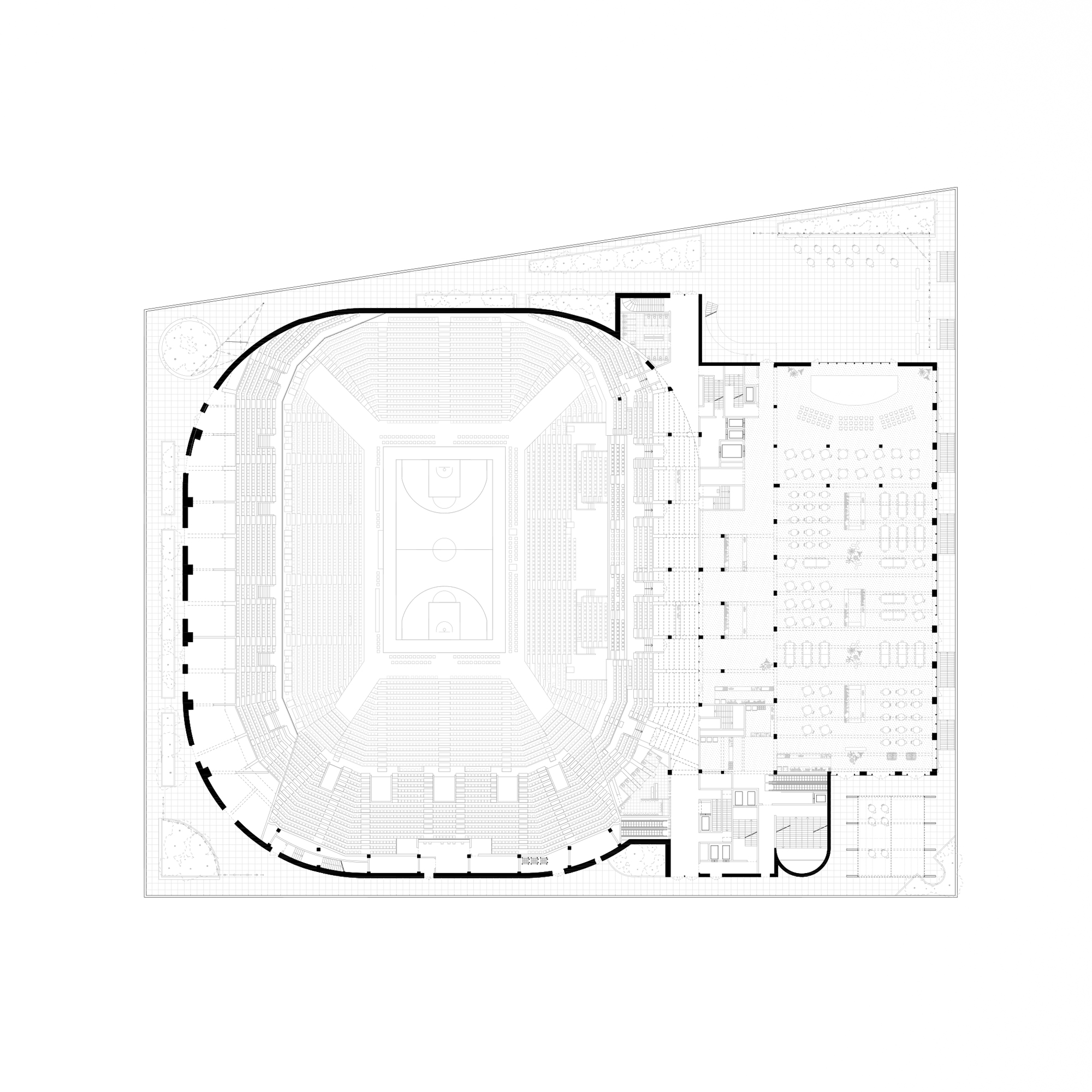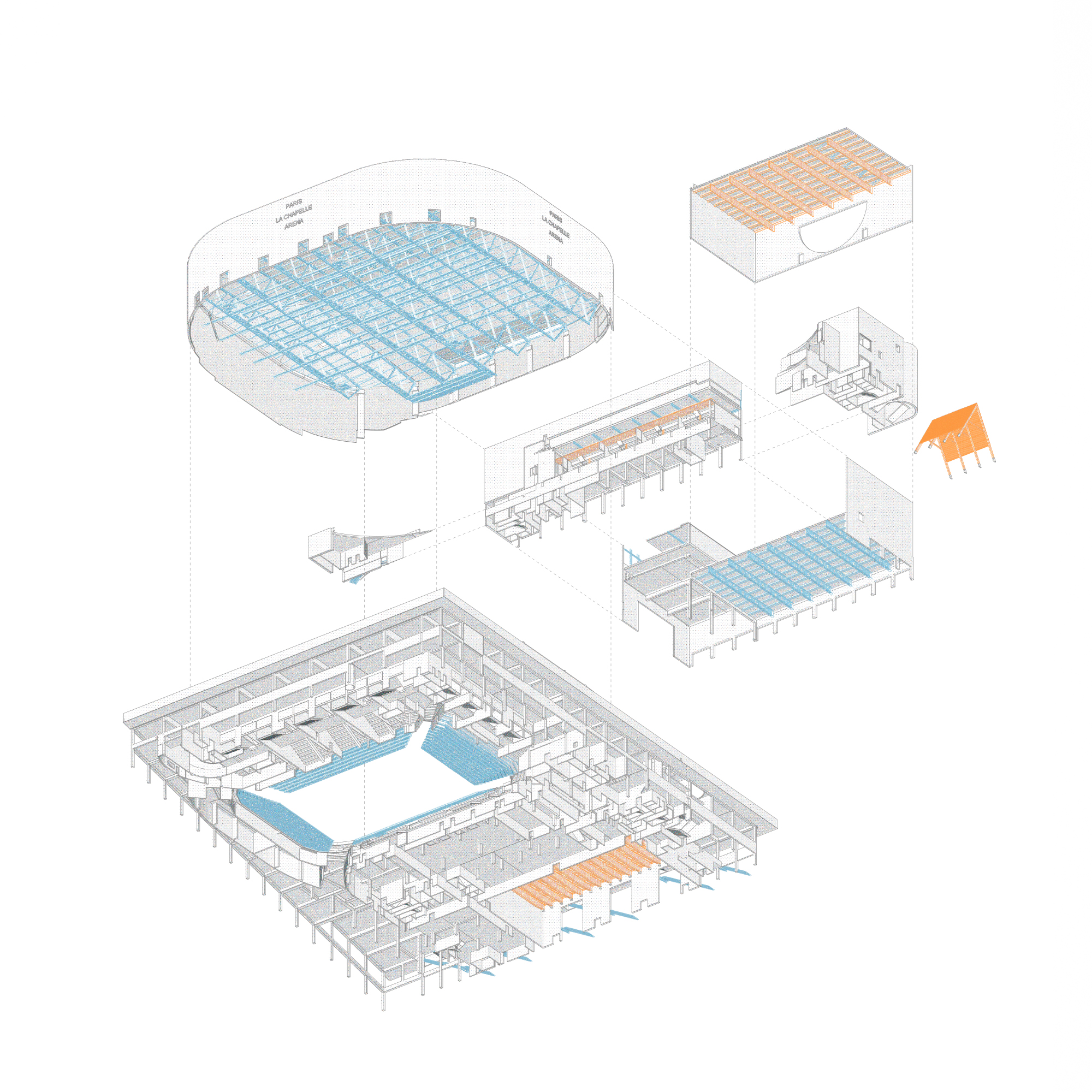 The Arena is therefore a compact building, with no preferred direction. Like a Parisian theater, at the center of all interests for the duration of a play, it constantly receives and reproduces the spectacle of the city.
