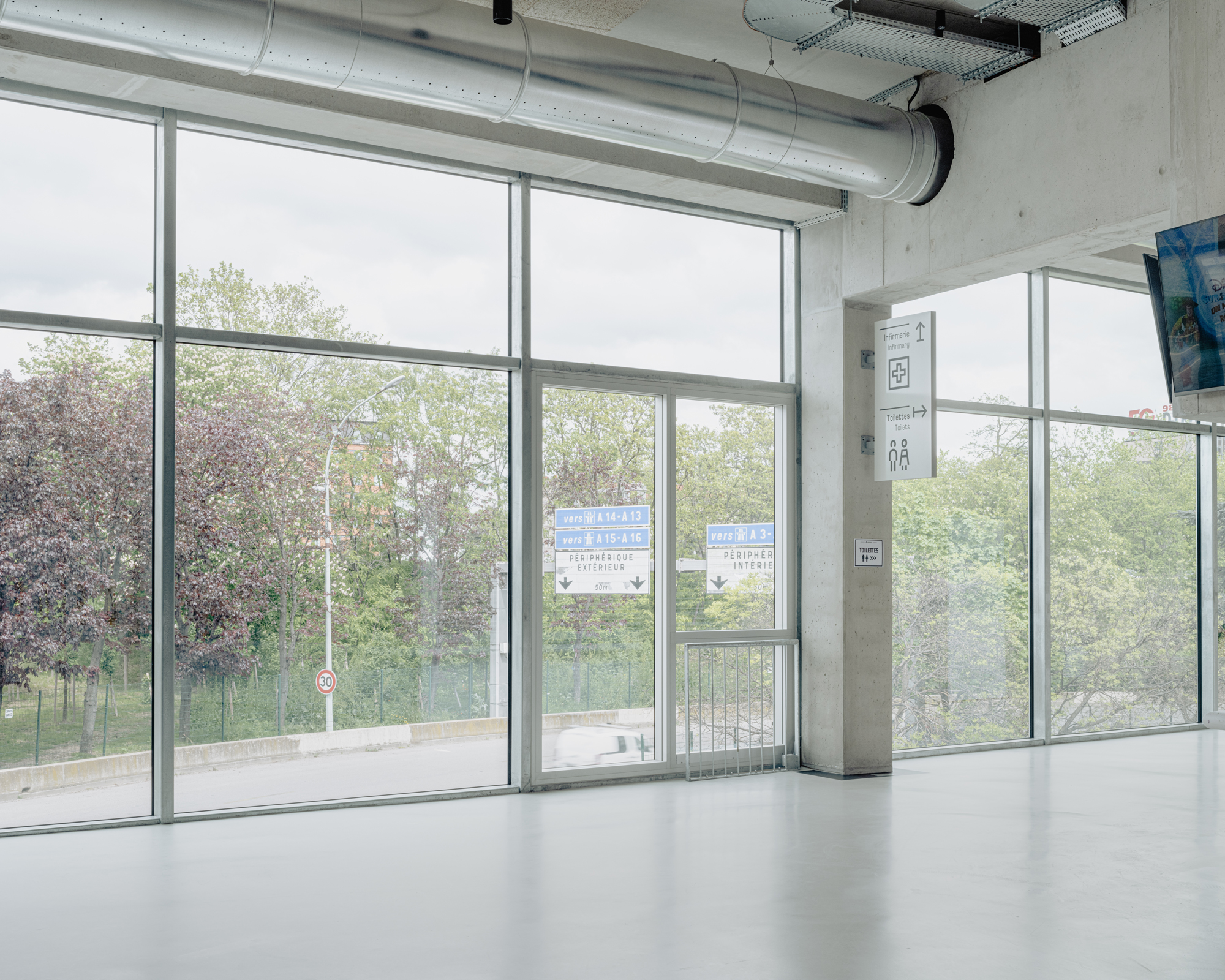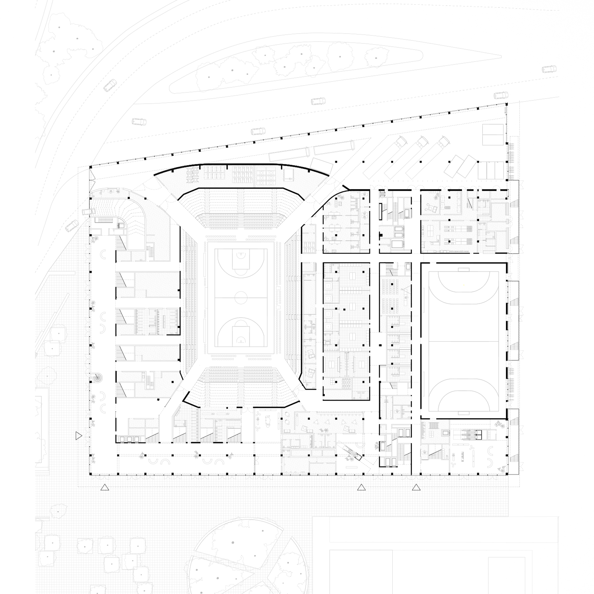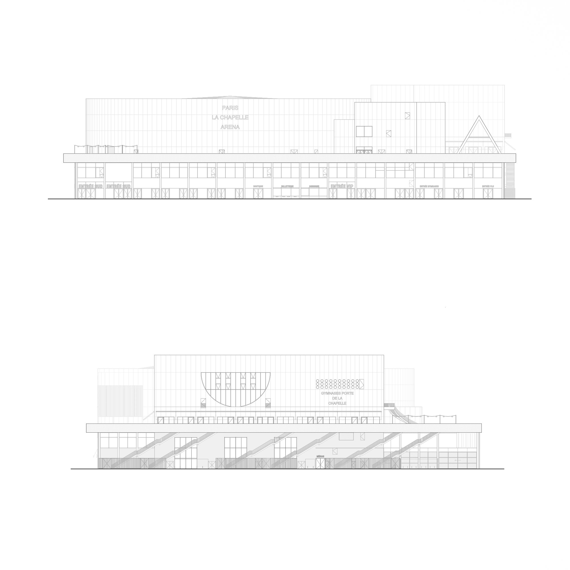 Below this square, on the first 2 levels, glass passageways surround the Arena. To the north is logistics and to the east is the 1st gymnasium. This lower stratum reminds us that the building is above all a local facility in the neighborhood, accessible every day to associations and schools; an everyday palace.