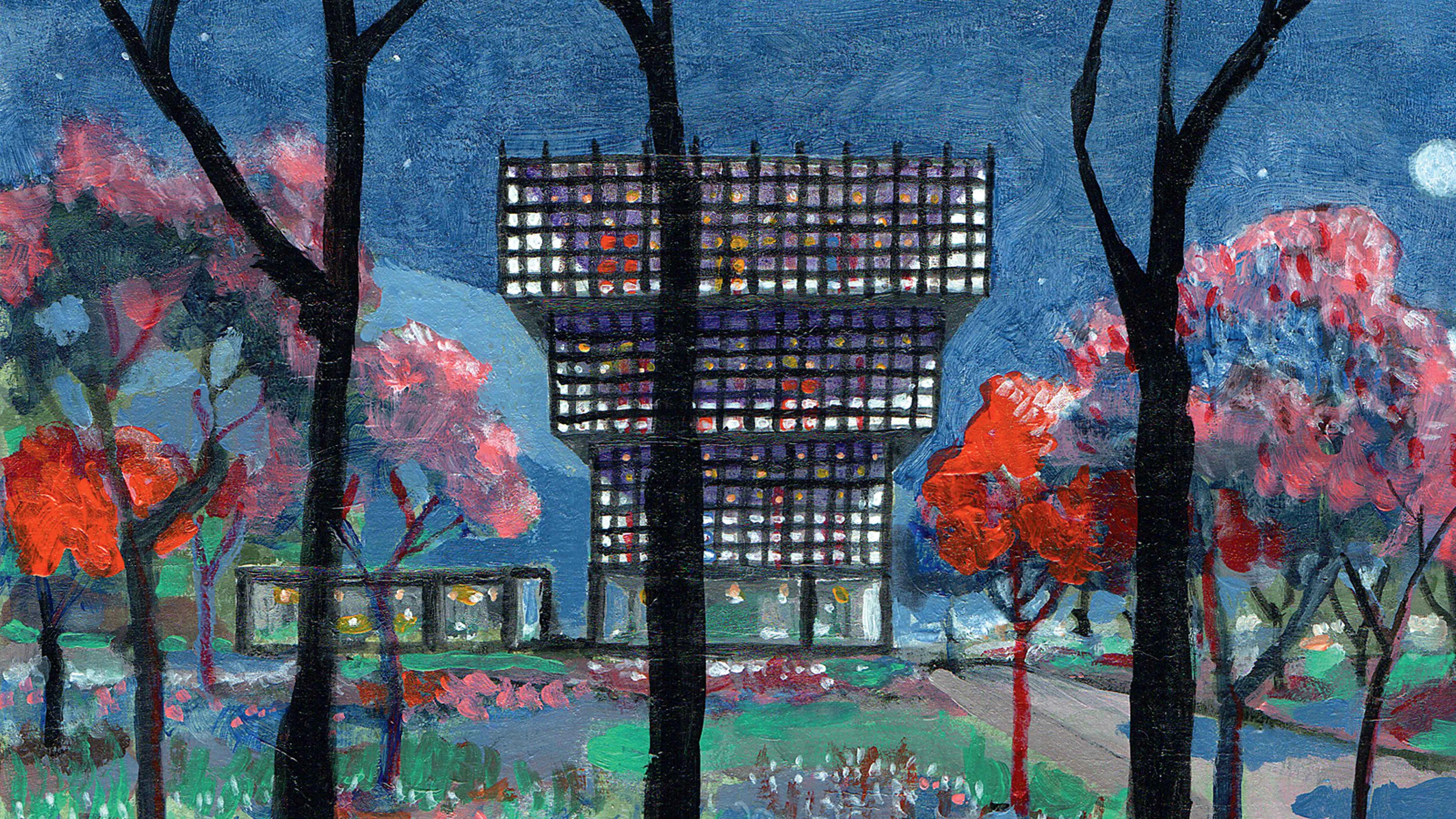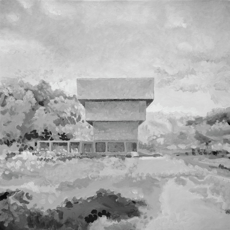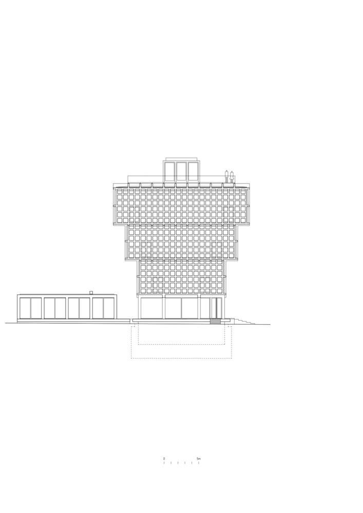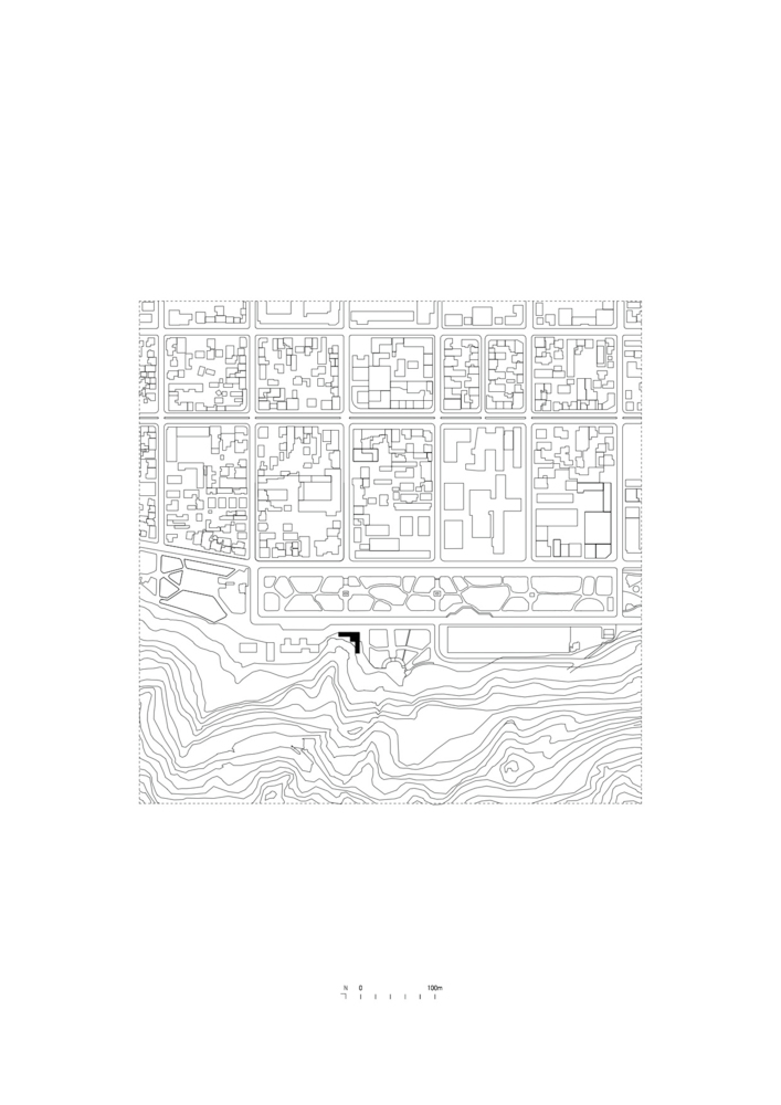 It is precisely that inexpressive texture of the exterior surfaces, a dark grey concrete and hand painted glass, what enhances the scale of the building in relation to the surrounding park. Its presence is the simple manifestation of a symmetrical scheme, an inverted entasis, which is diagonally anchored to the natural ground with an L shaped floor, with two lateral galleries and the access at the very corner of the hill.