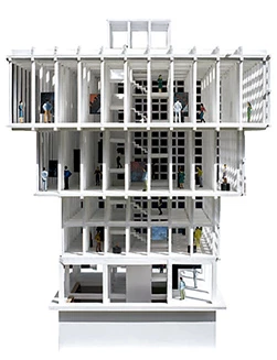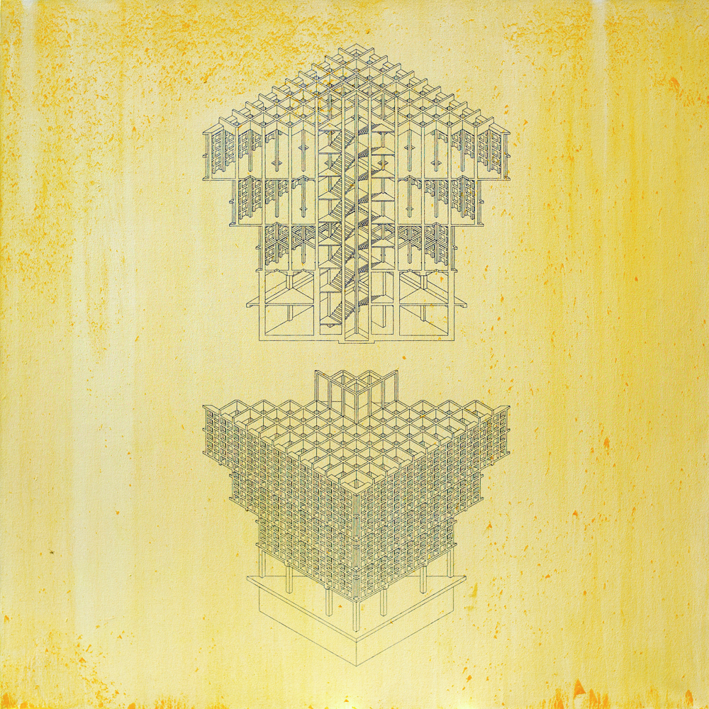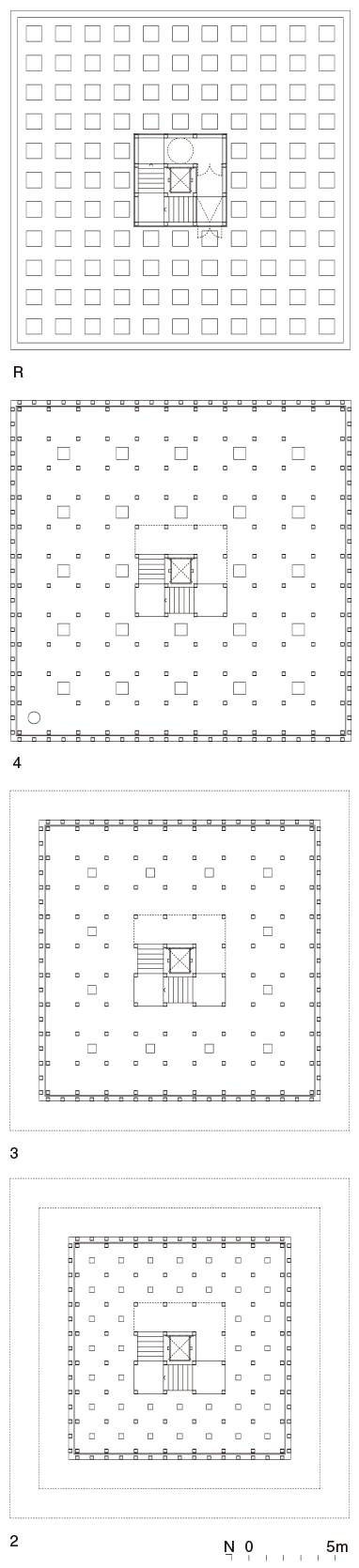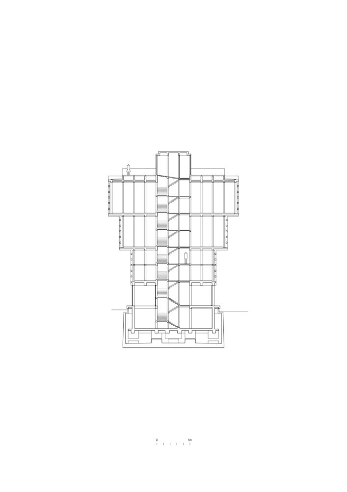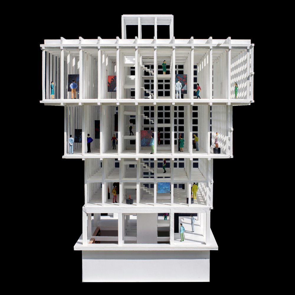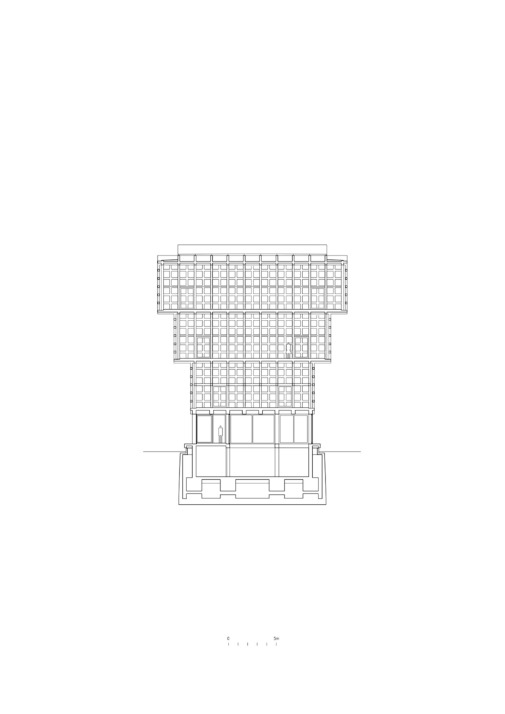 This is a generic spatial structure for a specific condition. It is a homogeneous and monotonous grid of columns in a square plan format that increases its size in height. Around a central open lift, there is a spiral staircase with a balcony half way overlooking every floor. There are no walls in the entire system, only a single type of slender column without direction that is repeated three hundred times throughout the three levels. The distance between the columns is determined by the size of the art collection that will populate the building.