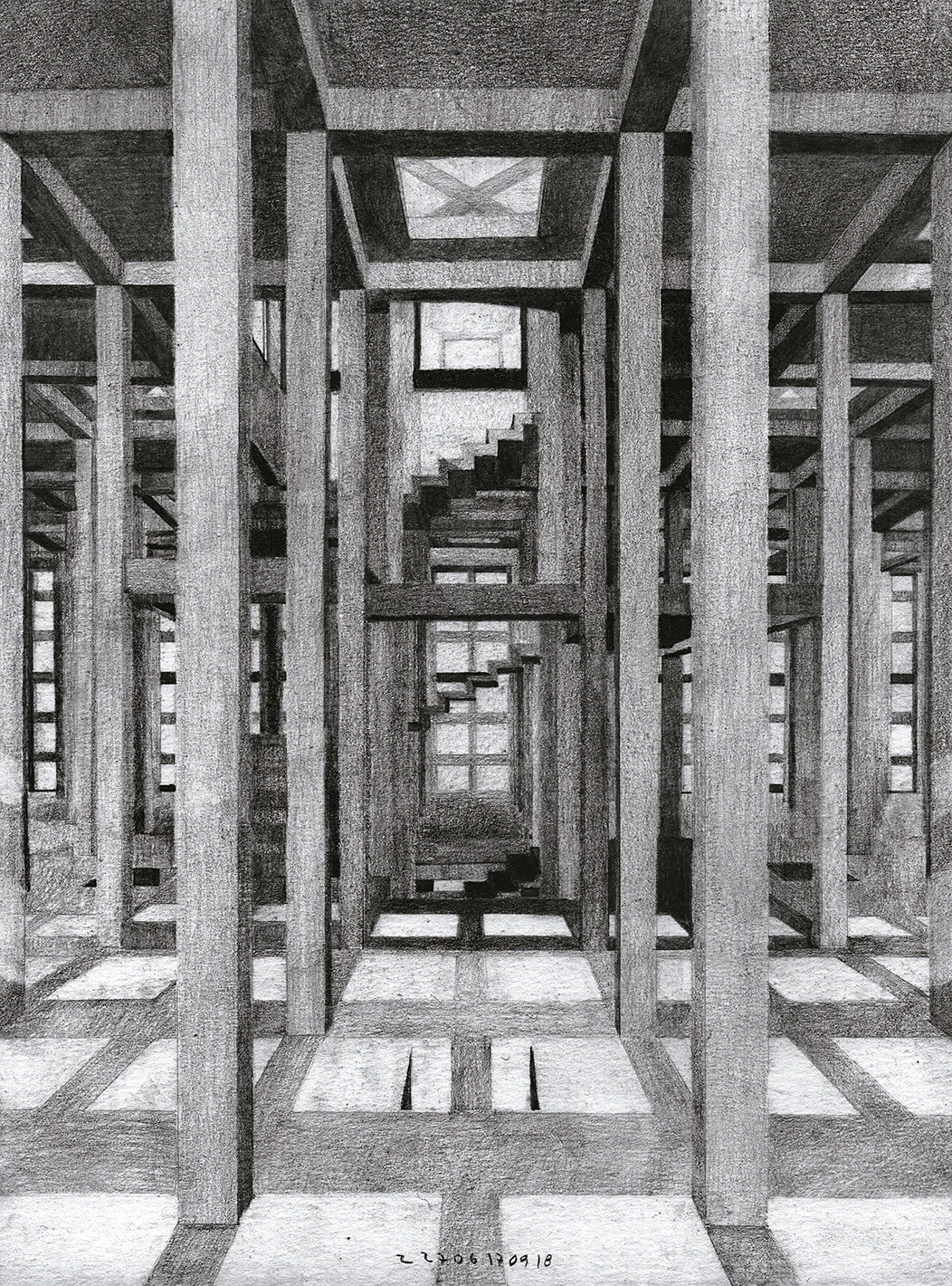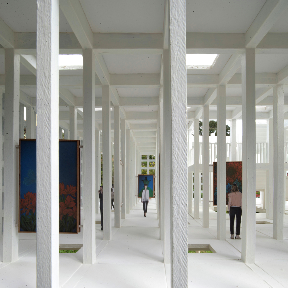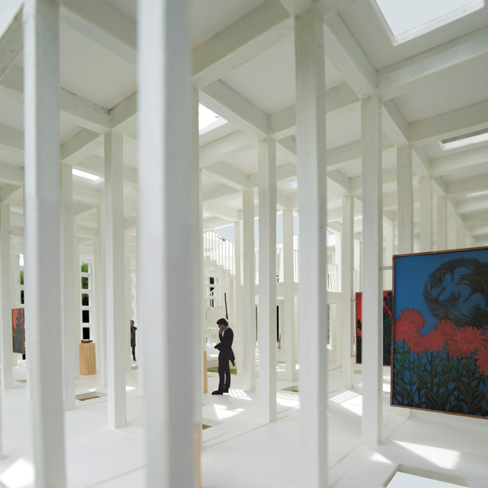 Every room has the same character, a dense and labyrinth-like landscape almost without any mass. Despite the sameness of elements there is a strong variation from room to room: the amount and size of openings in the ceilings and the distance from the core to the perimeter are unique in every level. Since there are no walls, the paintings will be informally floating in the air, somehow cancelling any gravitational expression, analogous to the fragile assemblage of concrete columns that supports them: a system that becomes seismically stable by means of the concrete mesh of its façades.