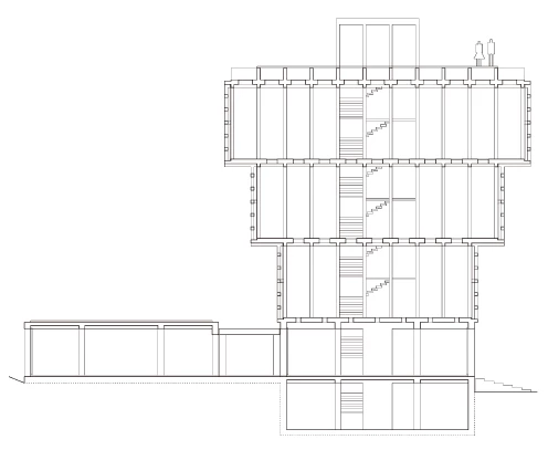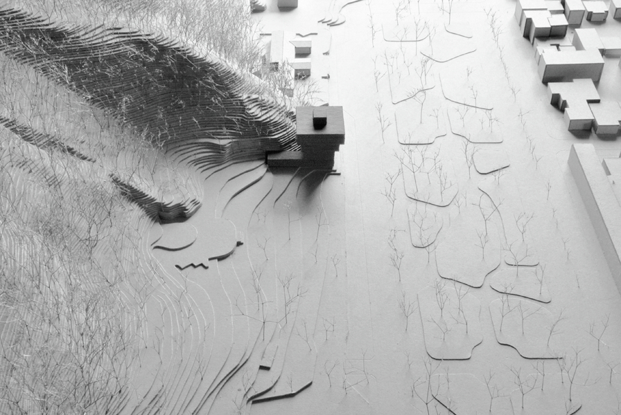 The complementary program of the exhibition space occupies this open ground floor. While the more intimate areas (a small library, storage and office spaces) are in a basement, the upper level is an urban terrace aligned with the top of the trees.