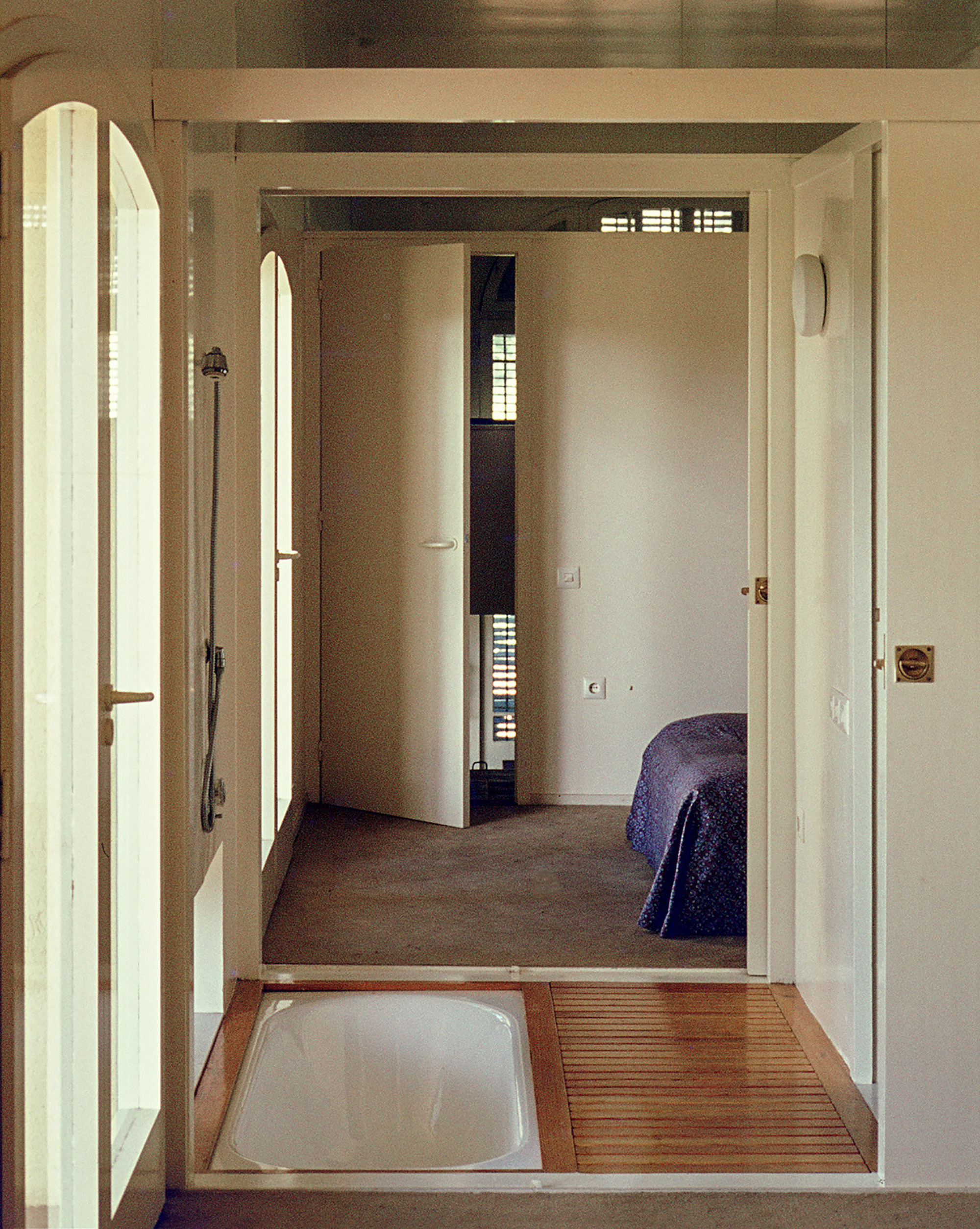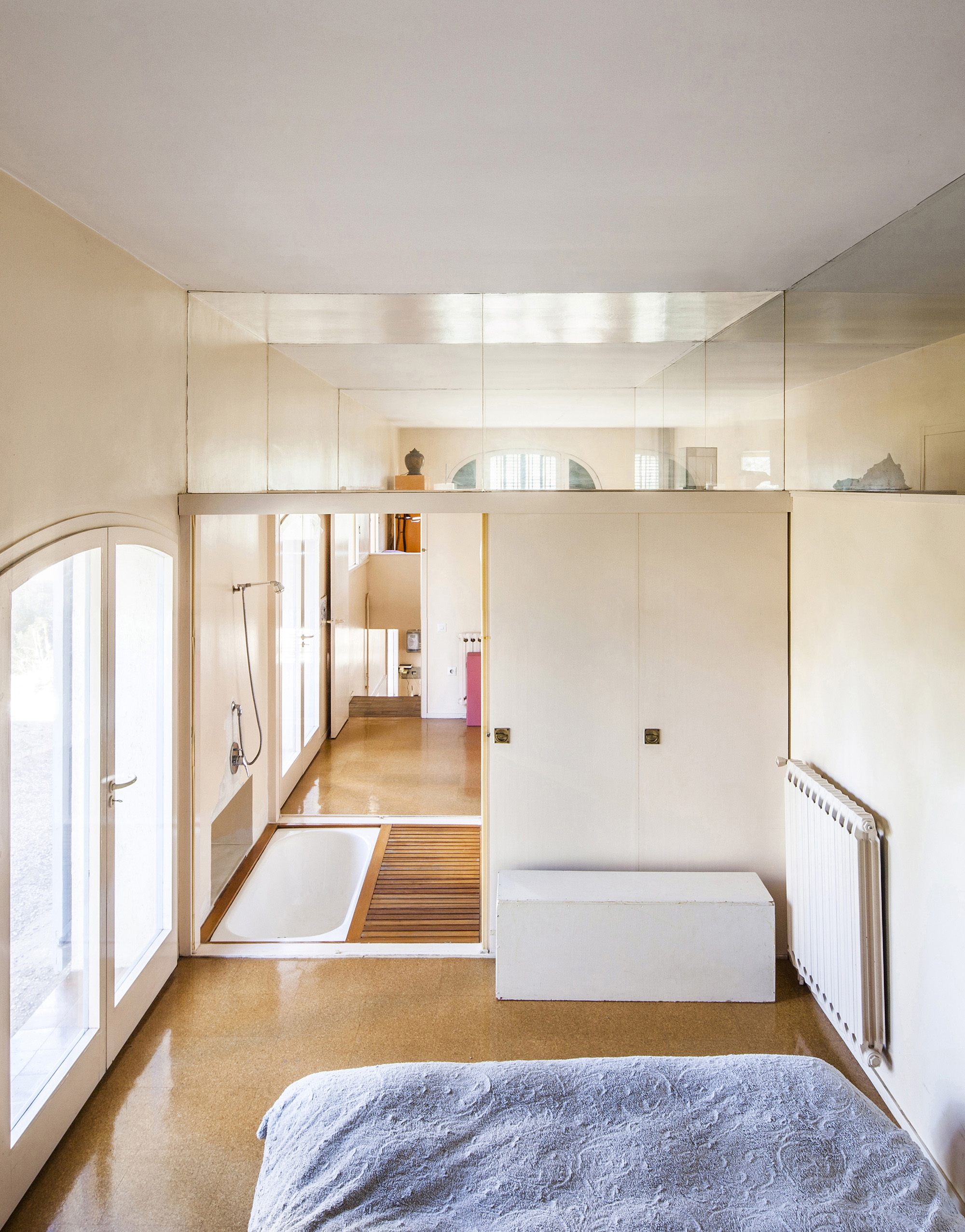 The interior offers a view of the whole space, although the staggered section preserves the privacy of the bedrooms, which are connected by a shared bathroom.