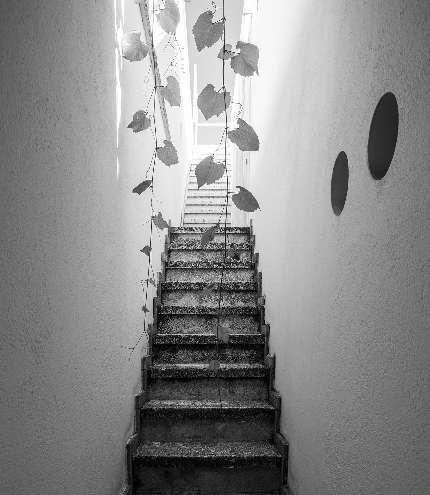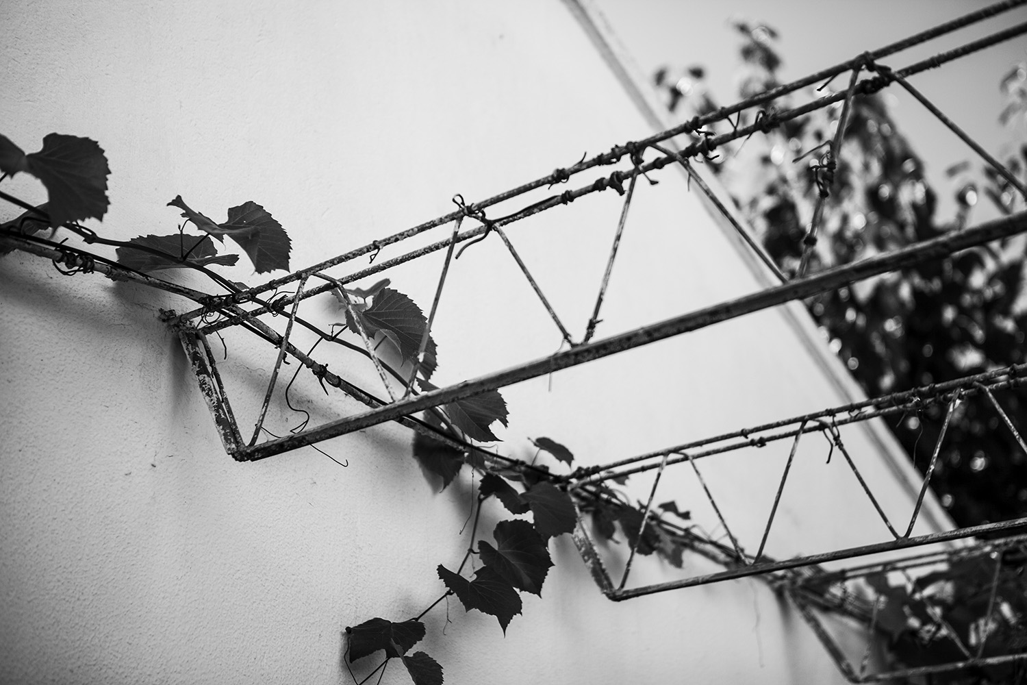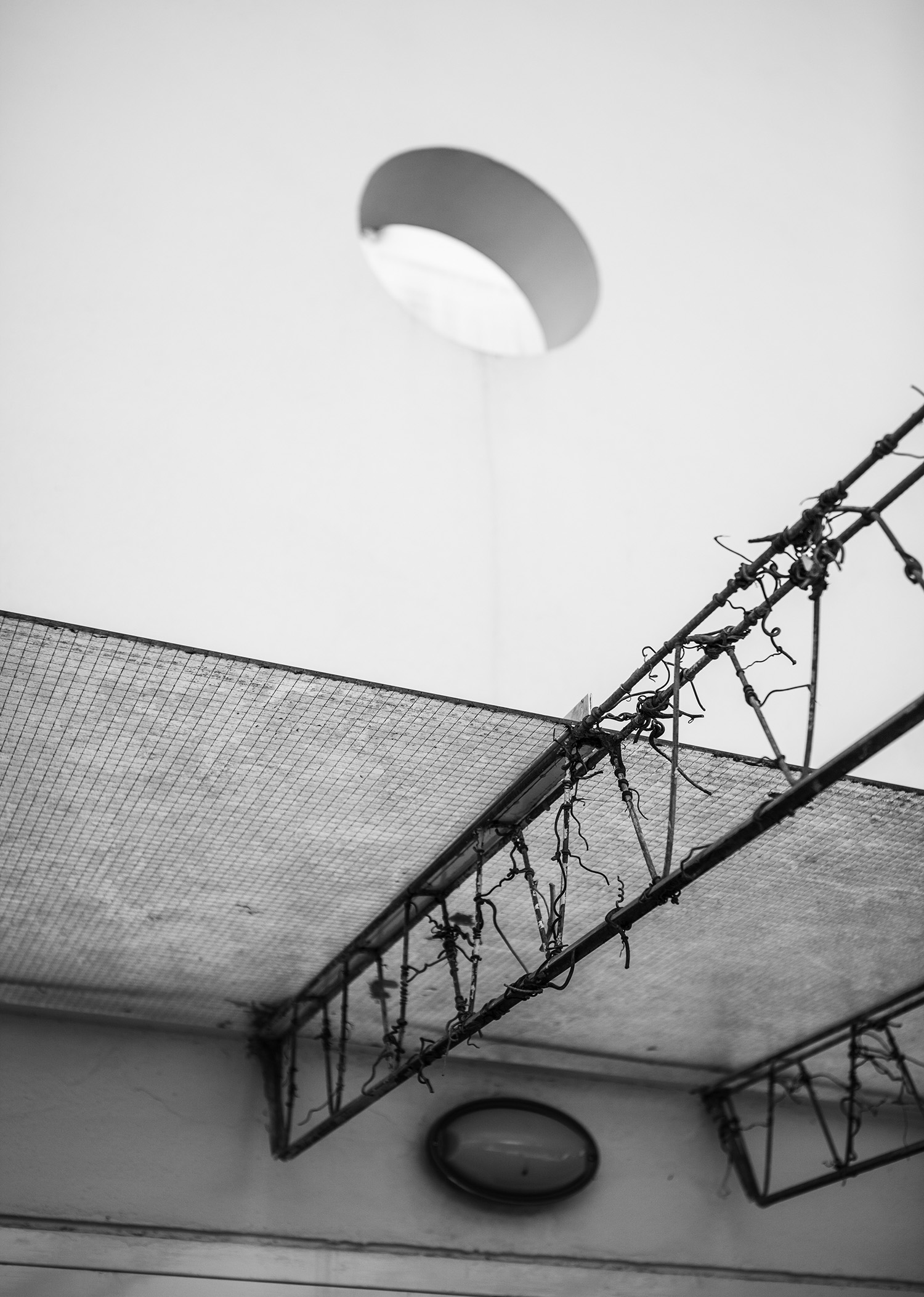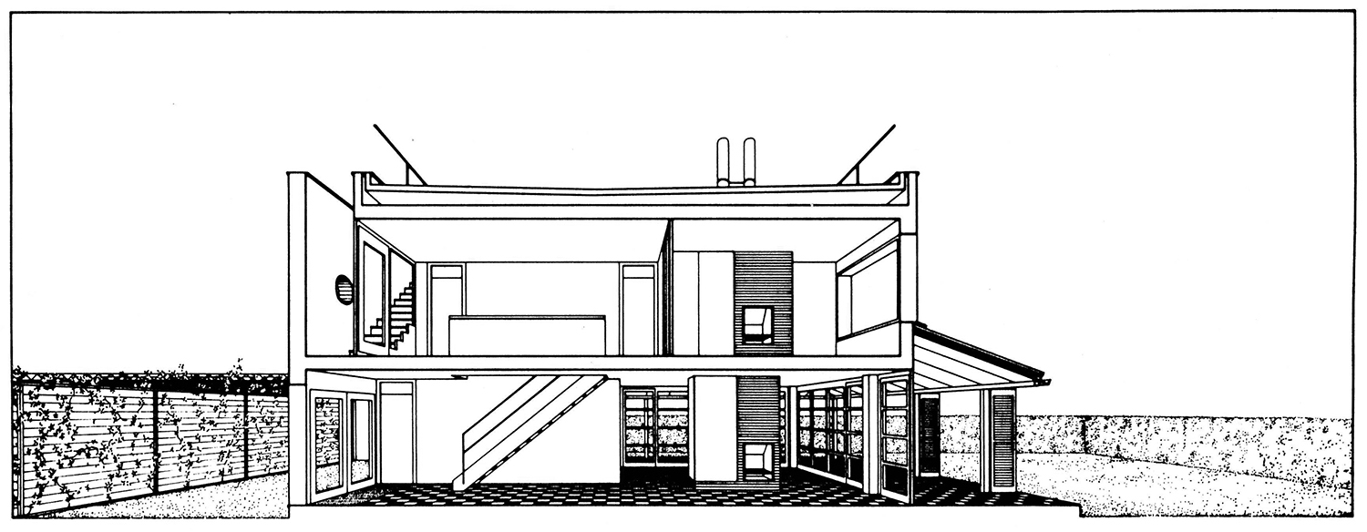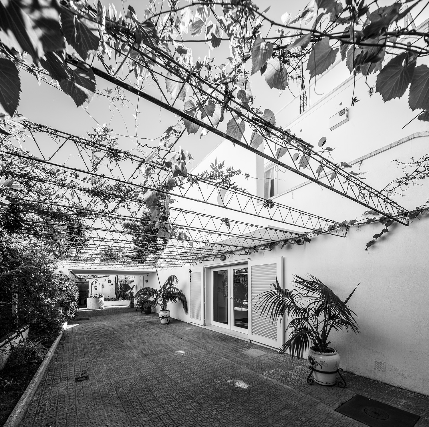 El muro divide el solar en dos partes: A un lado, el patio de entrada, enteramente cubierto por una extensa pérgola por la que trepan las hiedras, acoge el garaje y la entrada a la vivienda. Al otro, la casa se despliega en tres de sus fachadas con un porche suficientemente amplio para permitir diversos usos y establecer un espacio intermedio entre el interior y el jardín que lo rodea.